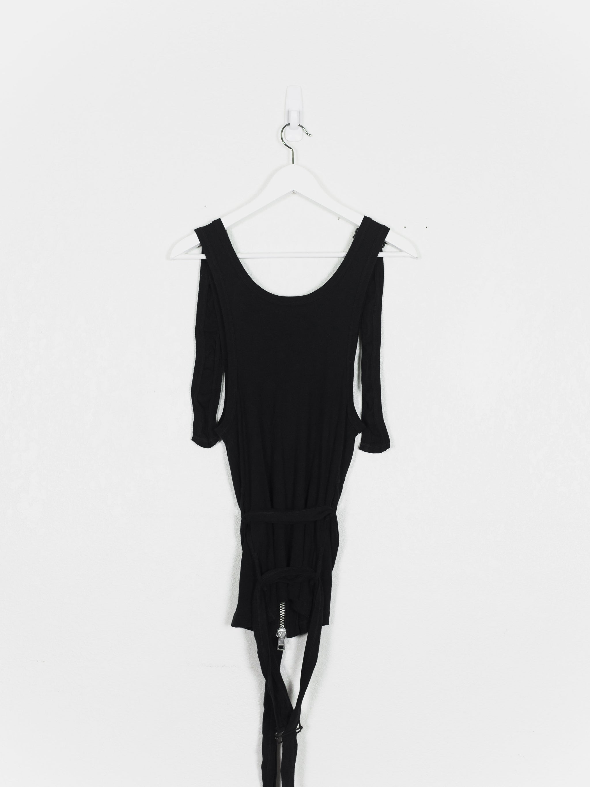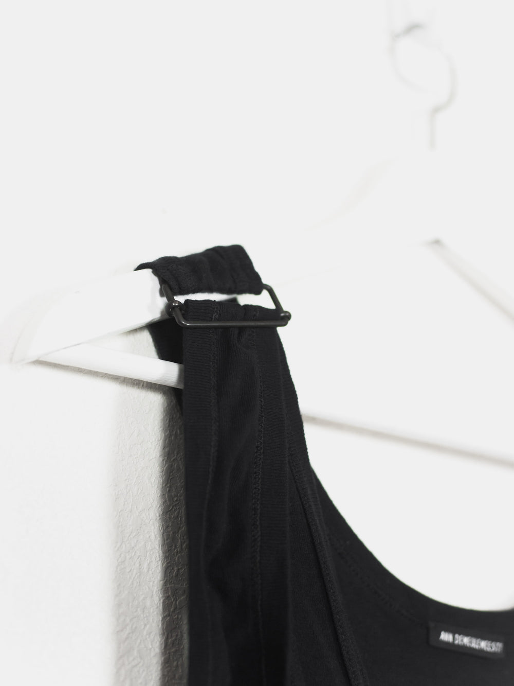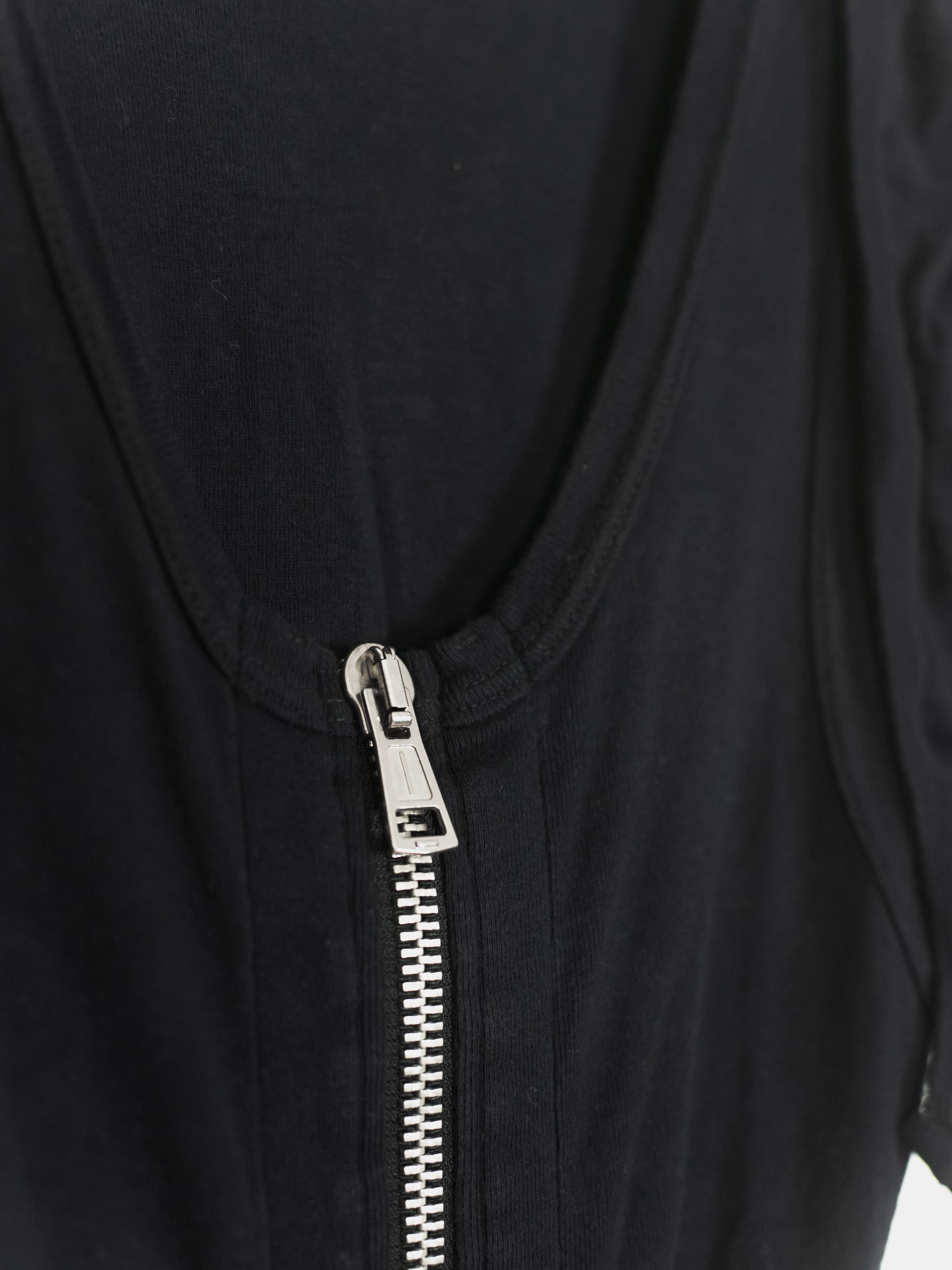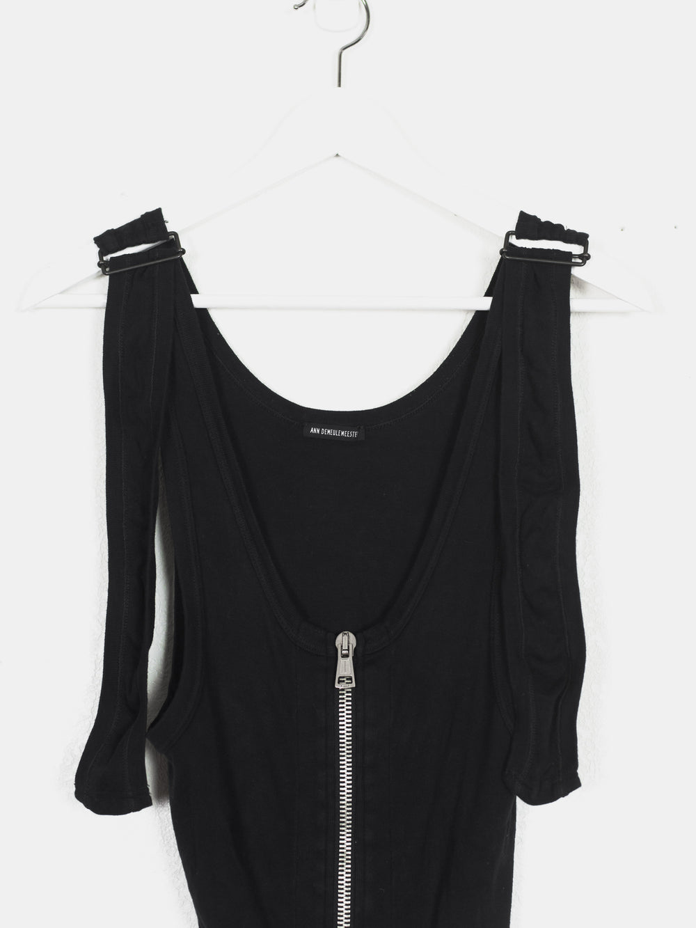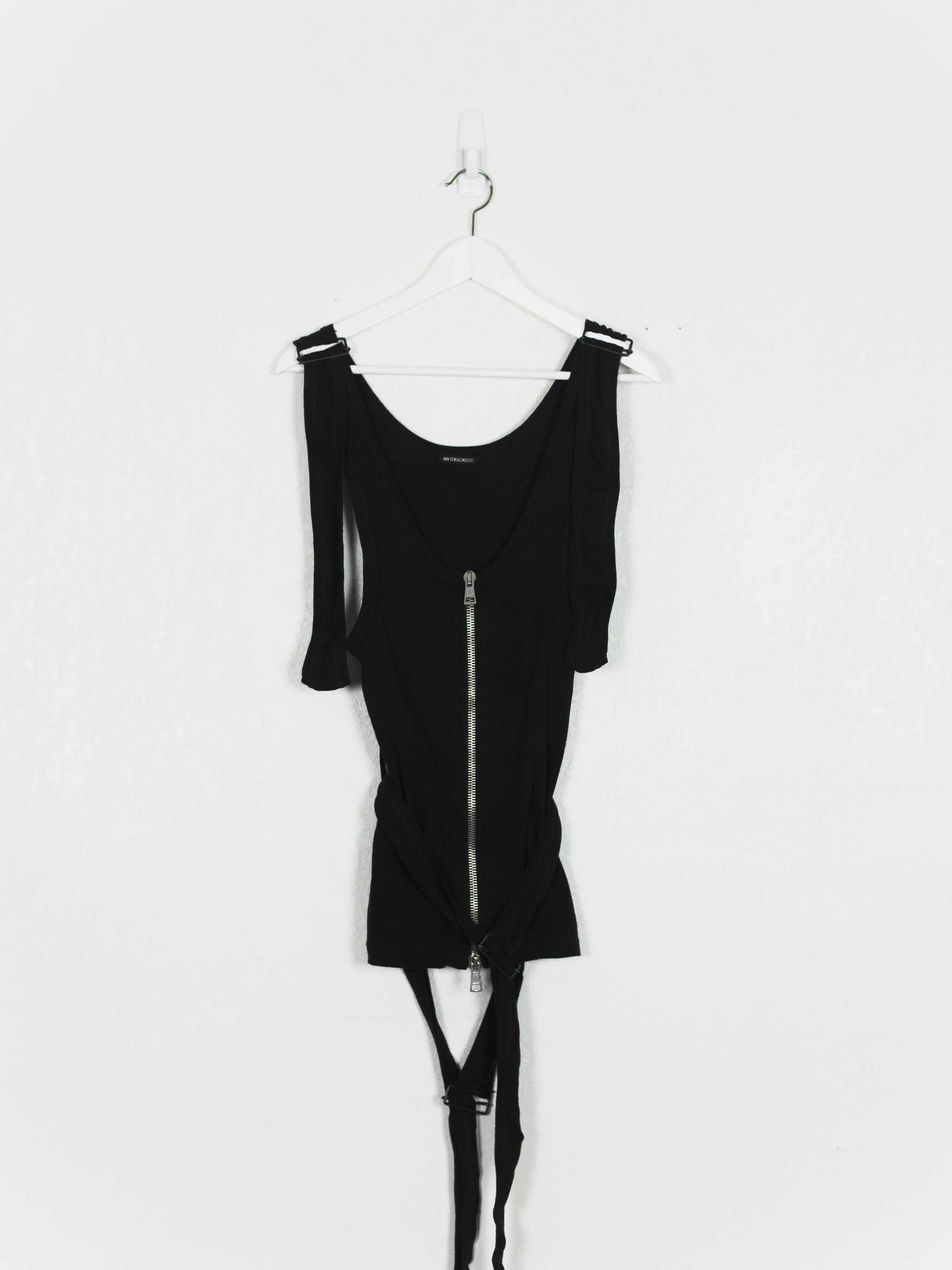 Hardware loaded tank top featuring a very smooth and heavy duty Raccagni main double zipper, adjustable strap and buckle shoulders, and two belt straps around the waist.
