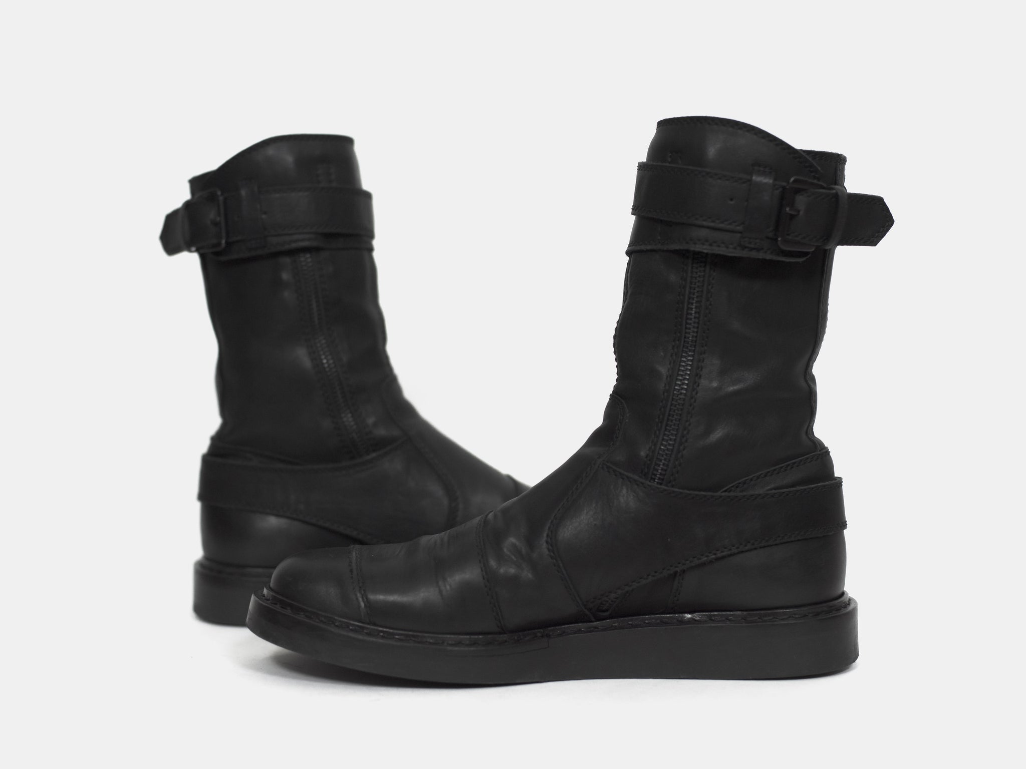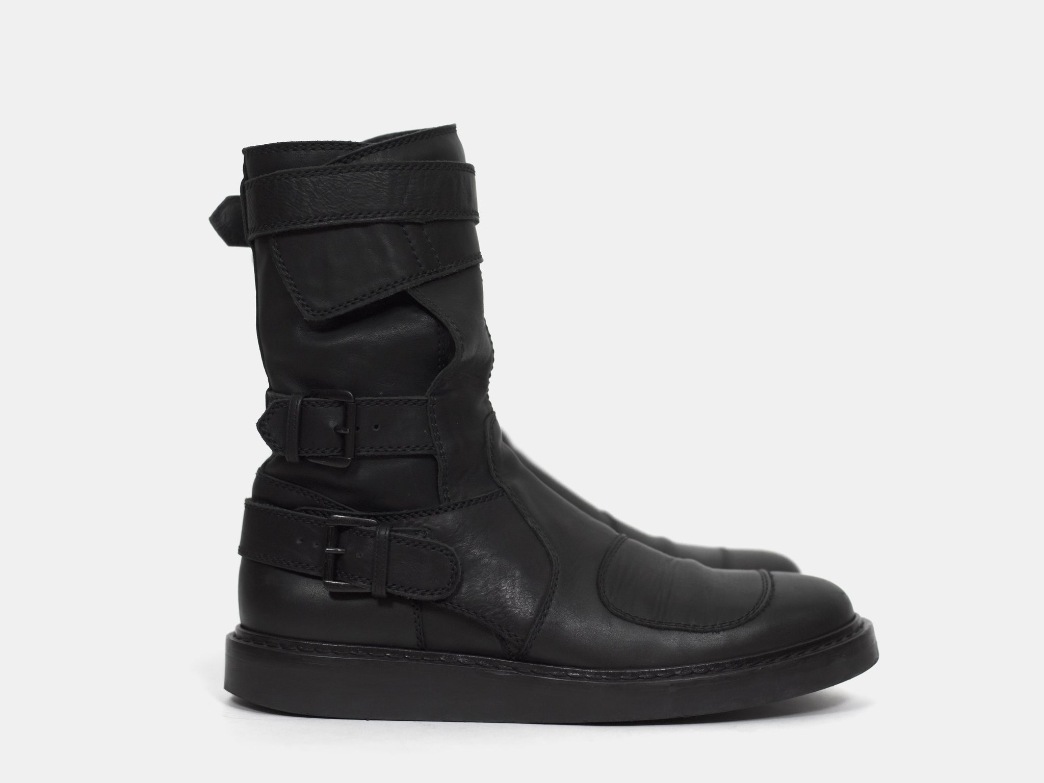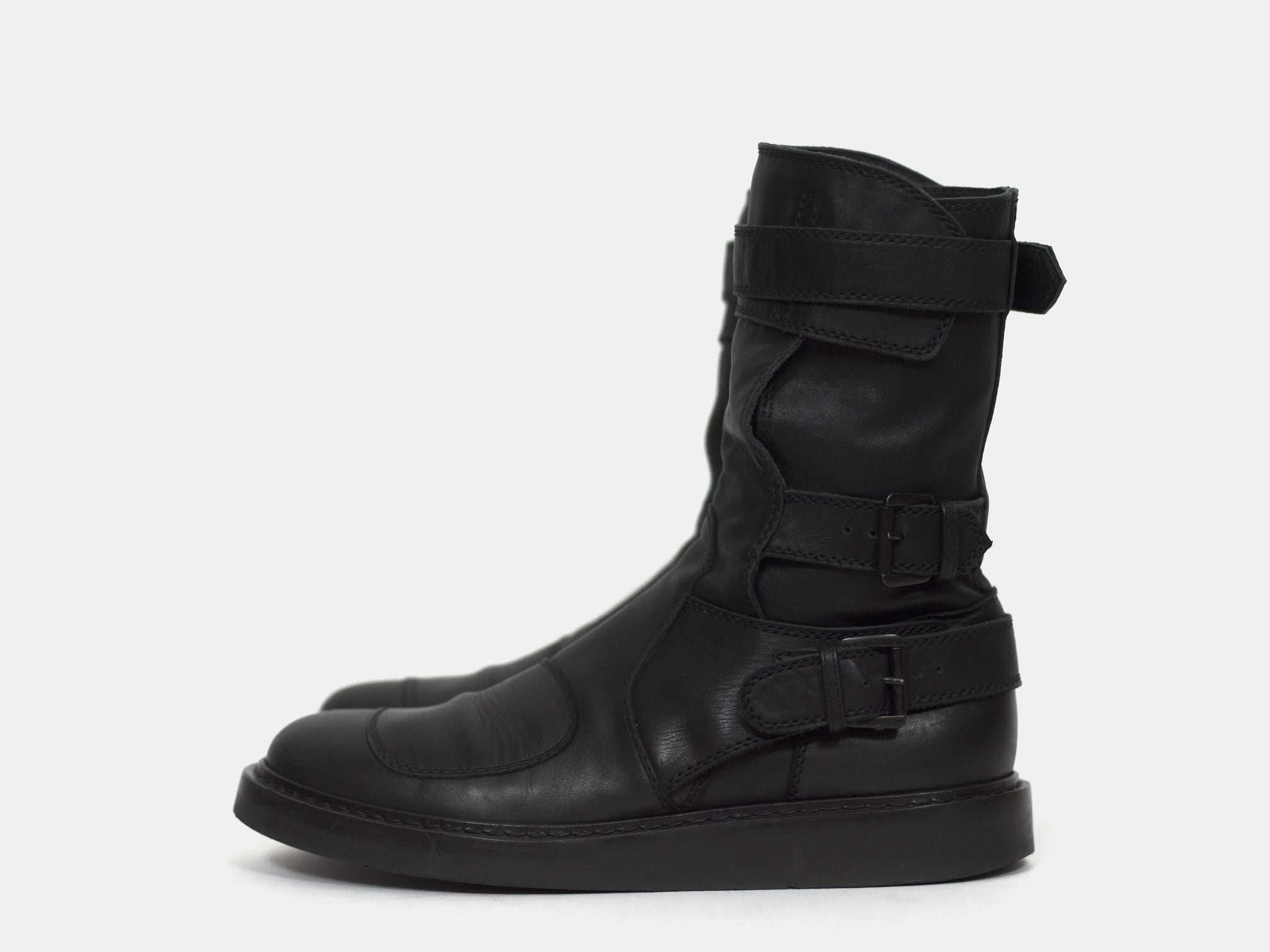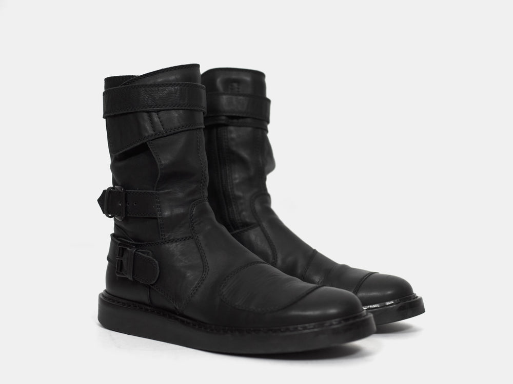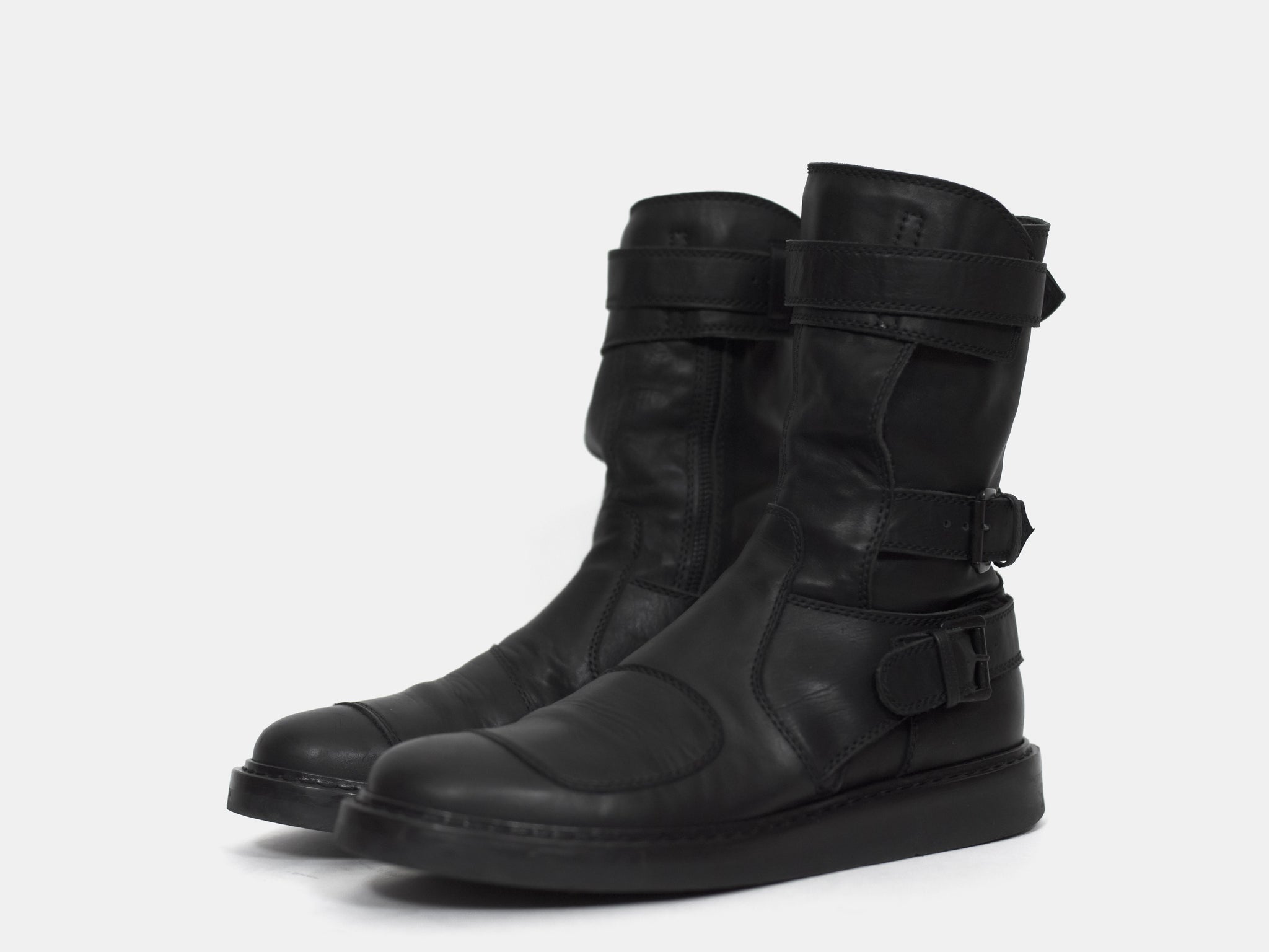 An amazing pair of boots with futuristic moto inspired details such as numerous ergonomically layered buckle straps and toe patch. These take the similarly silhouetted and more popular back lace boots to the next level. Nearly new condition still with original box. Retailed for ¥157,500 or $1400.