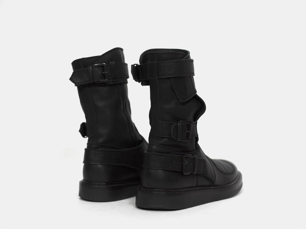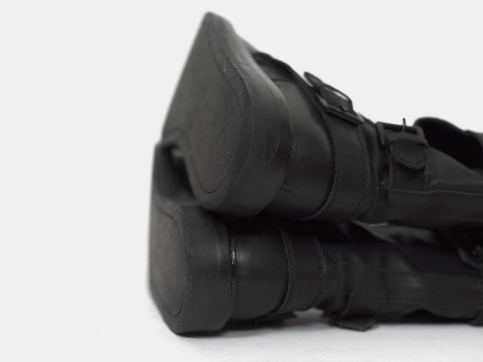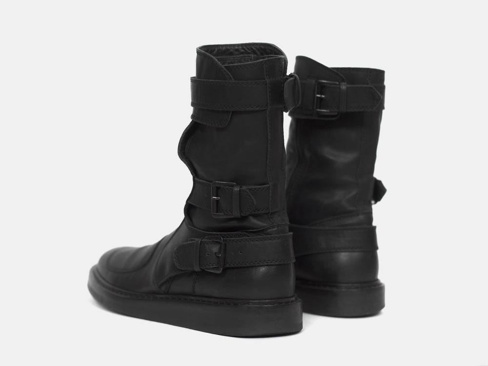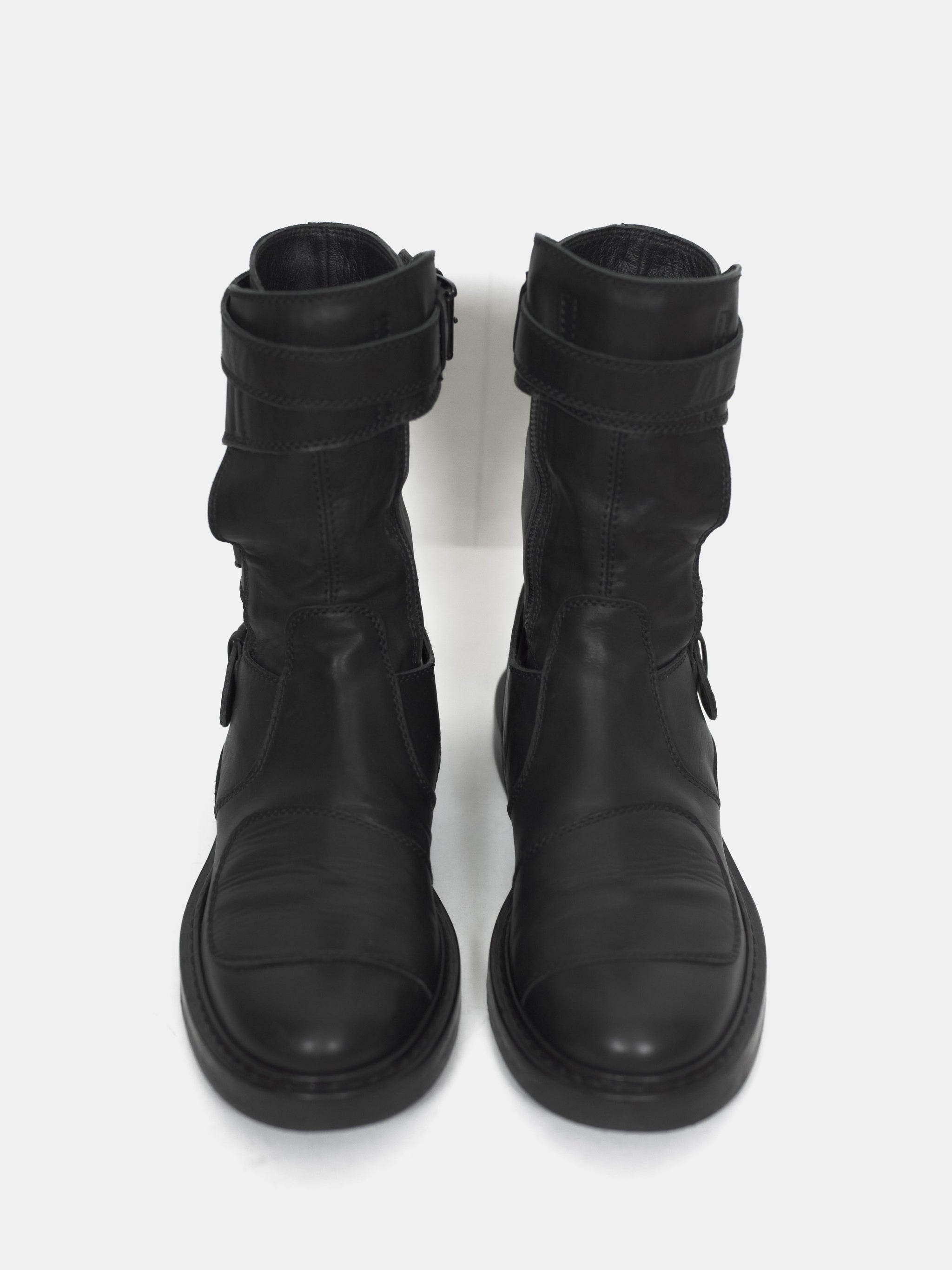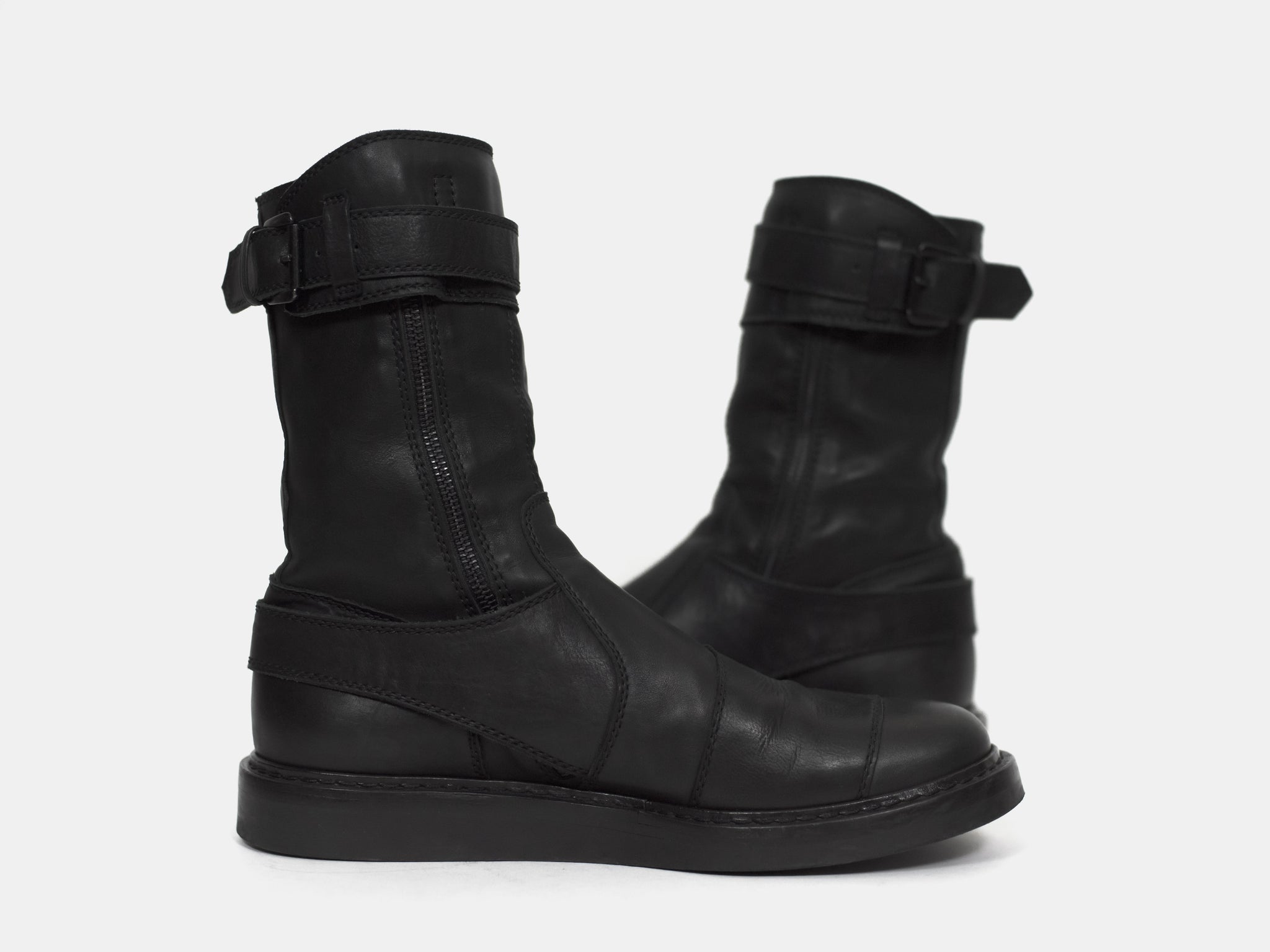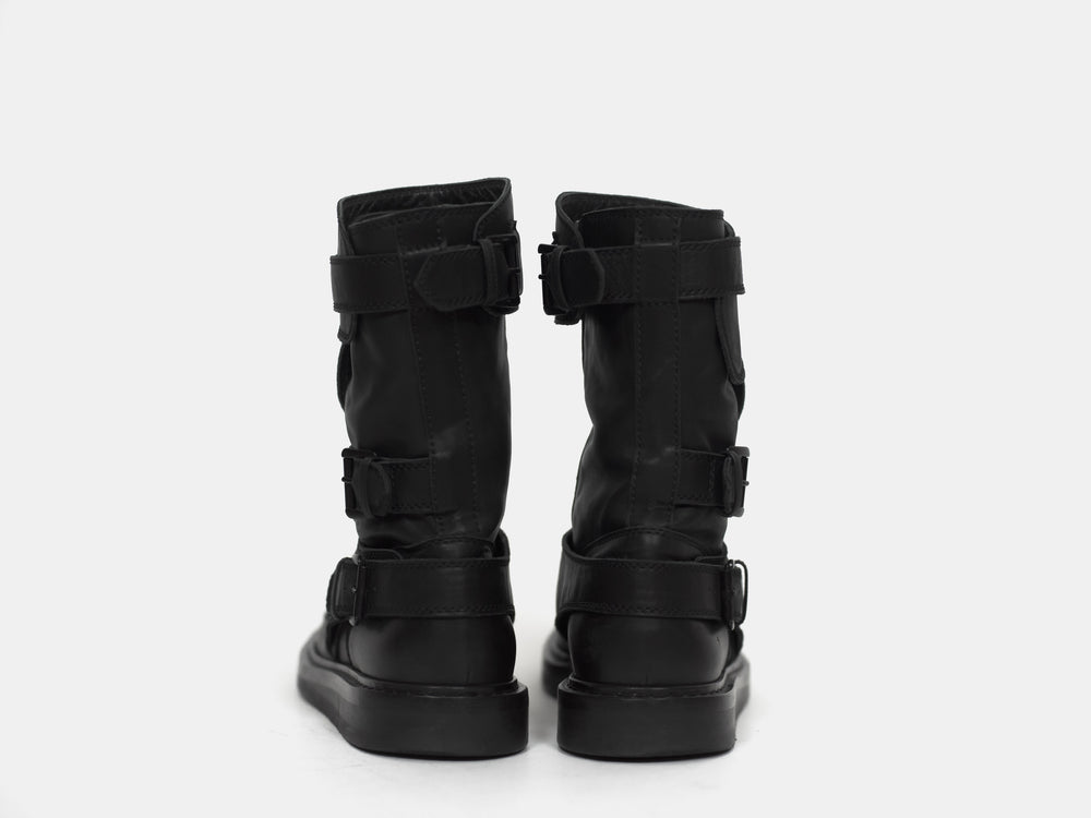 An amazing pair of boots with futuristic moto inspired details such as numerous ergonomically layered buckle straps and toe patch. These take the similarly silhouetted and more popular back lace boots to the next level. Nearly new condition still with original box. Retailed for ¥157,500 or $1400.
