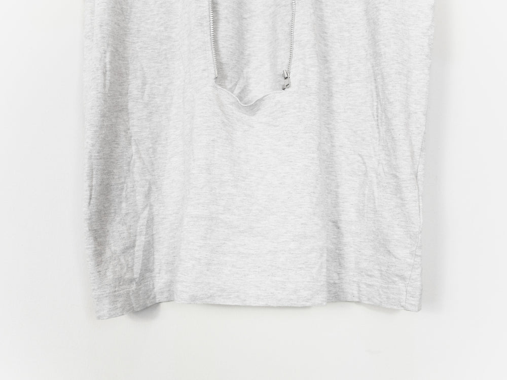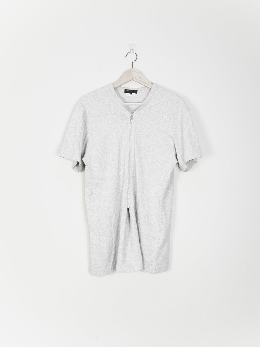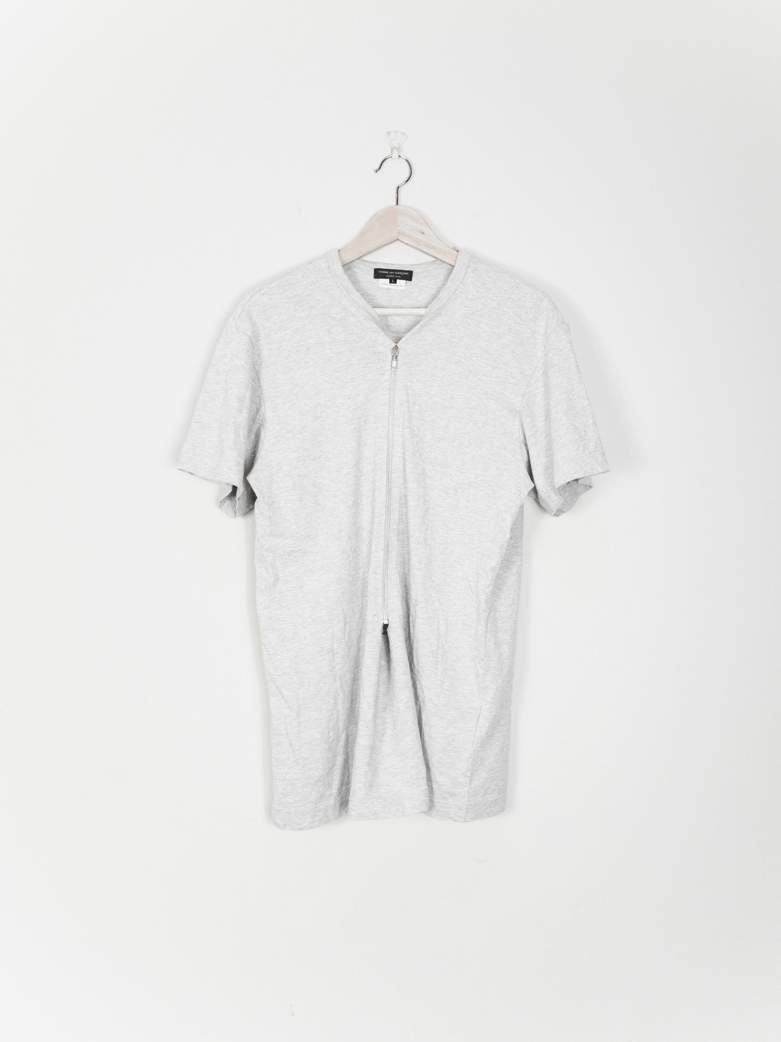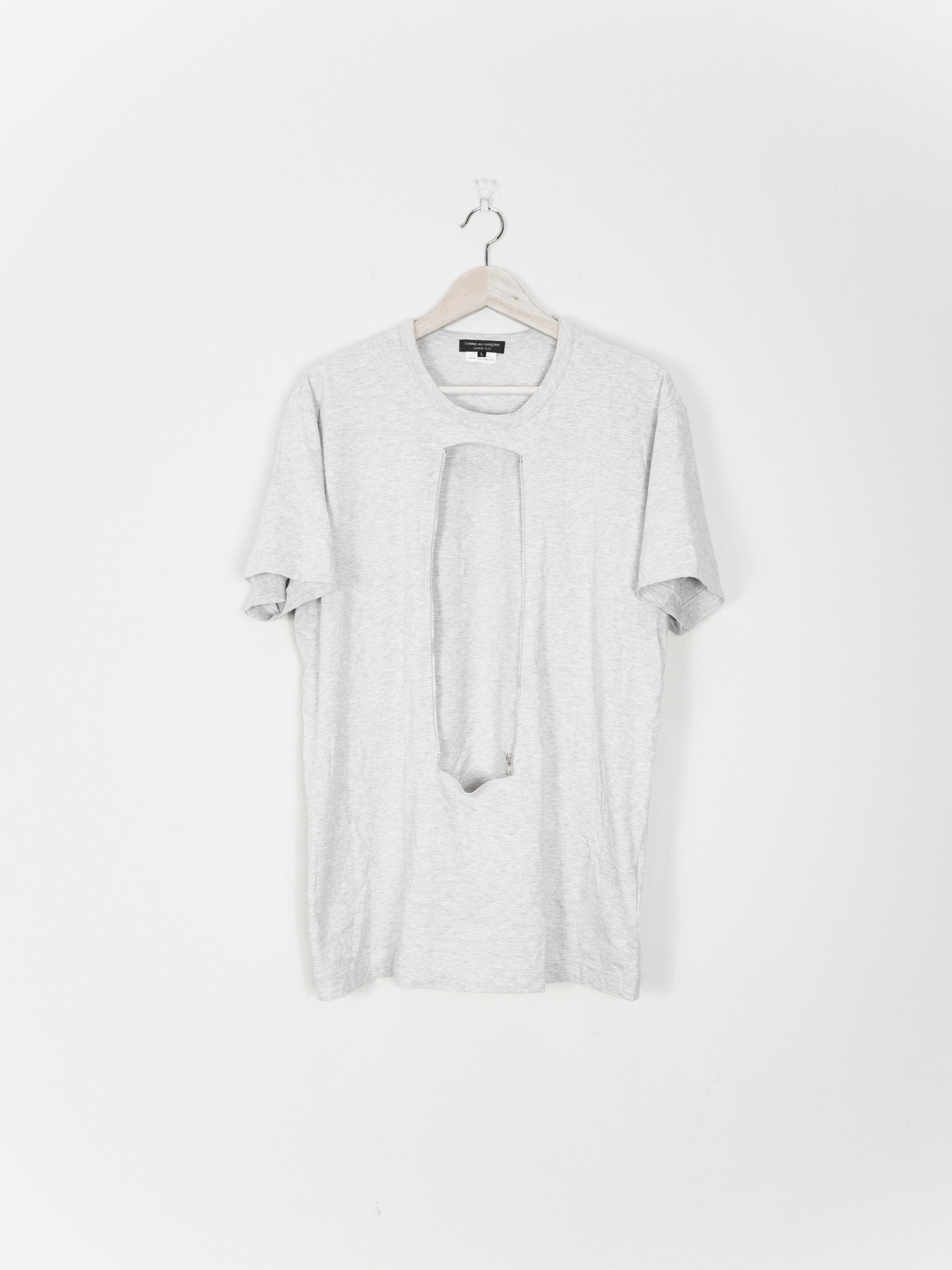 Grey A simple basic that has been subject to Rei Kawakubo's expert deconstructivist sensibilities. The rectangular subtraction at the center of this tee can be bridged by a metallic zipper, creating many possibilities for wear. Layer it over a tank for a graphic contrast or zip it up and enjoy the ruched effect as a previously ordinary t-shirt becomes more visually interesting.
