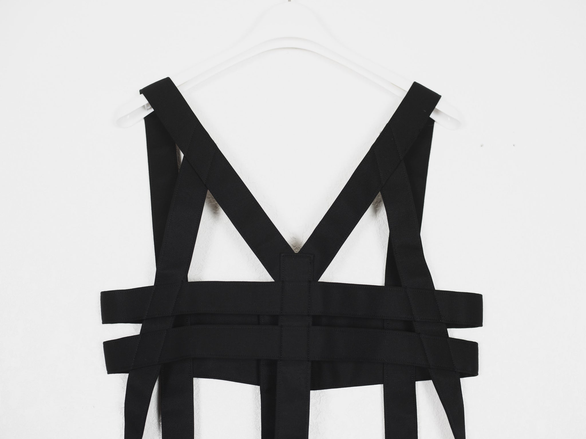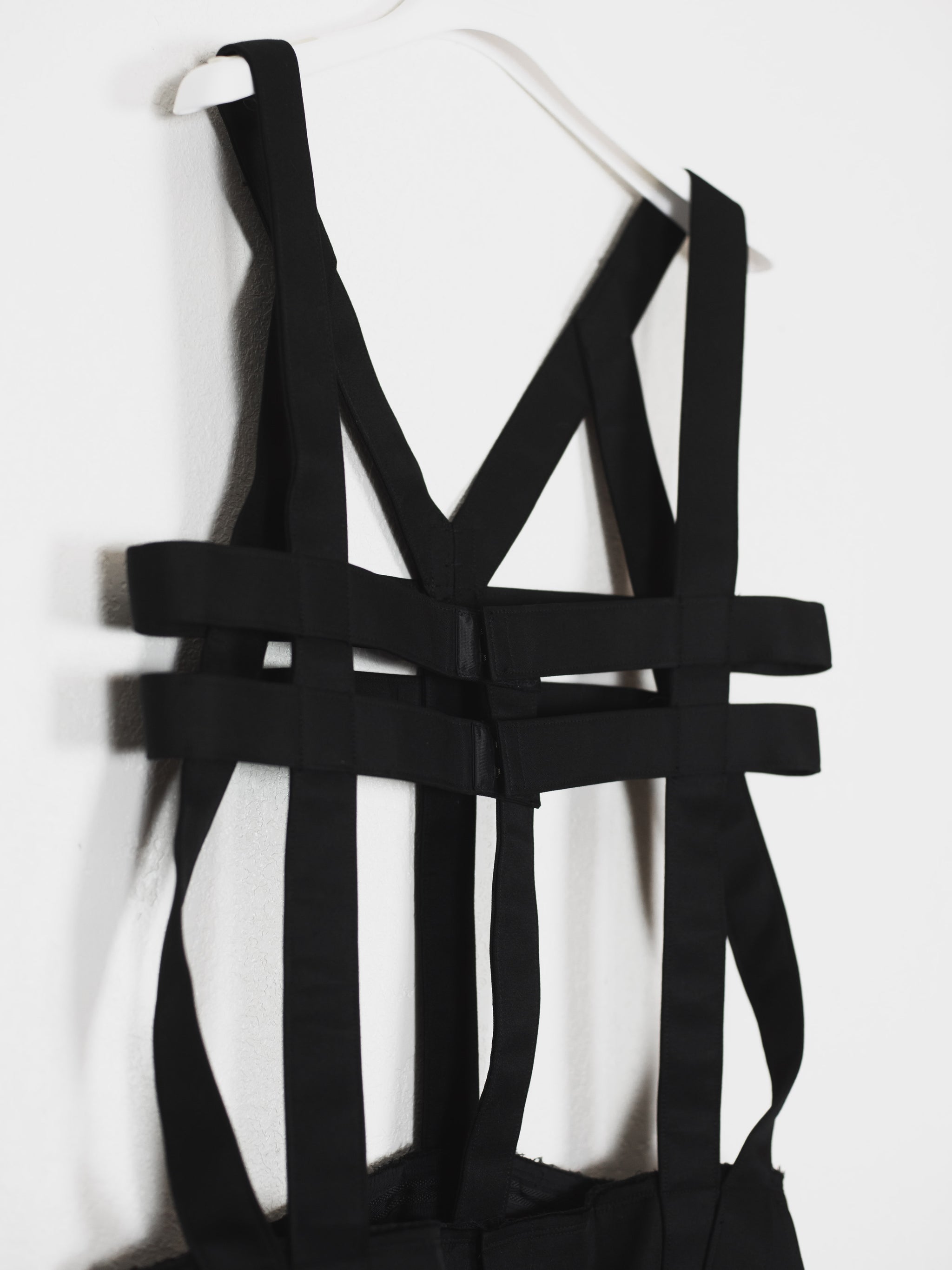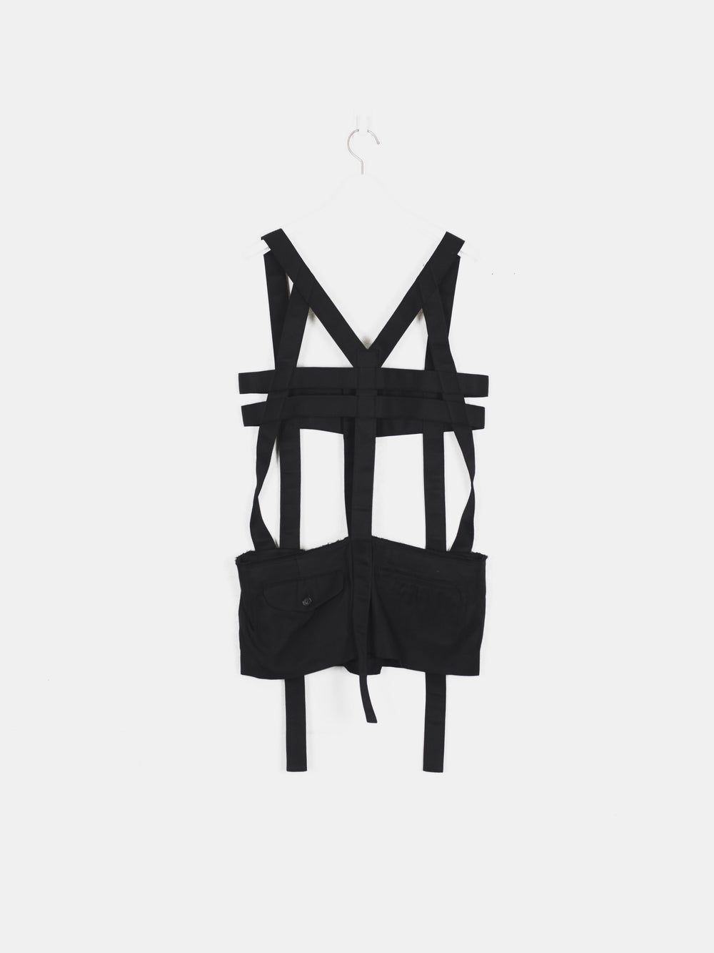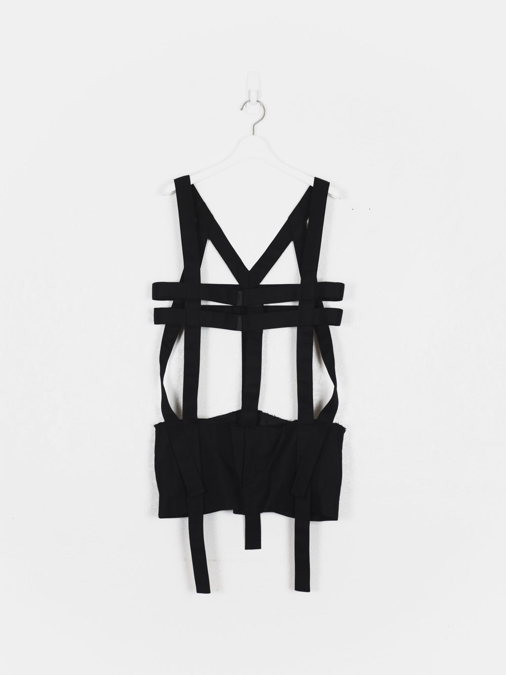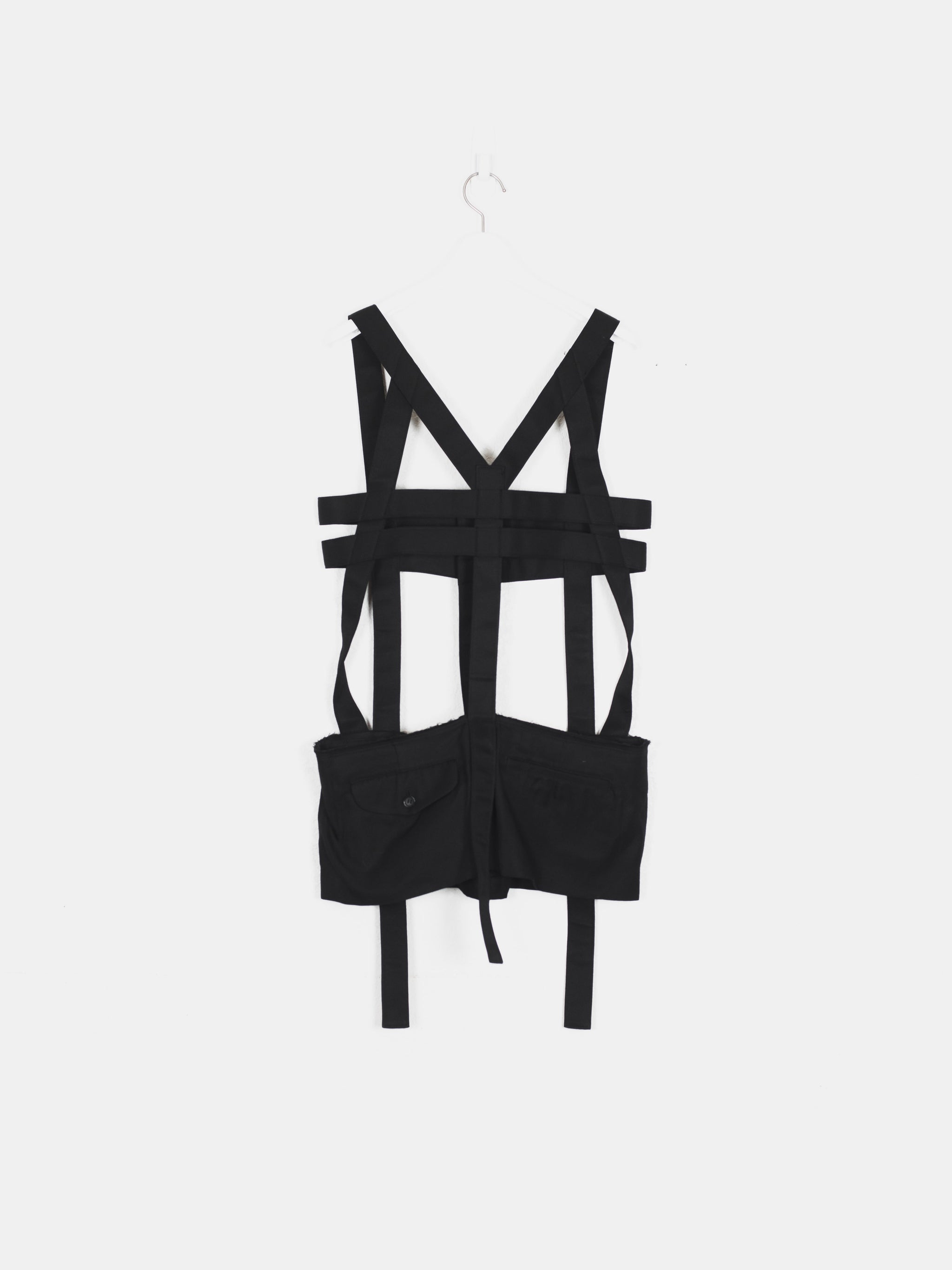 Highlight piece from SS14 Comme des Garçons. The harness overtakes the "skirt" the point of a vestige with pockets, resulting in a versatile layering piece adding visual noise and boldness to any outfit, giving off the appearance of a dress's wireframe, deconstructed yet structural.