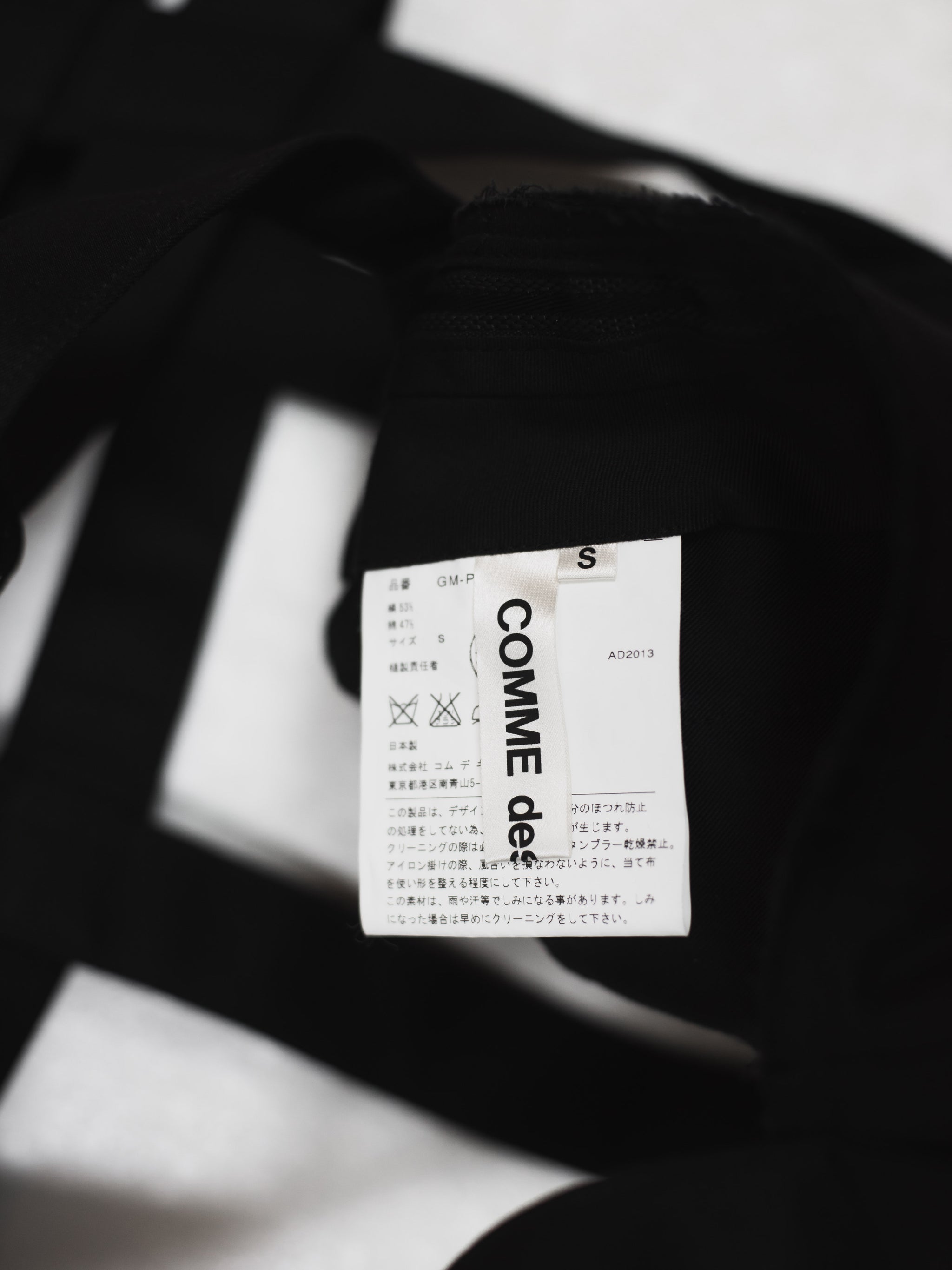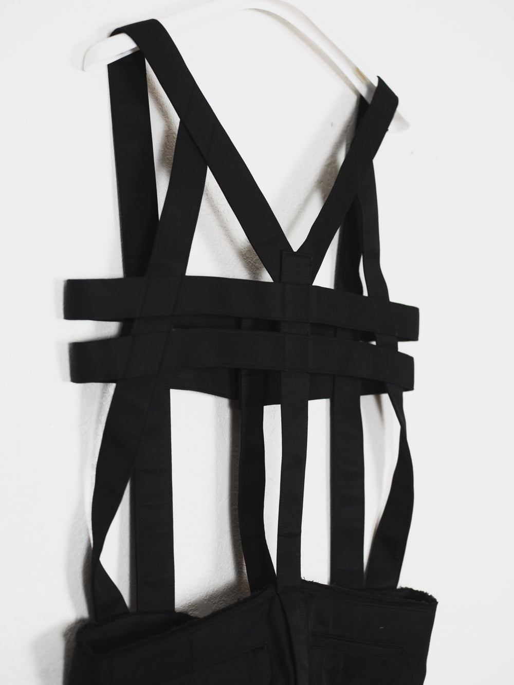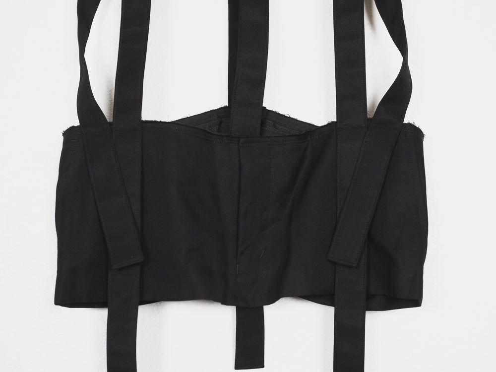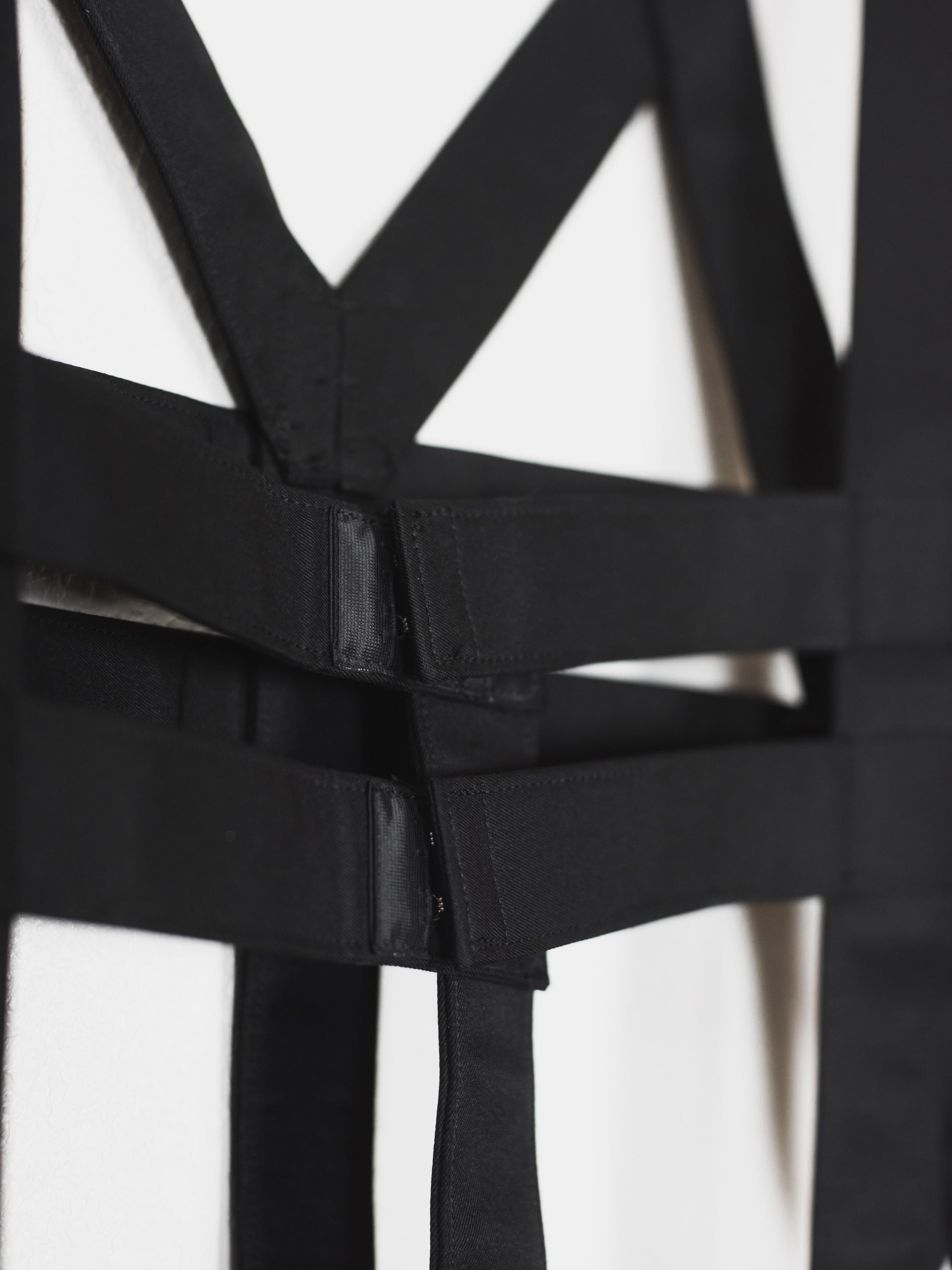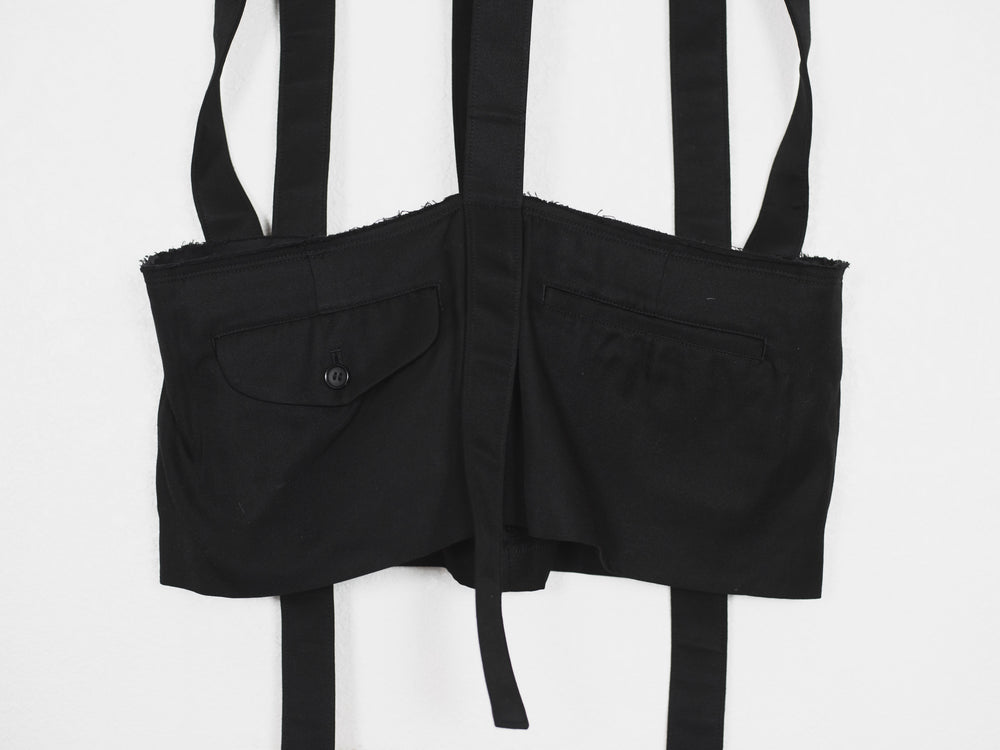 Highlight piece from SS14 Comme des Garçons. The harness overtakes the "skirt" the point of a vestige with pockets, resulting in a versatile layering piece adding visual noise and boldness to any outfit, giving off the appearance of a dress's wireframe, deconstructed yet structural.