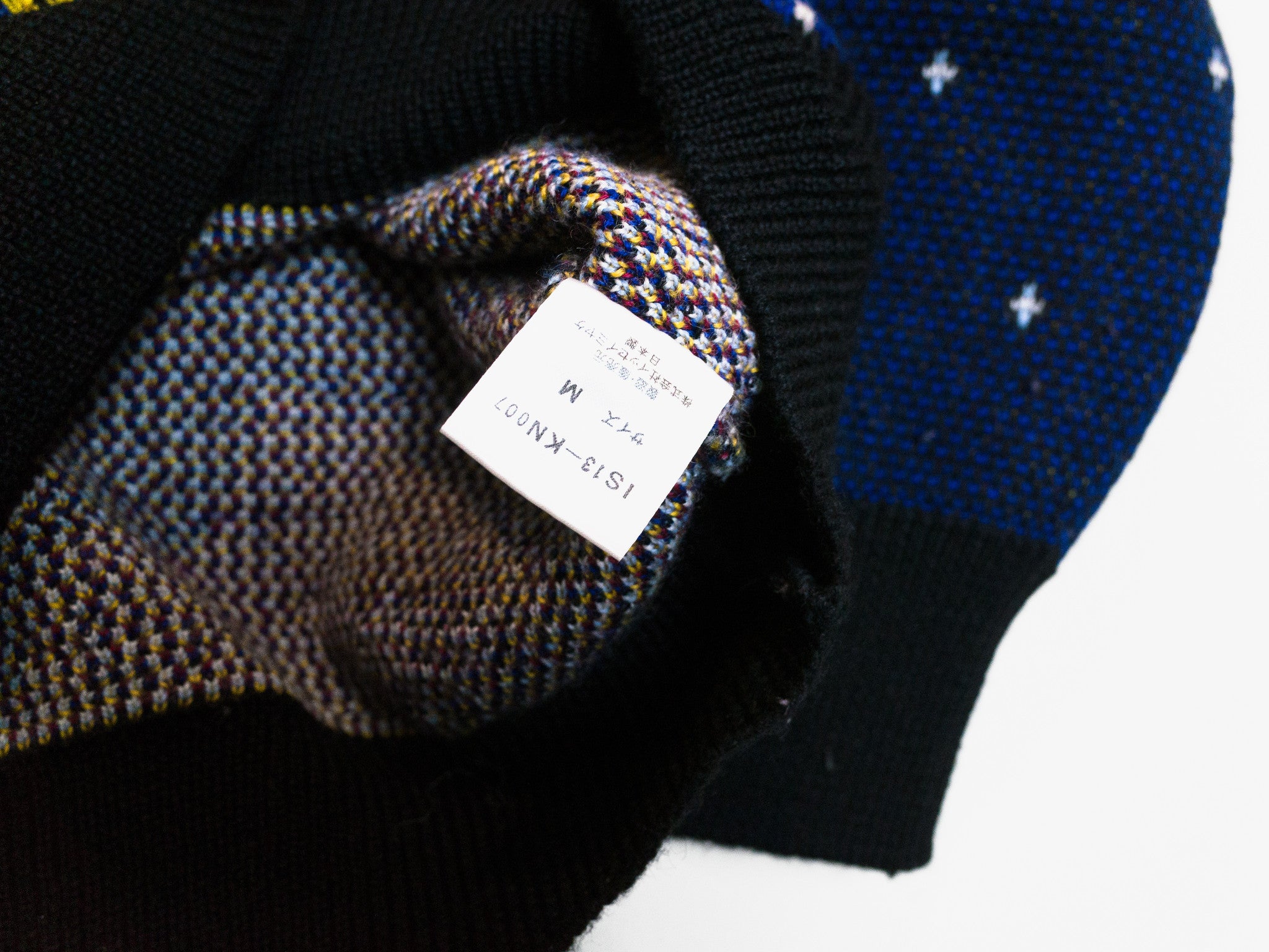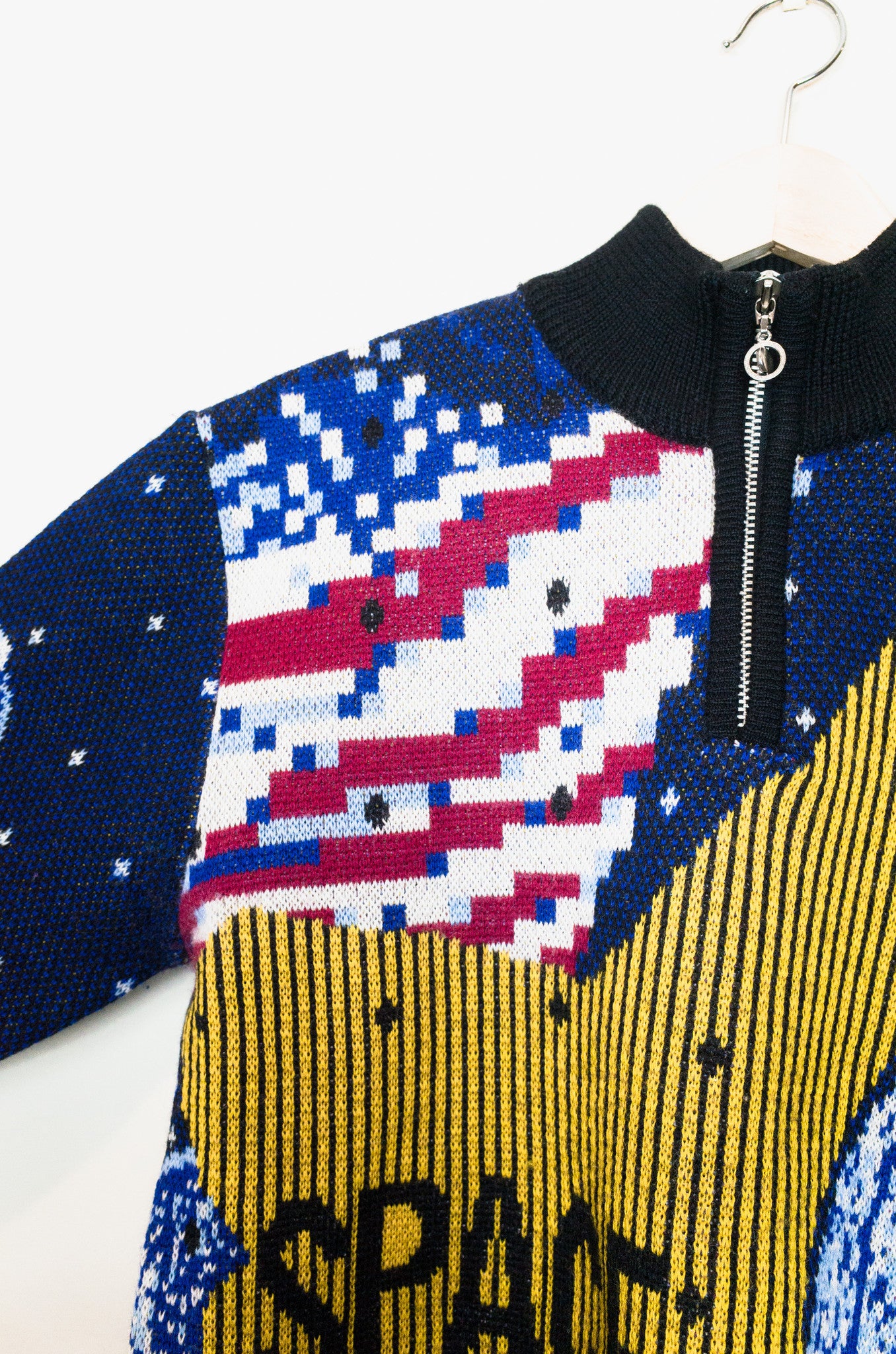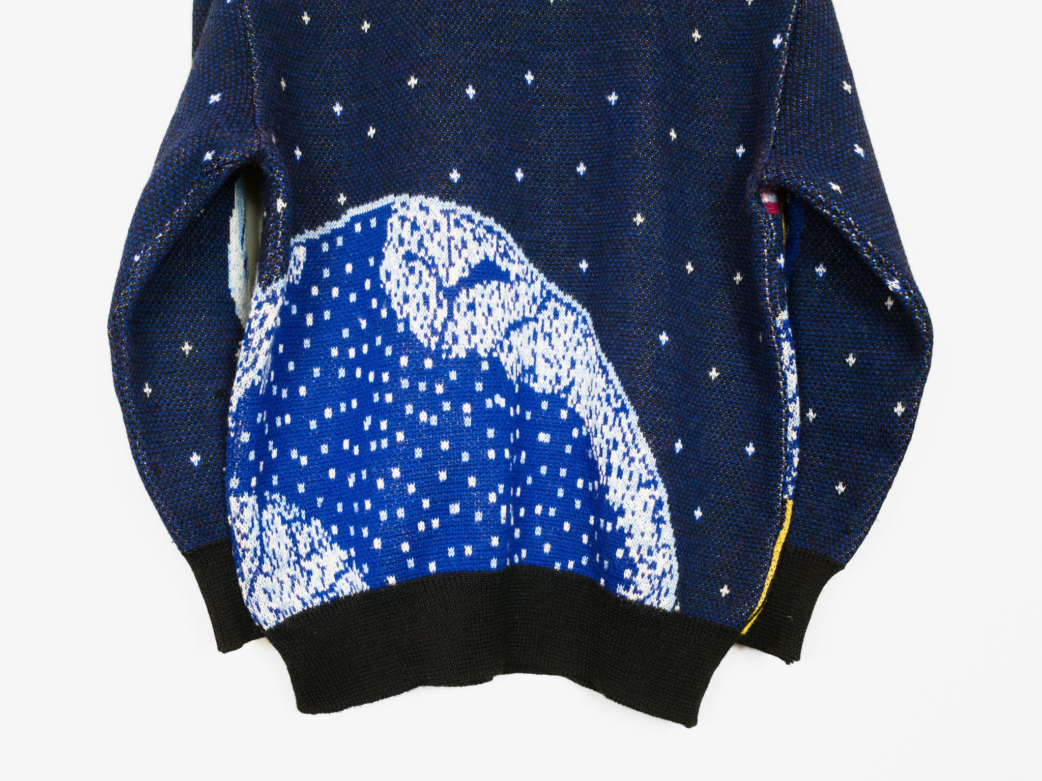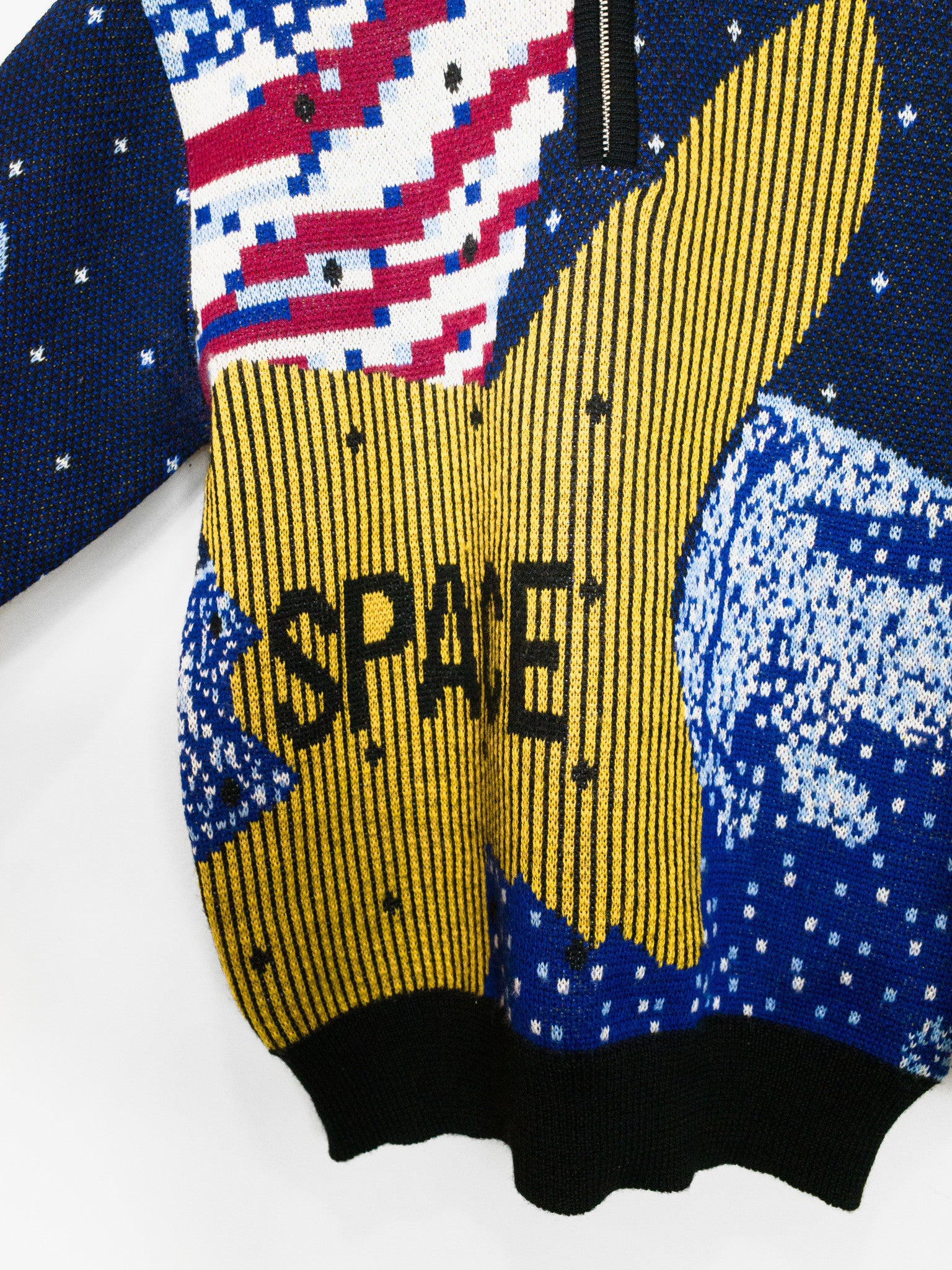 A whimsical space-inspired sweater from the Tsumori Chisato-designed Issey Sport. Soft Jacquard knit woven intricately into a scene featuring Earth, the United States flag, and the bold shadow of a spacecraft. Undoubtedly a precursor of sorts to the recent Saint Laurent NASA jacket, representing a more pure romanticism of cosmic exploration of the time. Finished with a shiny quarter-zip with a spinning medallion as the pull.