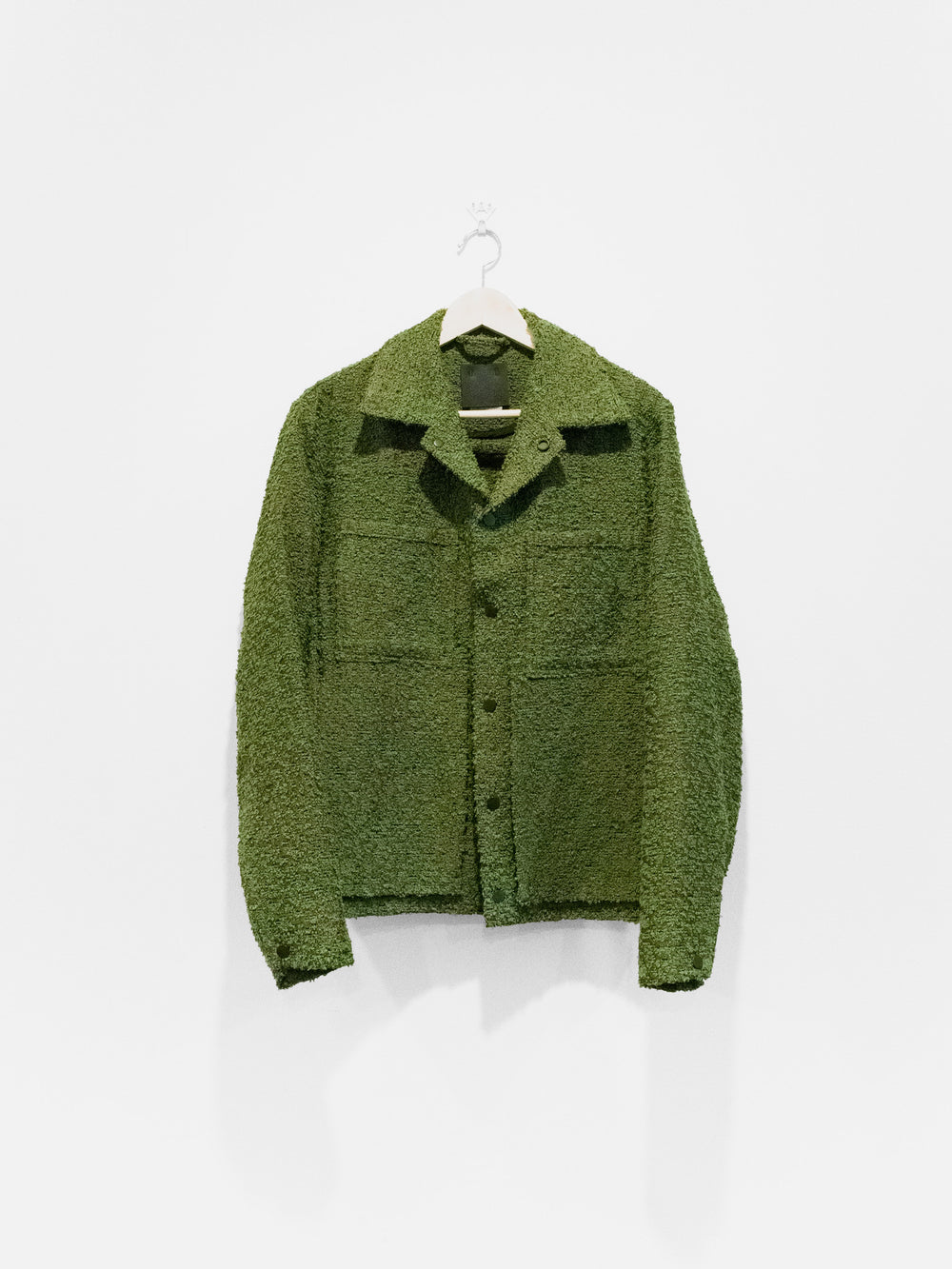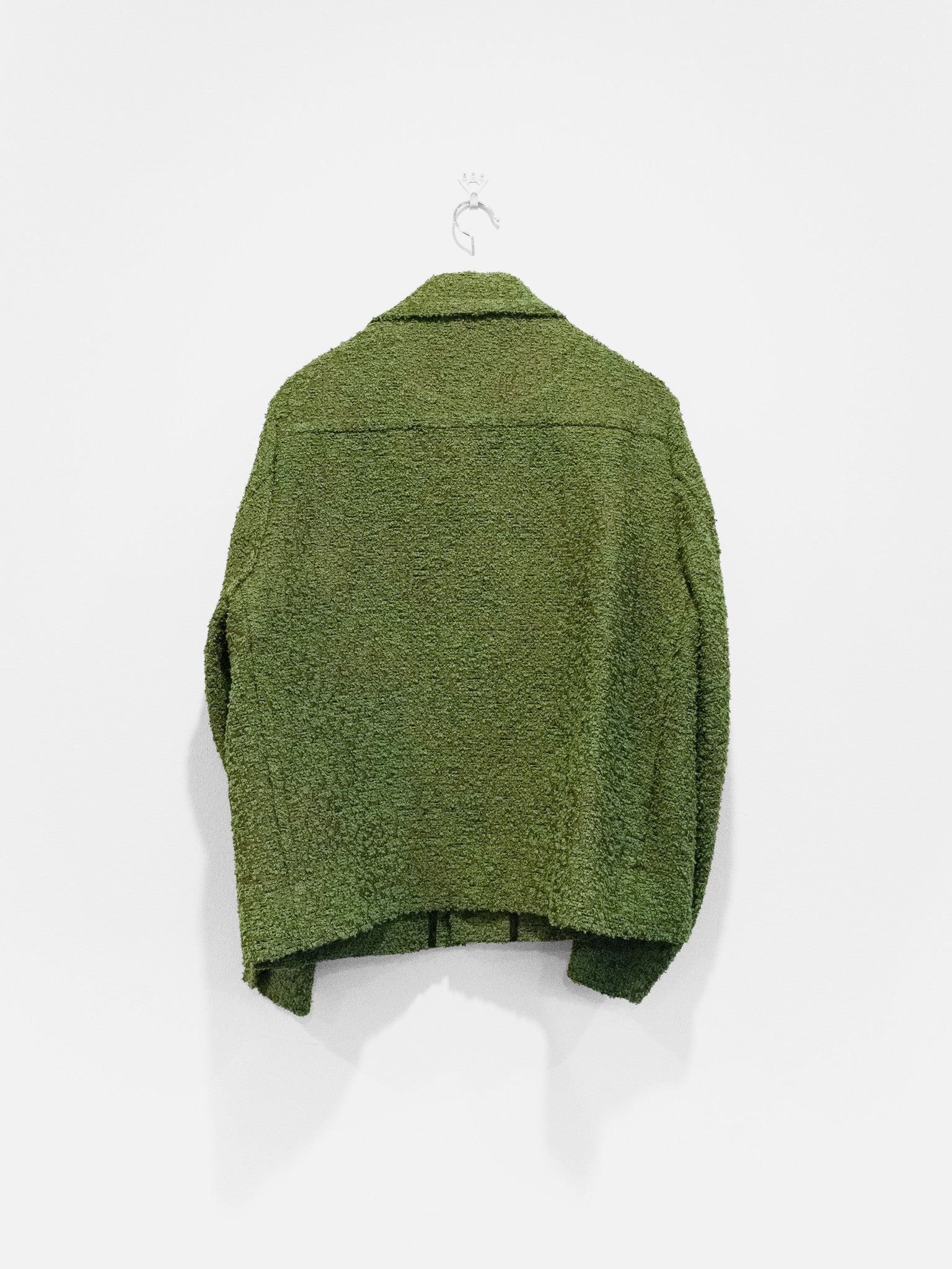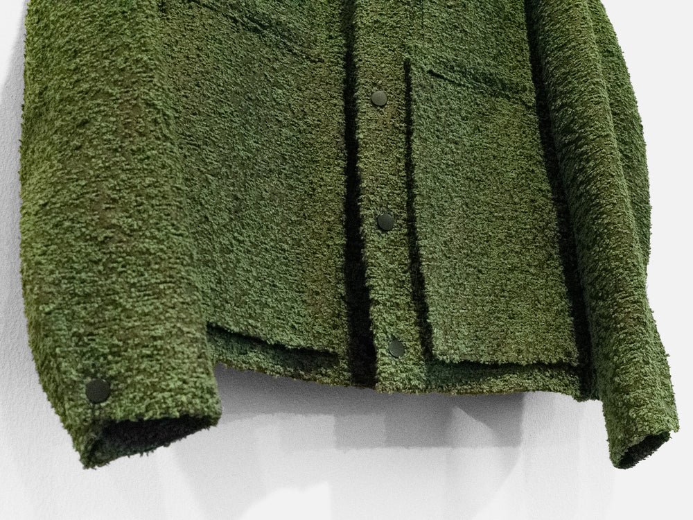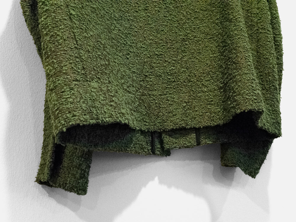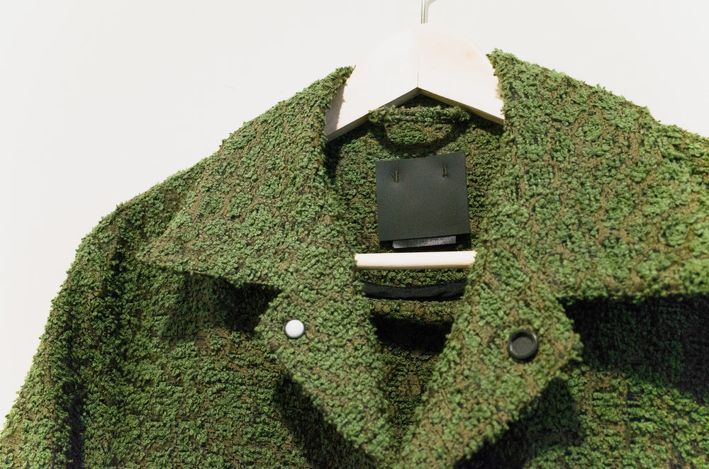 One of Craig Green’s staples, the workwear jacket is an exercise in minimalism and refined utilitarianism - how can one execute a garment like this with contemporary relevance and artful style? From the small gestures like a boxy cut and horizontal back seam construction to the layered and levitating geometric front pockets, the form of this recurring Craig Green is at once steeped in heritage and incredibly fresh. The green boucle fabric produces not only a beautiful visual depth in its pile but also suggests, unconsciously, images of greenery. Personally, the green loops peeking through the silky brown weave conjure the sights of mossy green growths sprouting from worn concrete structures in the city landscape. As such, the piece becomes an excellent envisioning of clothing as an interface between wearer and environment, an intimate medium on which textures and images that exist on a larger scale can be mapped. A form of urban camouflage, illustrating jarring visual sameness and difference.