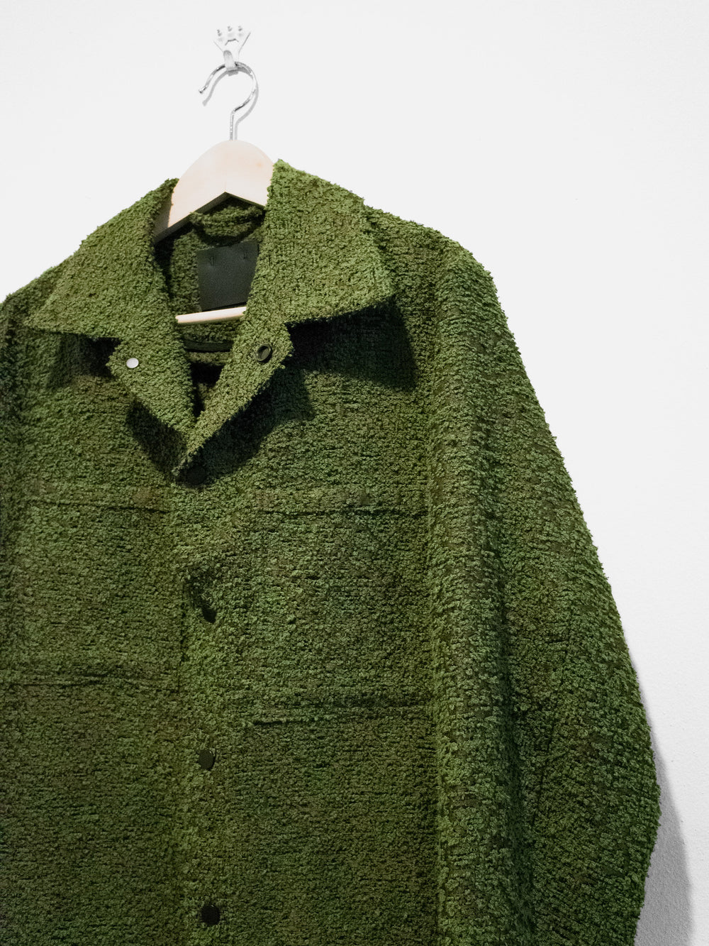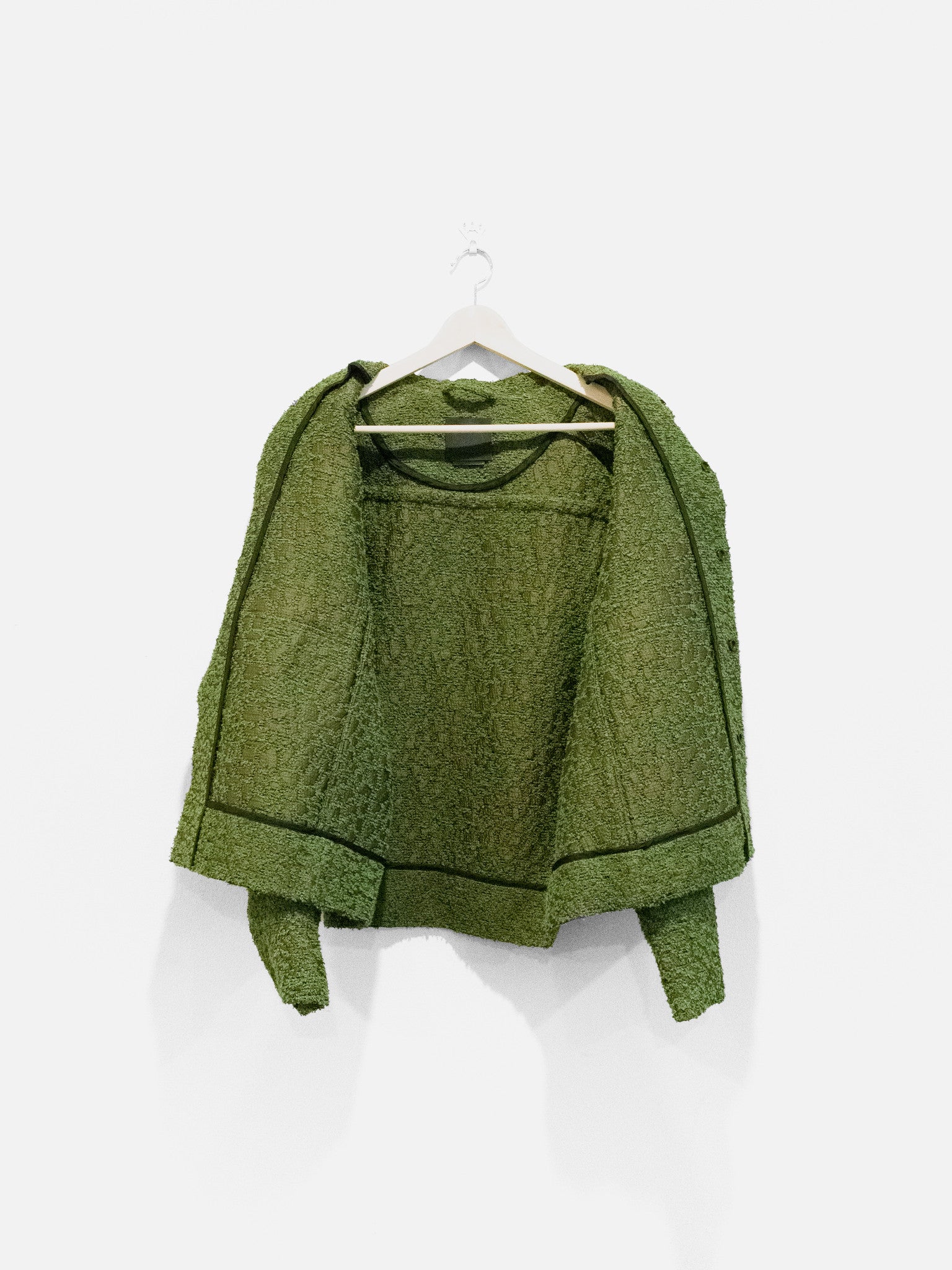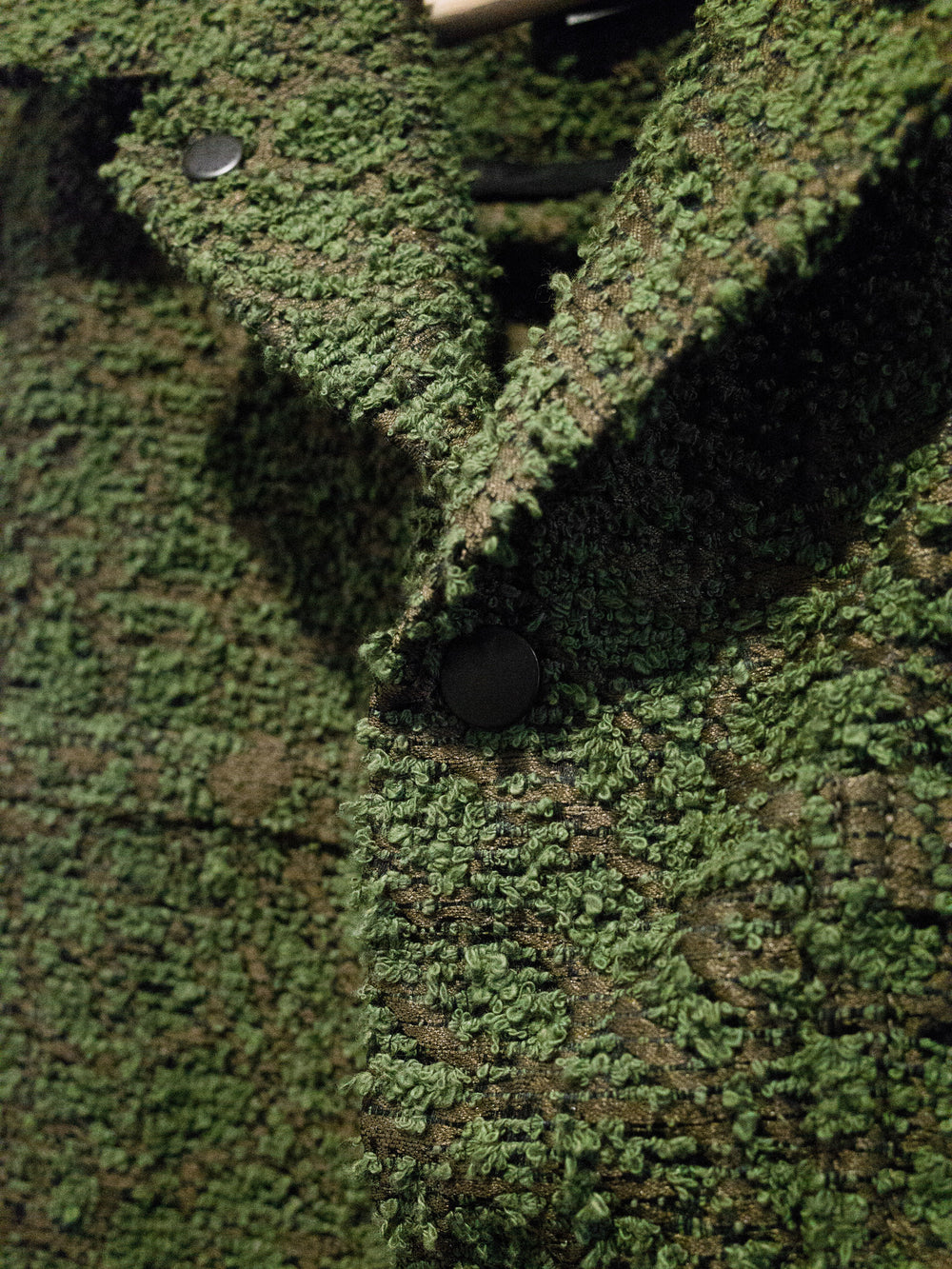 One of Craig Green’s staples, the workwear jacket is an exercise in minimalism and refined utilitarianism - how can one execute a garment like this with contemporary relevance and artful style? From the small gestures like a boxy cut and horizontal back seam construction to the layered and levitating geometric front pockets, the form of this recurring Craig Green is at once steeped in heritage and incredibly fresh. The green boucle fabric produces not only a beautiful visual depth in its pile but also suggests, unconsciously, images of greenery. Personally, the green loops peeking through the silky brown weave conjure the sights of mossy green growths sprouting from worn concrete structures in the city landscape. As such, the piece becomes an excellent envisioning of clothing as an interface between wearer and environment, an intimate medium on which textures and images that exist on a larger scale can be mapped. A form of urban camouflage, illustrating jarring visual sameness and difference.