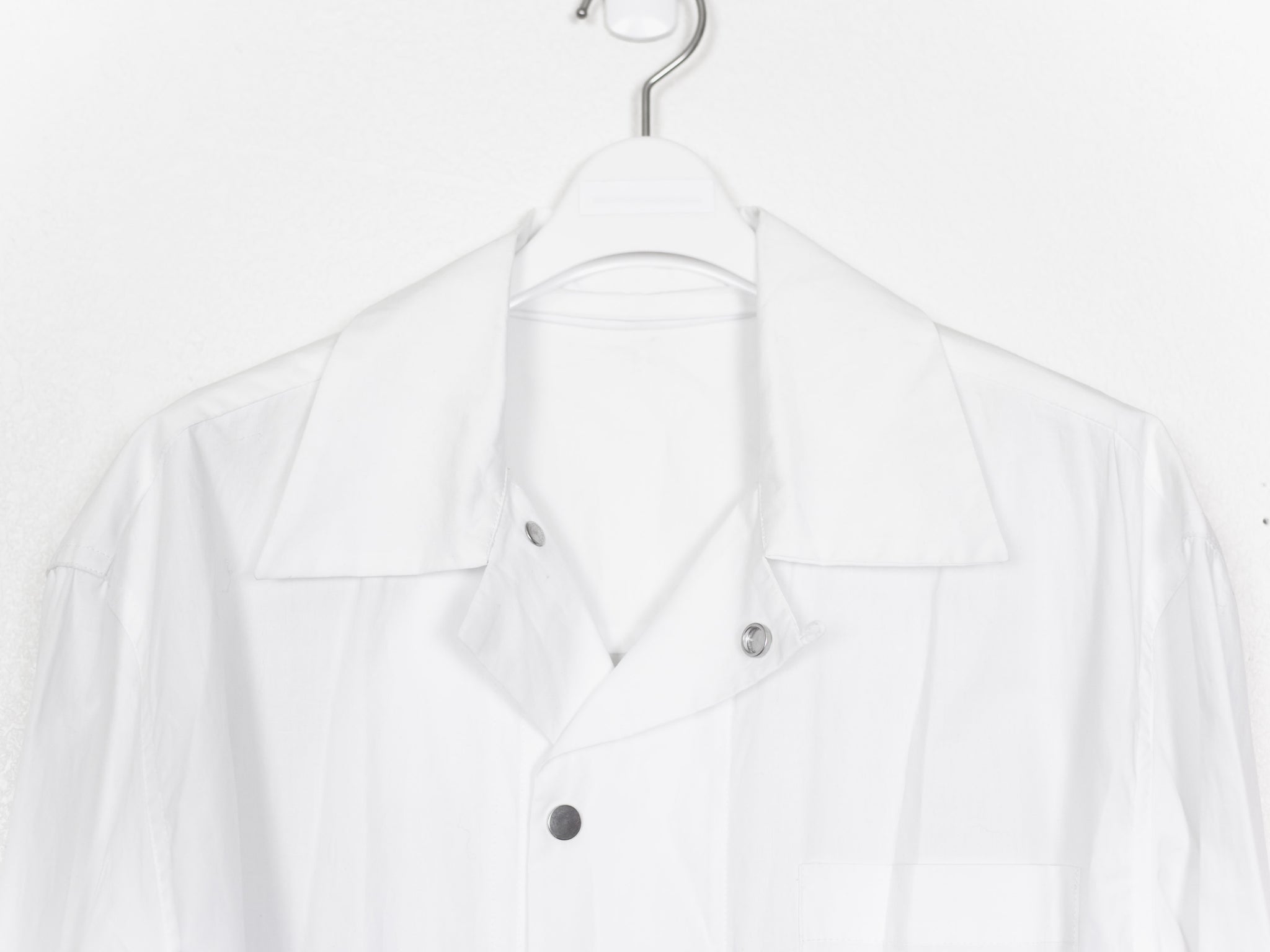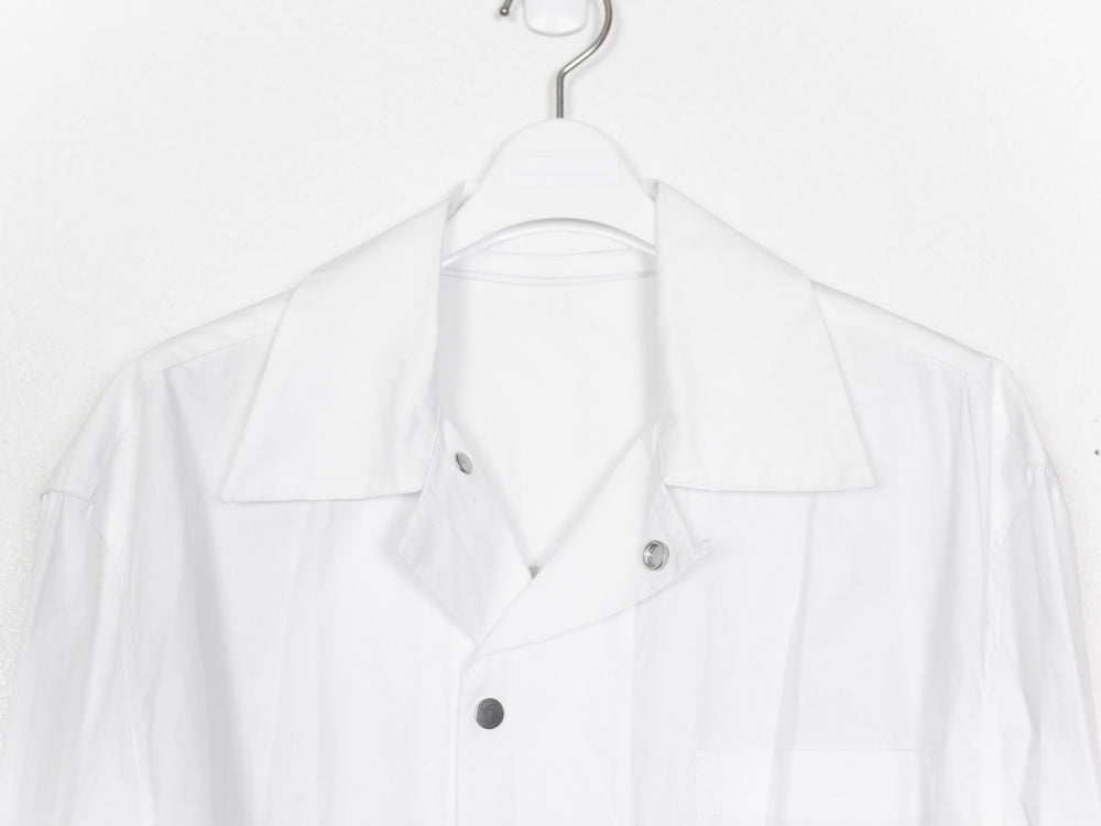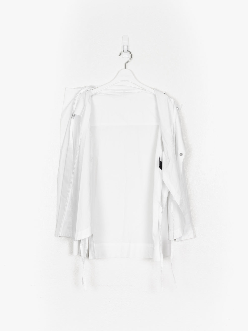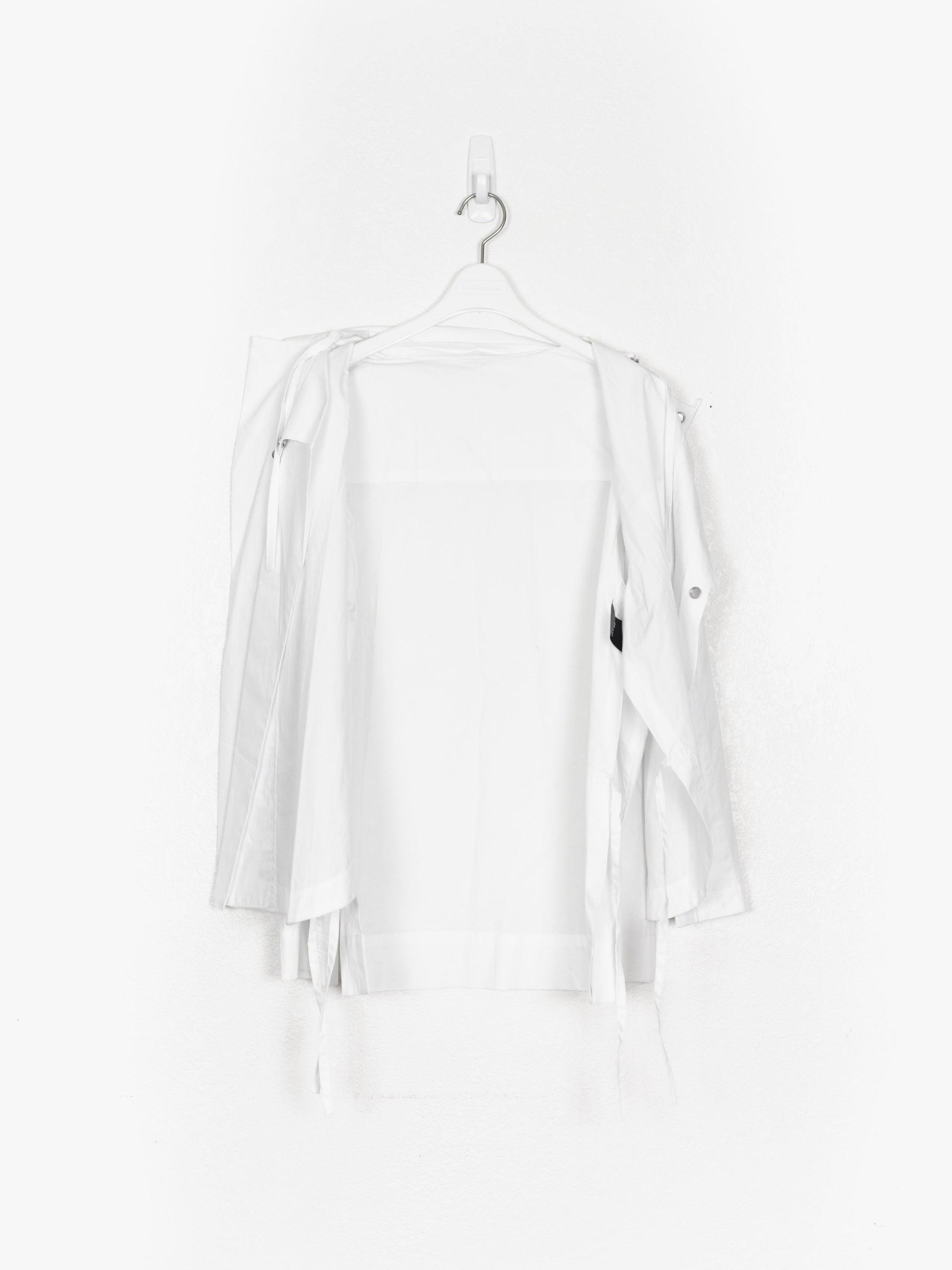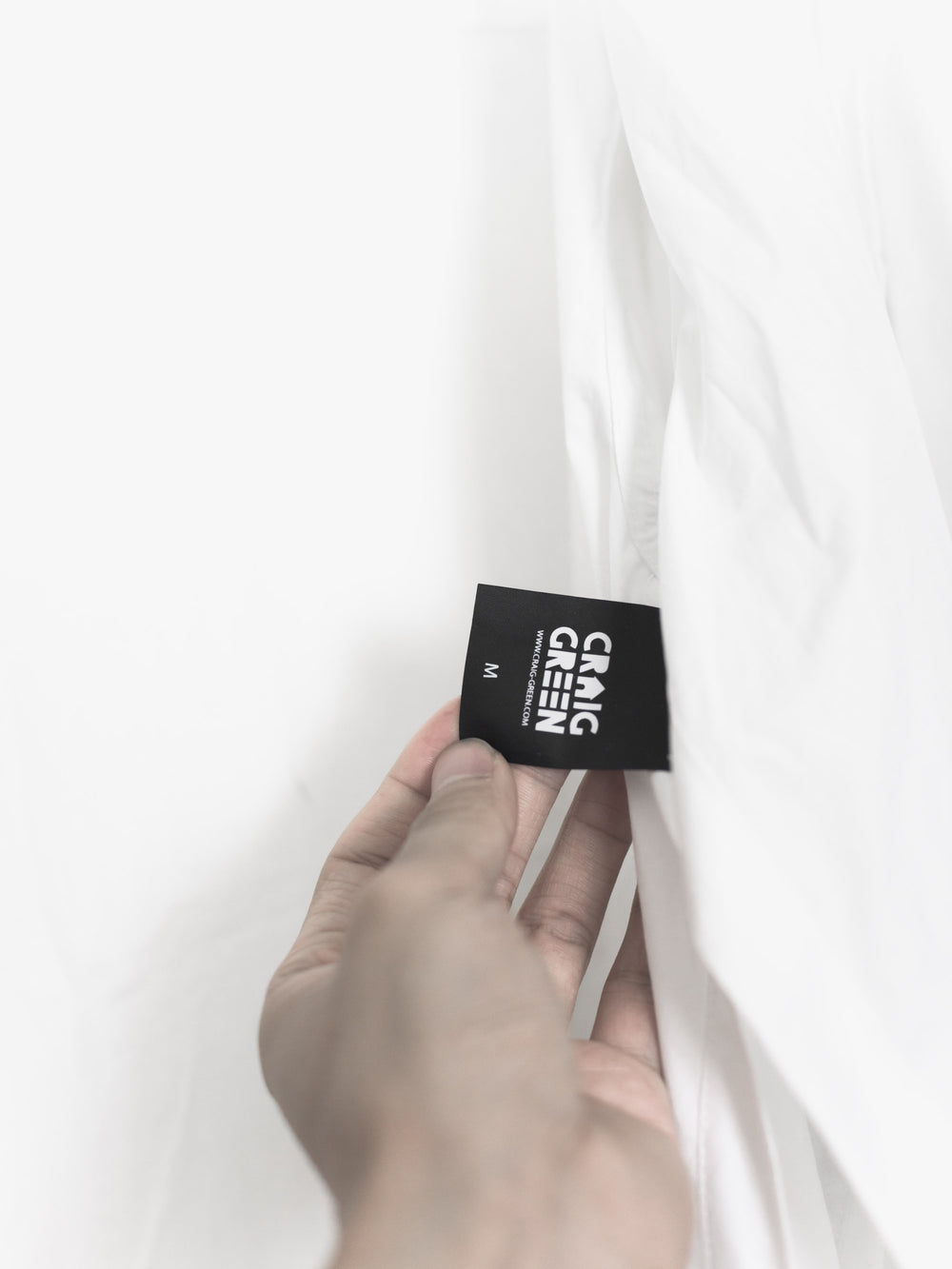This sample piece embodies many of Craig Green's motifs with numerous functional ties, clean cut yet standout collars, and a playfully relaxed fit, all of which result in a very dynamic creation. Like many of his pieces, the wearer is free to configure what at first glance seems like a standard white shirt into many variations. The asymmetric placket allows the collar to be folded down like a lapel or up like a subdued button-up. There's a hidden flap that can be clasped to appear like an extra layer or a T-shirt when buttoned up. The side slits with string ties allow a billowy carefree fit or any level of traditional slimness. The buttons are very satisfying metal snap closures.