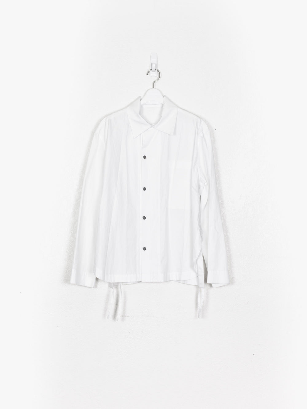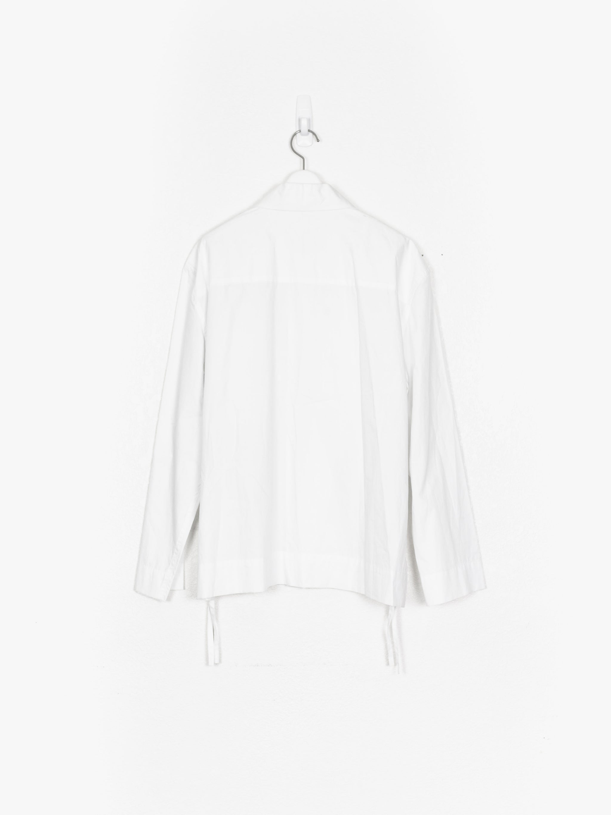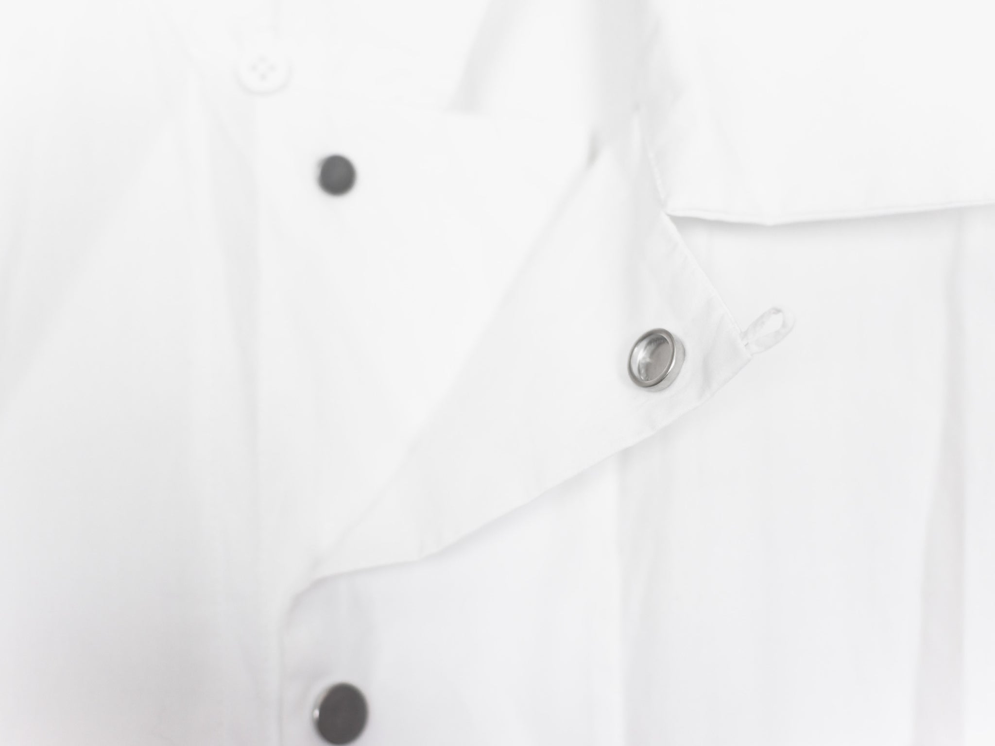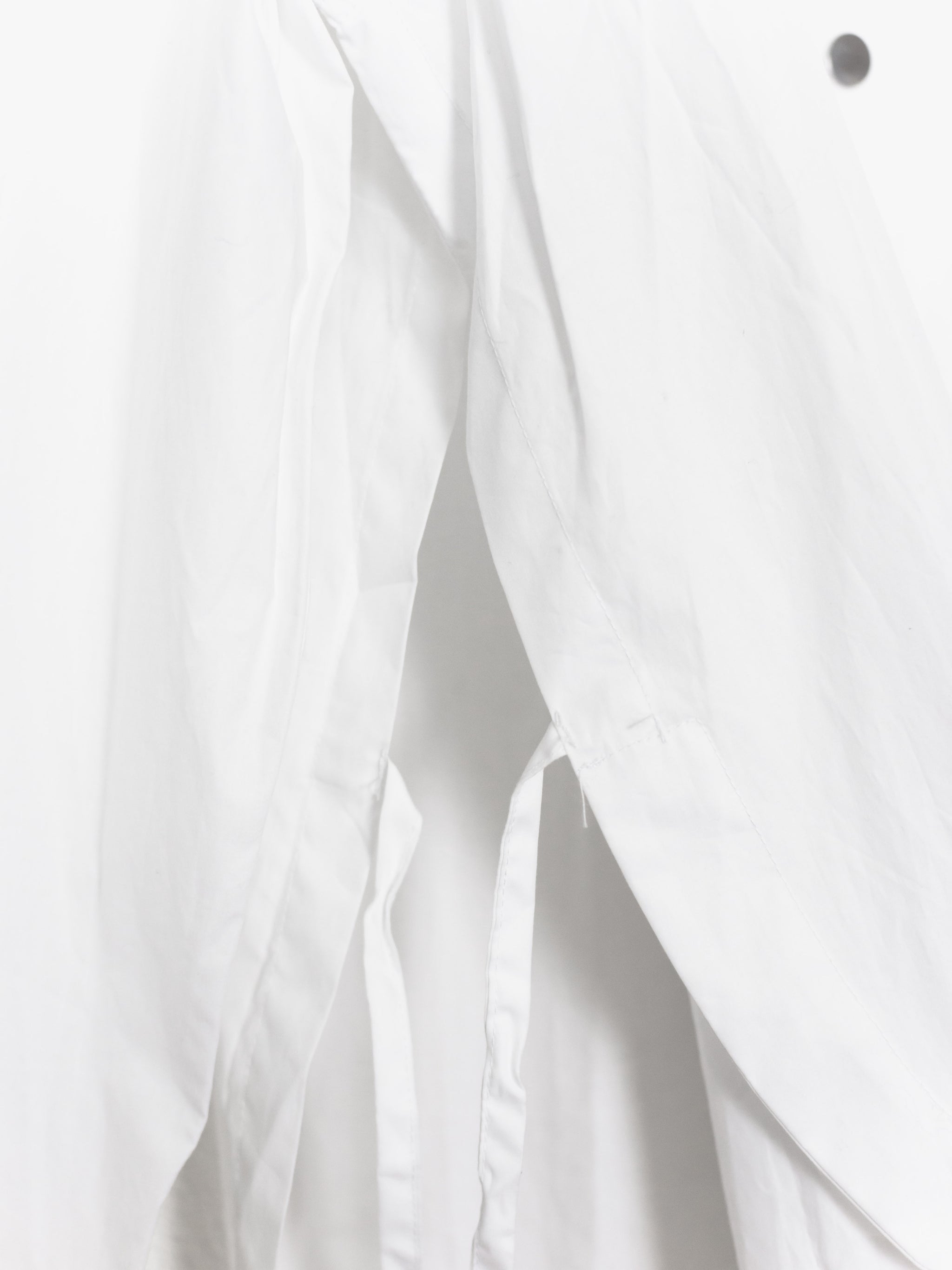 This sample piece embodies many of Craig Green's motifs with numerous functional ties, clean cut yet standout collars, and a playfully relaxed fit, all of which result in a very dynamic creation. Like many of his pieces, the wearer is free to configure what at first glance seems like a standard white shirt into many variations. The asymmetric placket allows the collar to be folded down like a lapel or up like a subdued button-up. There's a hidden flap that can be clasped to appear like an extra layer or a T-shirt when buttoned up. The side slits with string ties allow a billowy carefree fit or any level of traditional slimness. The buttons are very satisfying metal snap closures.