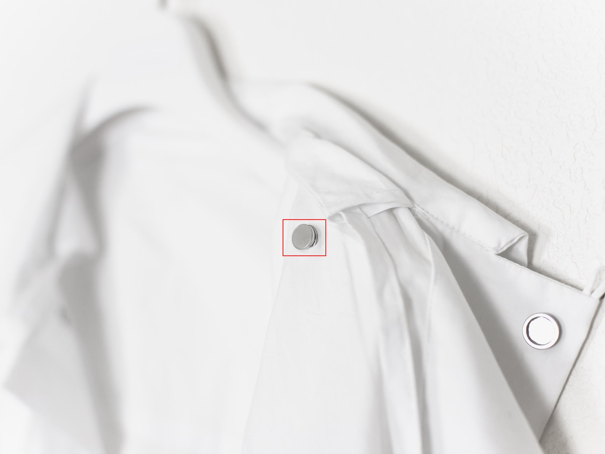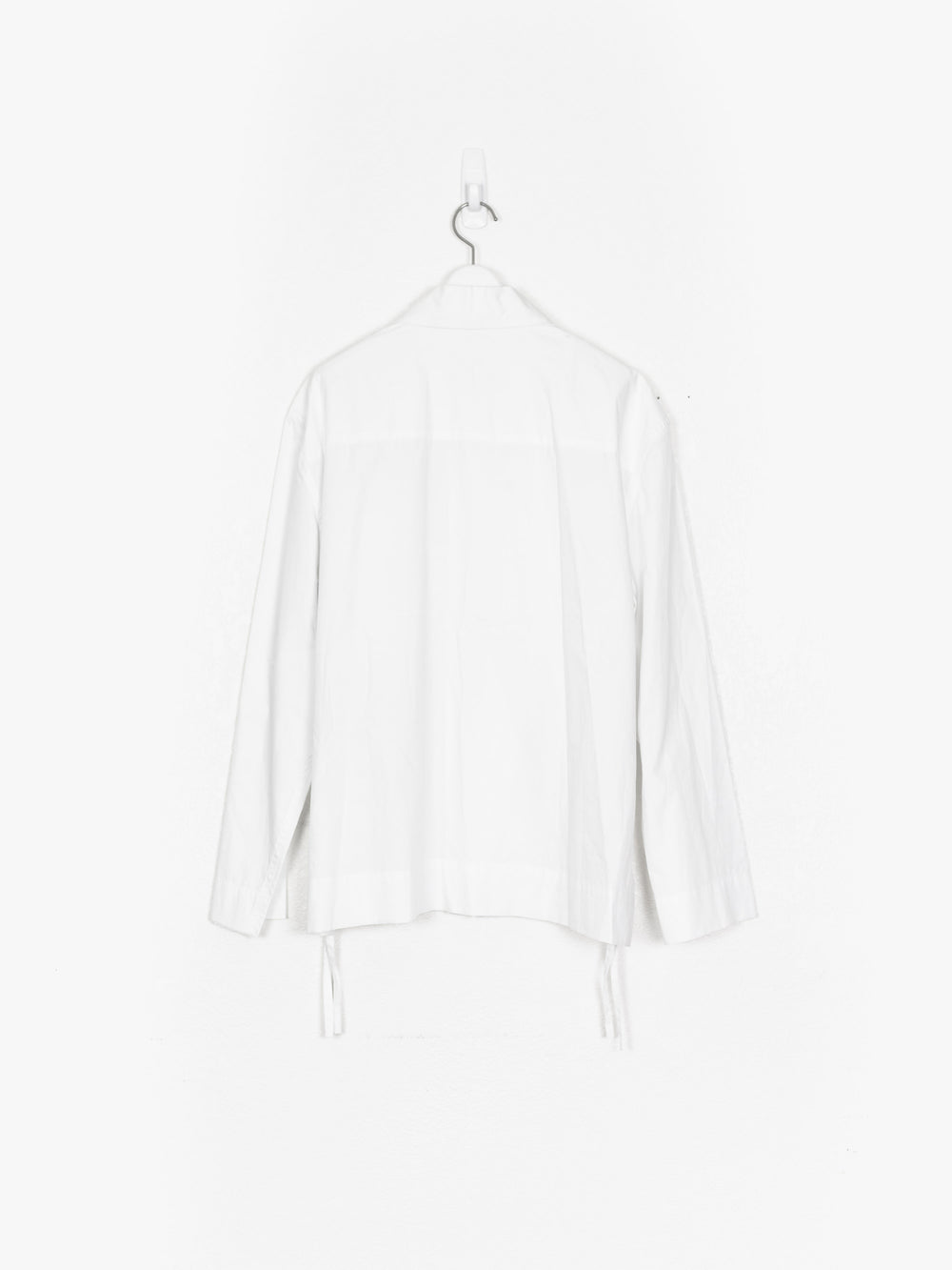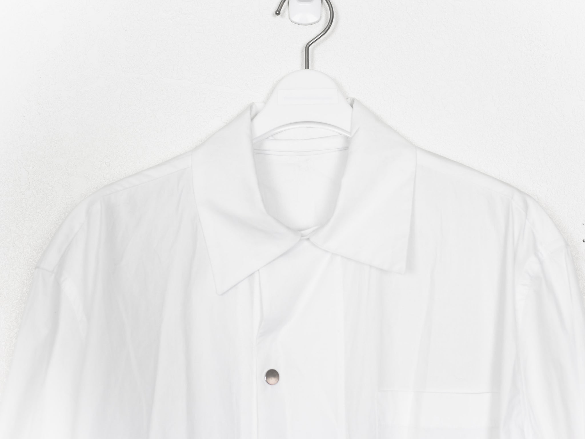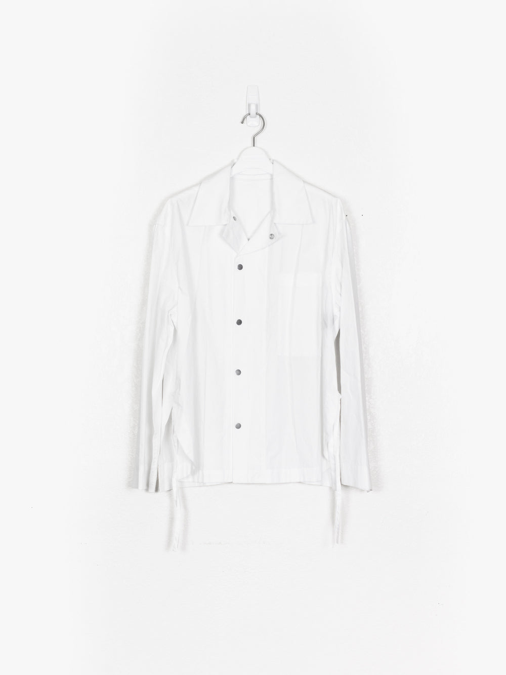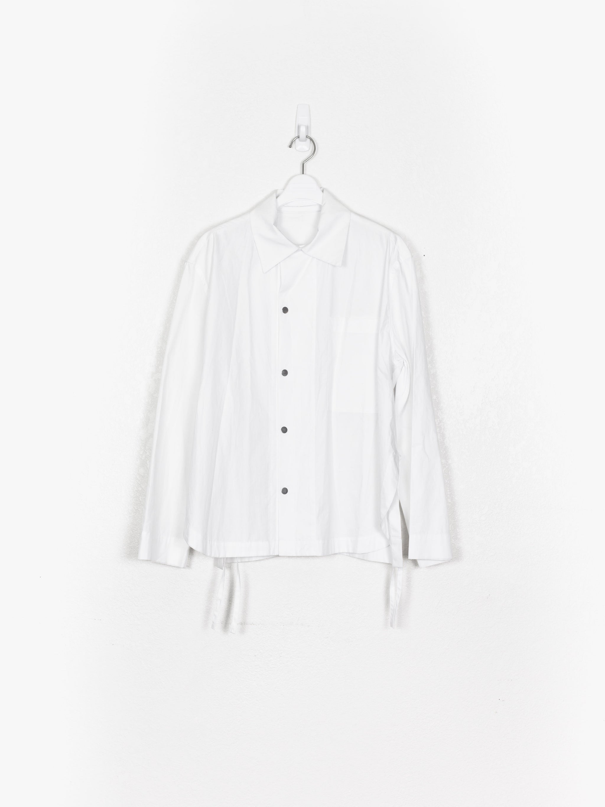 This sample piece embodies many of Craig Green's motifs with numerous functional ties, clean cut yet standout collars, and a playfully relaxed fit, all of which result in a very dynamic creation. Like many of his pieces, the wearer is free to configure what at first glance seems like a standard white shirt into many variations. The asymmetric placket allows the collar to be folded down like a lapel or up like a subdued button-up. There's a hidden flap that can be clasped to appear like an extra layer or a T-shirt when buttoned up. The side slits with string ties allow a billowy carefree fit or any level of traditional slimness. The buttons are very satisfying metal snap closures.