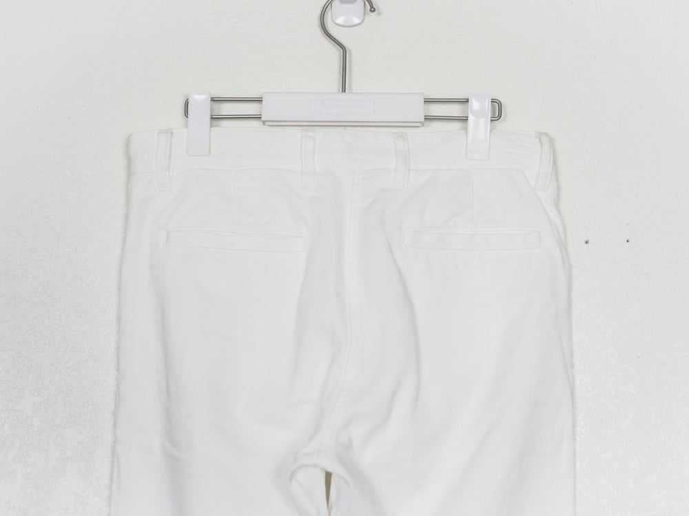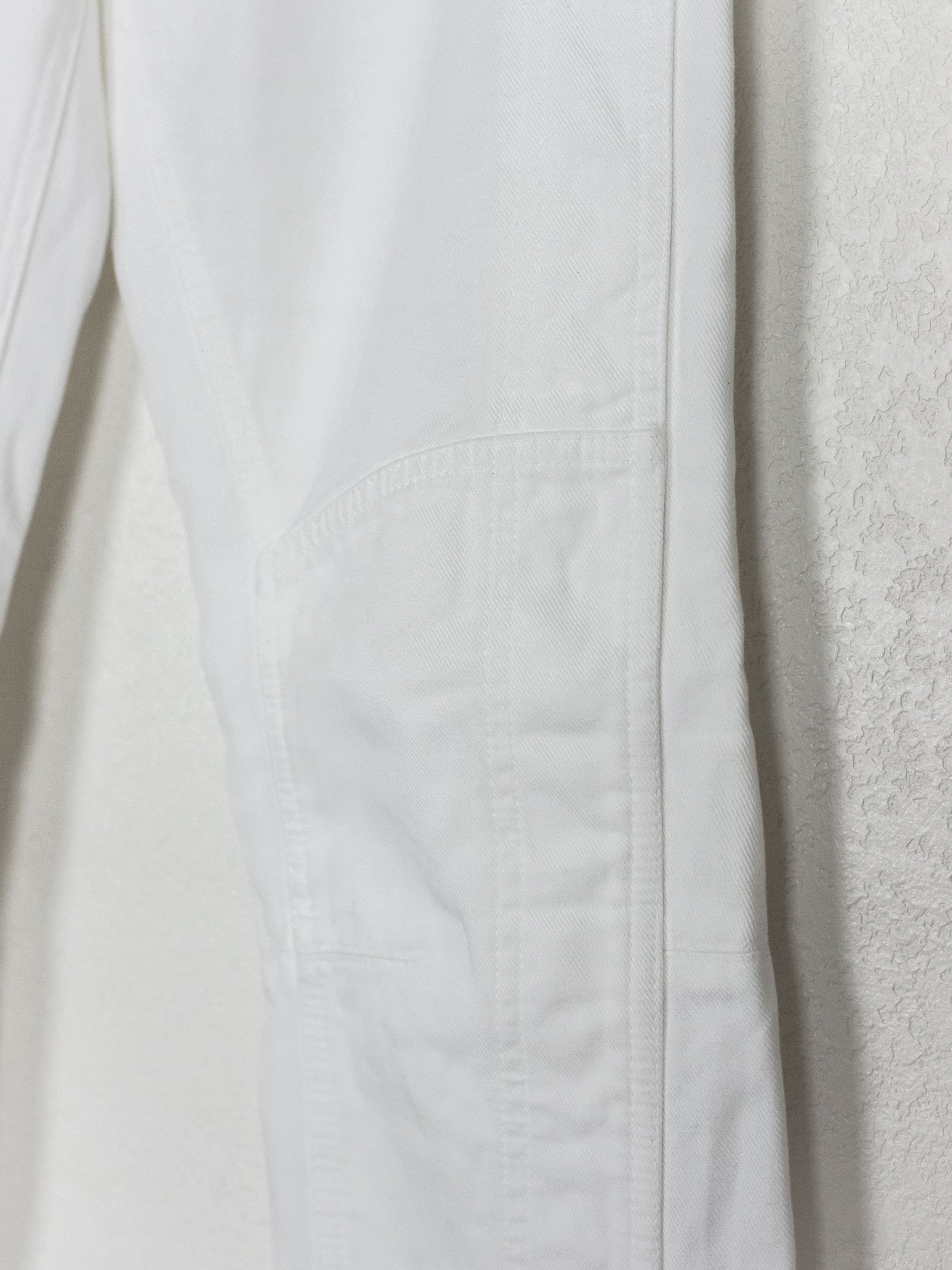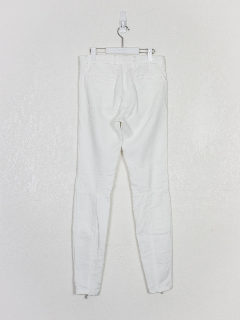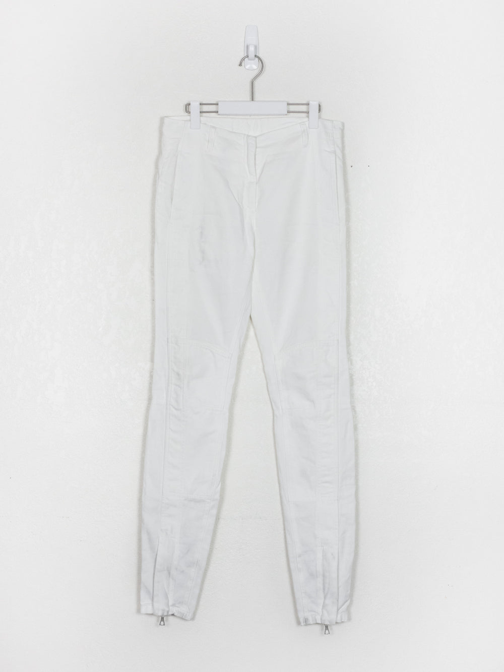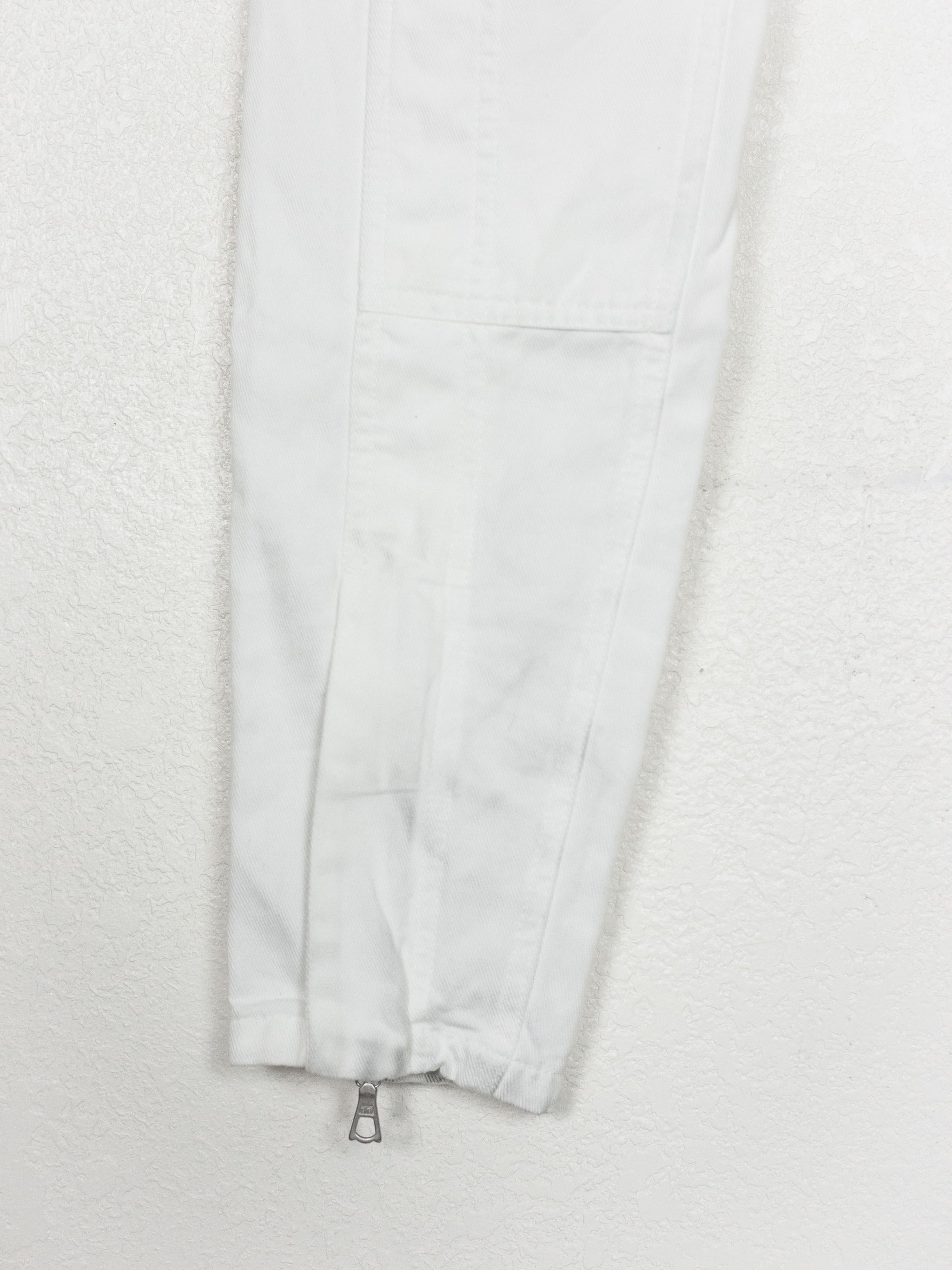 Streamlined trousers in a textured cotton with subtle yet intricate panelling details throughout, reminiscent of a subdued biker jean. The pocket opening, knee paneling, and ankle zip all converge in one line, creating a sleek and flattering profile. Detailed with super smooth heavy duty Riri zippers.