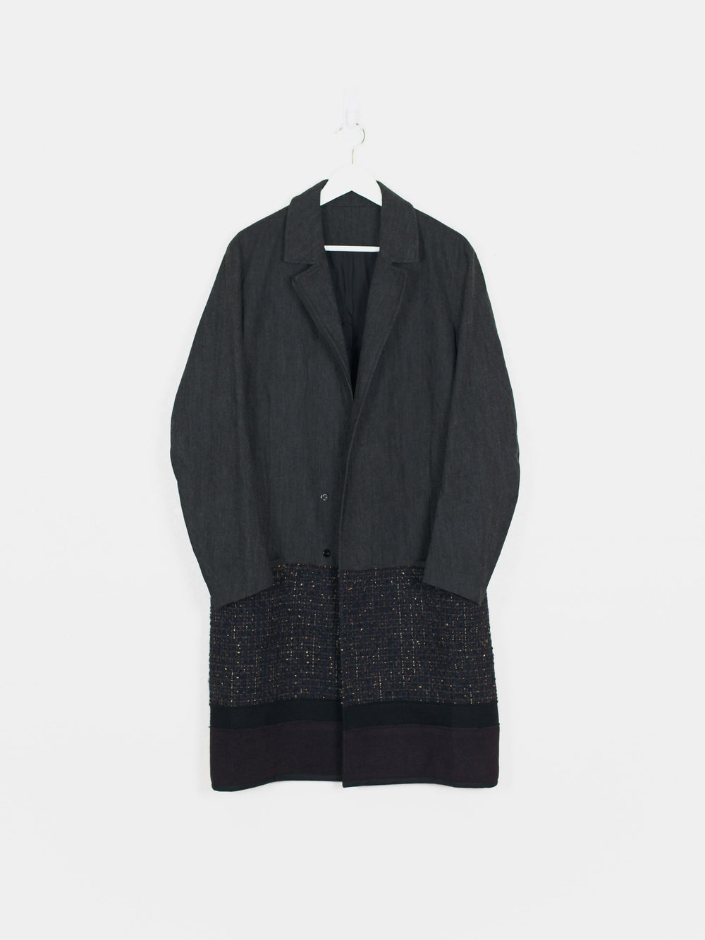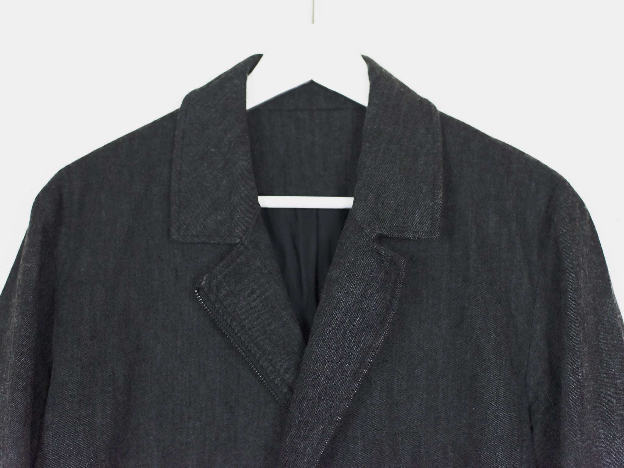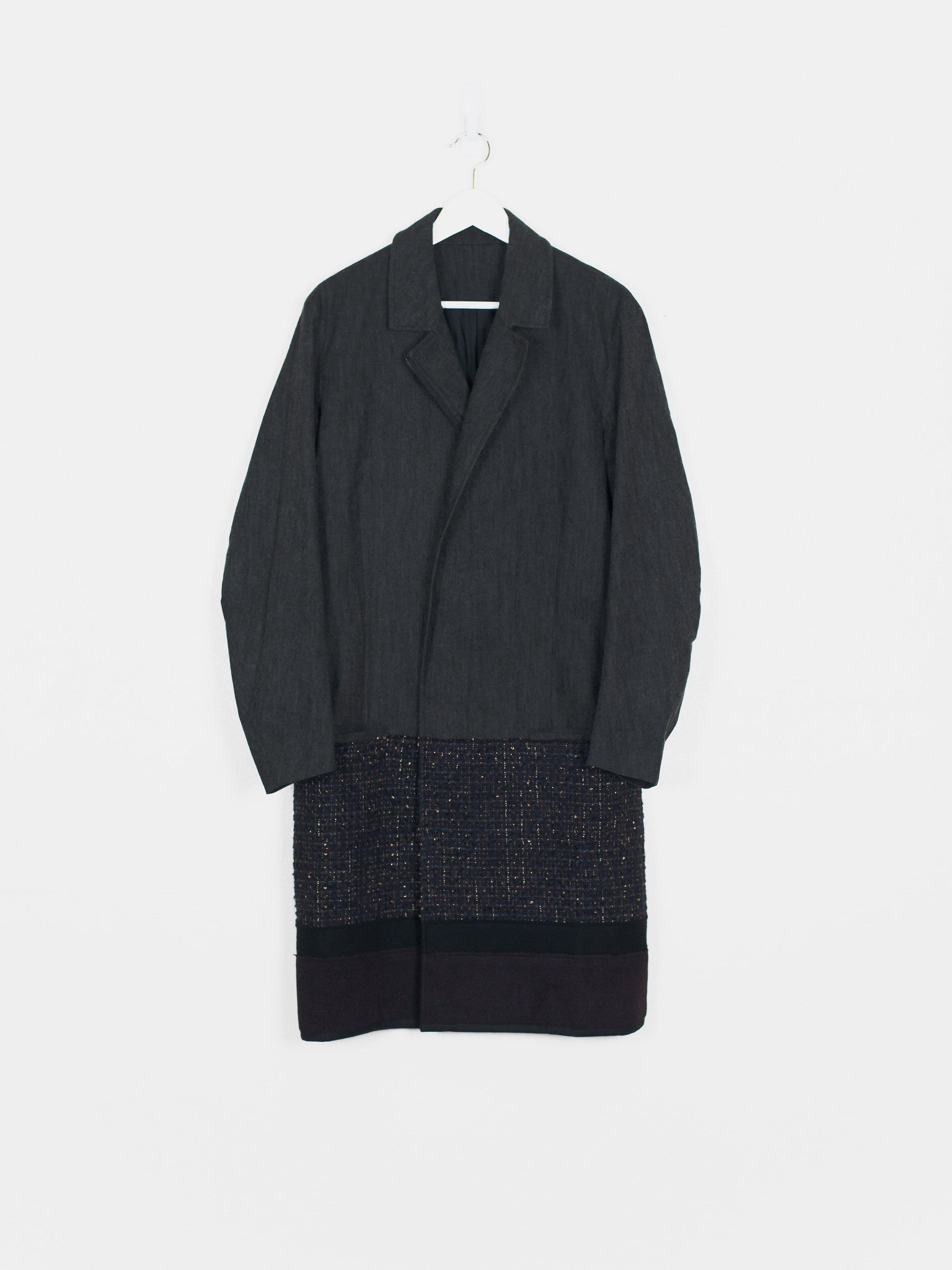 This coat features a subtle gradation in the transition from the soft denim mantle/body to artfully woven/flecked and luxurious wool panels. The variation in color and texture present in this piece gives it an incredible depth and keeps such a visually long and dominant piece interesting. Features asymmetrical double magnetic closure at waist level, two drop in waist pockets, and one interior chest pocket.