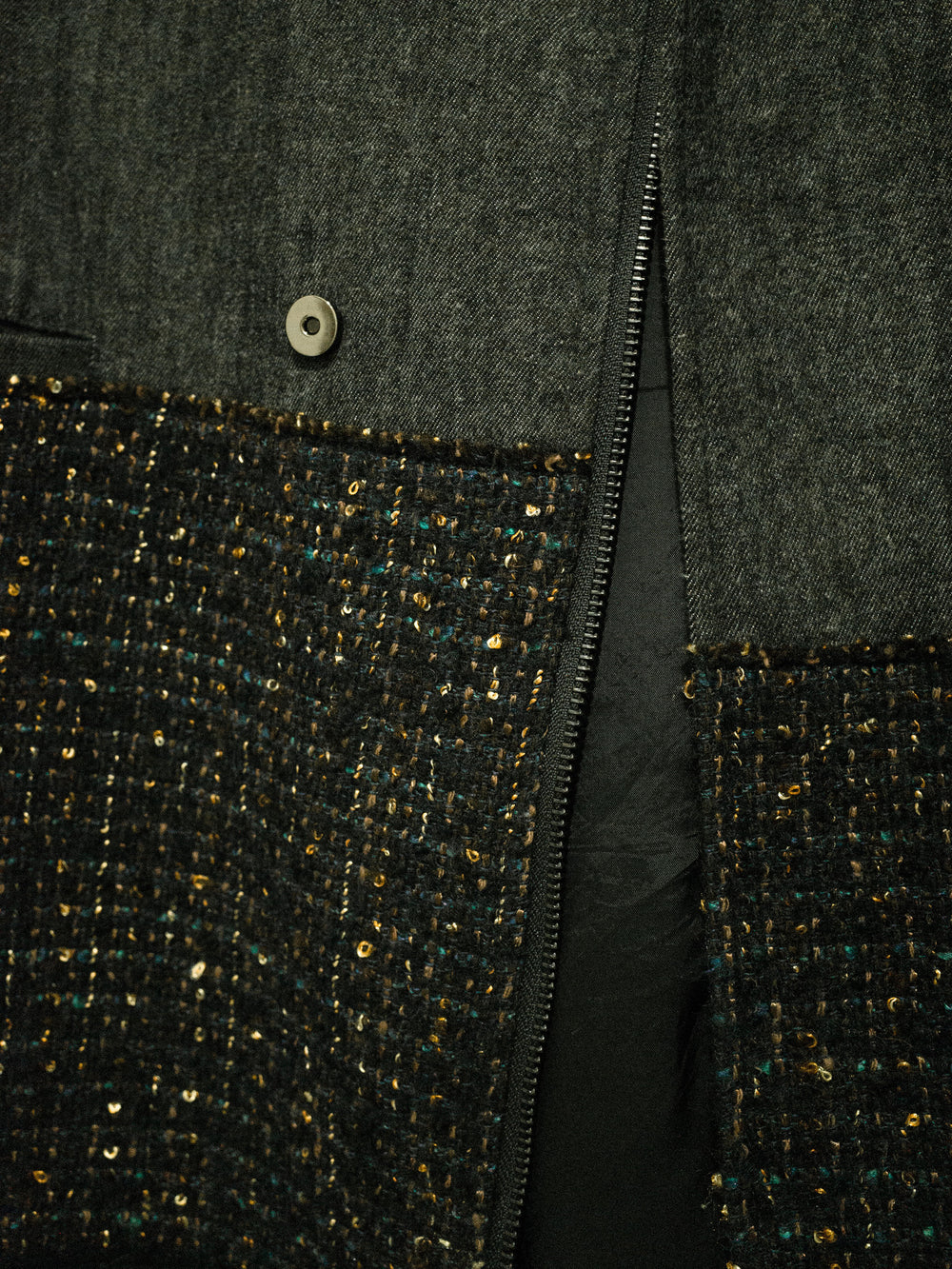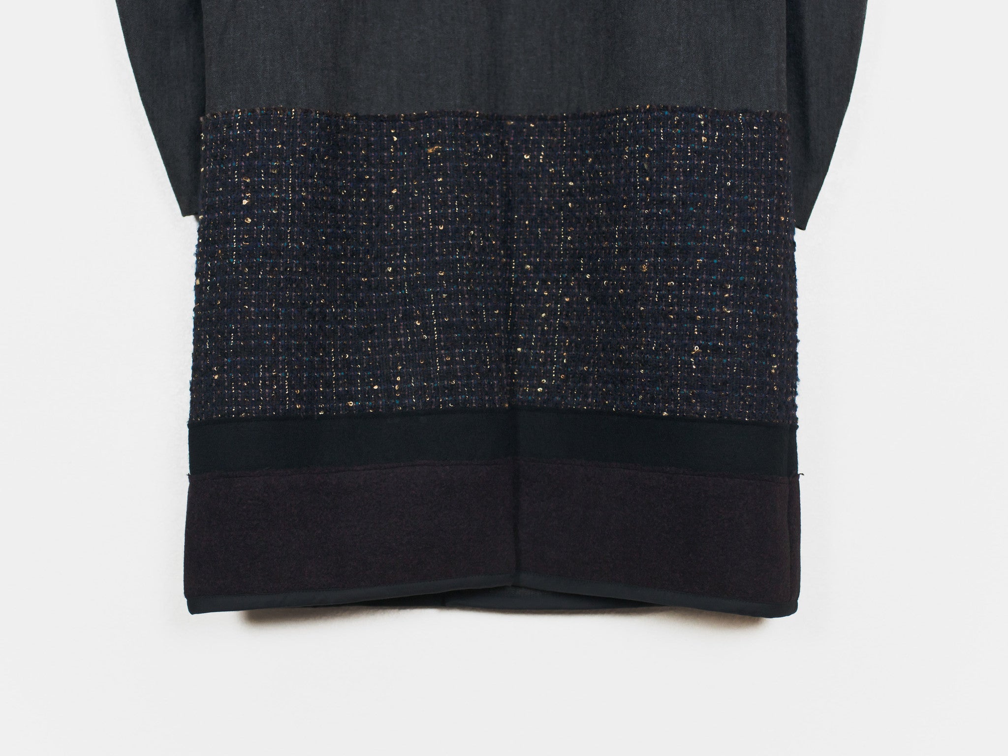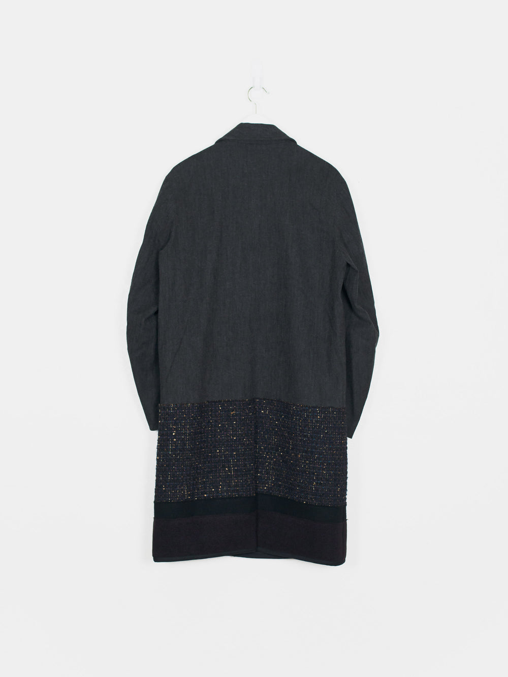 This coat features a subtle gradation in the transition from the soft denim mantle/body to artfully woven/flecked and luxurious wool panels. The variation in color and texture present in this piece gives it an incredible depth and keeps such a visually long and dominant piece interesting. Features asymmetrical double magnetic closure at waist level, two drop in waist pockets, and one interior chest pocket.