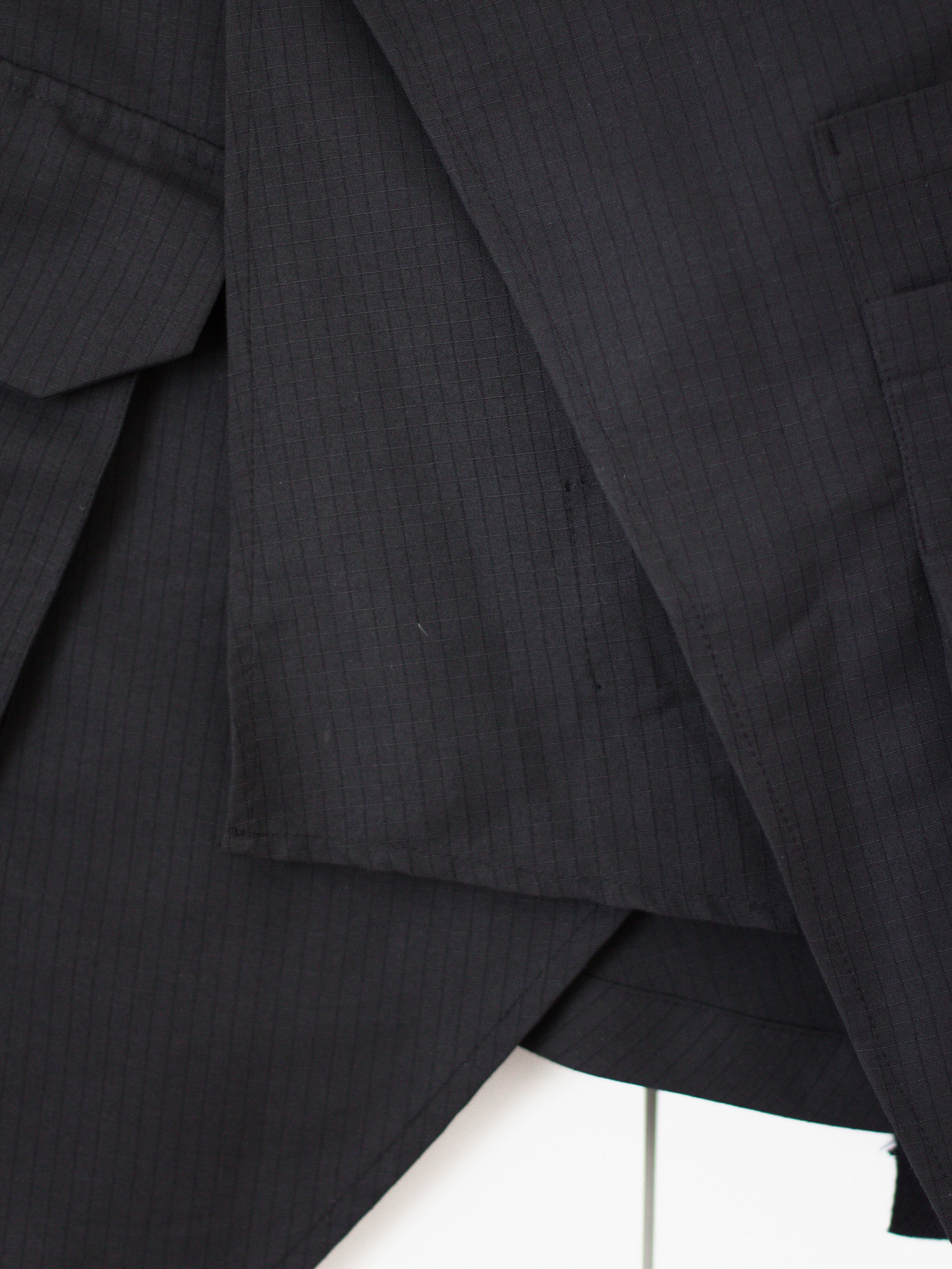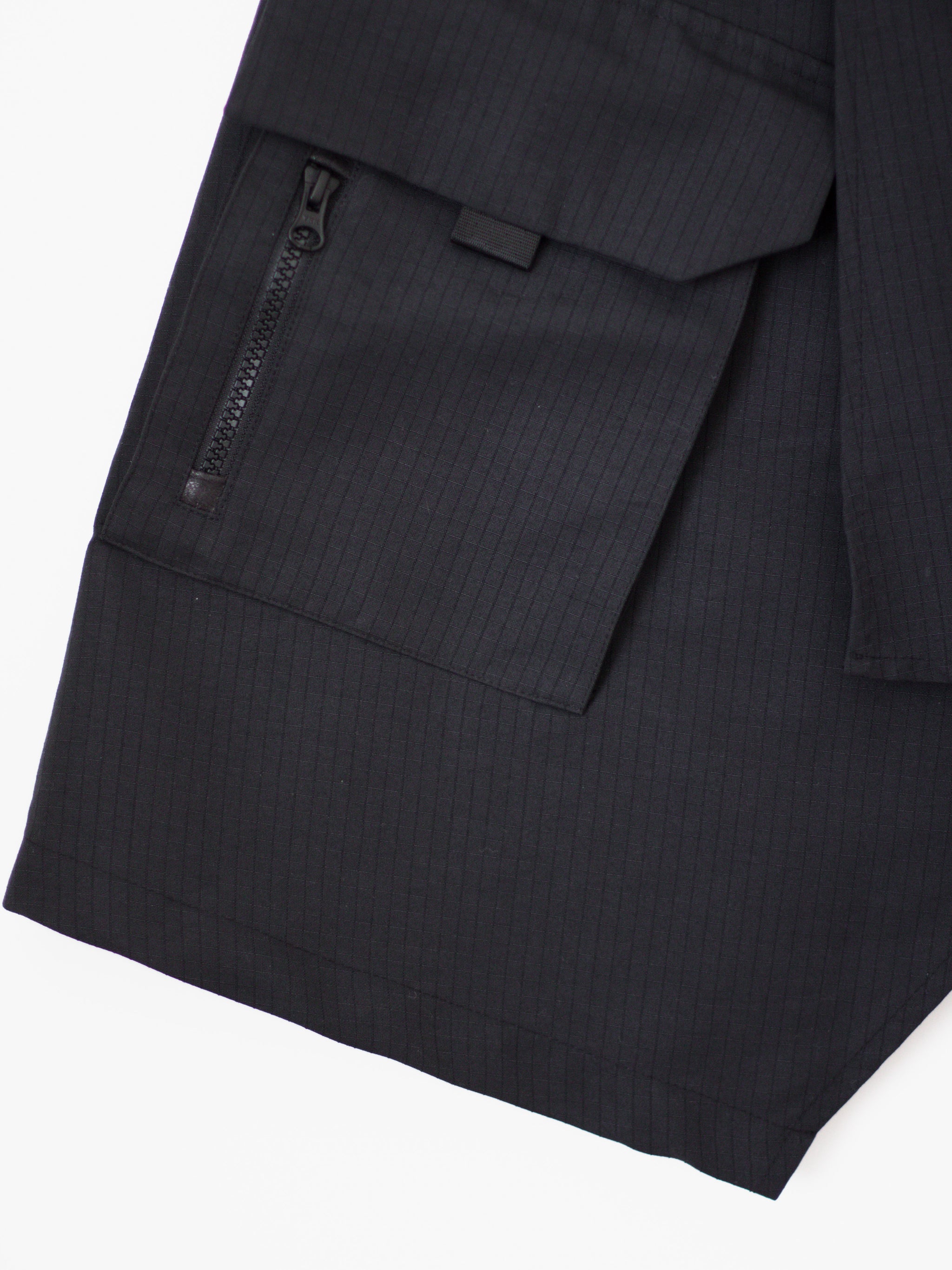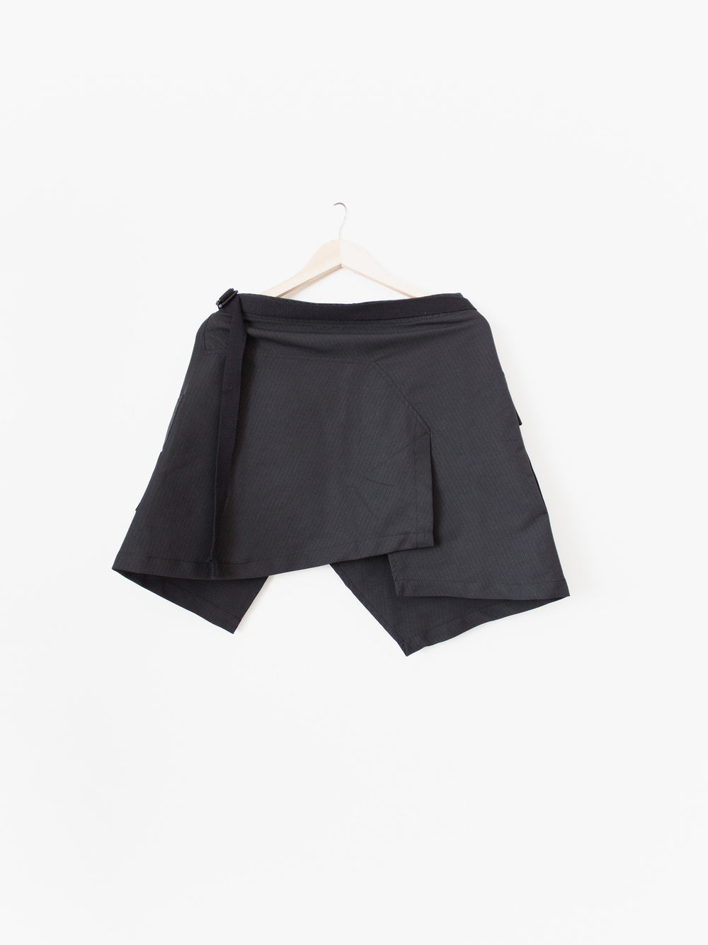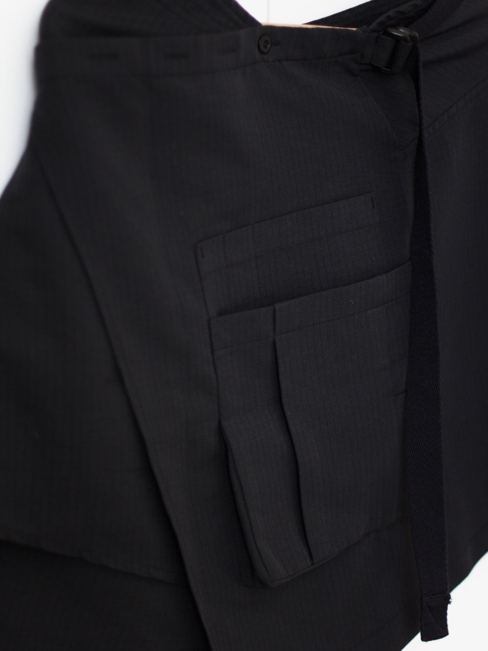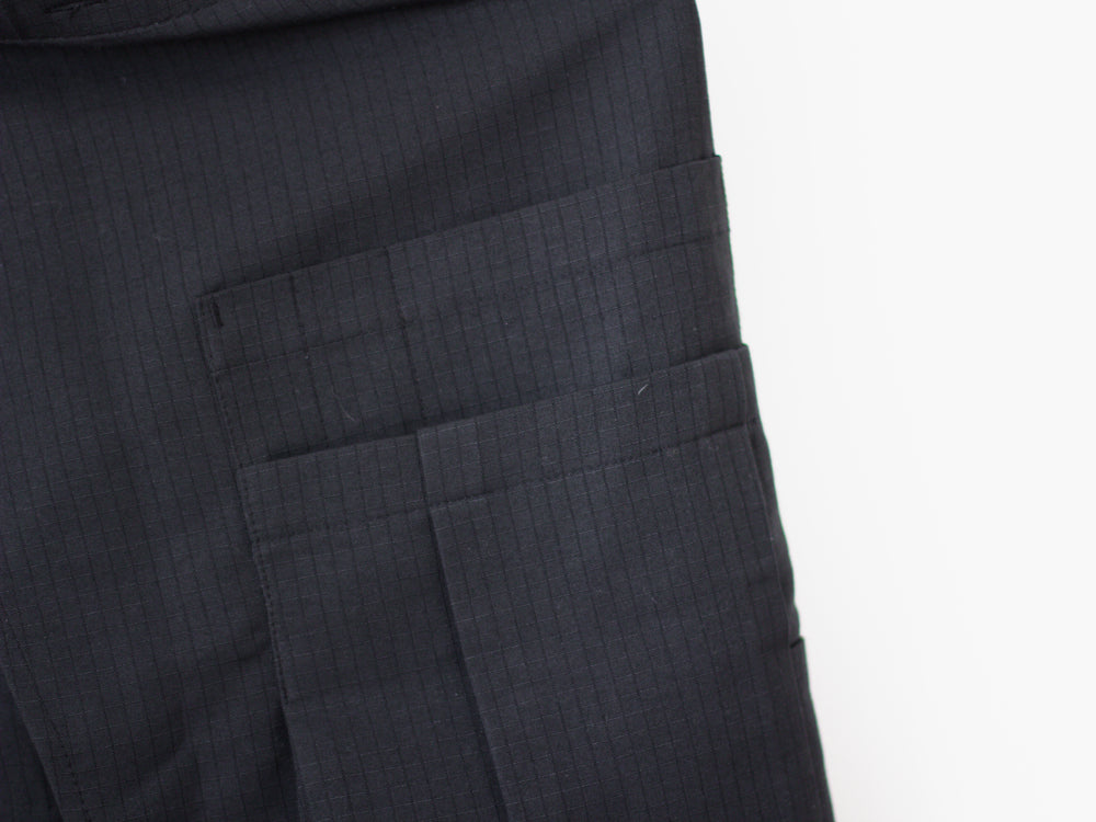 This Cargo skirt can serve as a men's layering piece or women's skirt, helping guys achieve a more modern elongated top block over some pants or letting women inject their outfit with some military detailing. This piece is cut in a micro grid check fabric and adorned with a set of layered cargo pockets. 4 button holes are available as an adjustable closure as well as a waist strap to tighten further if needed. The layering of the panels is sharp and geometric, leading to an incredibly clean silhouette.