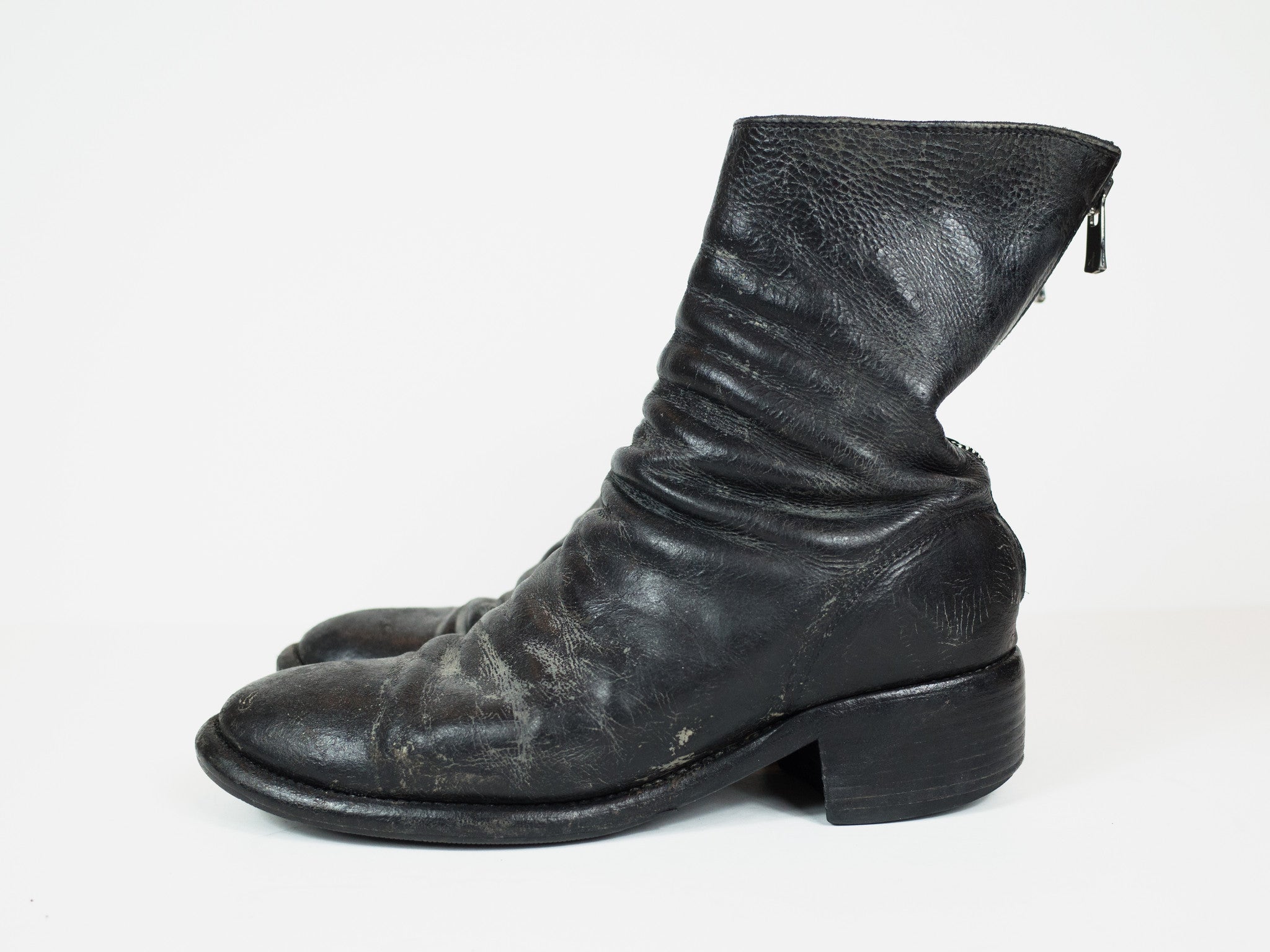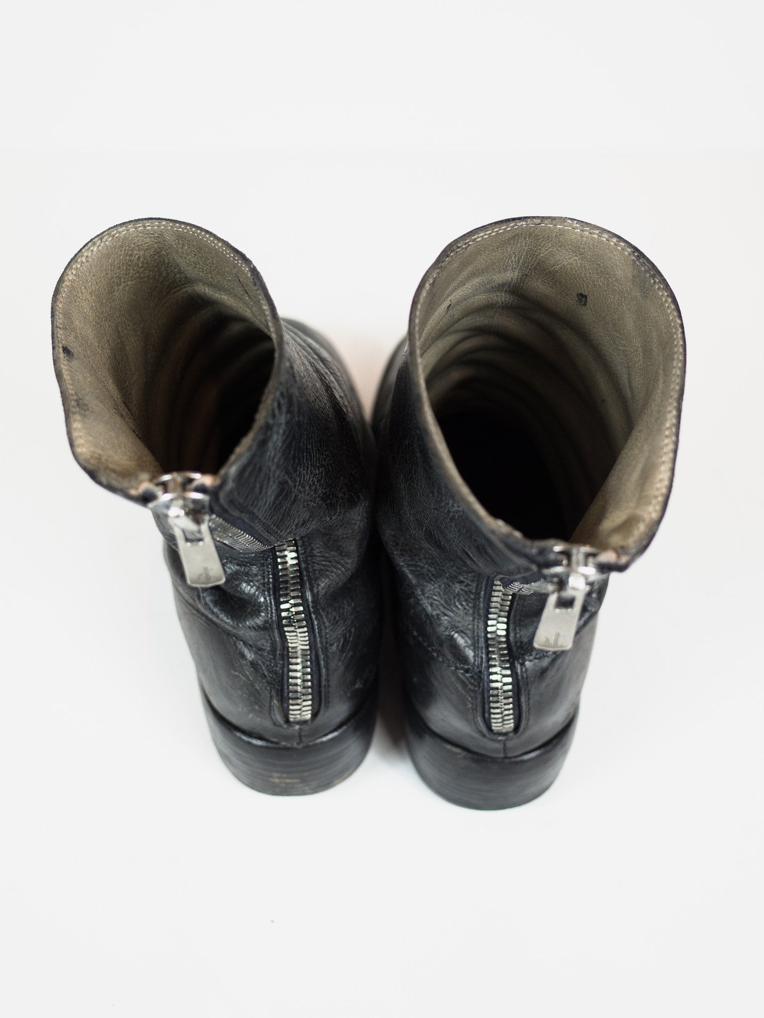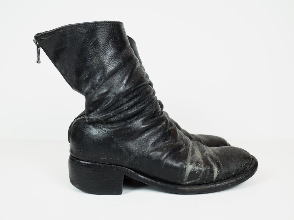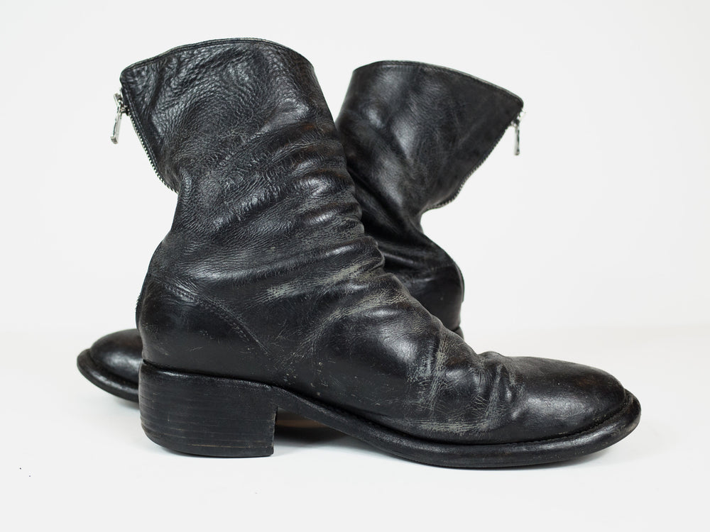 An early iteration of Guidi's famous minimal backzip boots. The 788z features a double sole and a stacked heel for a bit of extra height and a unique rough sandy black coated treatment that is intended to wear off over time. This pair is in used condition with the price reflecting this, but with a new set of vibram on the bottom it will last you forever. The leather upper is still incredibly supple with no structural damage and the Excella zips pull buttery smooth.