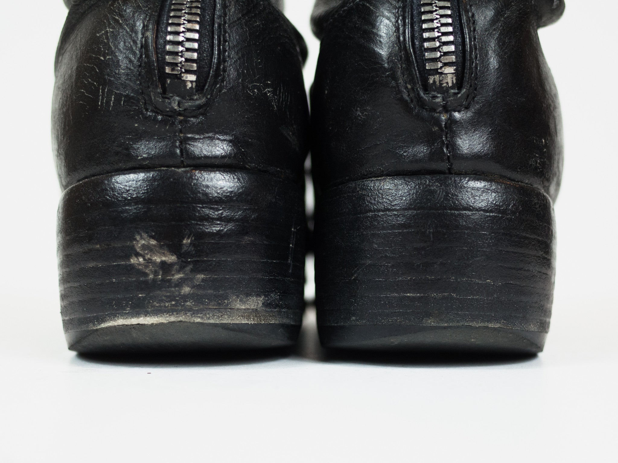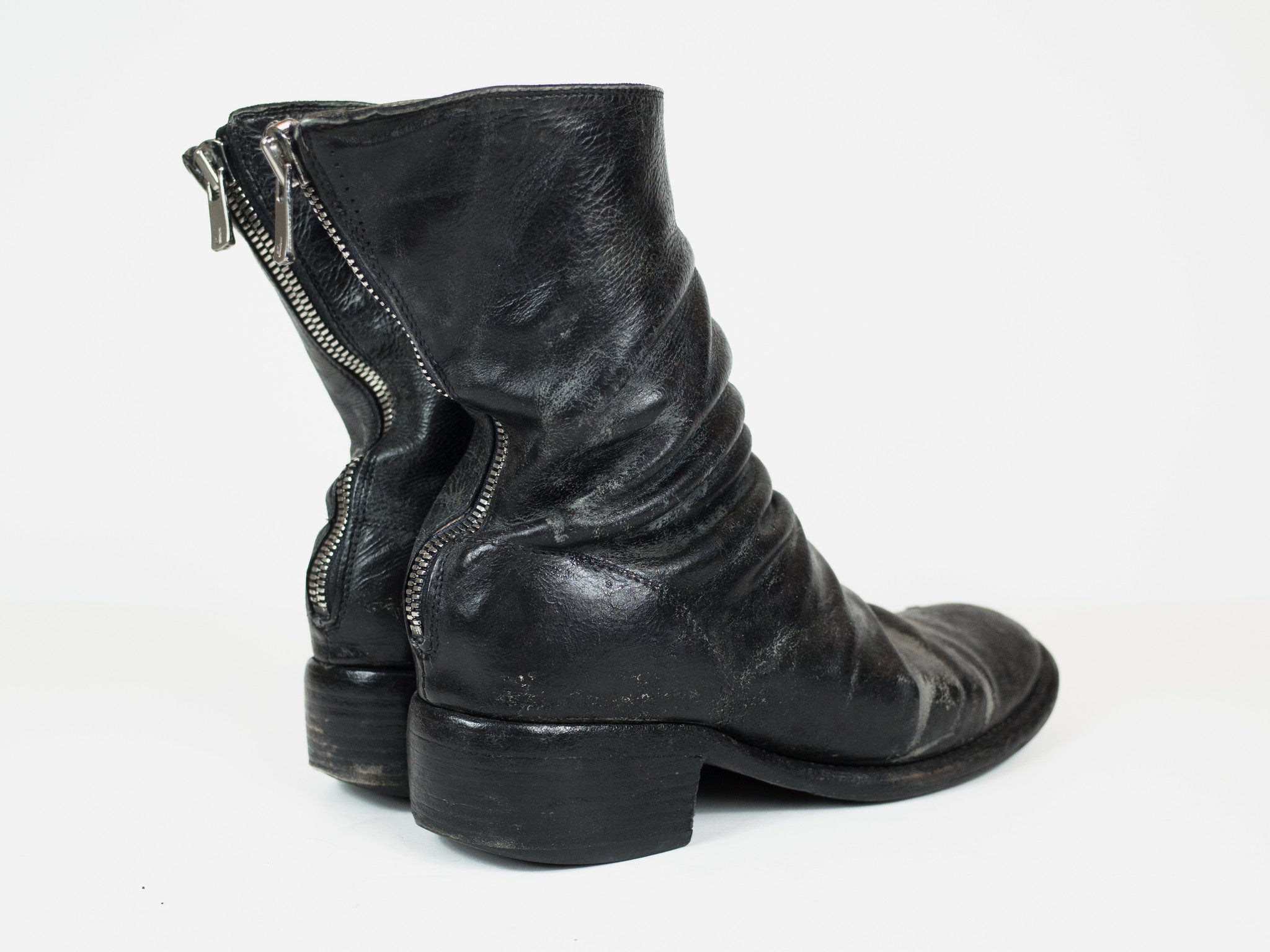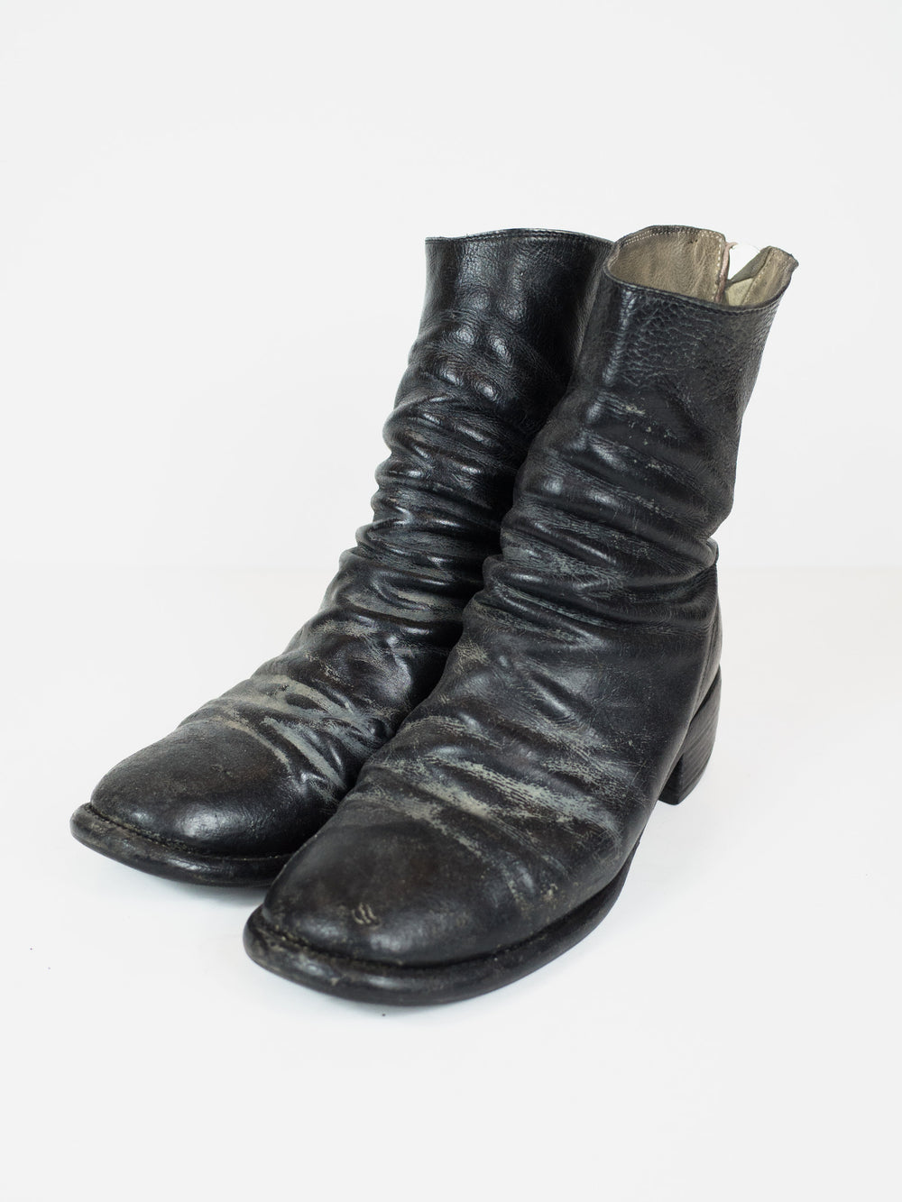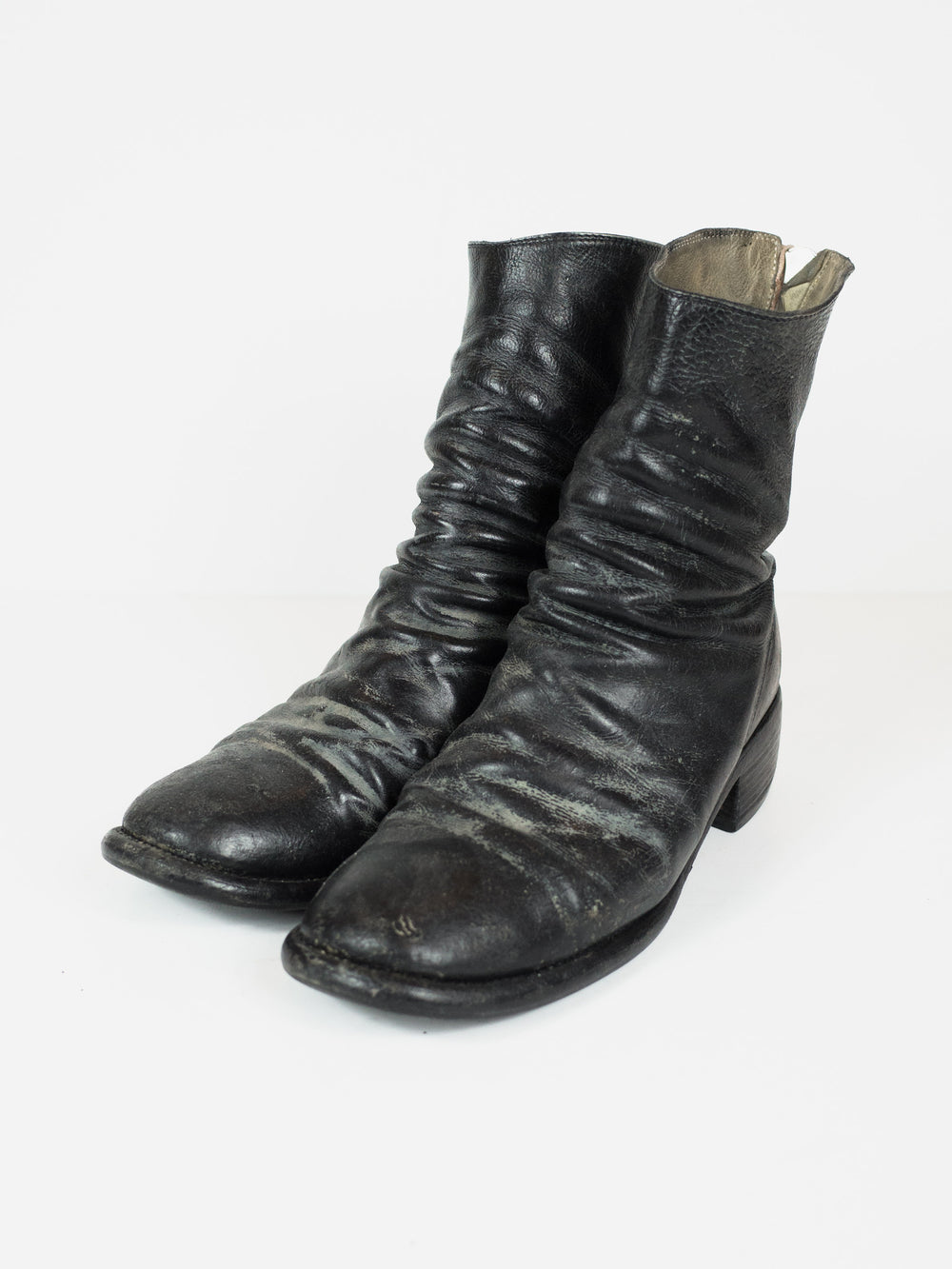 An early iteration of Guidi's famous minimal backzip boots. The 788z features a double sole and a stacked heel for a bit of extra height and a unique rough sandy black coated treatment that is intended to wear off over time. This pair is in used condition with the price reflecting this, but with a new set of vibram on the bottom it will last you forever. The leather upper is still incredibly supple with no structural damage and the Excella zips pull buttery smooth.