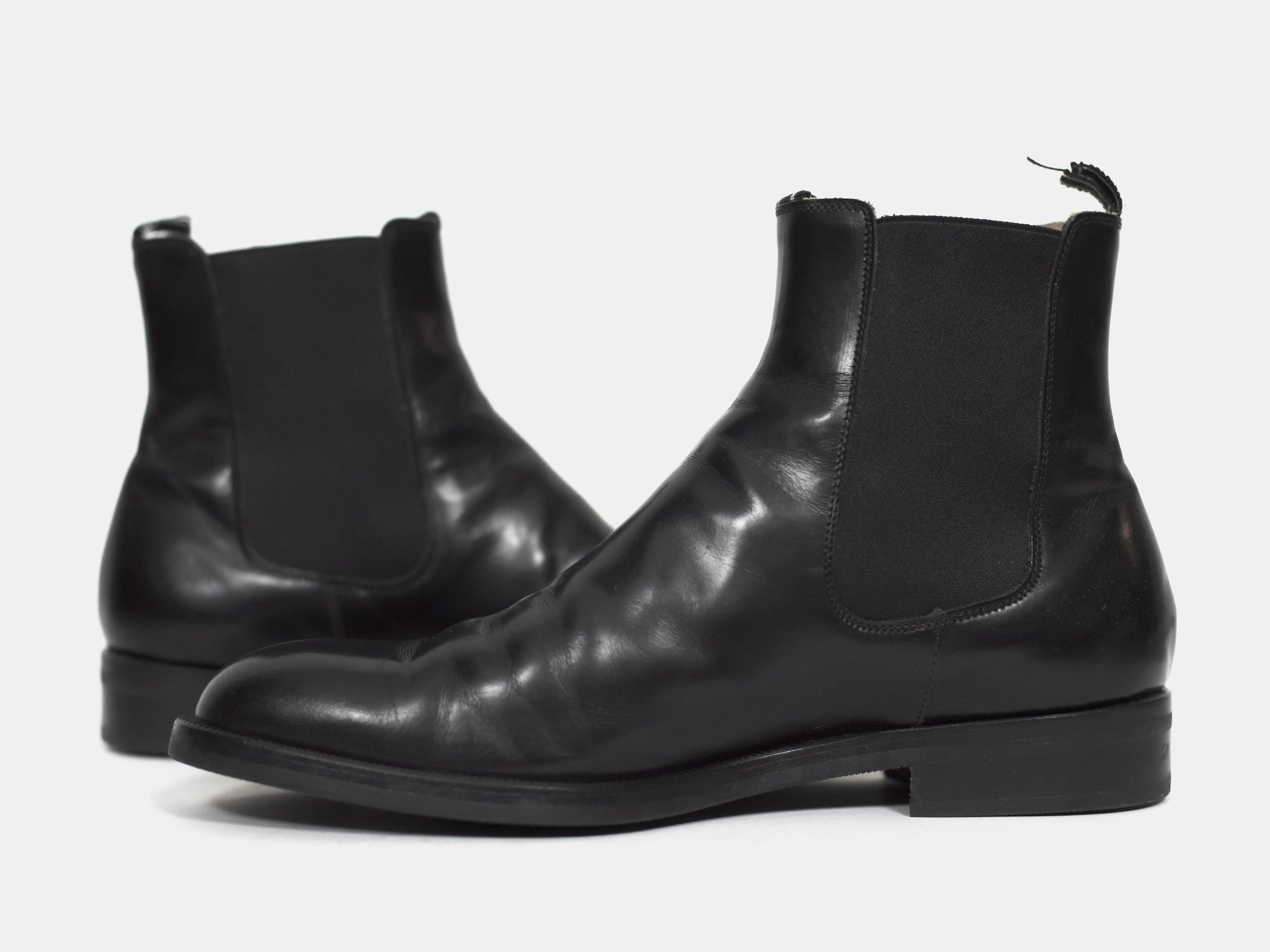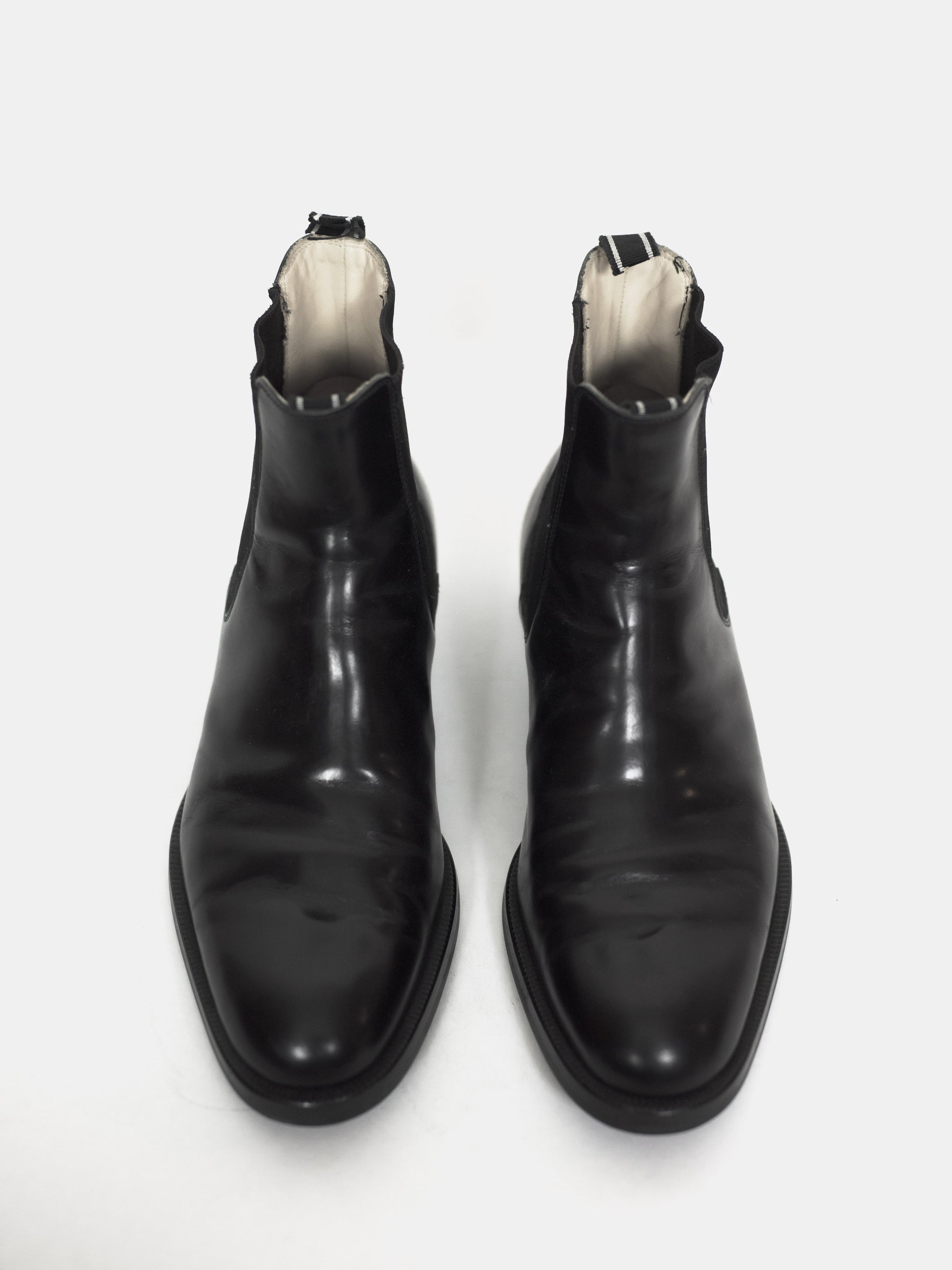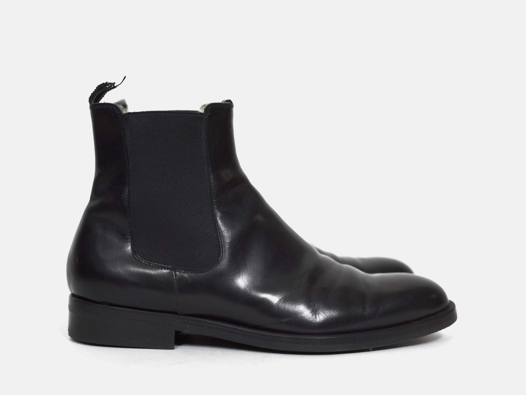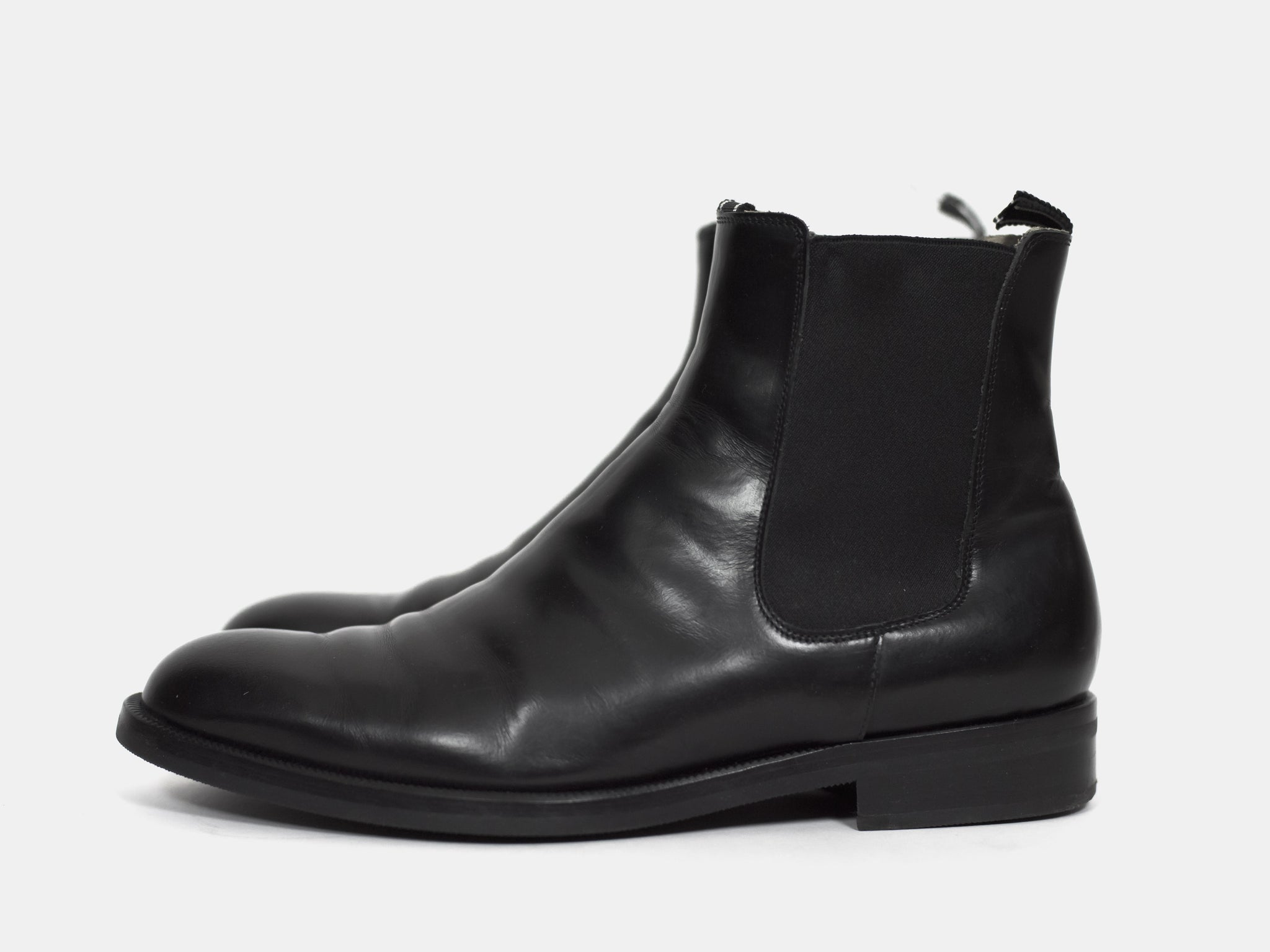 Polished black chelsea boots from around 2004 with a modern sleek shape popularized a few years later. Although the uppers are worn, the soles seem to have been very professionally replaced because they are completely unworn. I cannot see any signs of repair.
