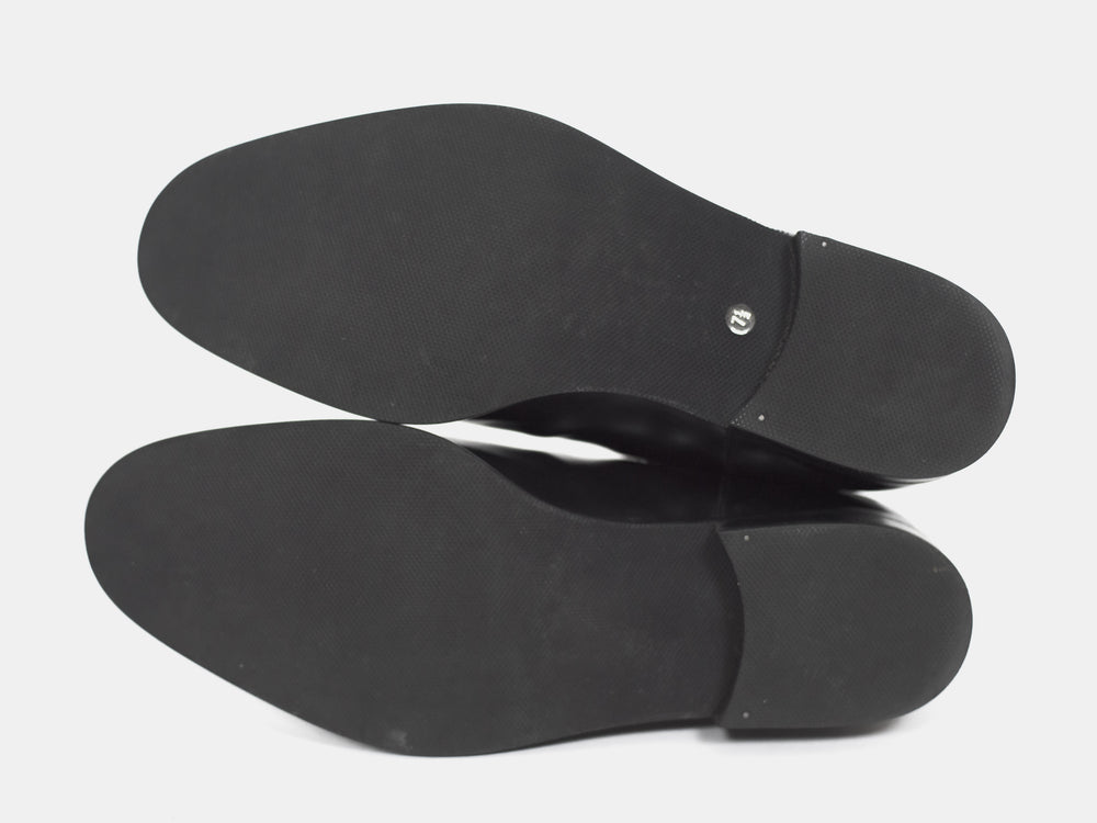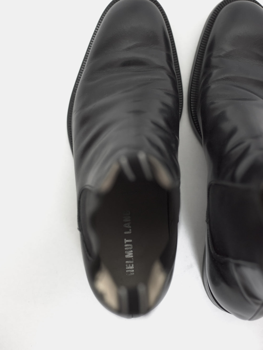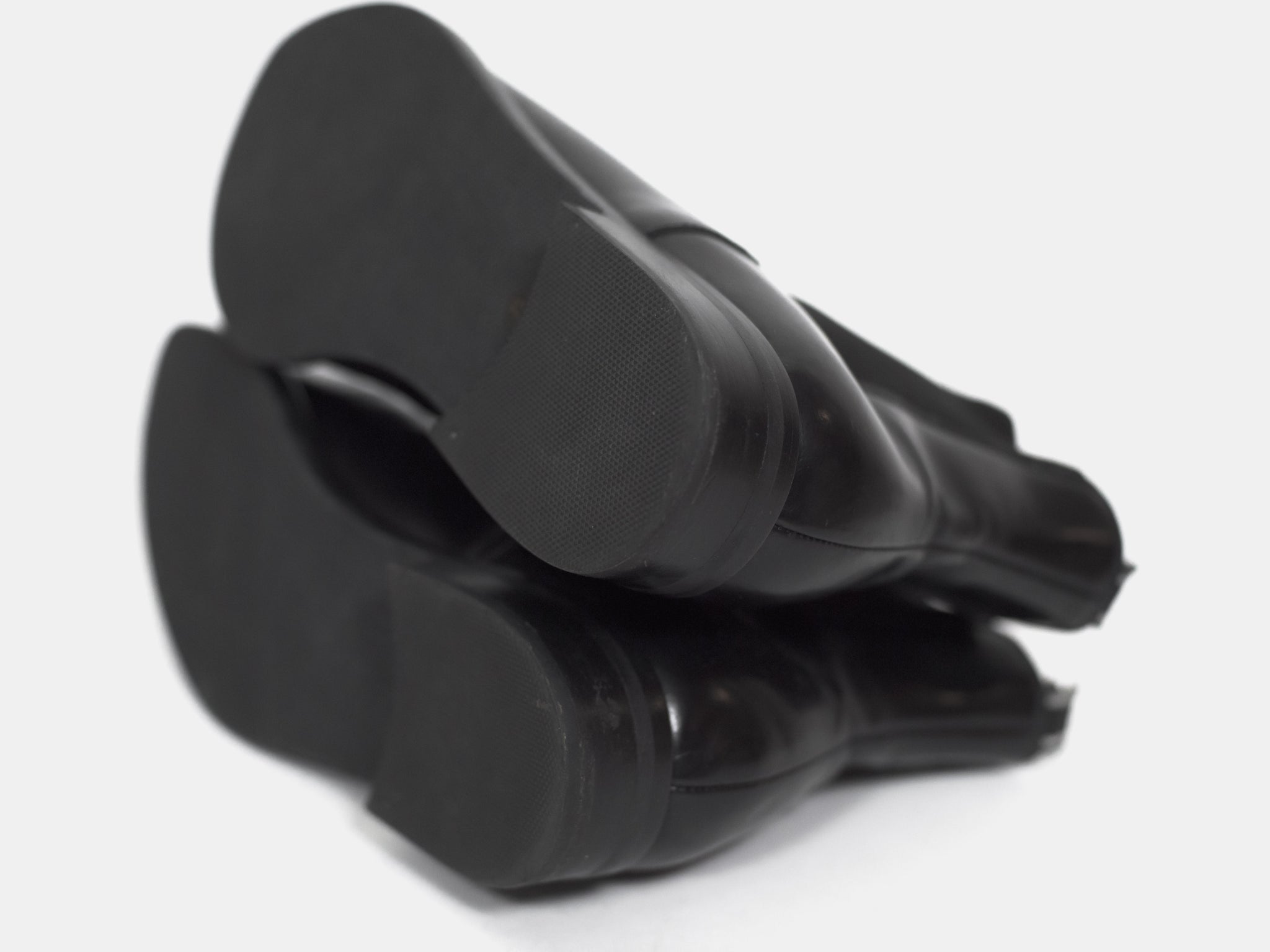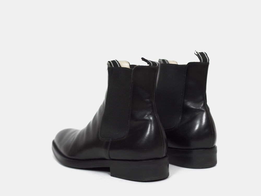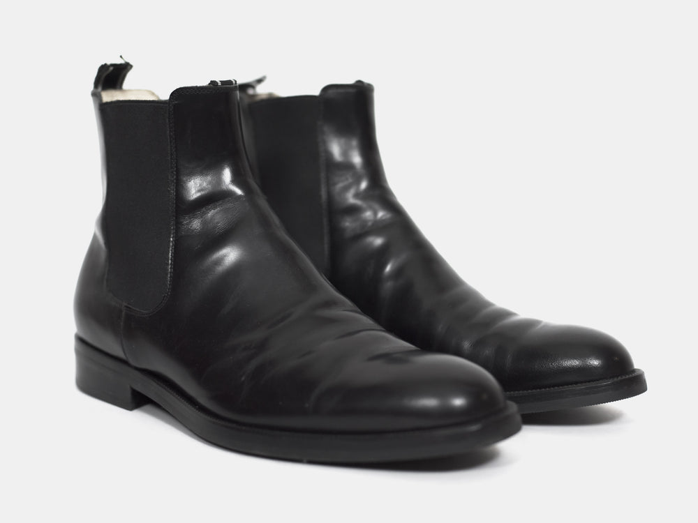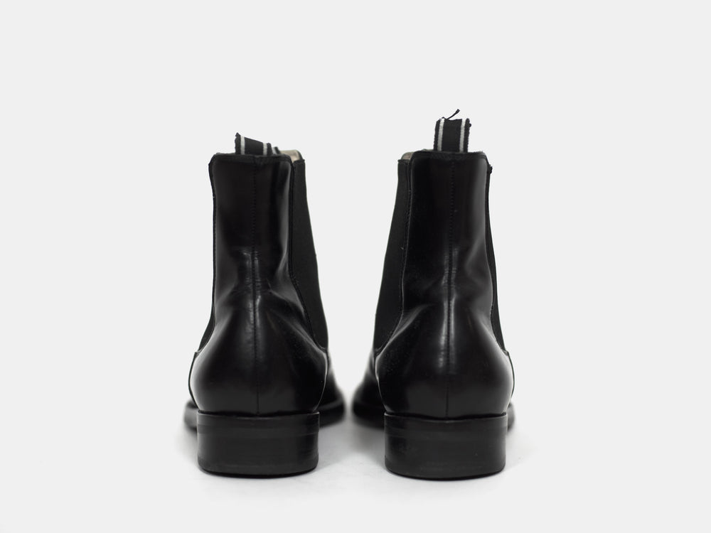 Polished black chelsea boots from around 2004 with a modern sleek shape popularized a few years later. Although the uppers are worn, the soles seem to have been very professionally replaced because they are completely unworn. I cannot see any signs of repair.