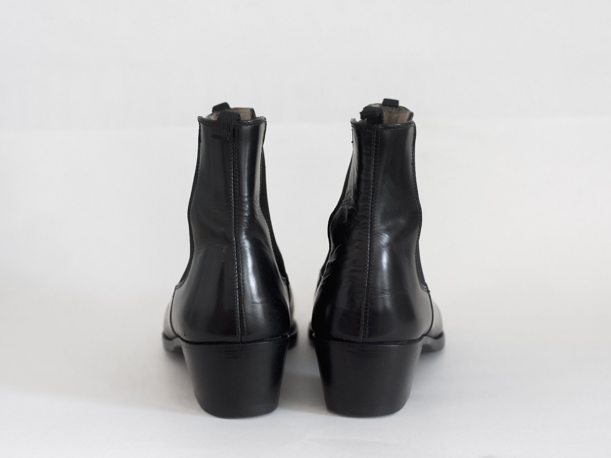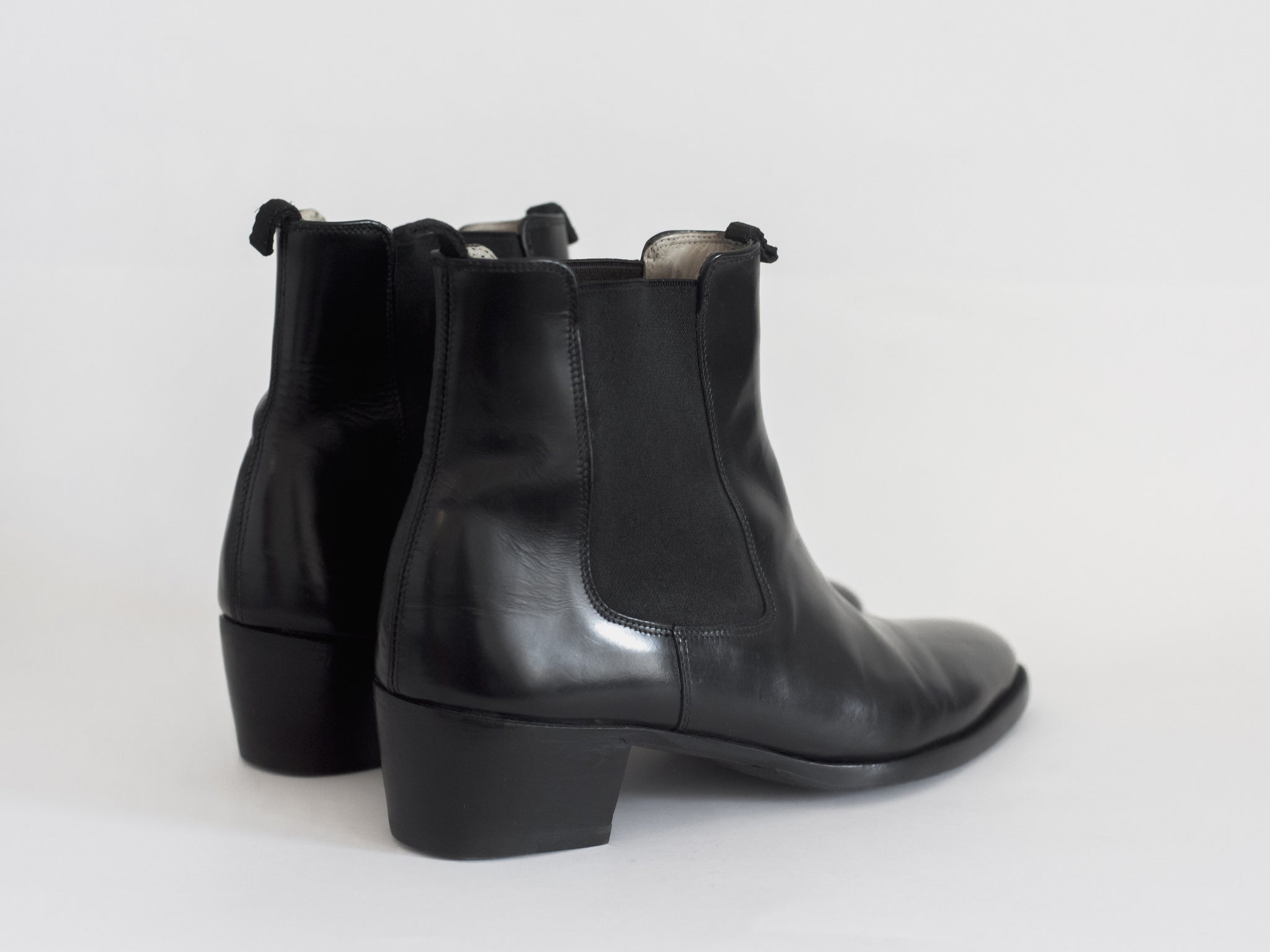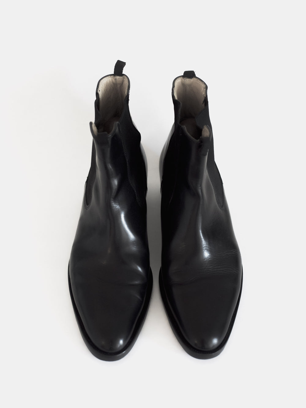 Polished black chelsea boots from around 2004 with a modern sleek shape repopularized by designers like Hedi Slimane and Raf Simons for Calvin Klein. Includes sole protectors over a smooth natural leather sole.