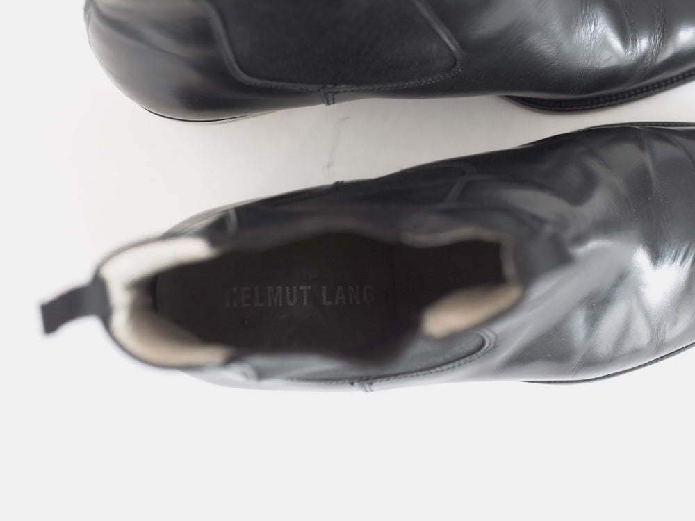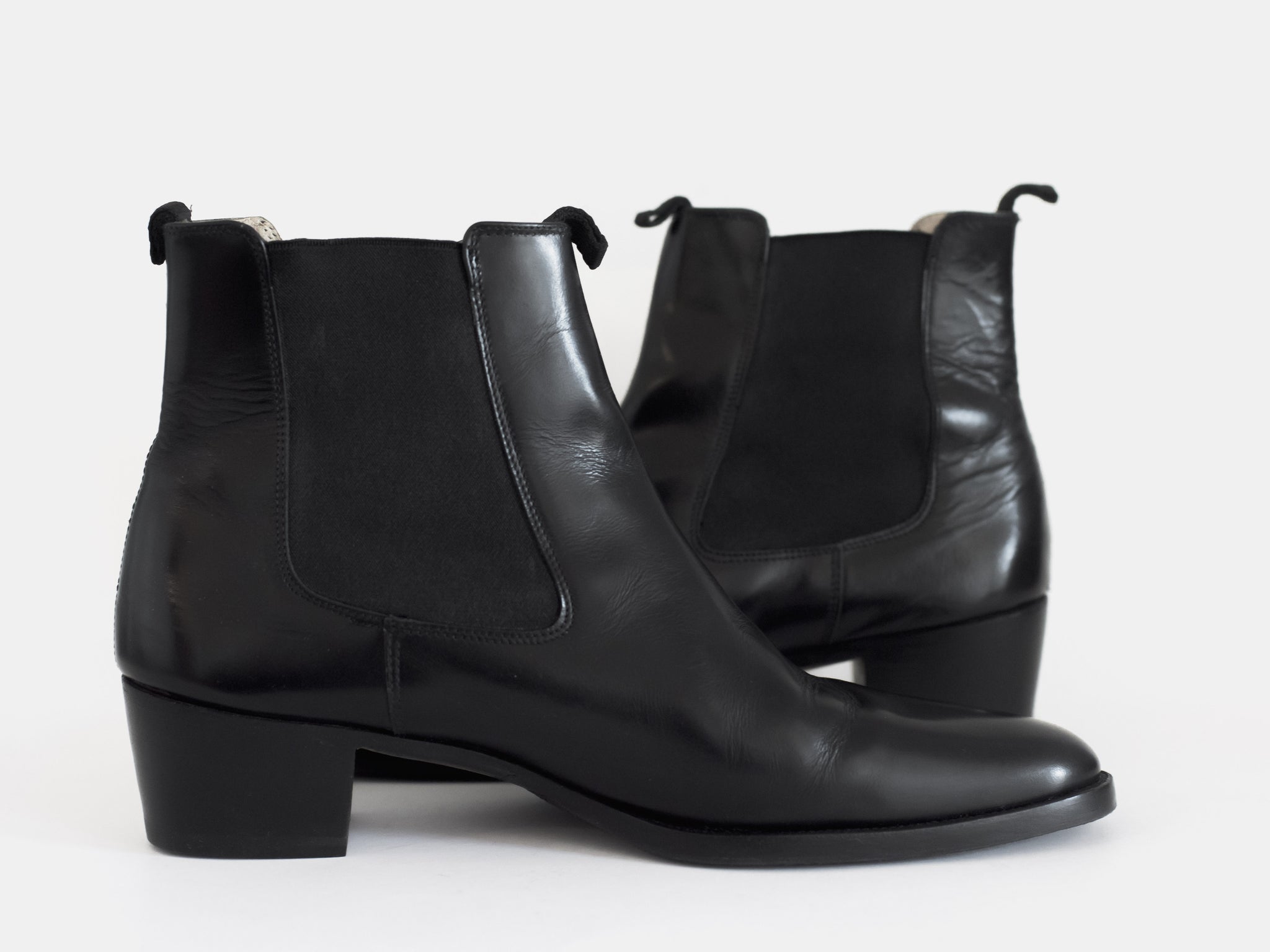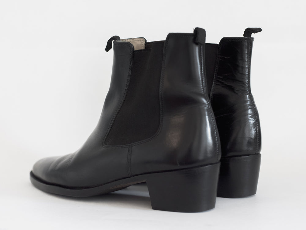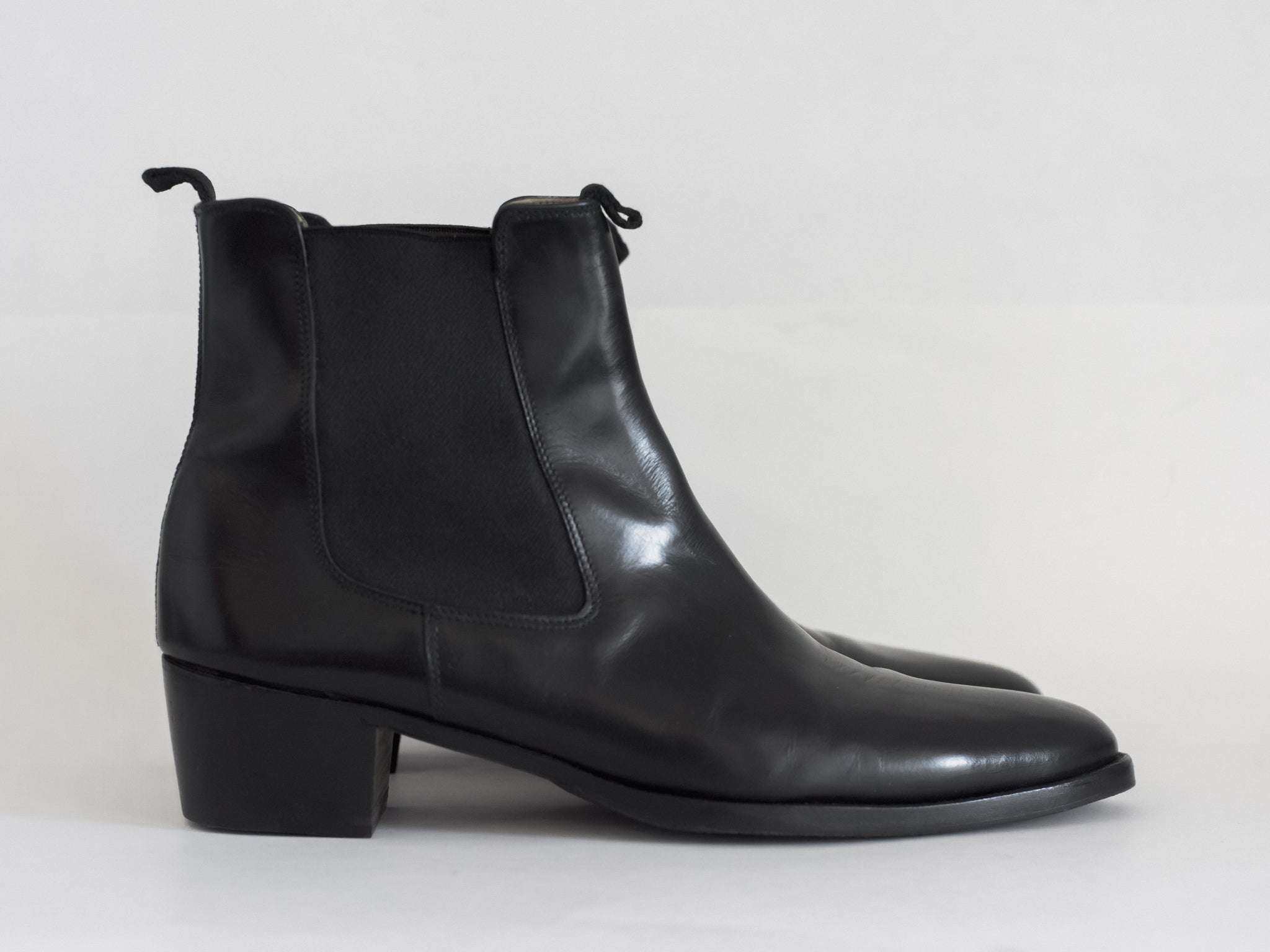 Polished black chelsea boots from around 2004 with a modern sleek shape repopularized by designers like Hedi Slimane and Raf Simons for Calvin Klein. Includes sole protectors over a smooth natural leather sole.