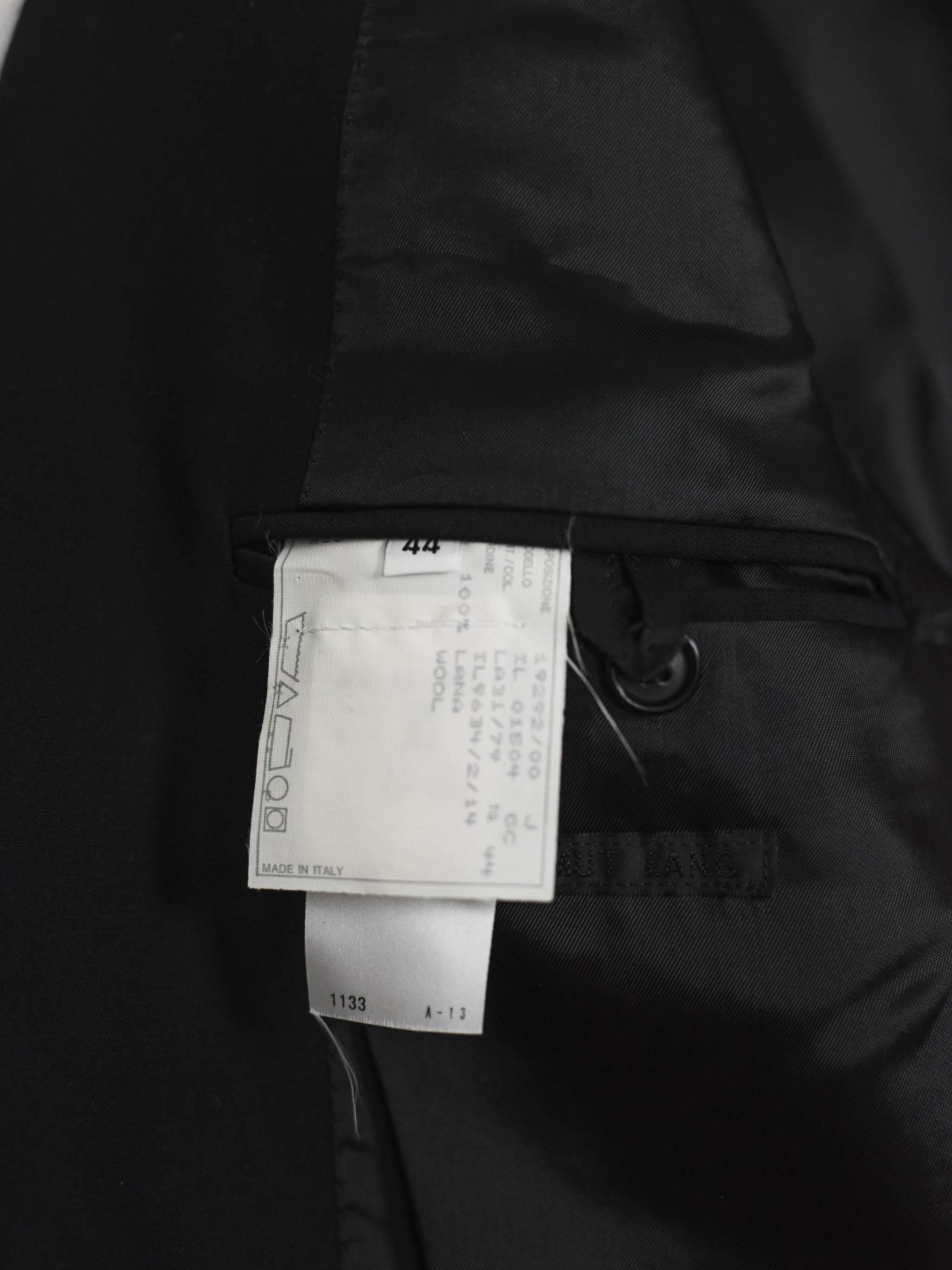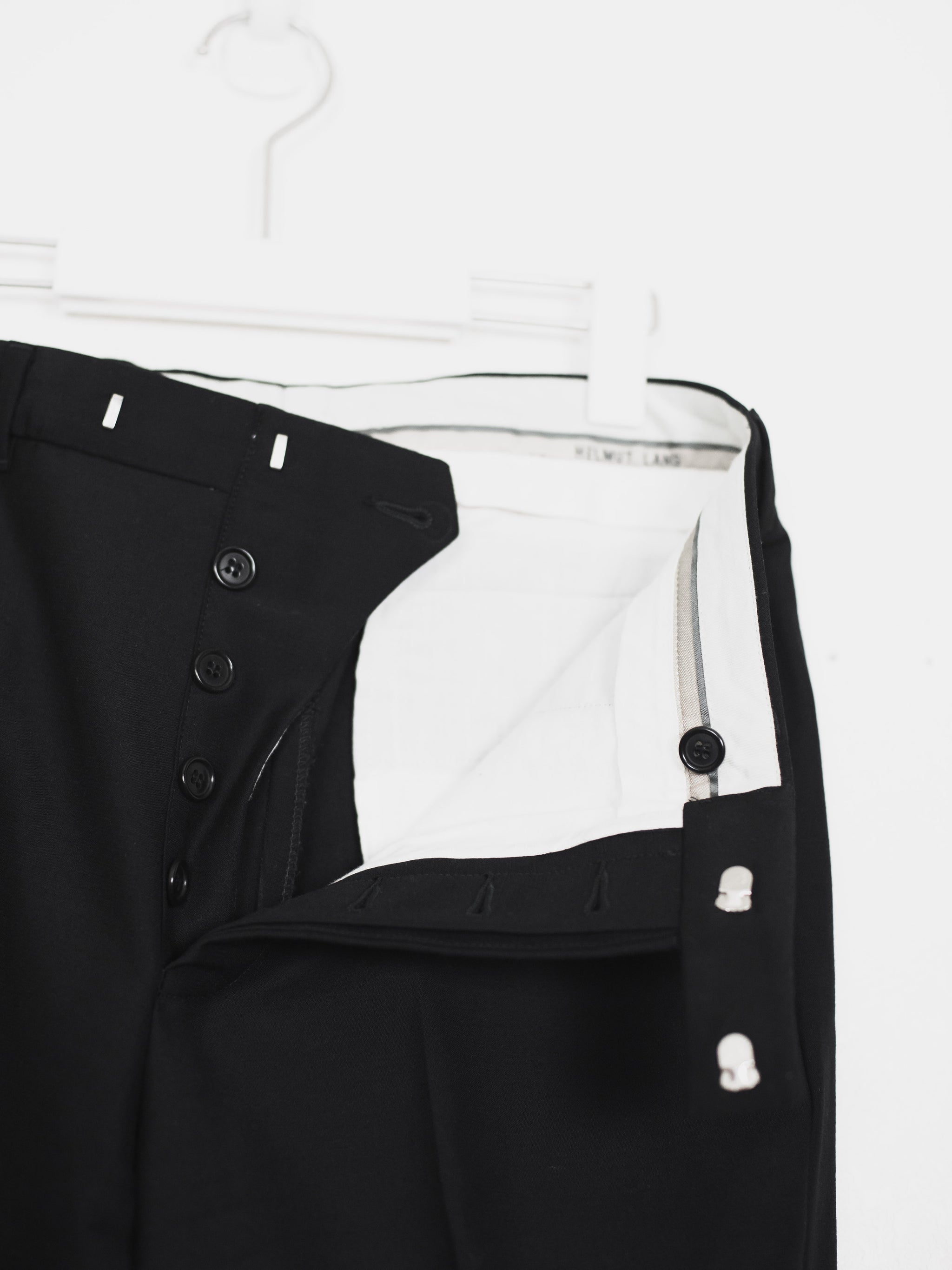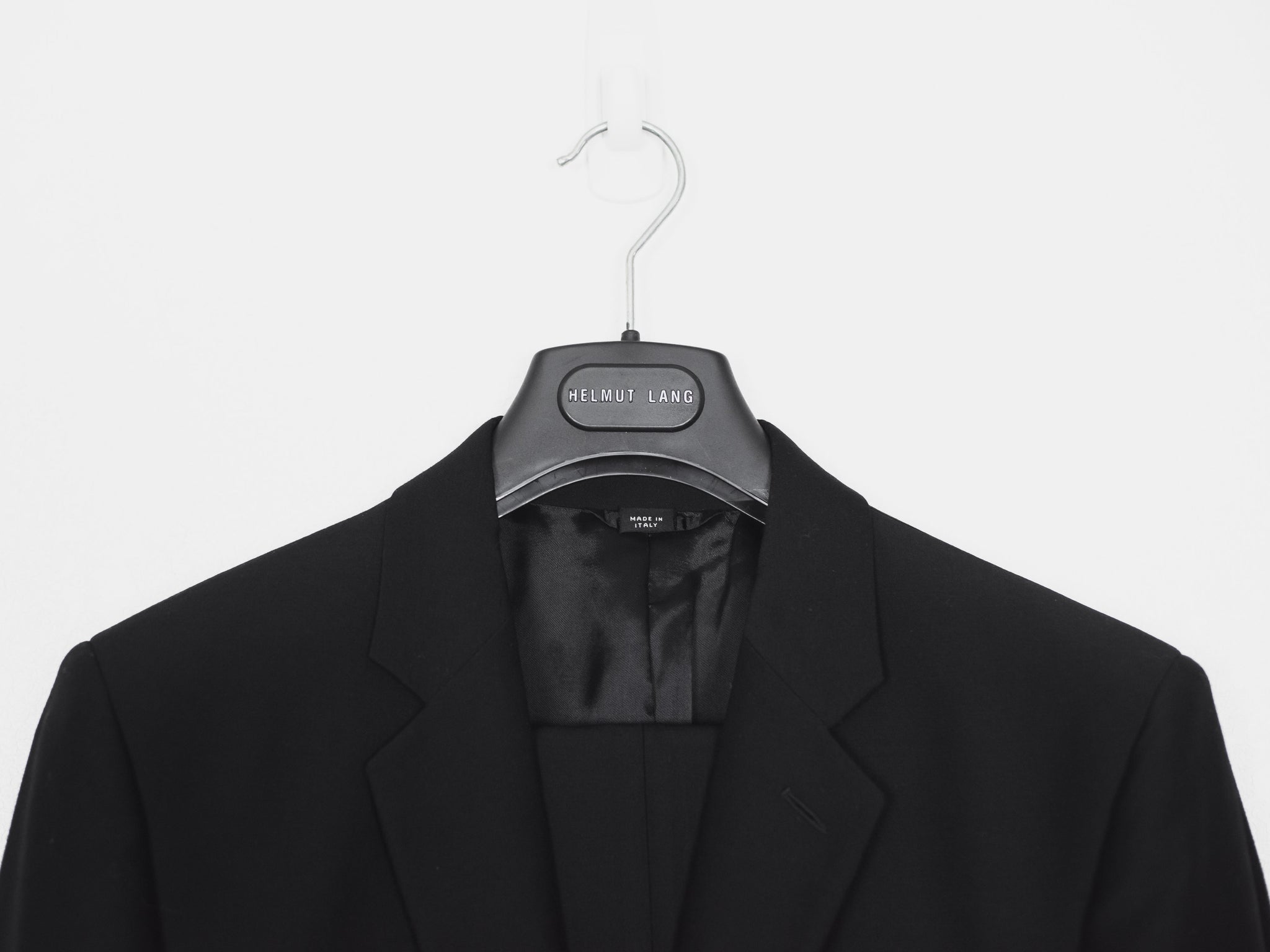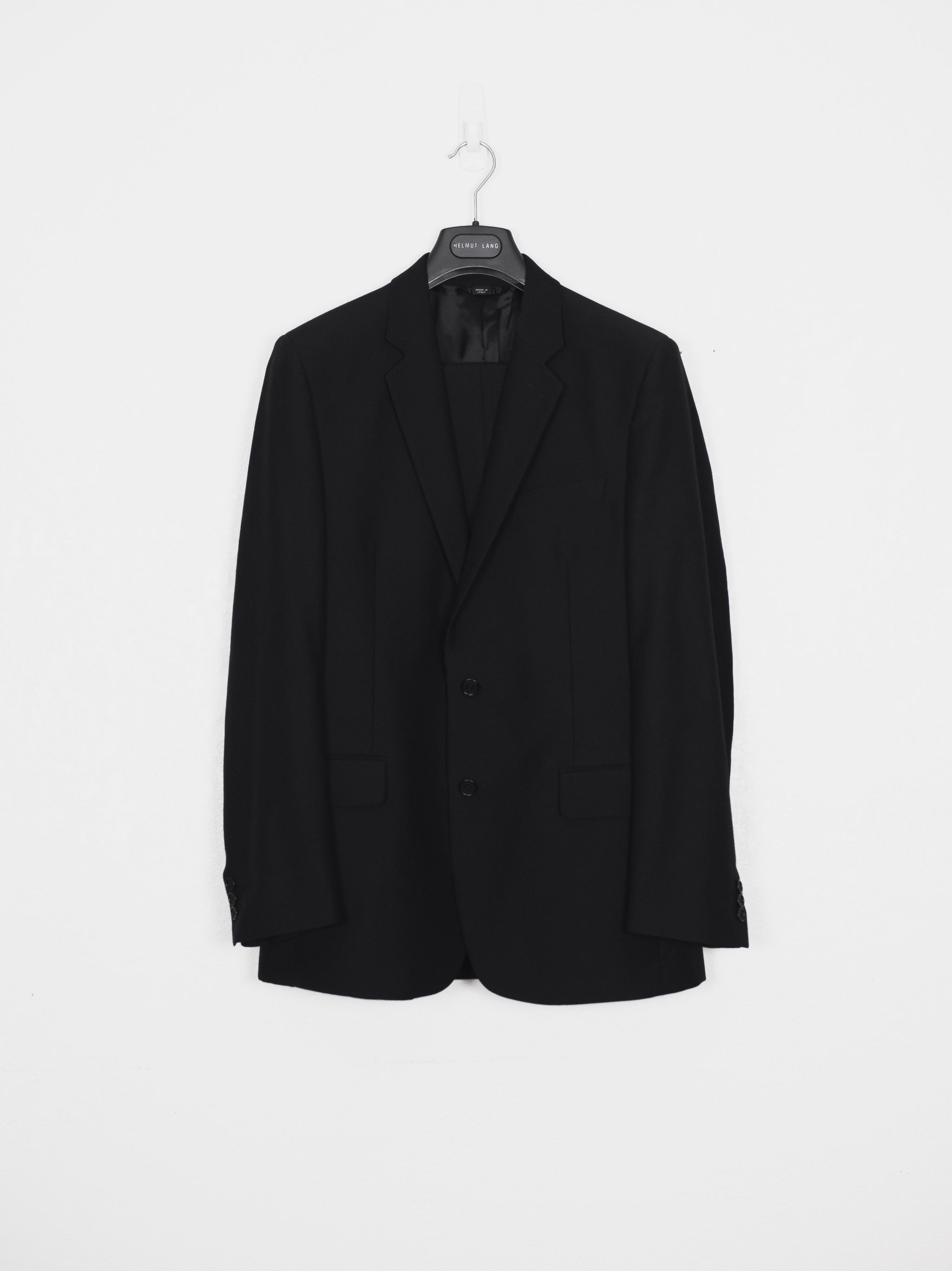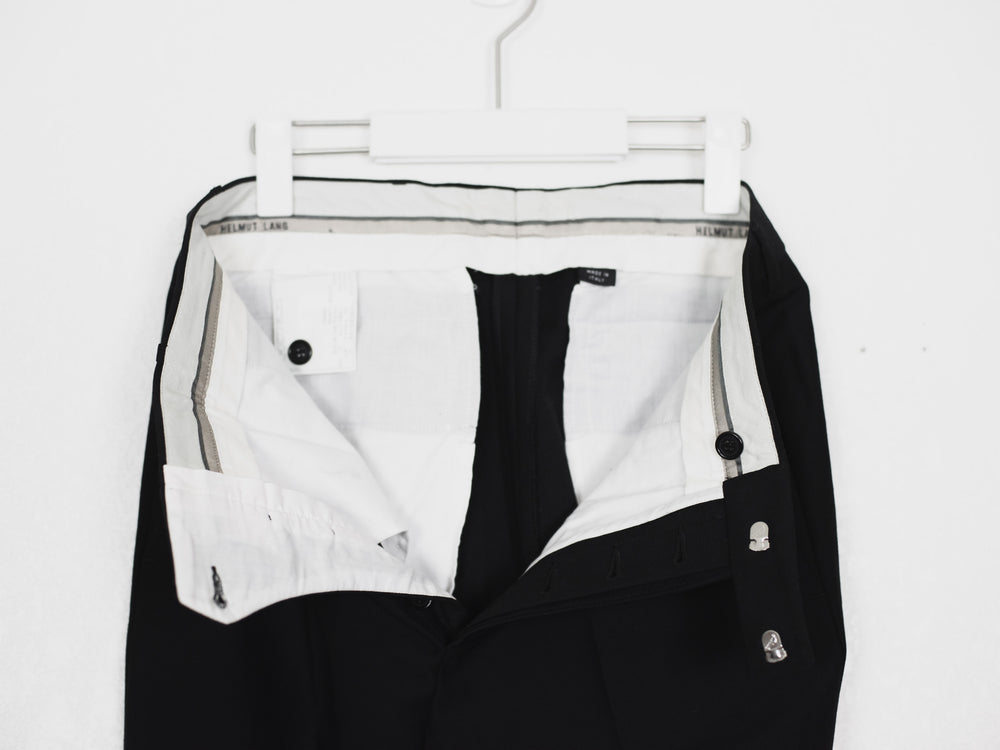 A perfect example of Helmut Lang's classic razor sharp tailoring. This hard to find matching set embodies the designer's meticulous attention to detail in craftsmanship and materials despite its minimal appearance devoid of unnecessary frills. The set creates a classic silhouette unlike today's ubiquitous trendy and undersized designs, setting a standard for quality and elegance beyond transient trends.