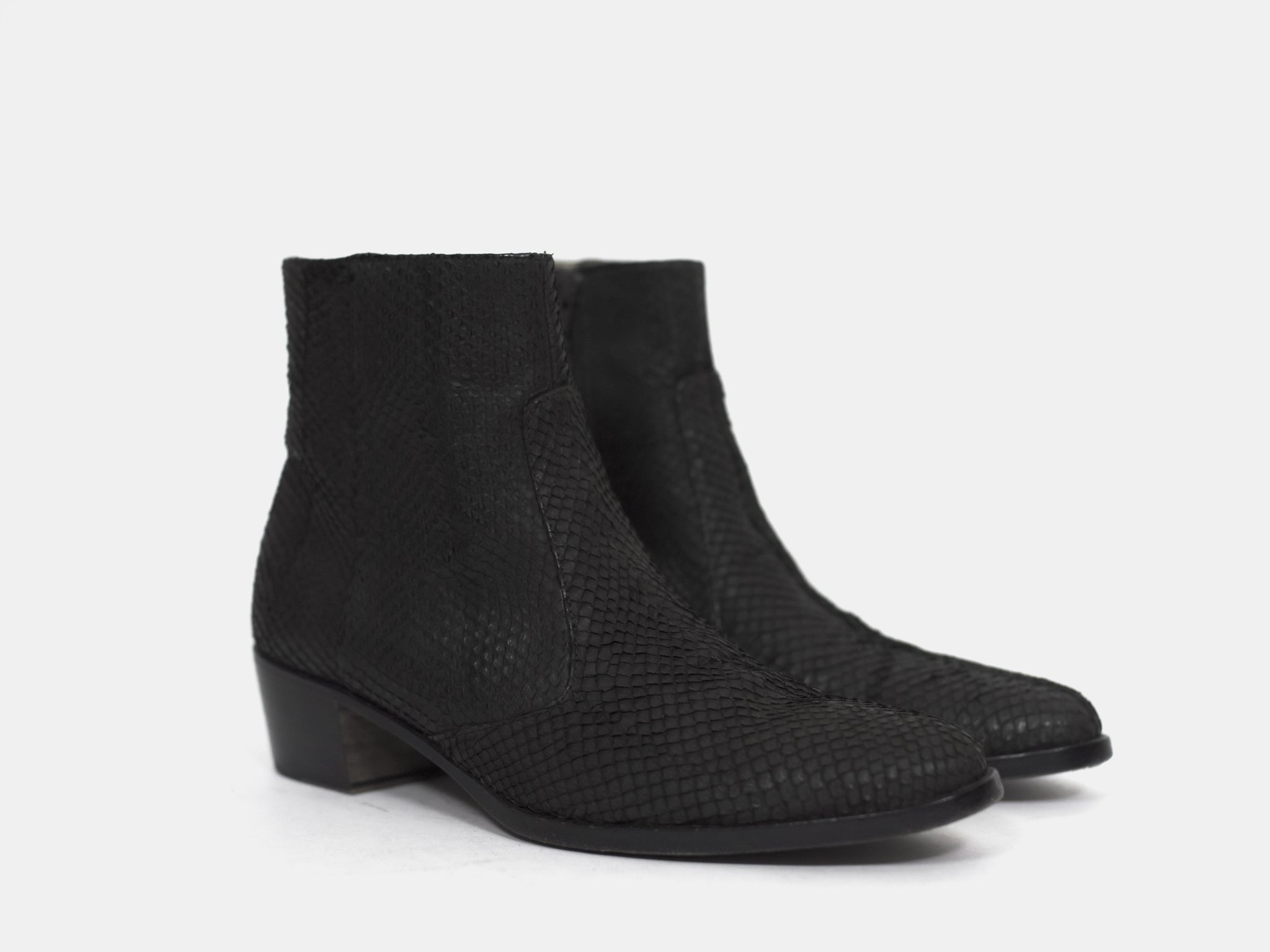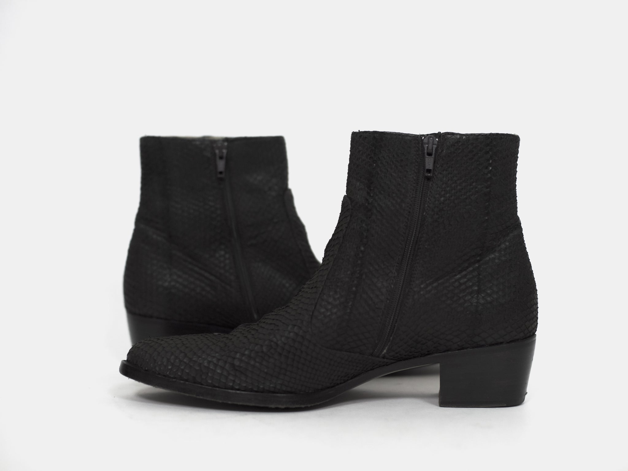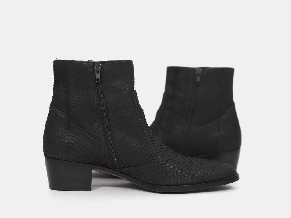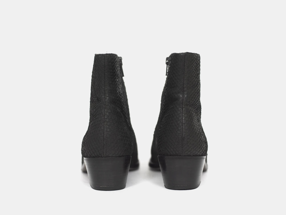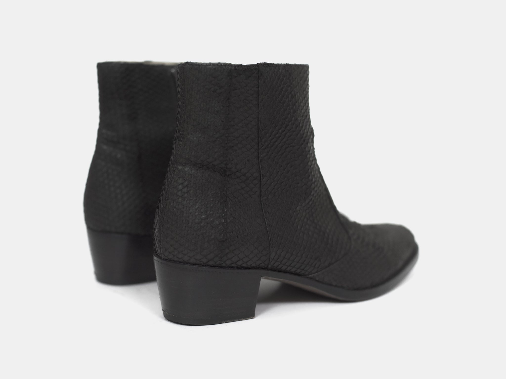 A characteristic sleek western inspired silhouette done in an amazingly intricate perch leather.