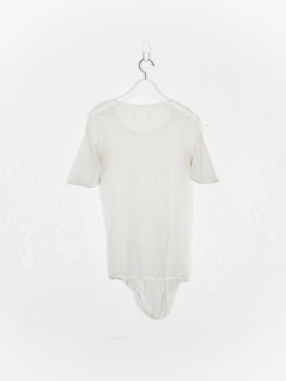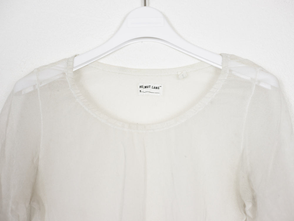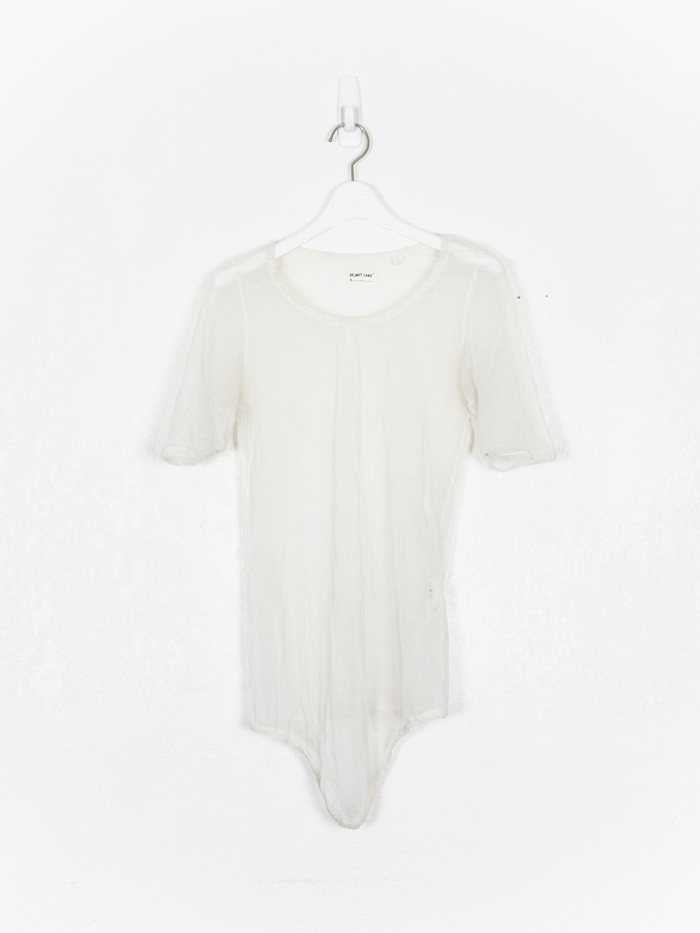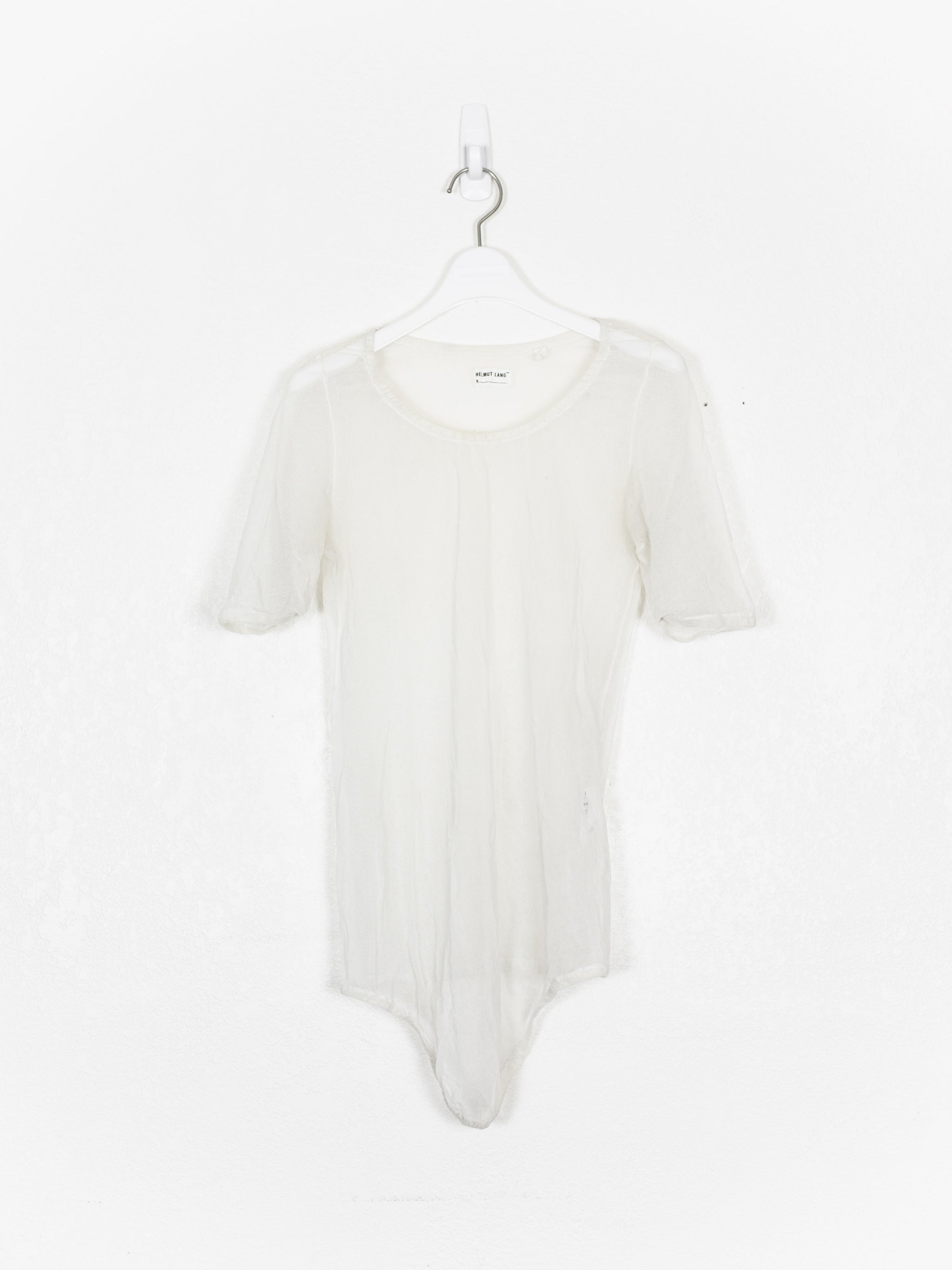 Amazing stretch mesh tee from the late 90s with a curved hem and flattering cut.