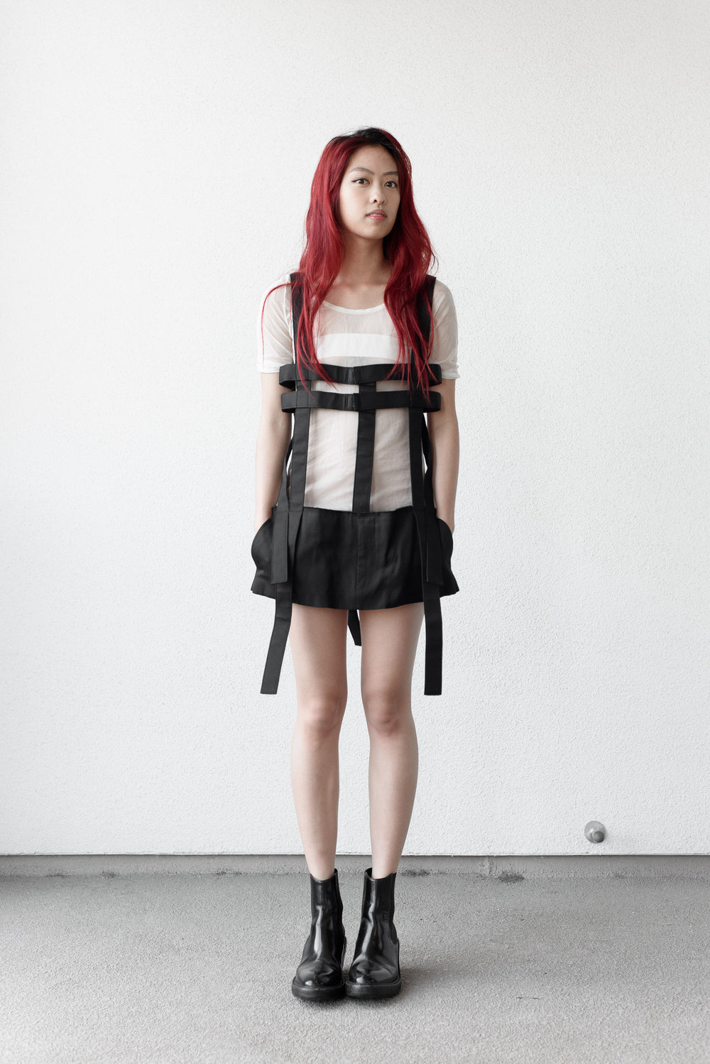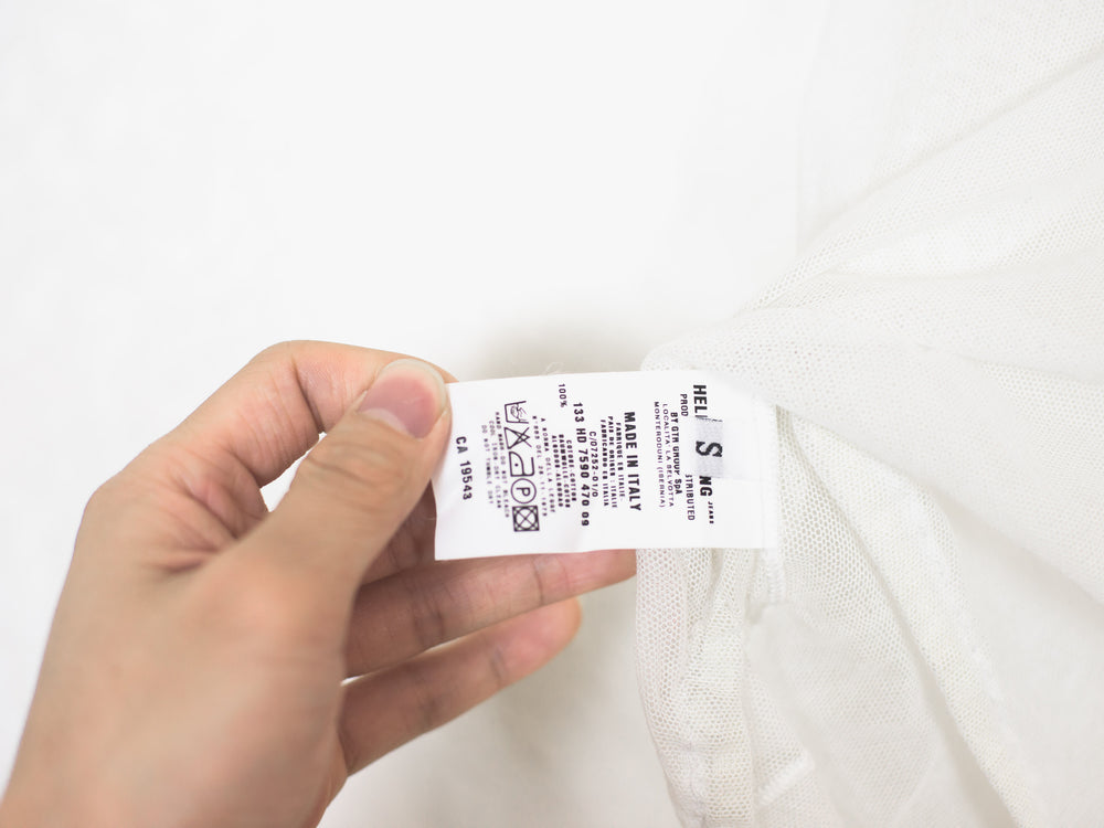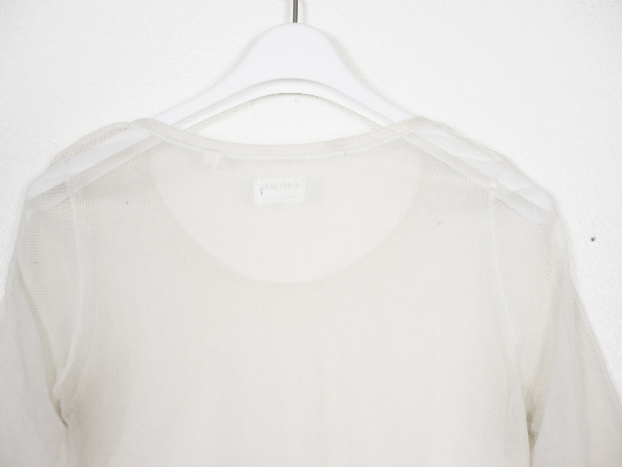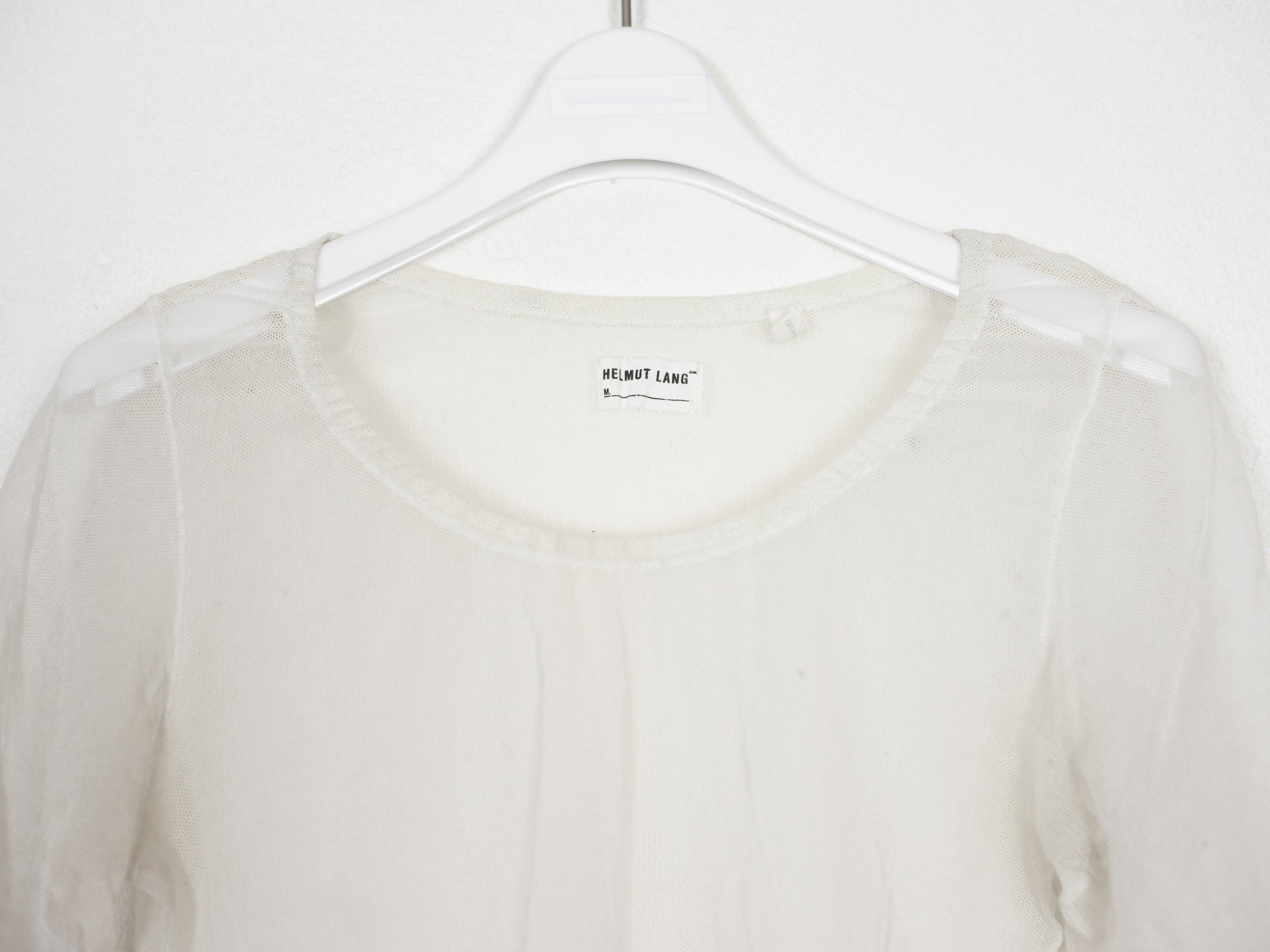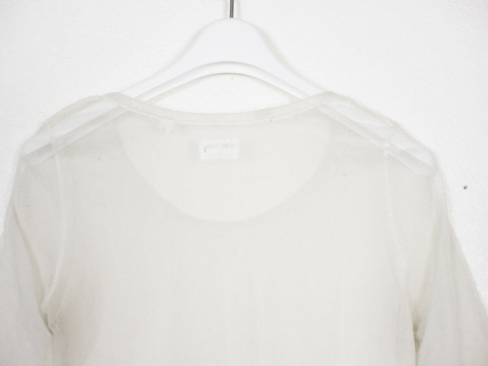 Amazing stretch mesh tee from the late 90s with a curved hem and flattering cut.