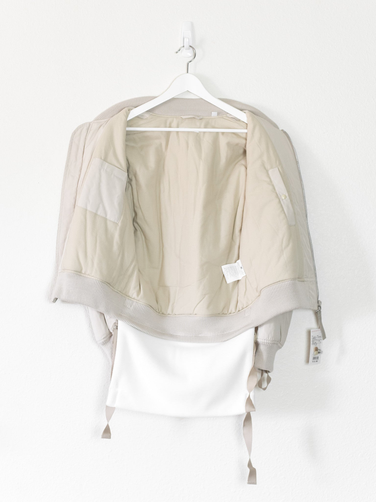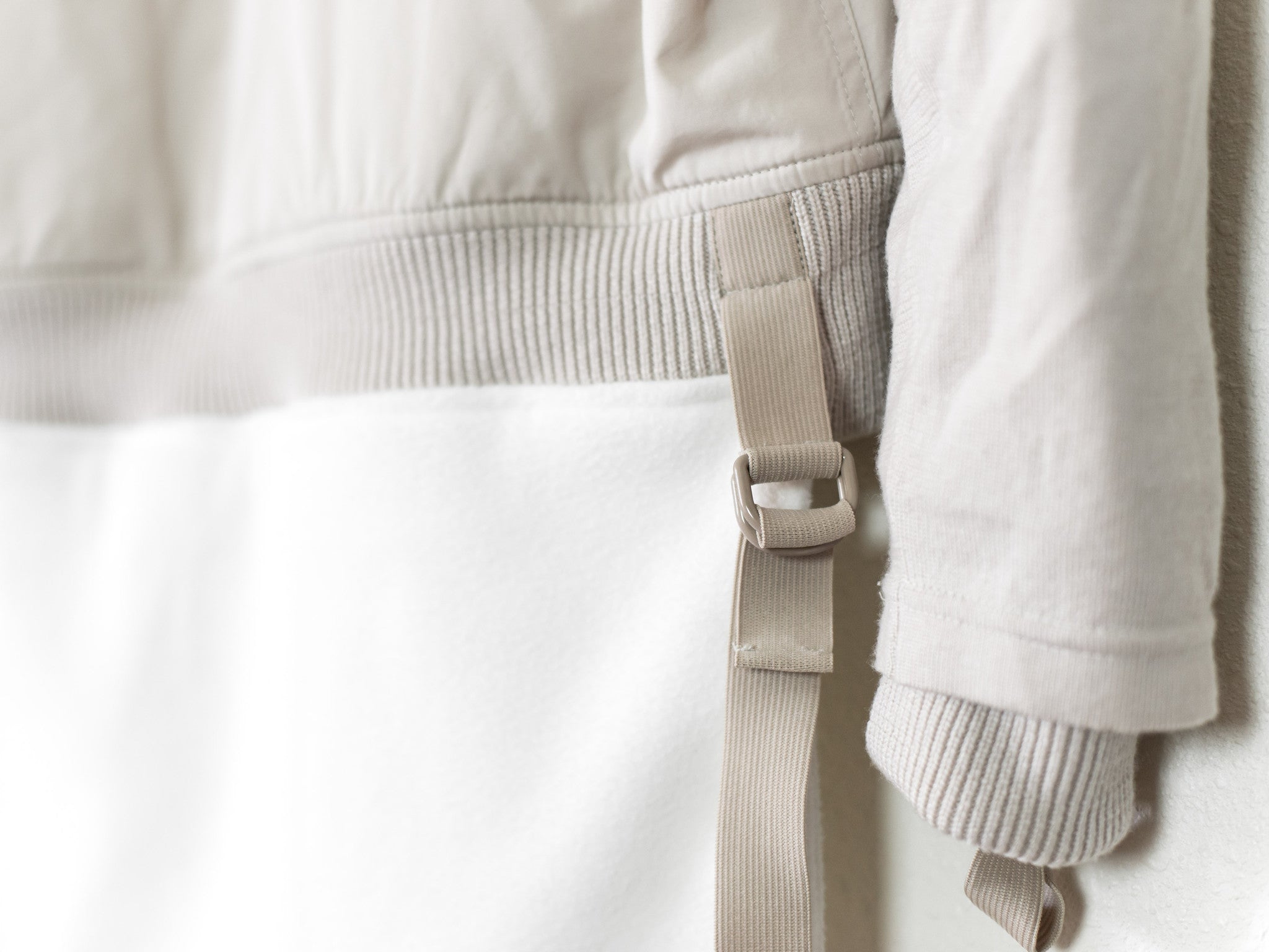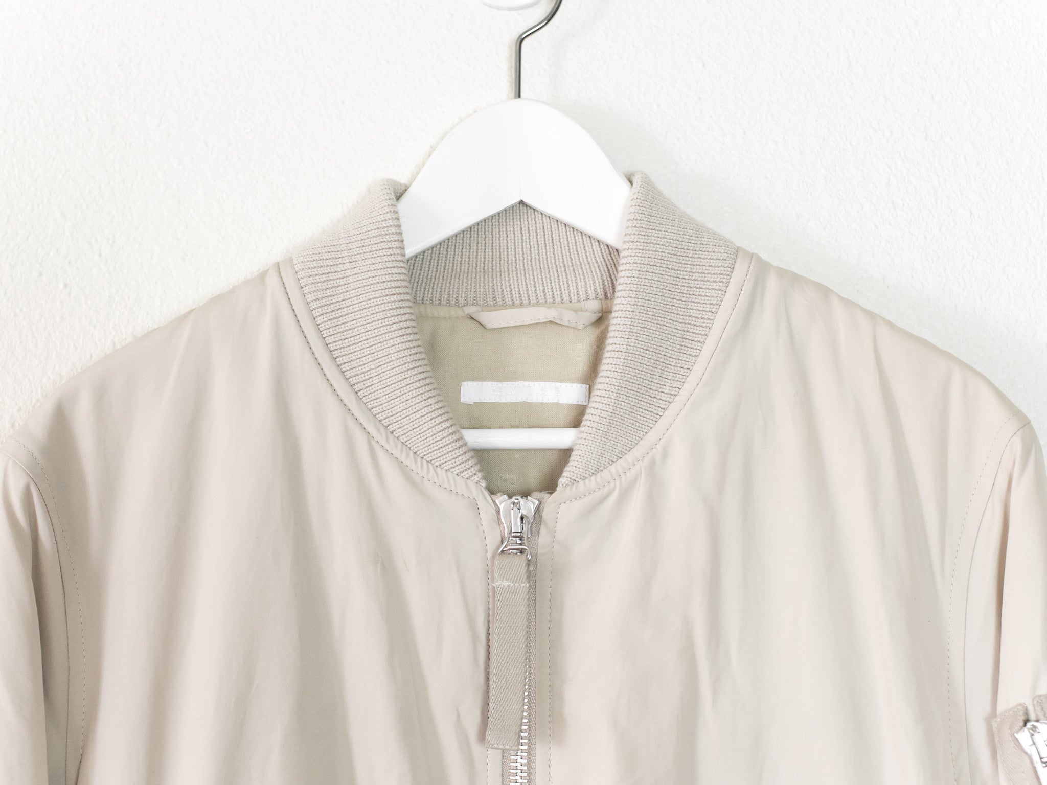 Lang has transformed the rugged, somewhat hawkish nature of the MA-1 into a carnal, intricate and delicate garment with a few simple deliberations. The body of the MA-1 when subtracting all the applications is the most standard Lang did. It was released in Navy, Army Green and Black but the Stone Cream seems to be the most fitting in my eyes; it is subtle and enticing, a perfect compliment to the sexually charged bondage-inspired applications.