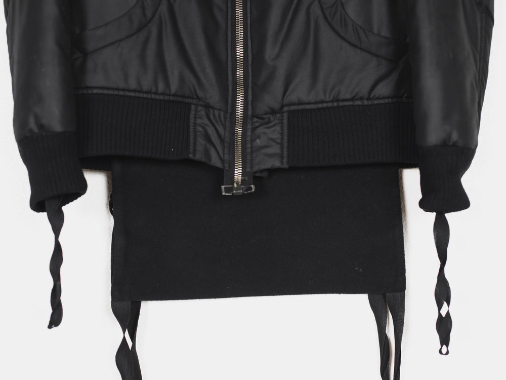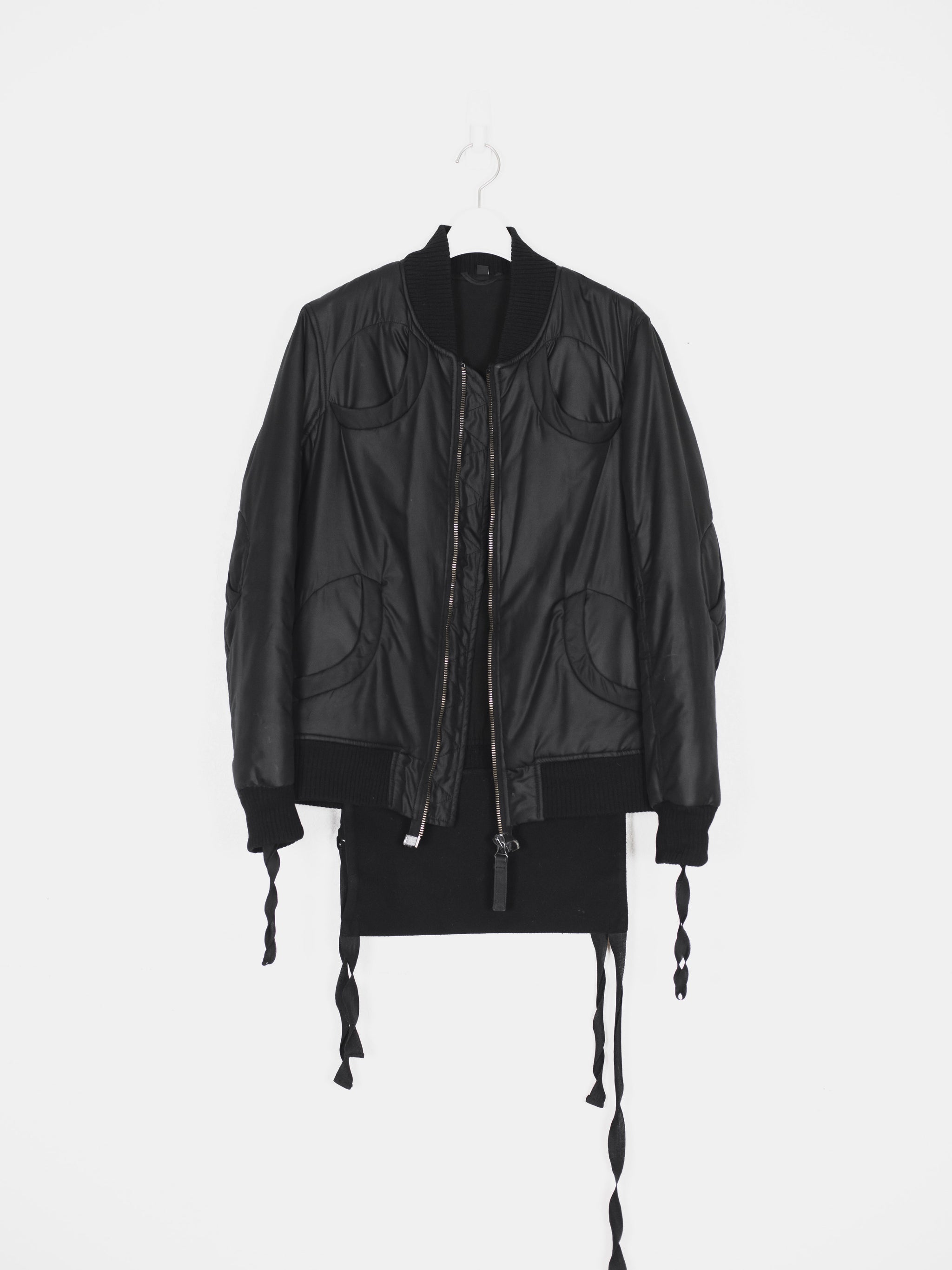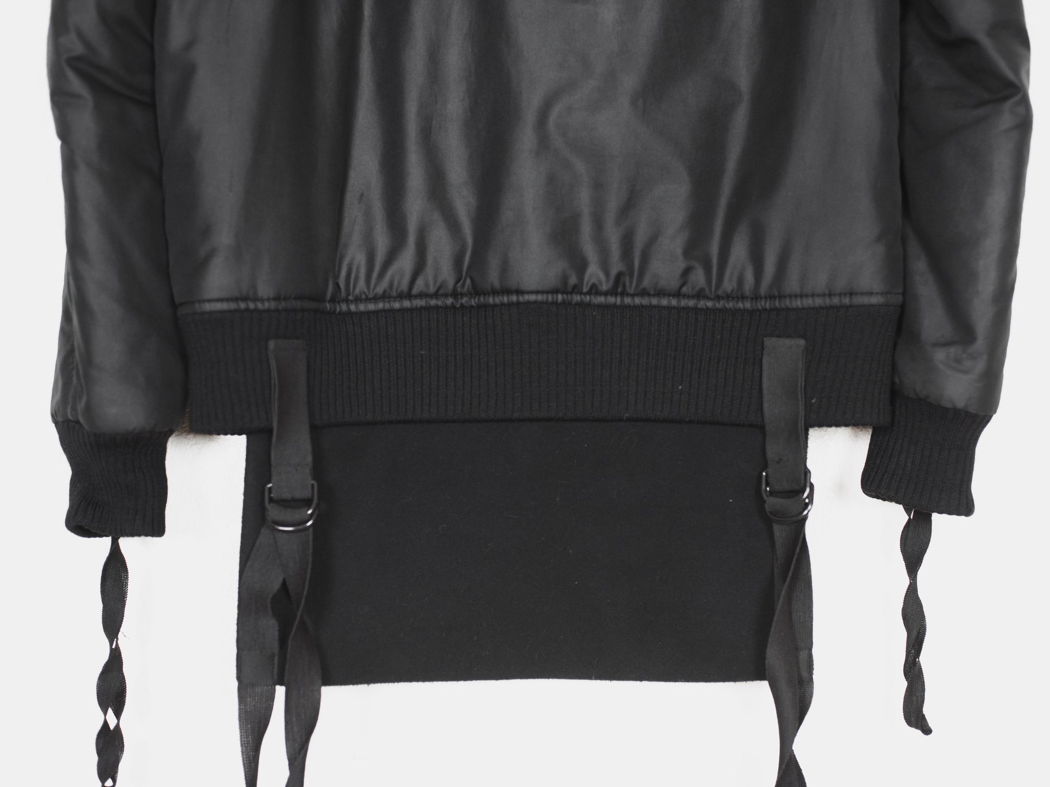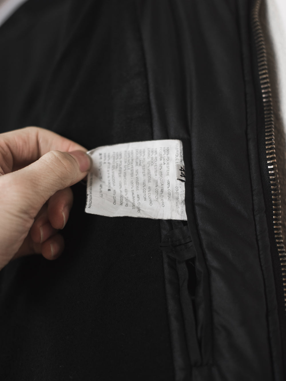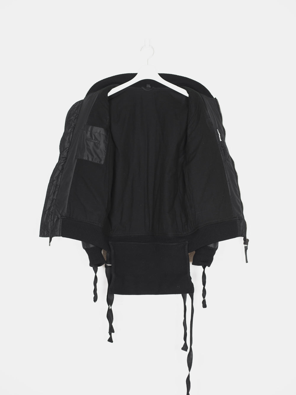 An iconic piece from AW03 featuring the characteristic elastic bondage straps on the back and sleeve ends, as well as the rear cotton panel. The surface fabric is an extremely soft and smooth yet resilient polyester with a slight sheen. Other details inclde four outer pockets, sleeve pocket, internal chest pocket, wind flap, and exposed Lampo zipper.