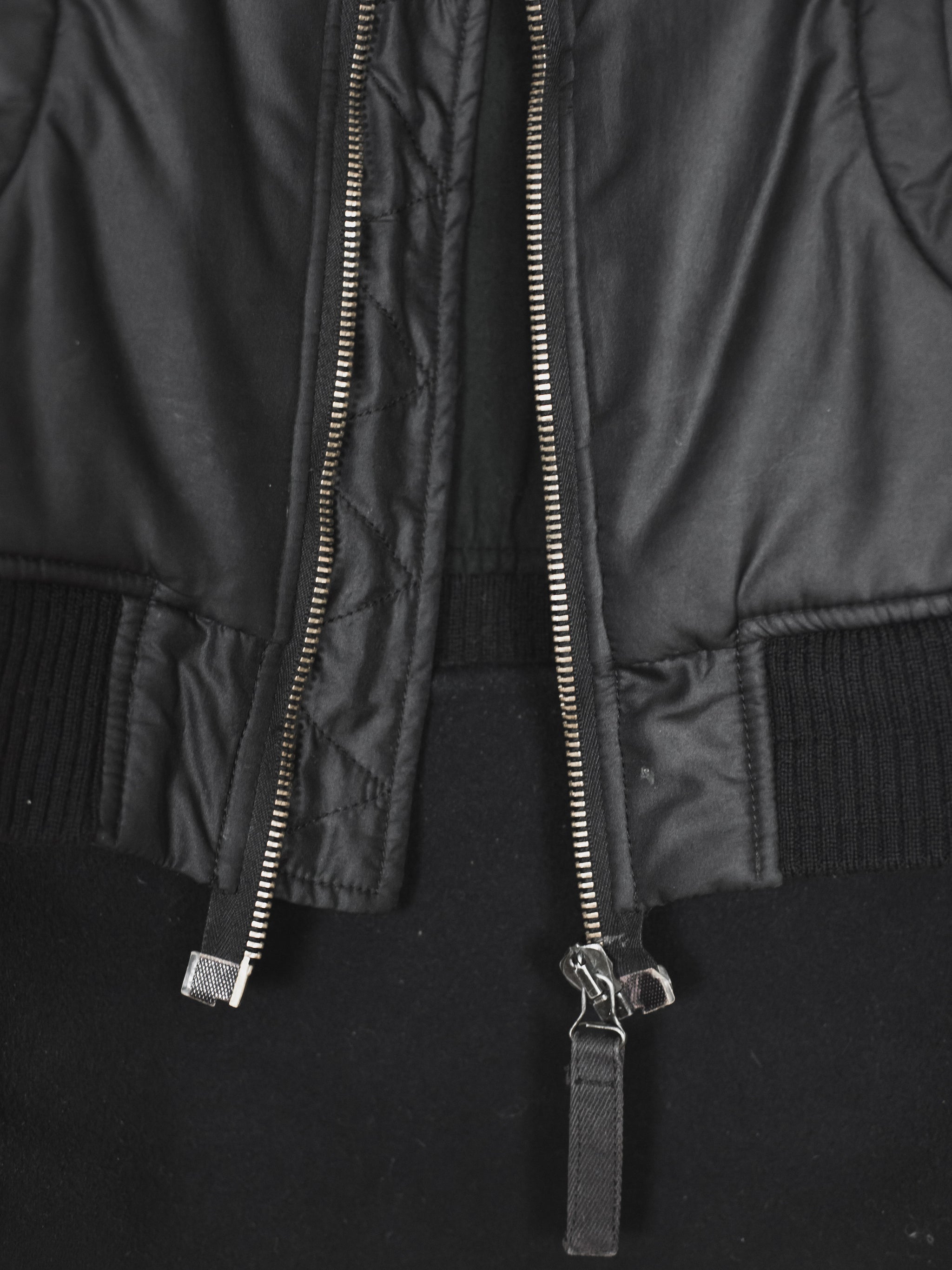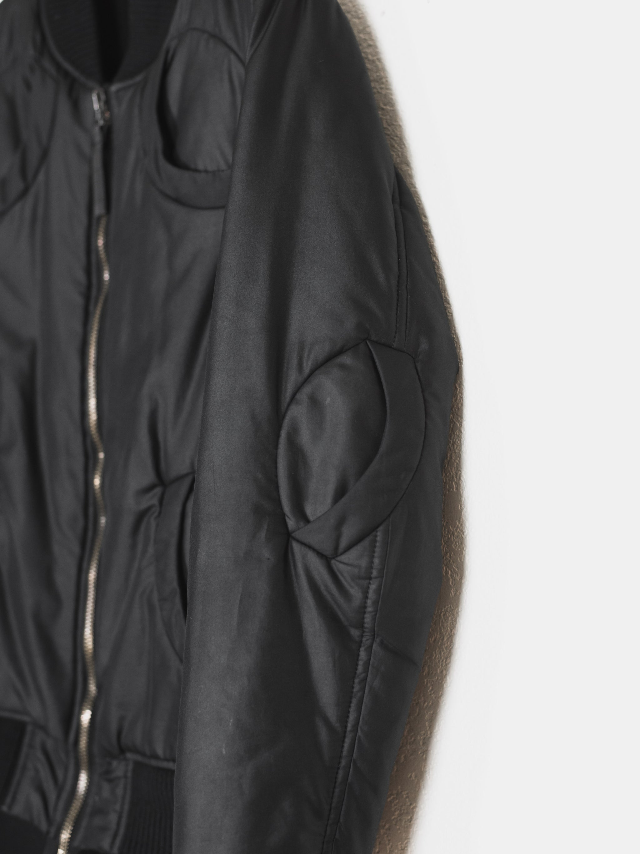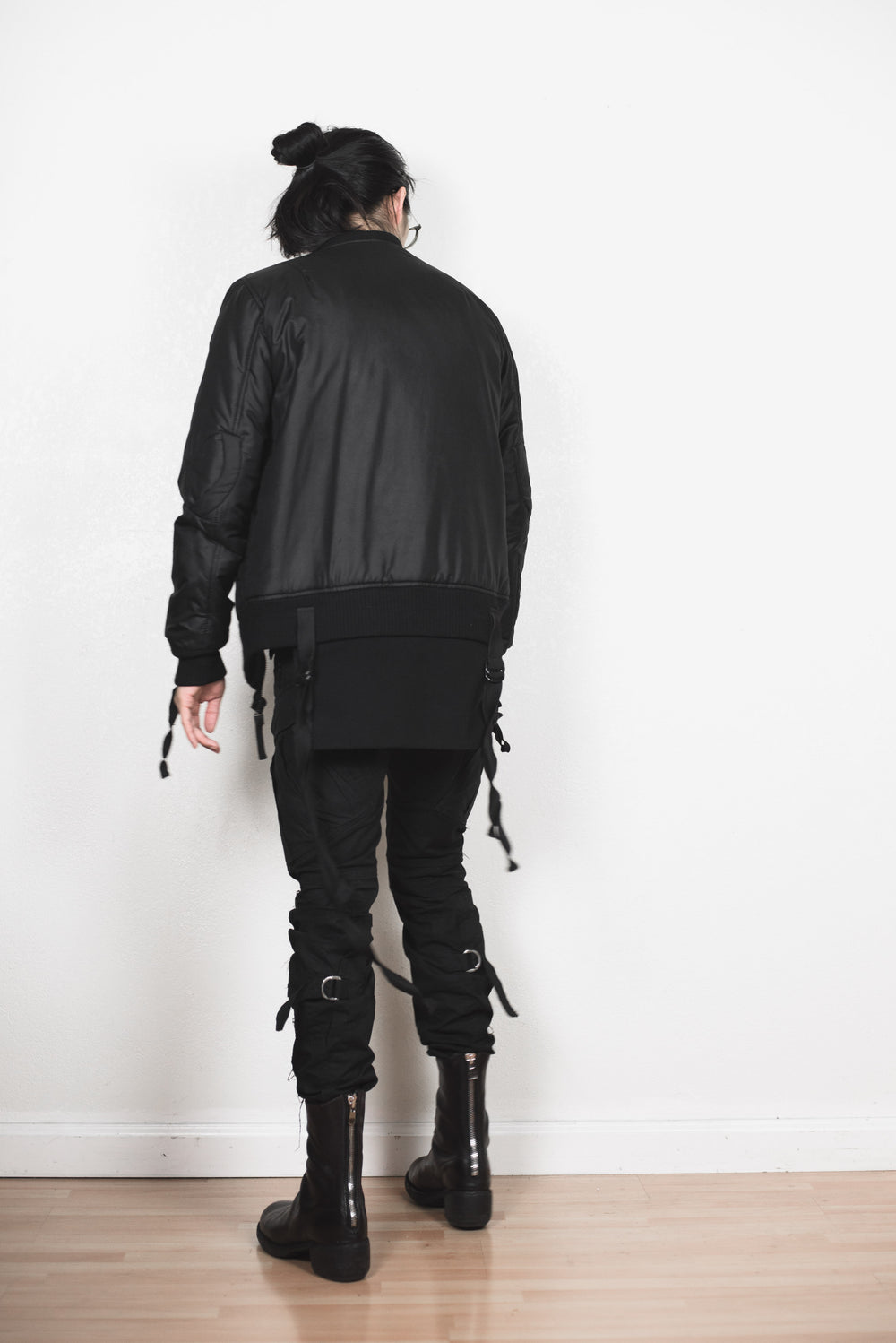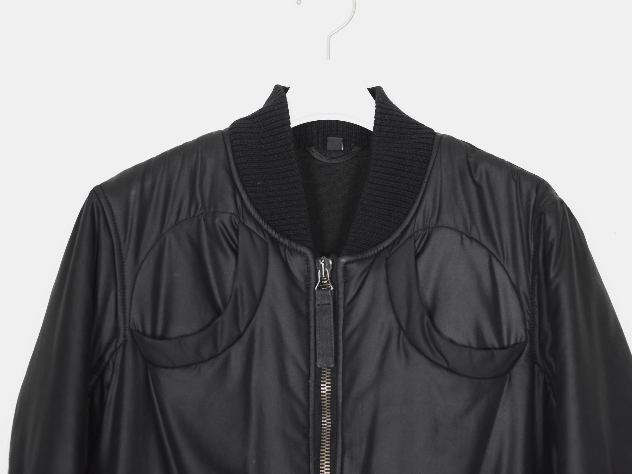 An iconic piece from AW03 featuring the characteristic elastic bondage straps on the back and sleeve ends, as well as the rear cotton panel. The surface fabric is an extremely soft and smooth yet resilient polyester with a slight sheen. Other details inclde four outer pockets, sleeve pocket, internal chest pocket, wind flap, and exposed Lampo zipper.