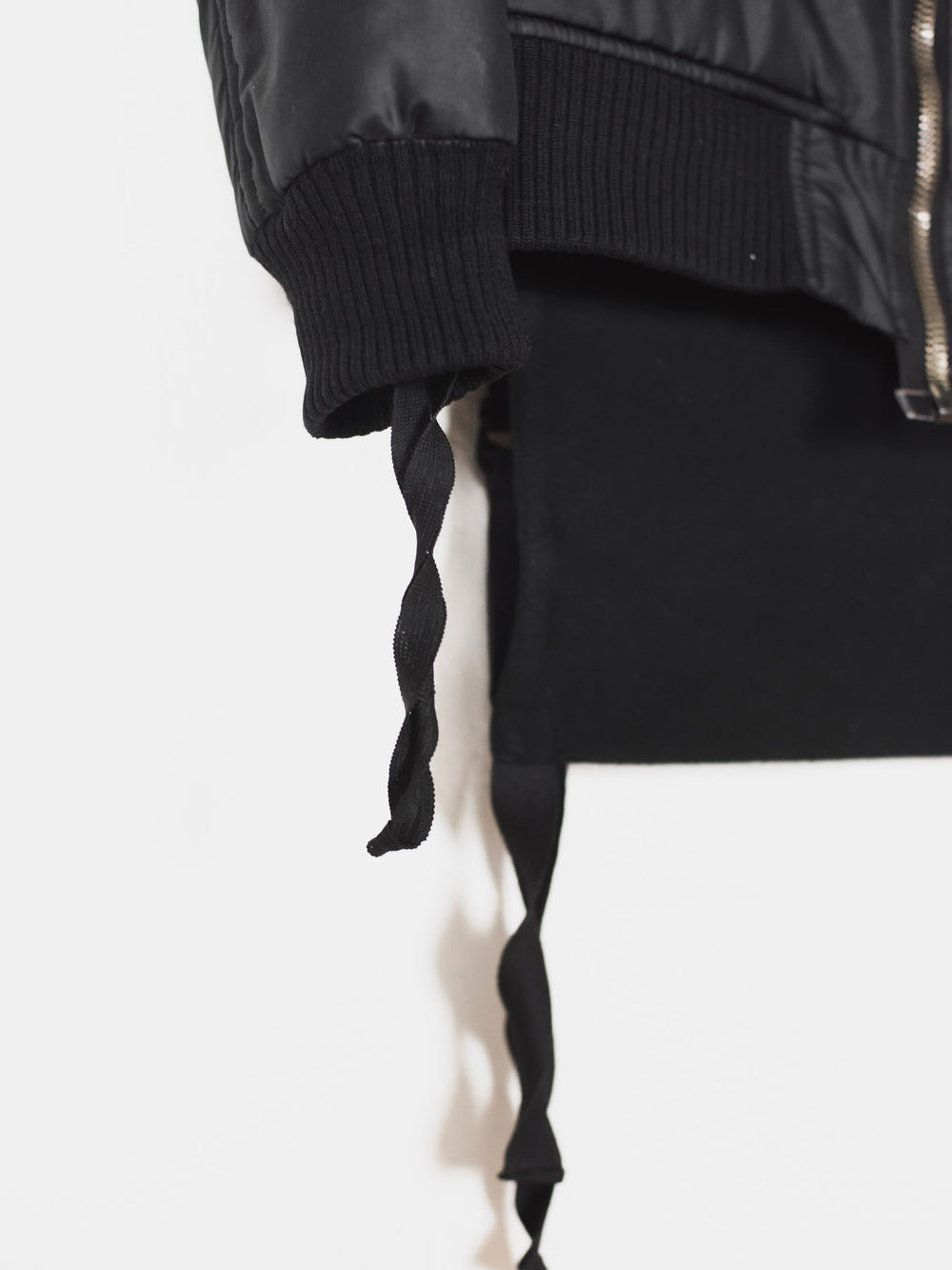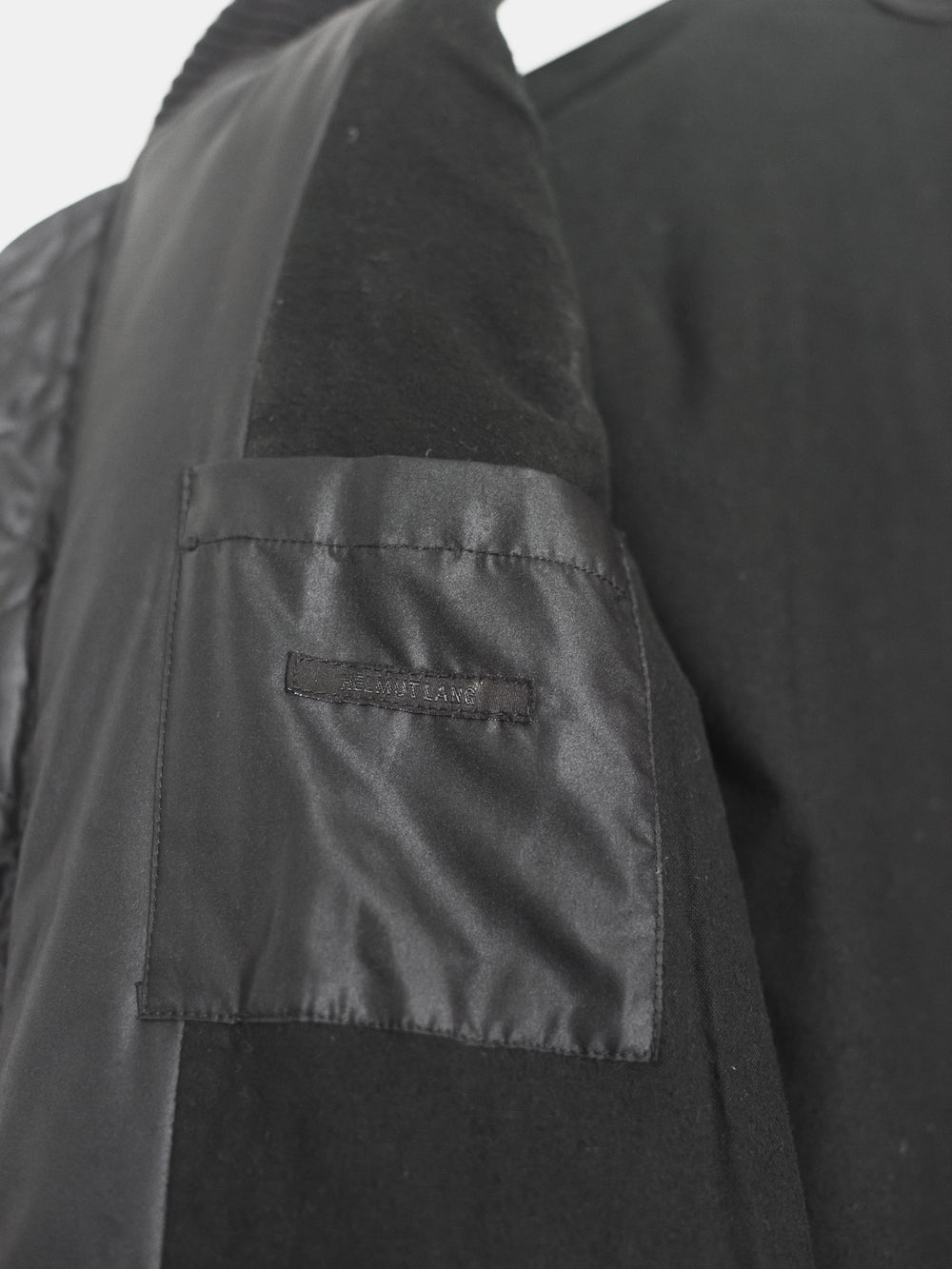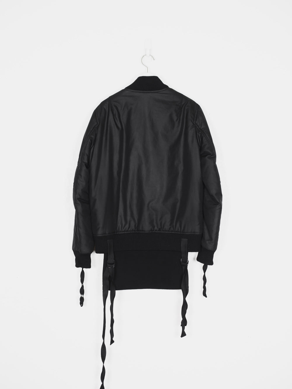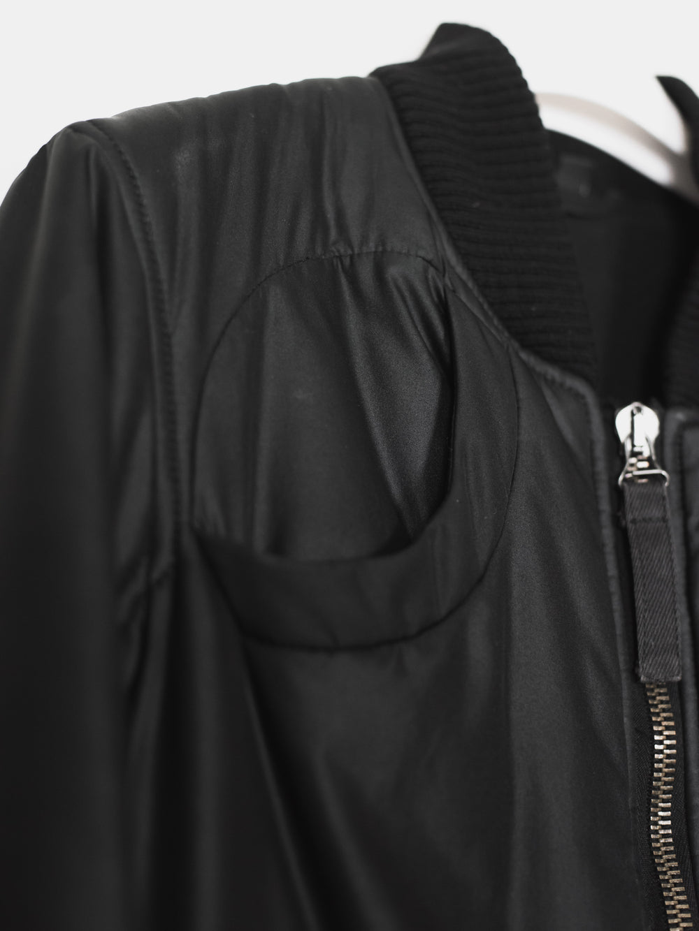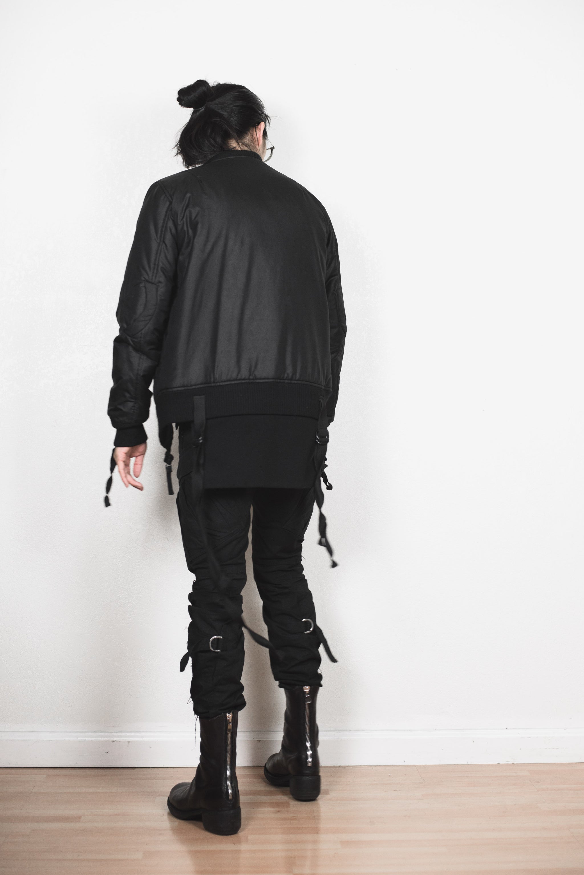 An iconic piece from AW03 featuring the characteristic elastic bondage straps on the back and sleeve ends, as well as the rear cotton panel. The surface fabric is an extremely soft and smooth yet resilient polyester with a slight sheen. Other details inclde four outer pockets, sleeve pocket, internal chest pocket, wind flap, and exposed Lampo zipper.
