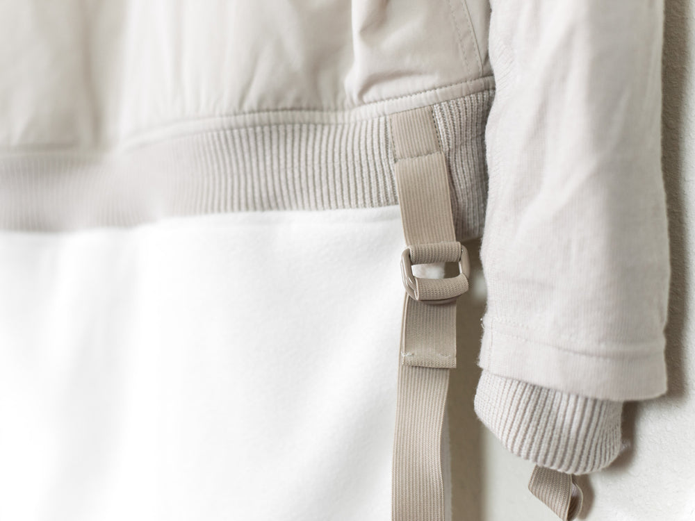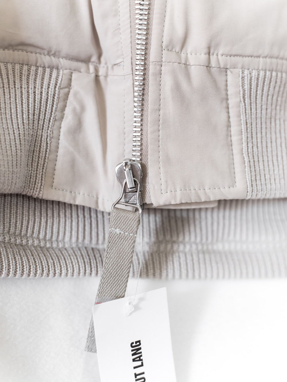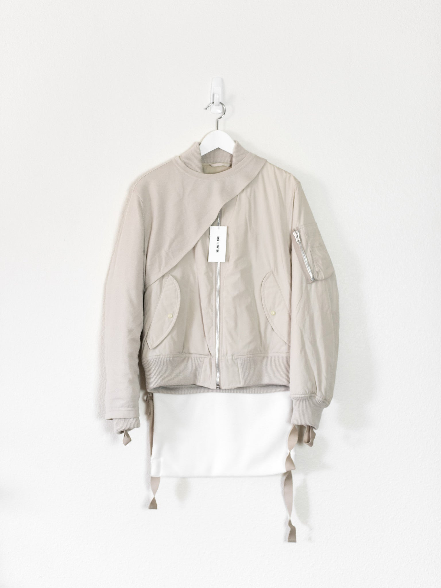 Lang has transformed the rugged, somewhat hawkish nature of the MA-1 into a carnal, intricate and delicate garment with a few simple deliberations. The body of the MA-1 when subtracting all the applications is the most standard Lang did. It was released in Navy, Army Green and Black but the Stone Cream seems to be the most fitting in my eyes; it is subtle and enticing, a perfect compliment to the sexually charged bondage-inspired applications. The asymmetric shoulder sleeve detail is perhaps the most notable and unique element of this jacket, almost resembling armour. In contention to this resemblance however is the delicate nature of the cotton fabric the sleeve is composited out of; the balance Lang has found between violence, sensuality and subtlety is remarkable and convincingly beautiful.