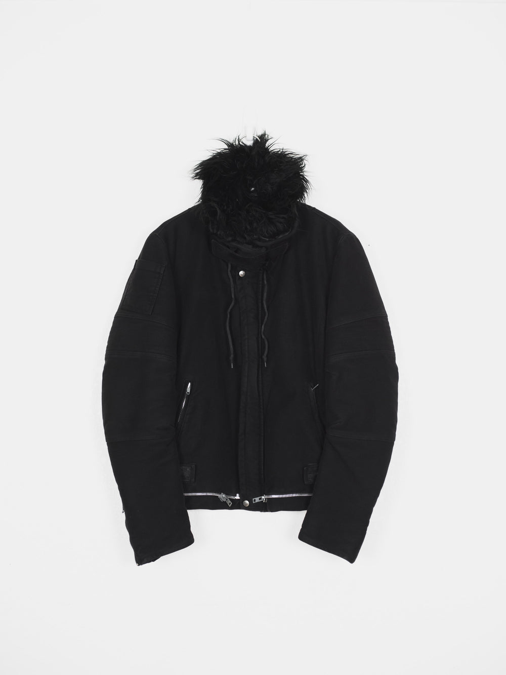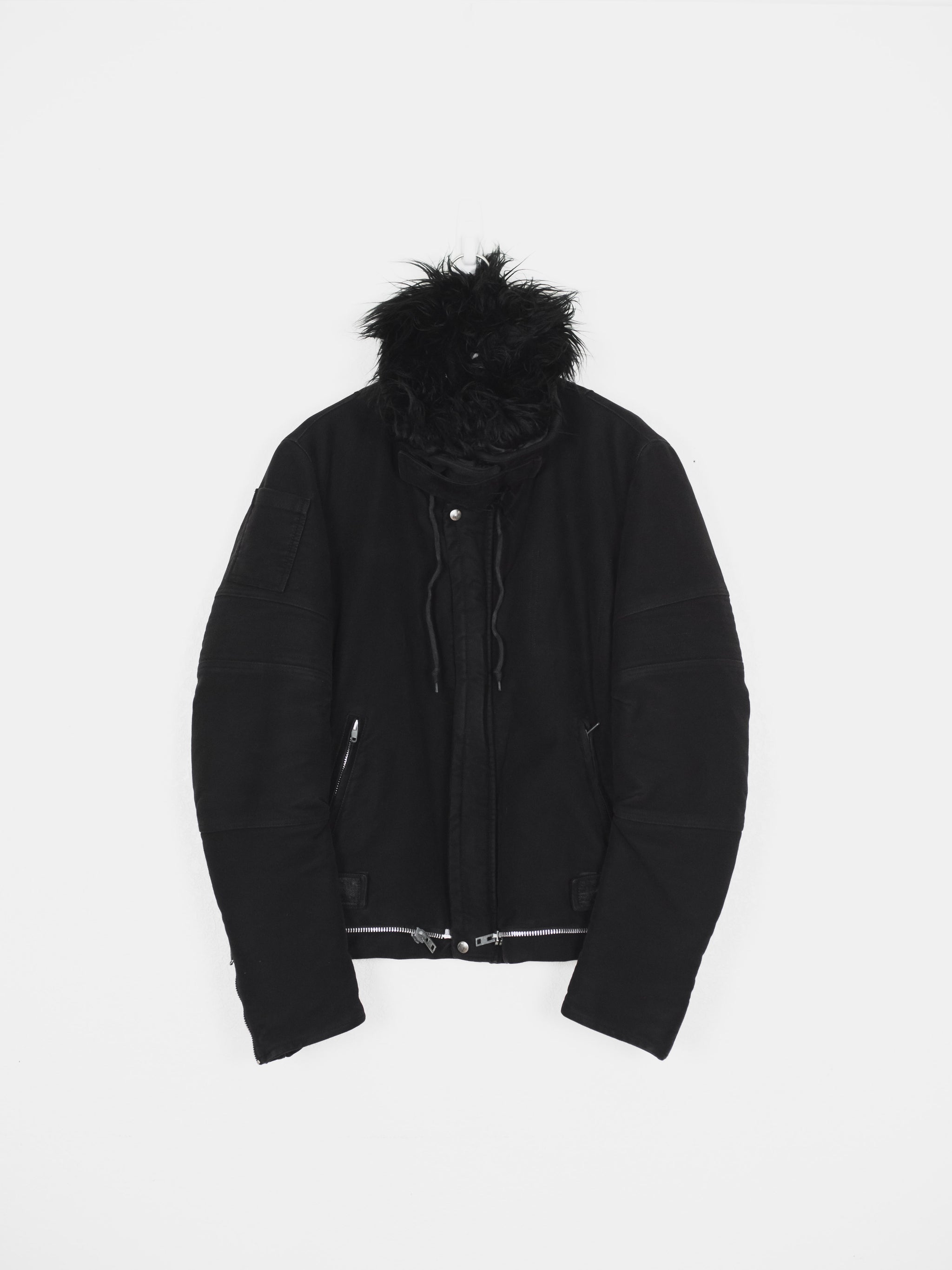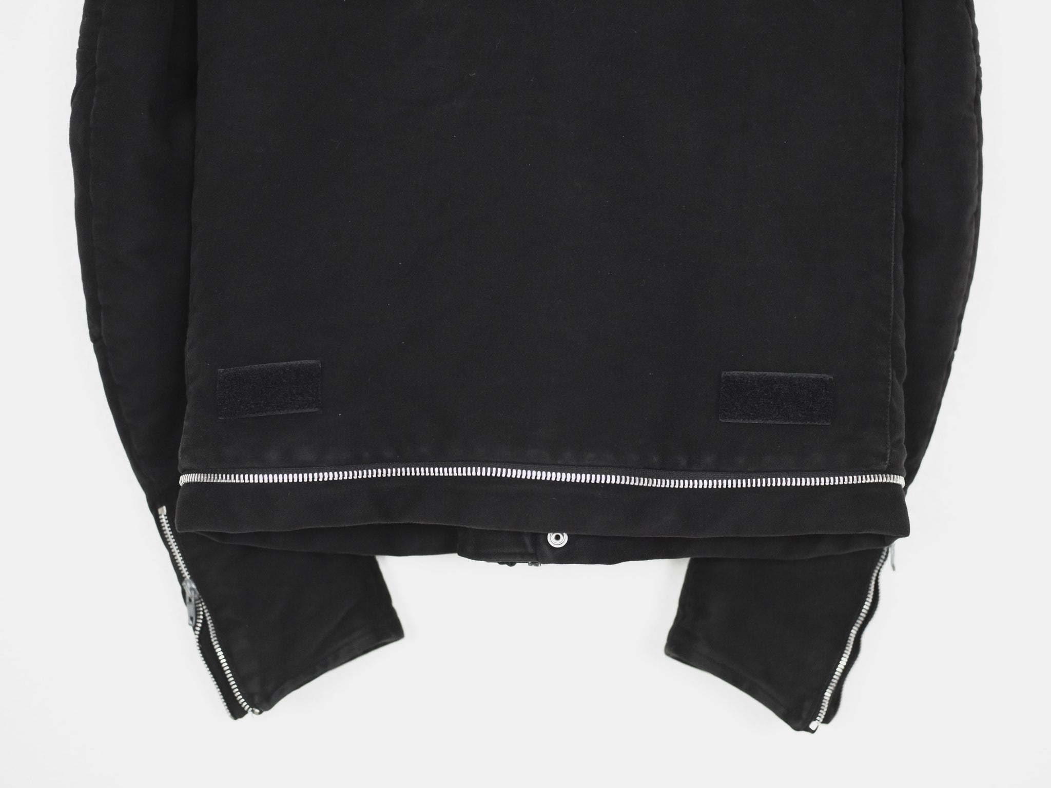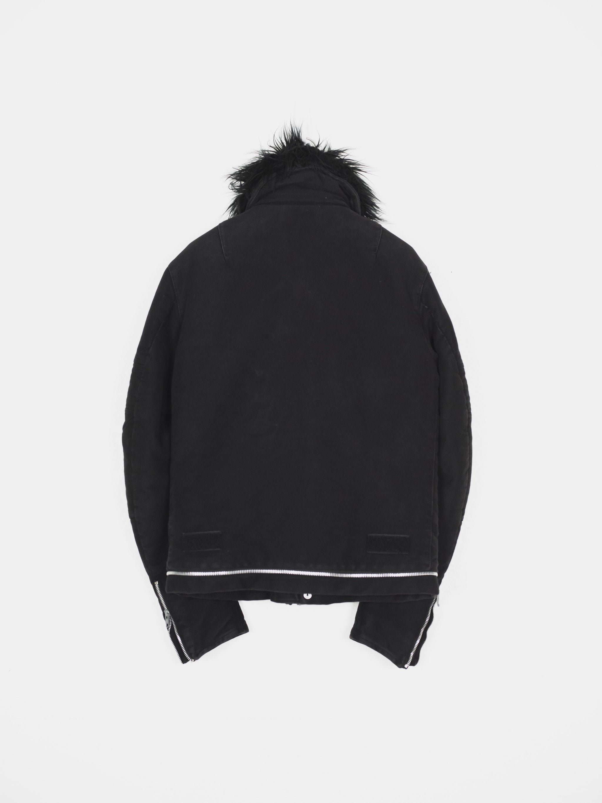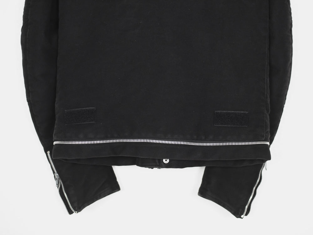 The original Astro Biker Jacket in the classic soft and thick cotton moleskin. Features a wire-adjustable collar, bondage carry straps, biker detailing, sleeve pocket, four front pockets, and interior chest pocket. Padded and fully lined. Fits slightly oversized. This particular piece is in surprisingly good condition, with perfectly clean and fluffy fur, no fuzzing on the velcro, and no worn out straps.