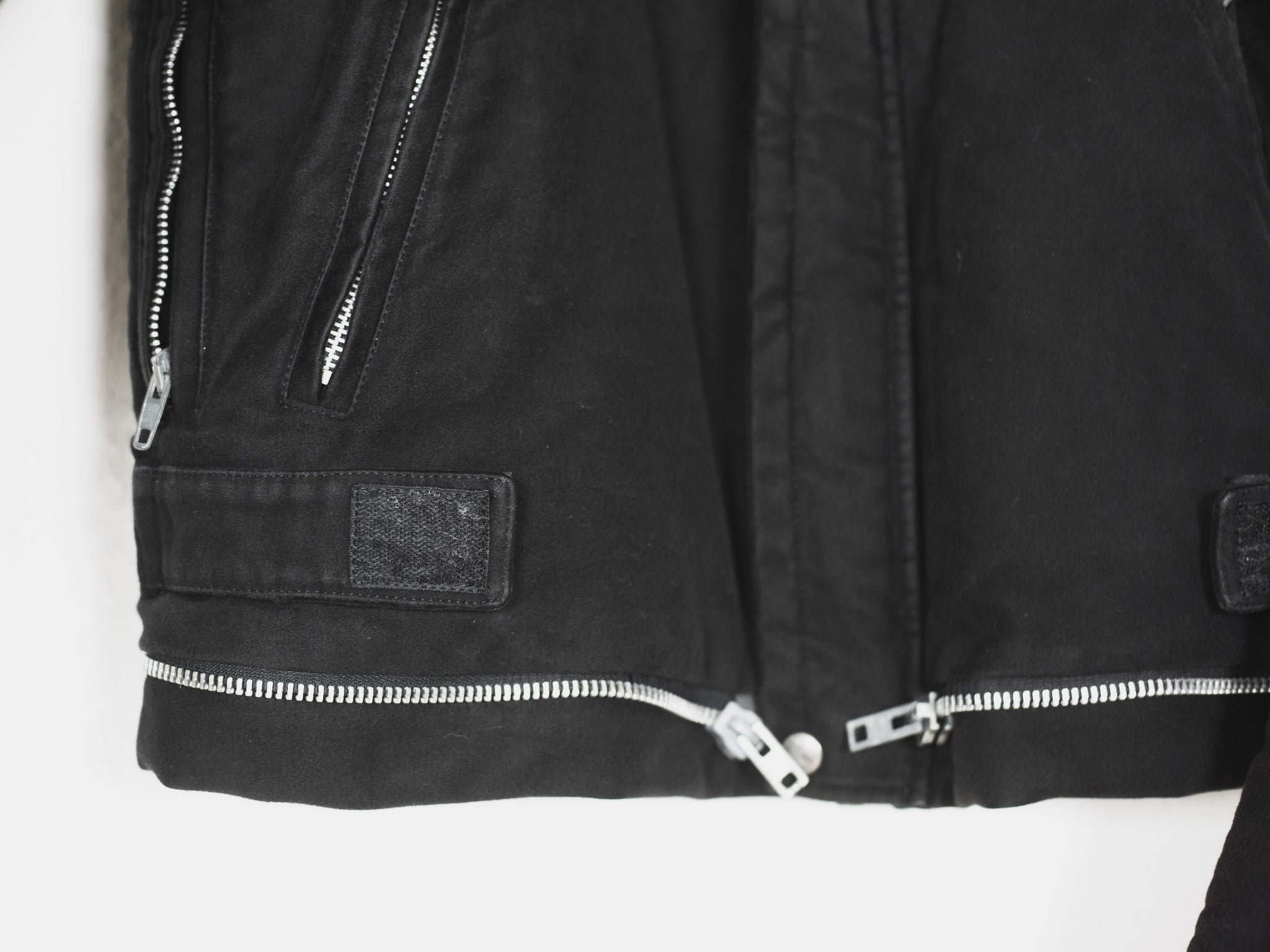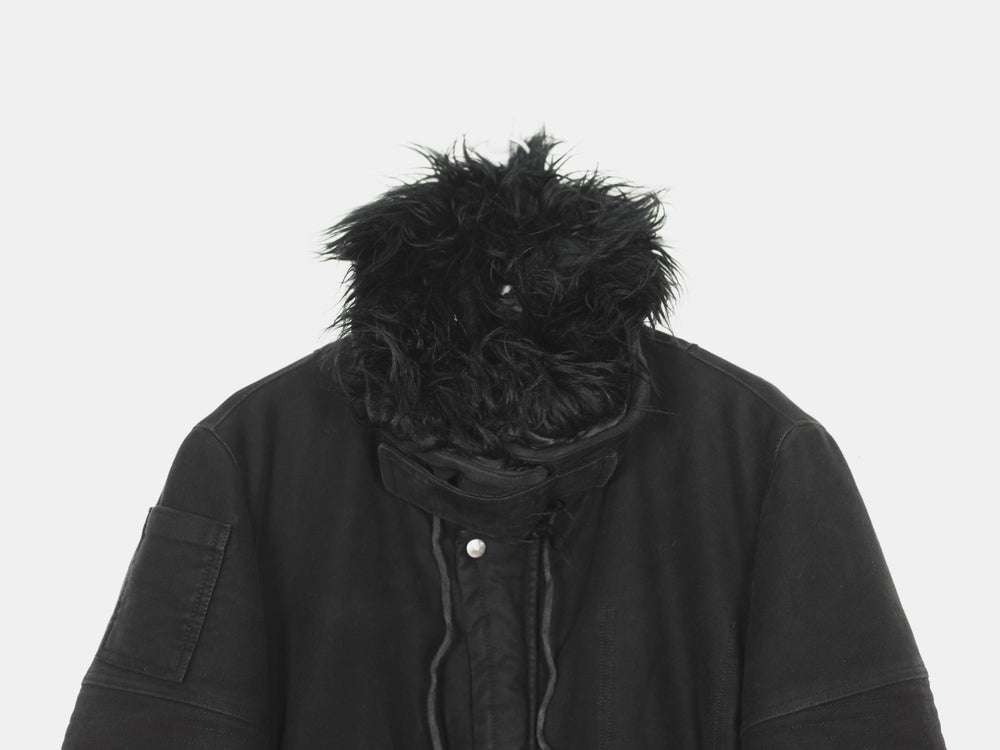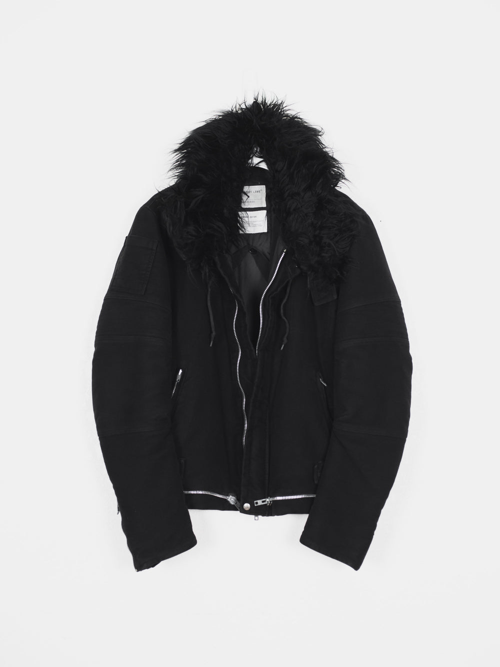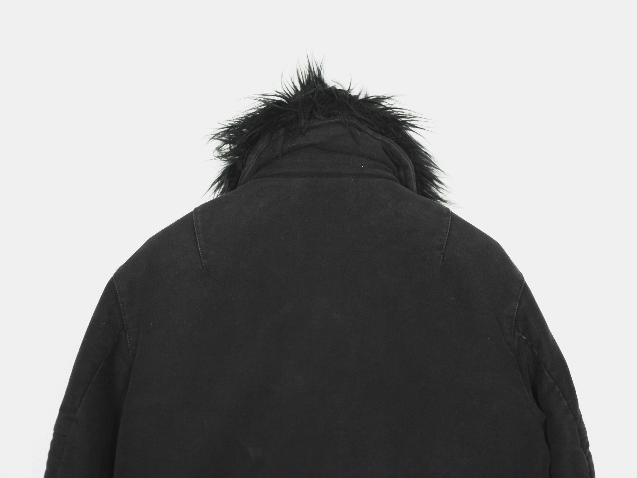 The original Astro Biker Jacket in the classic soft and thick cotton moleskin. Features a wire-adjustable collar, bondage carry straps, biker detailing, sleeve pocket, four front pockets, and interior chest pocket. Padded and fully lined. Fits slightly oversized. This particular piece is in surprisingly good condition, with perfectly clean and fluffy fur, no fuzzing on the velcro, and no worn out straps.