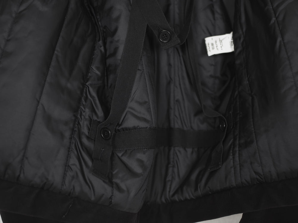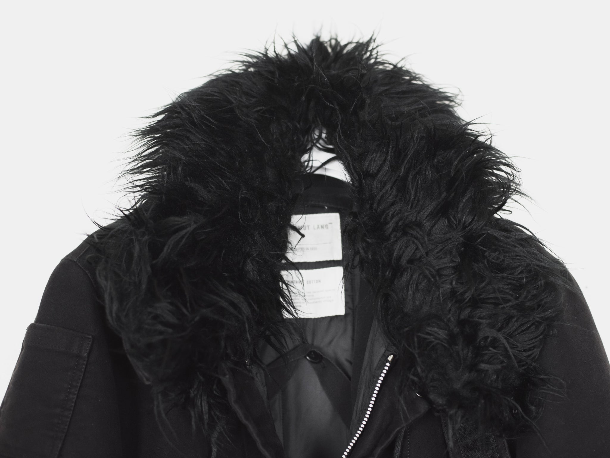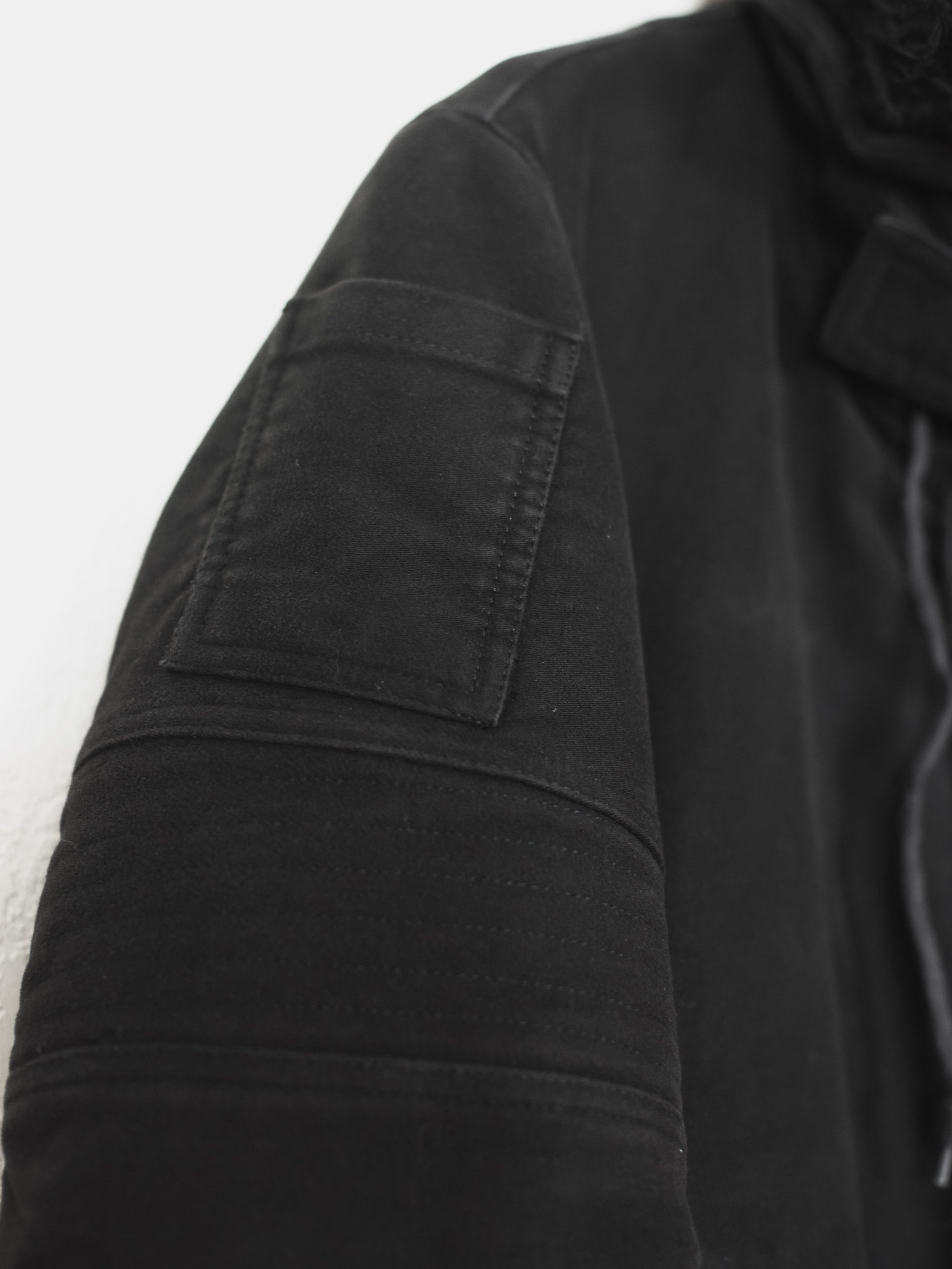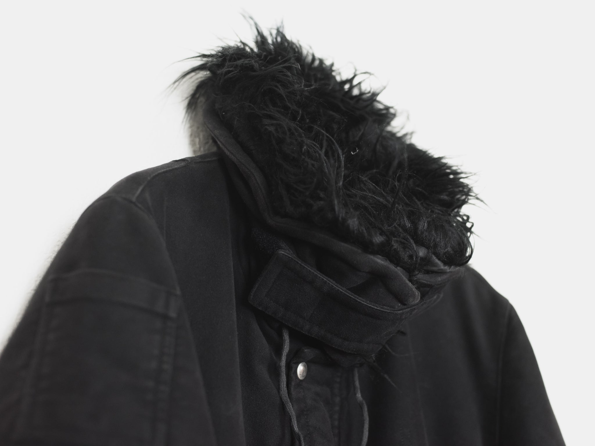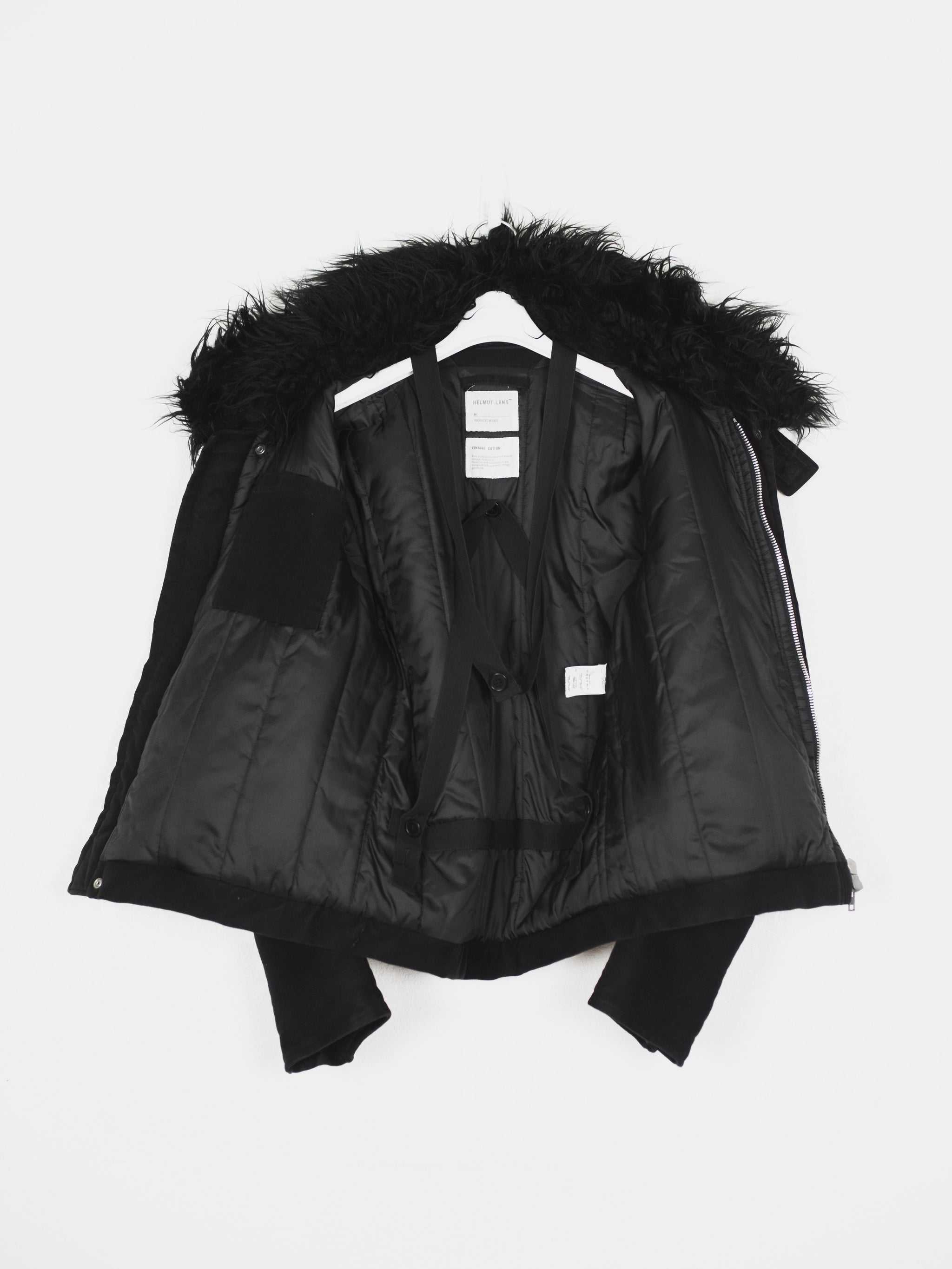 The original Astro Biker Jacket in the classic soft and thick cotton moleskin. Features a wire-adjustable collar, bondage carry straps, biker detailing, sleeve pocket, four front pockets, and interior chest pocket. Padded and fully lined. Fits slightly oversized. This particular piece is in surprisingly good condition, with perfectly clean and fluffy fur, no fuzzing on the velcro, and no worn out straps.