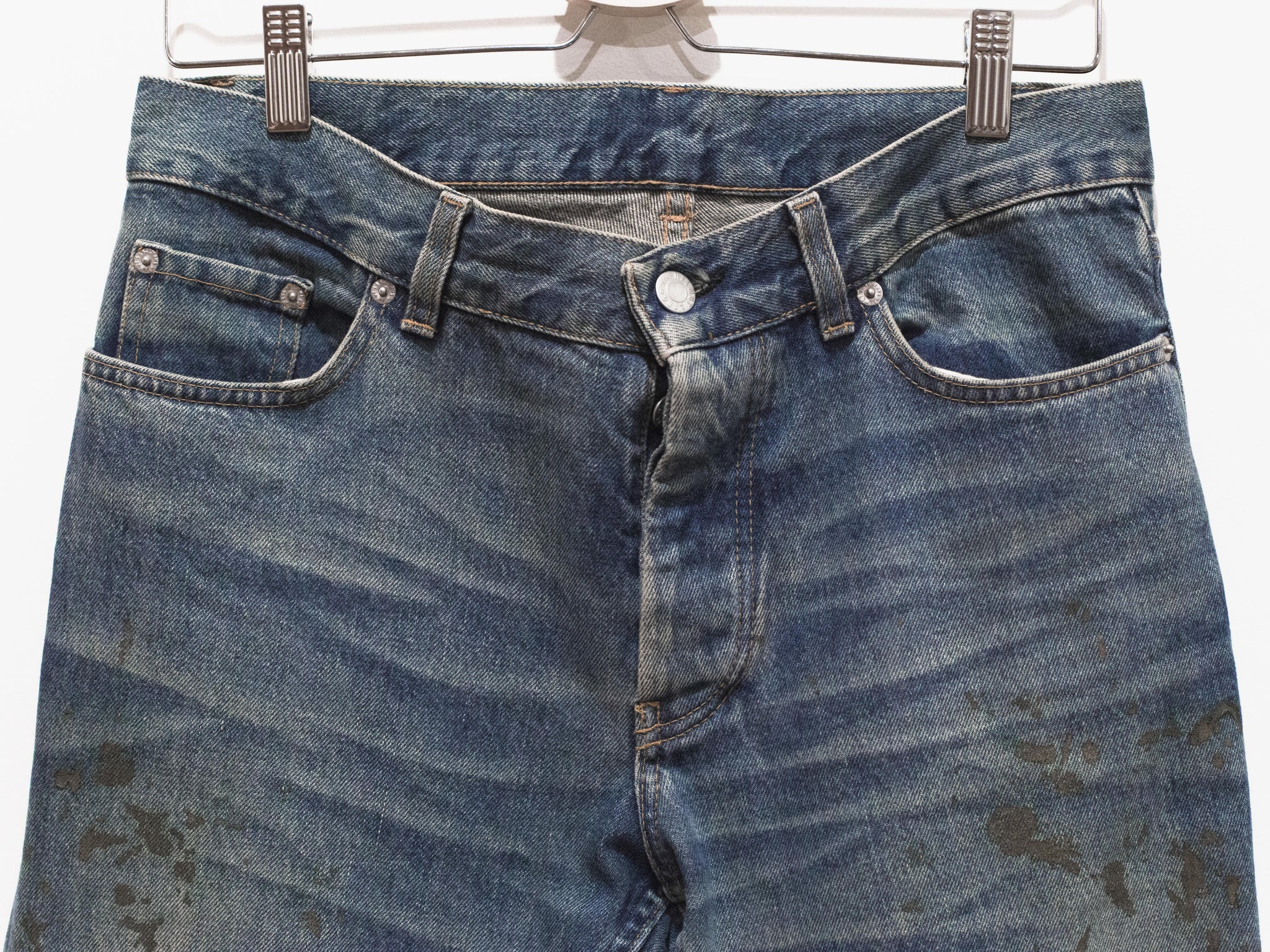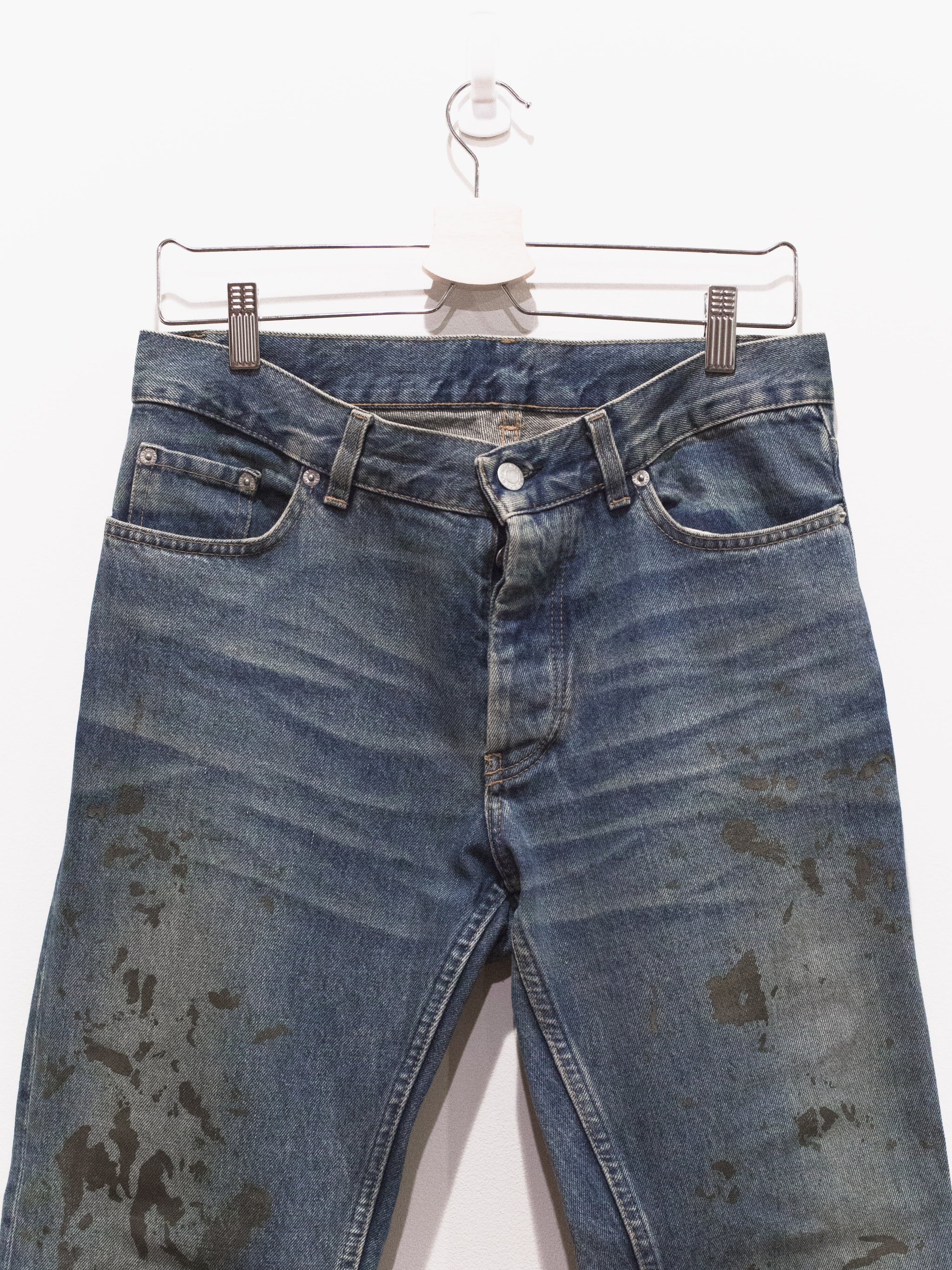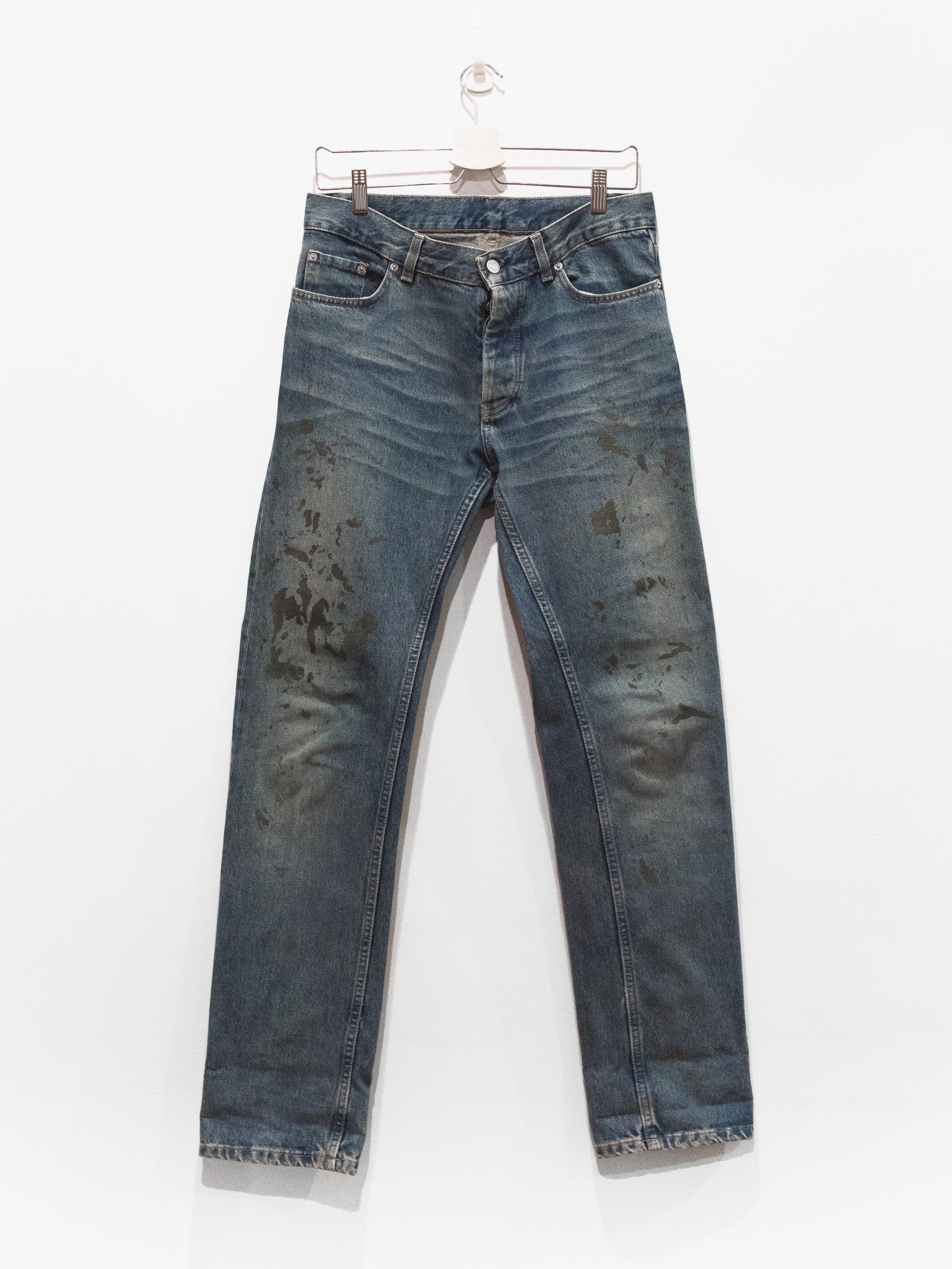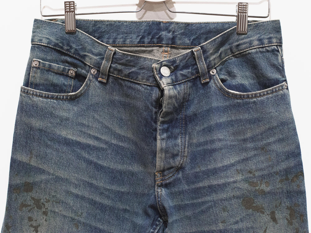 The classic Helmut denim from his time at the label. This pair features a darker treatment, with the gold paint echoing both glamour and simple, dirty mudstains.