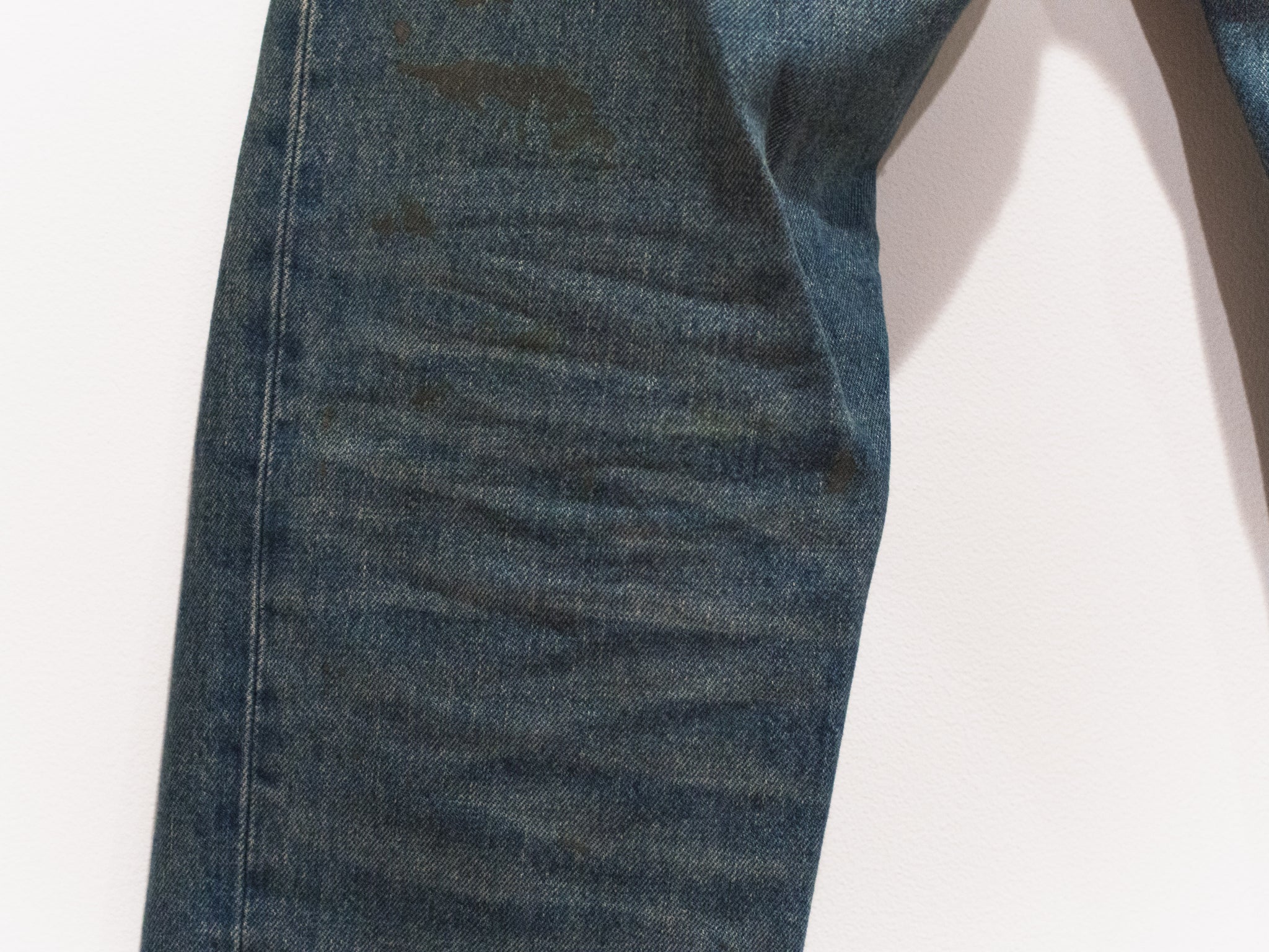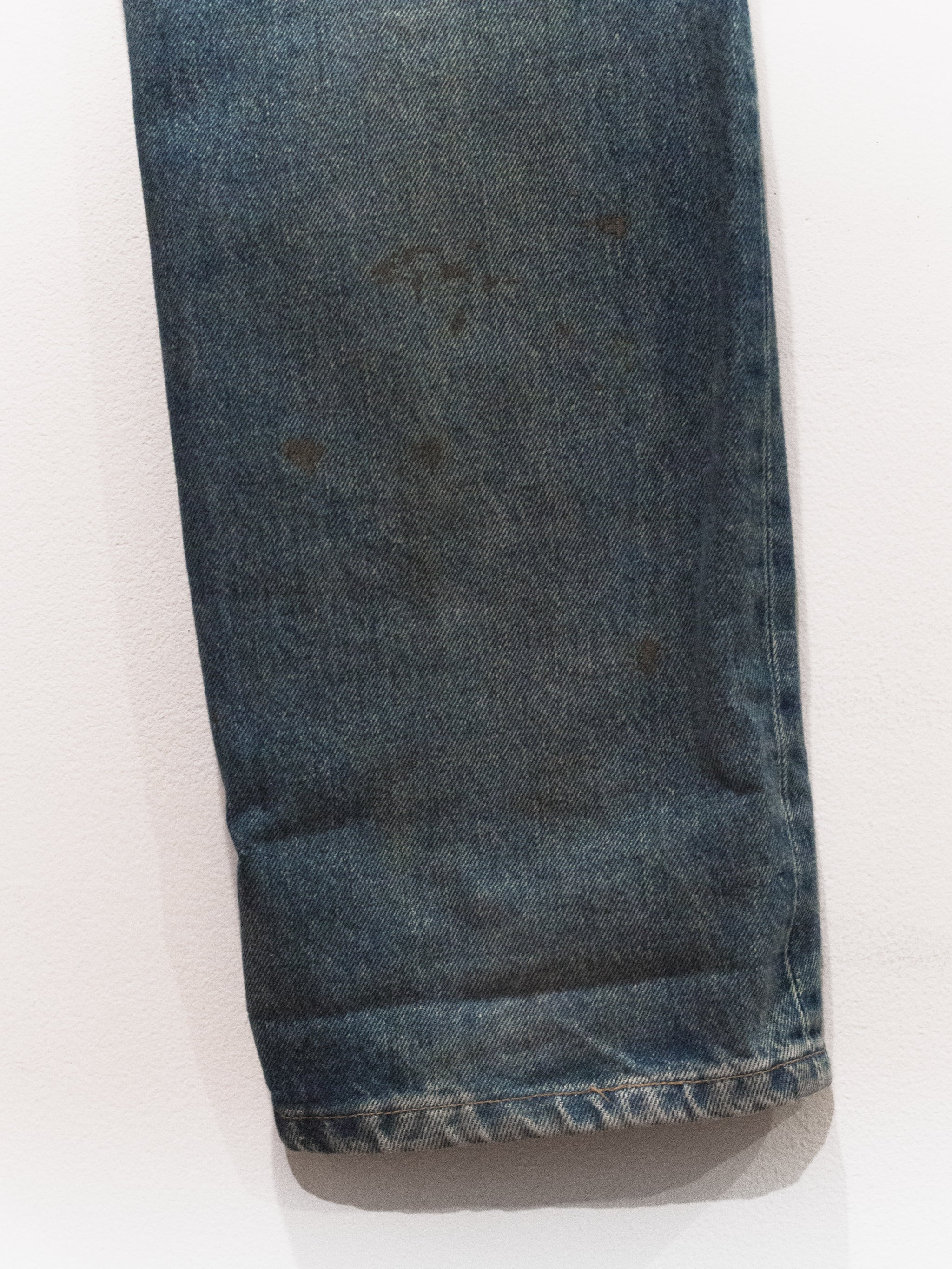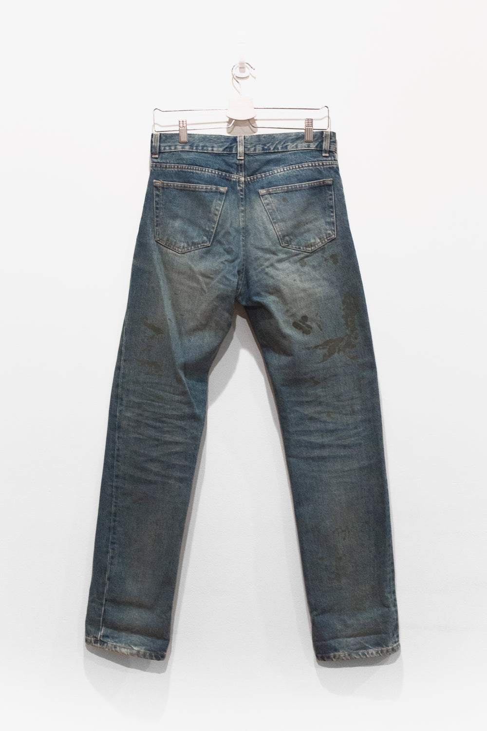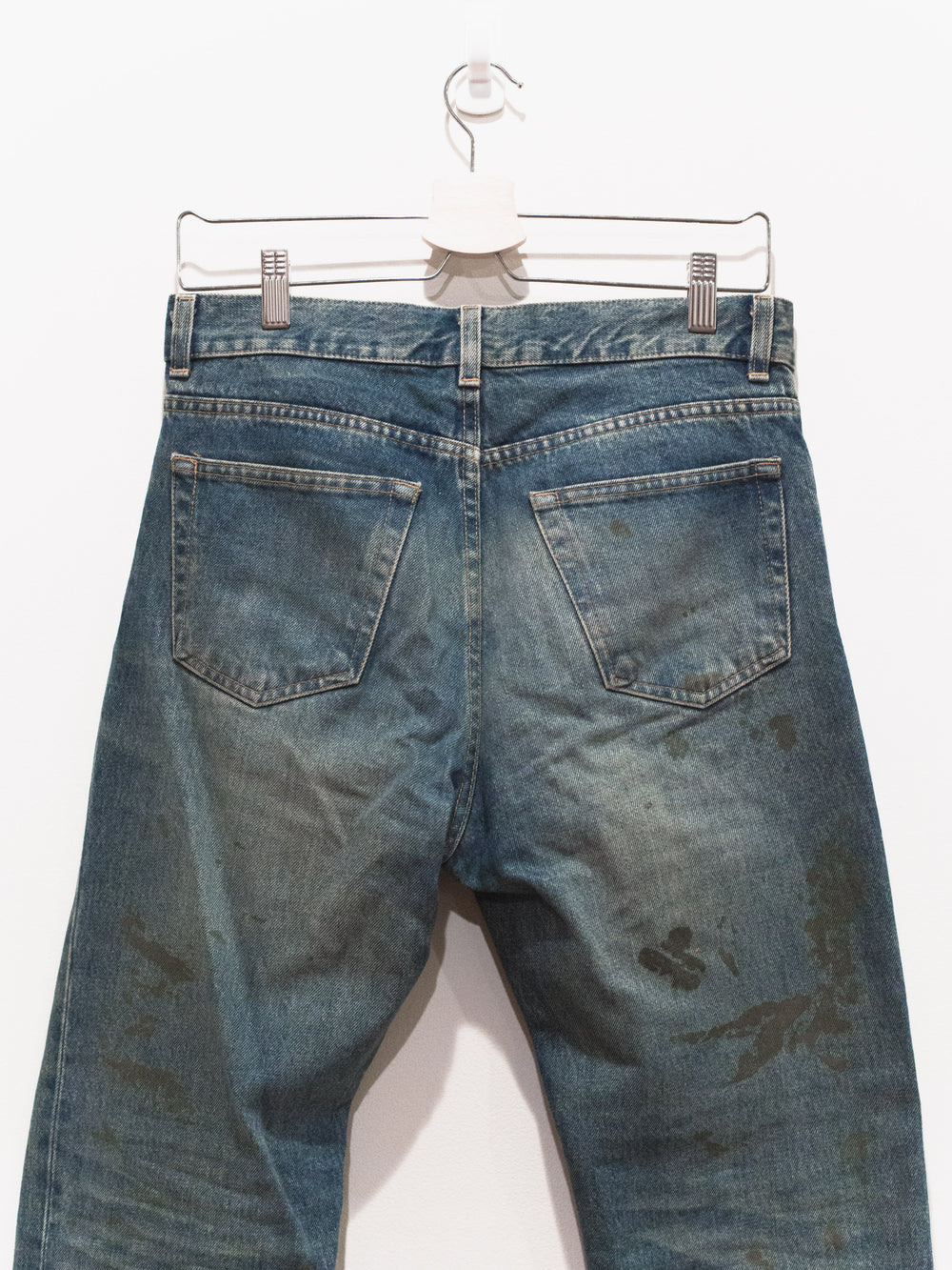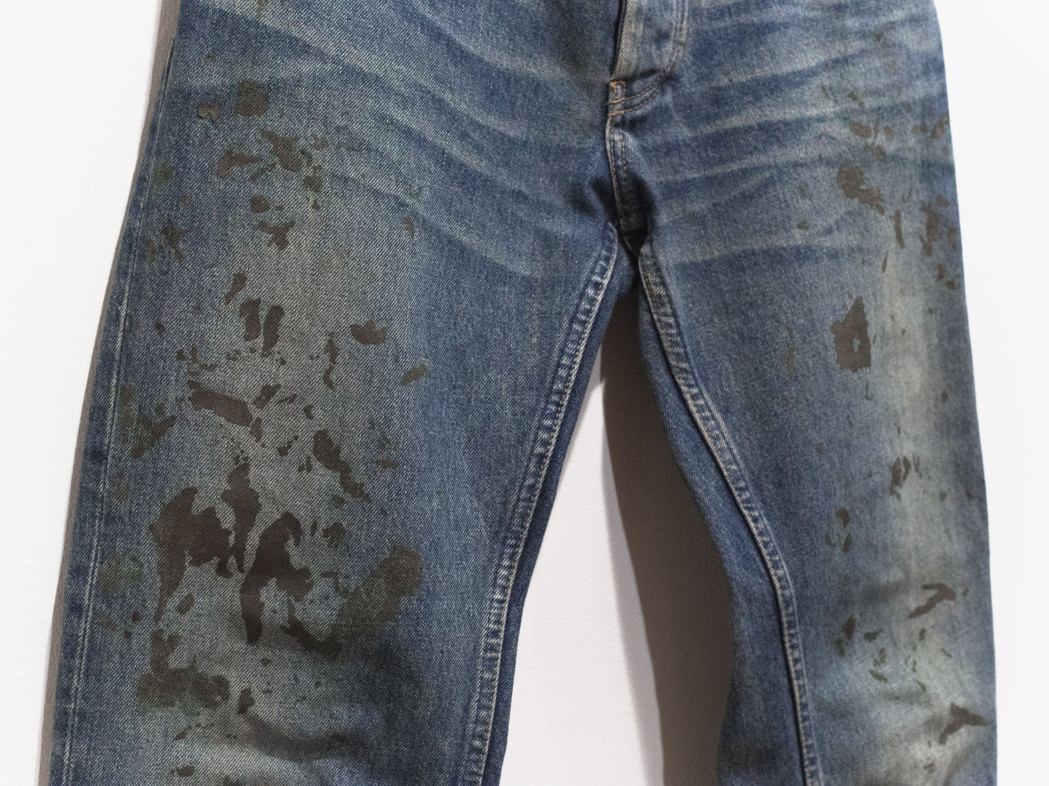 The classic Helmut denim from his time at the label. This pair features a darker treatment, with the gold paint echoing both glamour and simple, dirty mudstains.
