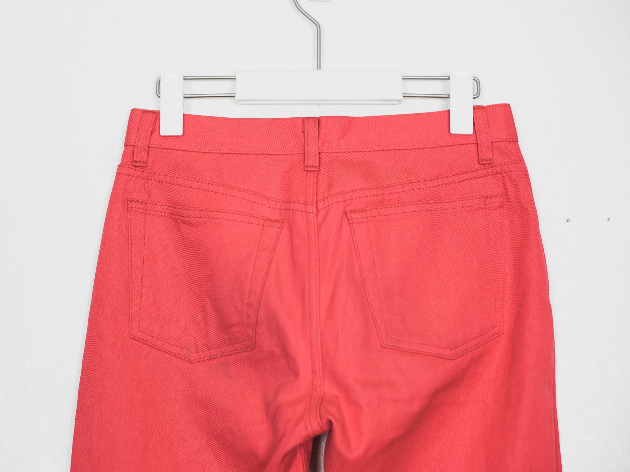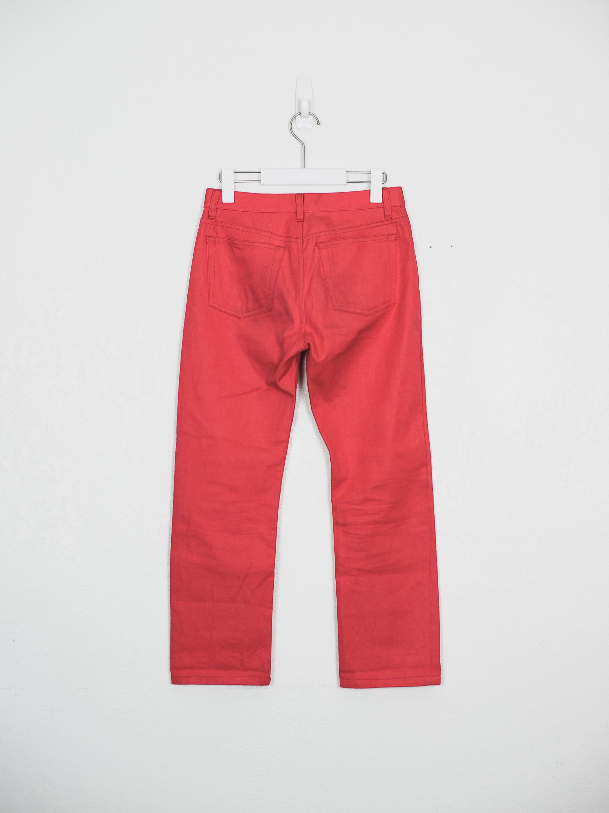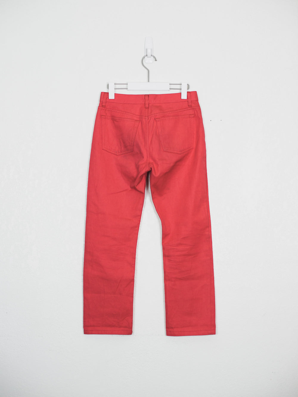 Another intensely clean interpretation from Helmut Lang. These jeans are constructed in a ridiculously smooth silk blend denim and an eye-catching bright red.