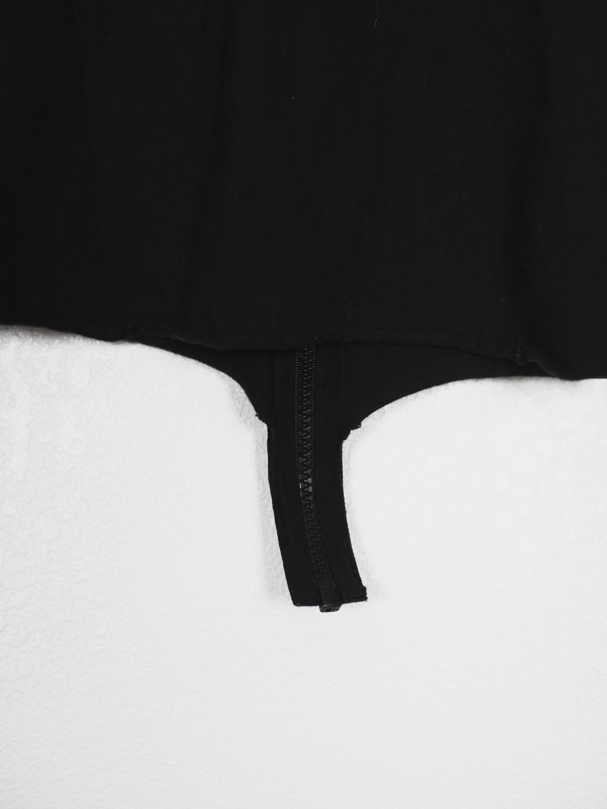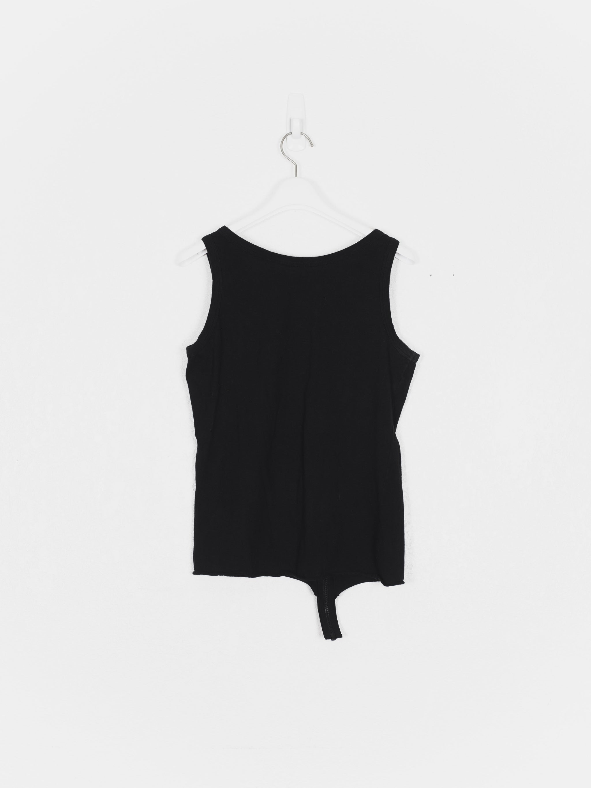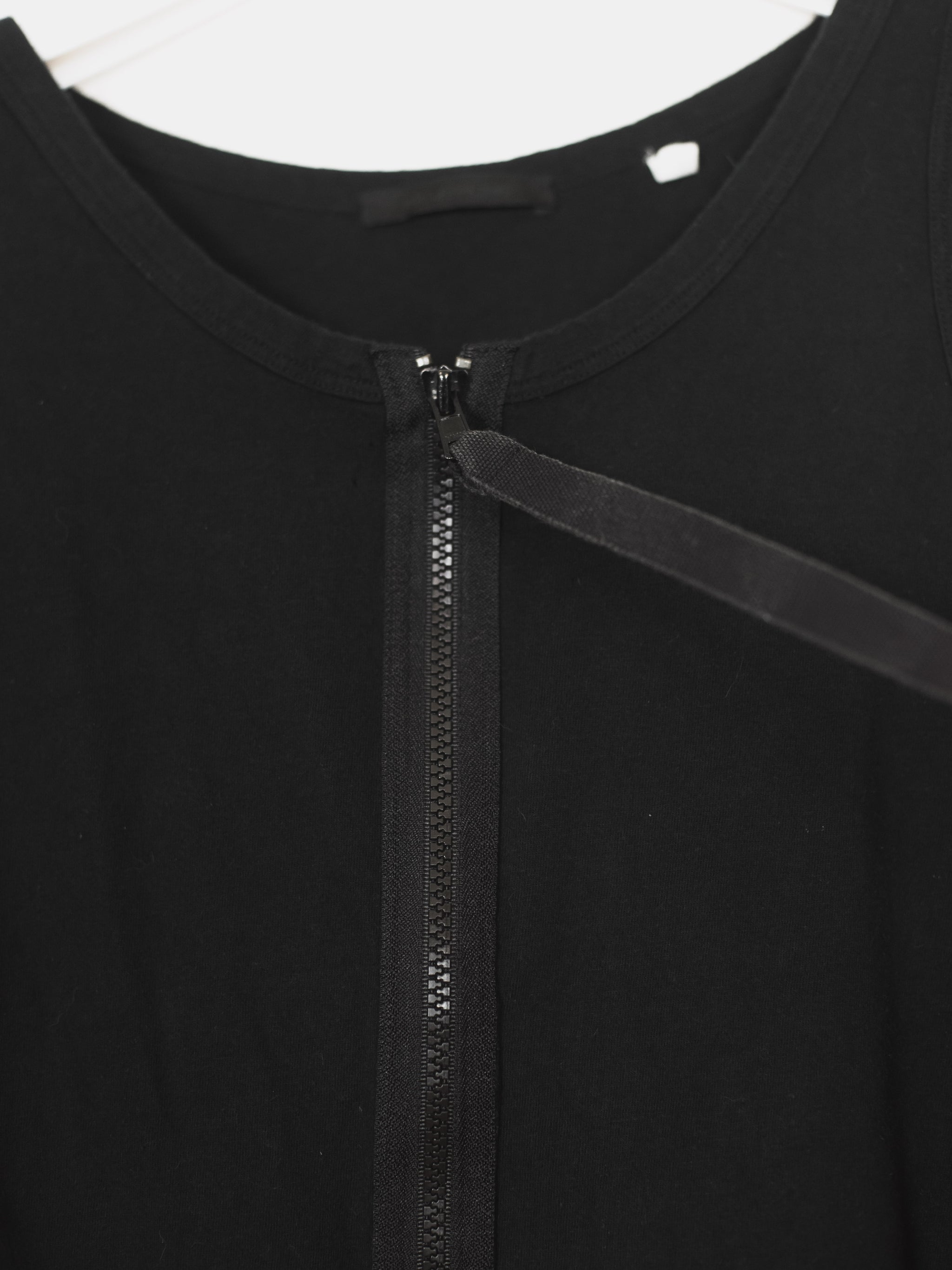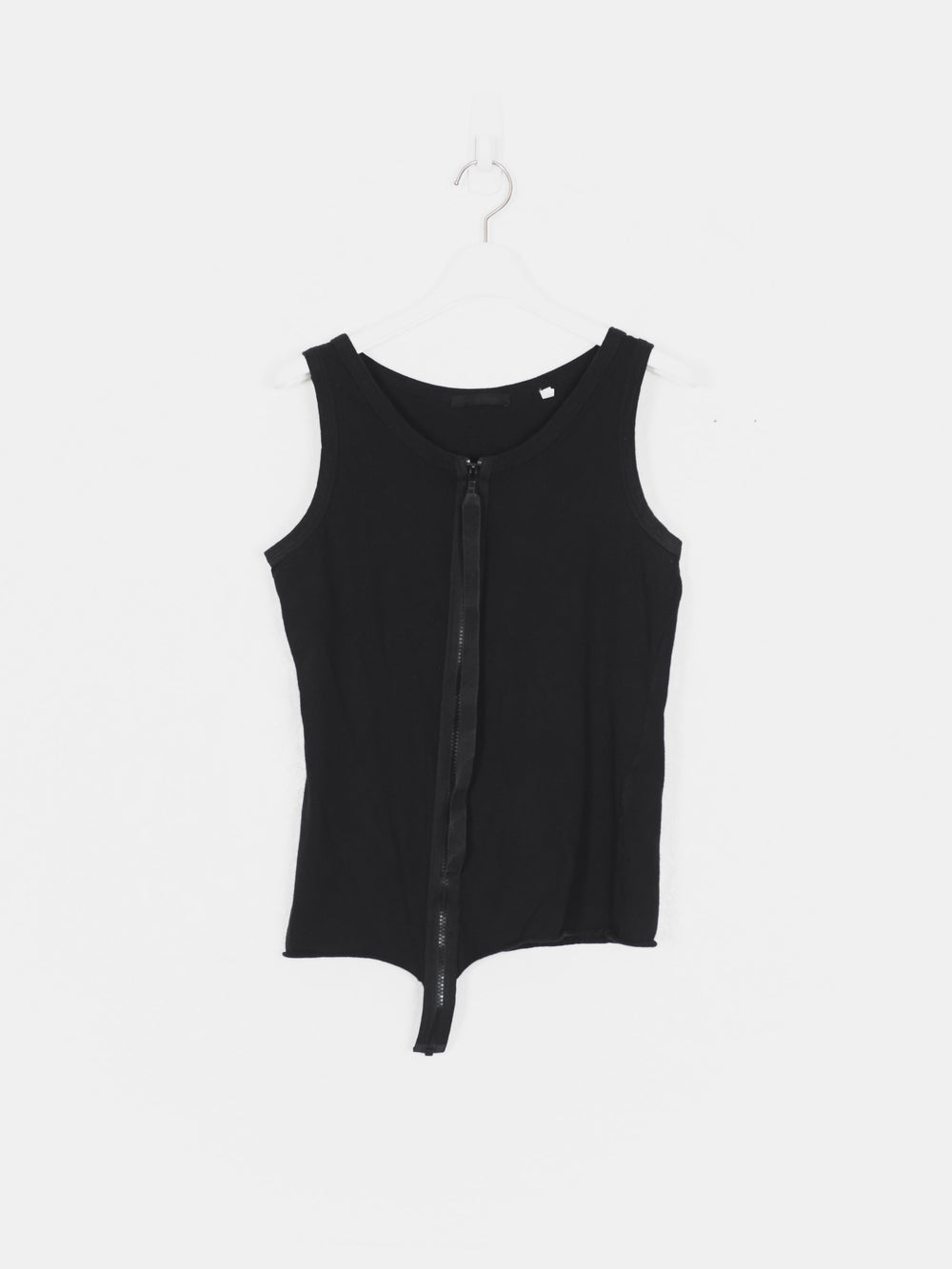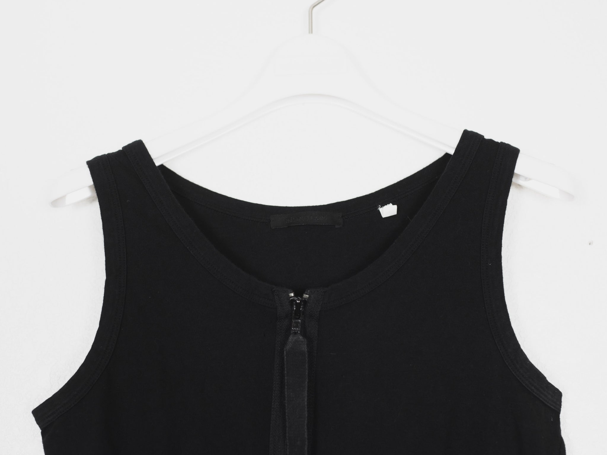 The extended zipper was a widely used motif throughout 2003 onwards, seen mostly on Helmut's iconic MA-1 bomber jackets. Used here, it transforms an otherwise basic tank top into a magnificent layering piece as seen on the runway, the camouflaged zipper hinting at something more without revealing.