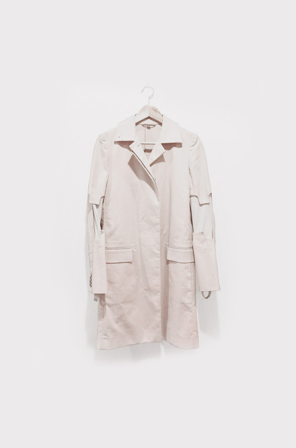 This coat is made of a 97% cotton 3% elastane blend with an almost woven texture. It's the sickest shade of light pink, with jersey inserts at the elbows, bondage hand straps, and seams that are finished with grosgrain-like piping. Button-closed single vent with an elegant hidden placket.