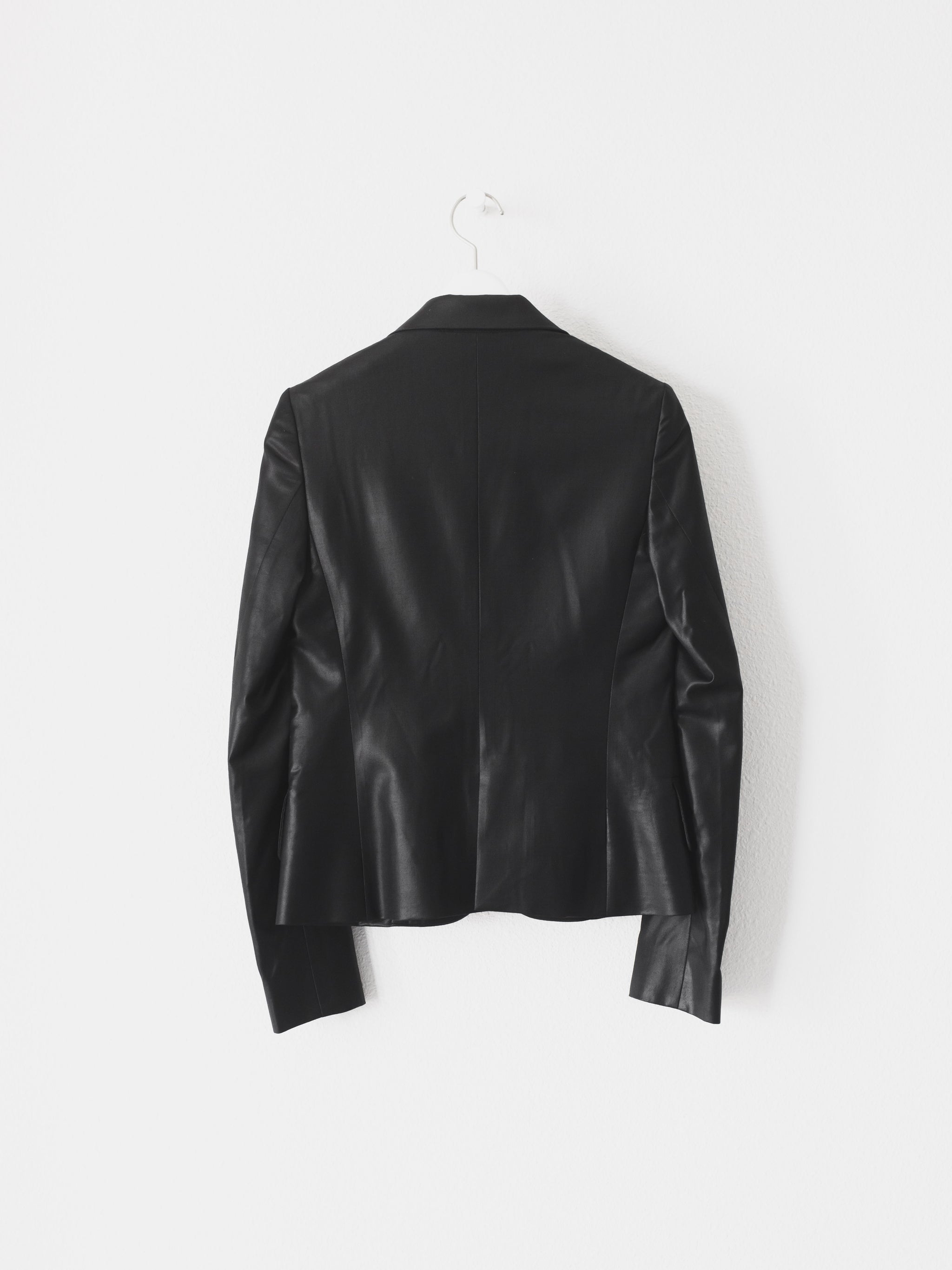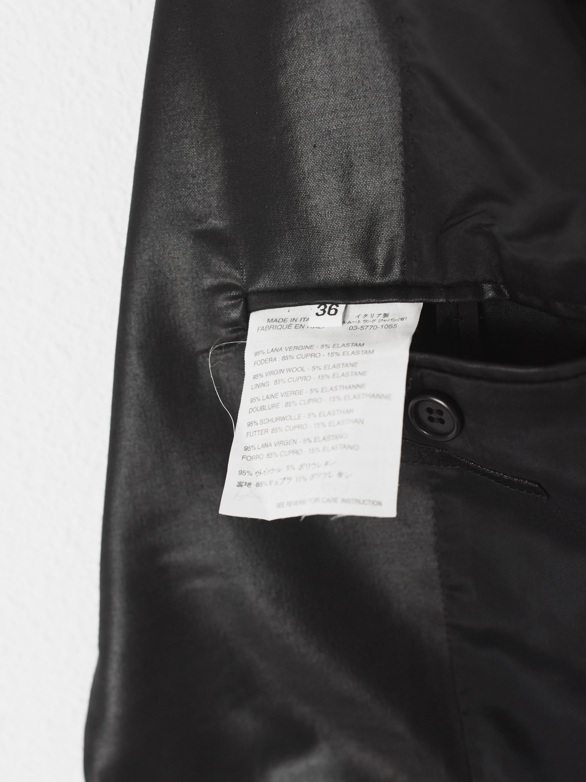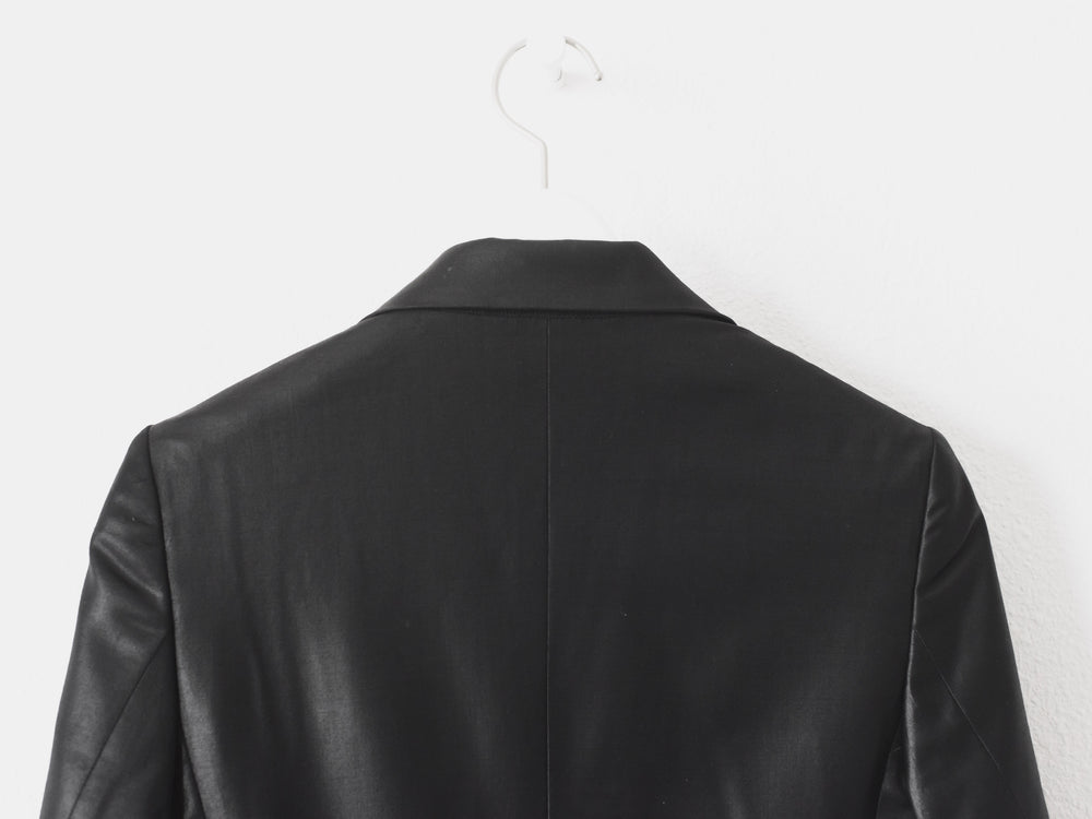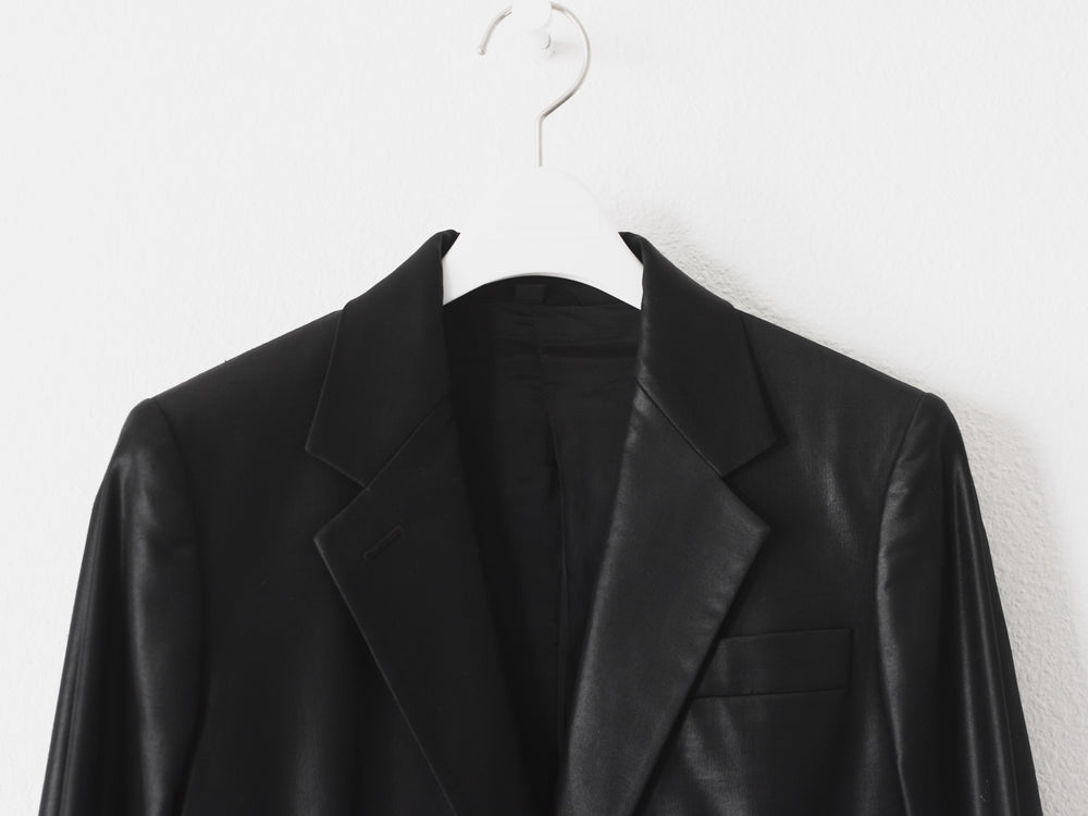 A perfect example of Helmut Lang's classic razor sharp tailoring with his use of unconventional materials. This hard to find matching set embodies the designer's meticulous attention to detail in craftsmanship and materials despite its minimal appearance devoid of unnecessary frills.