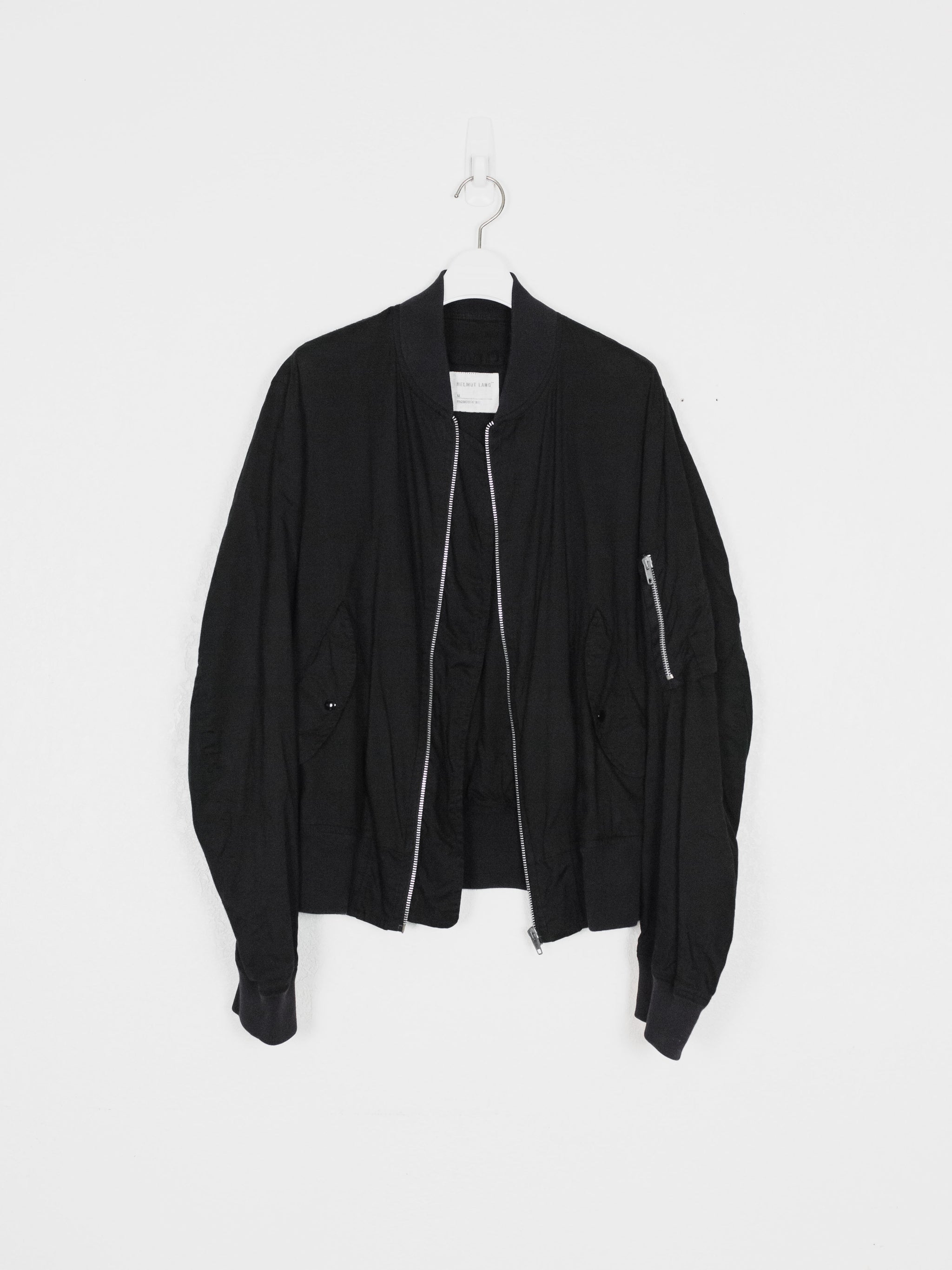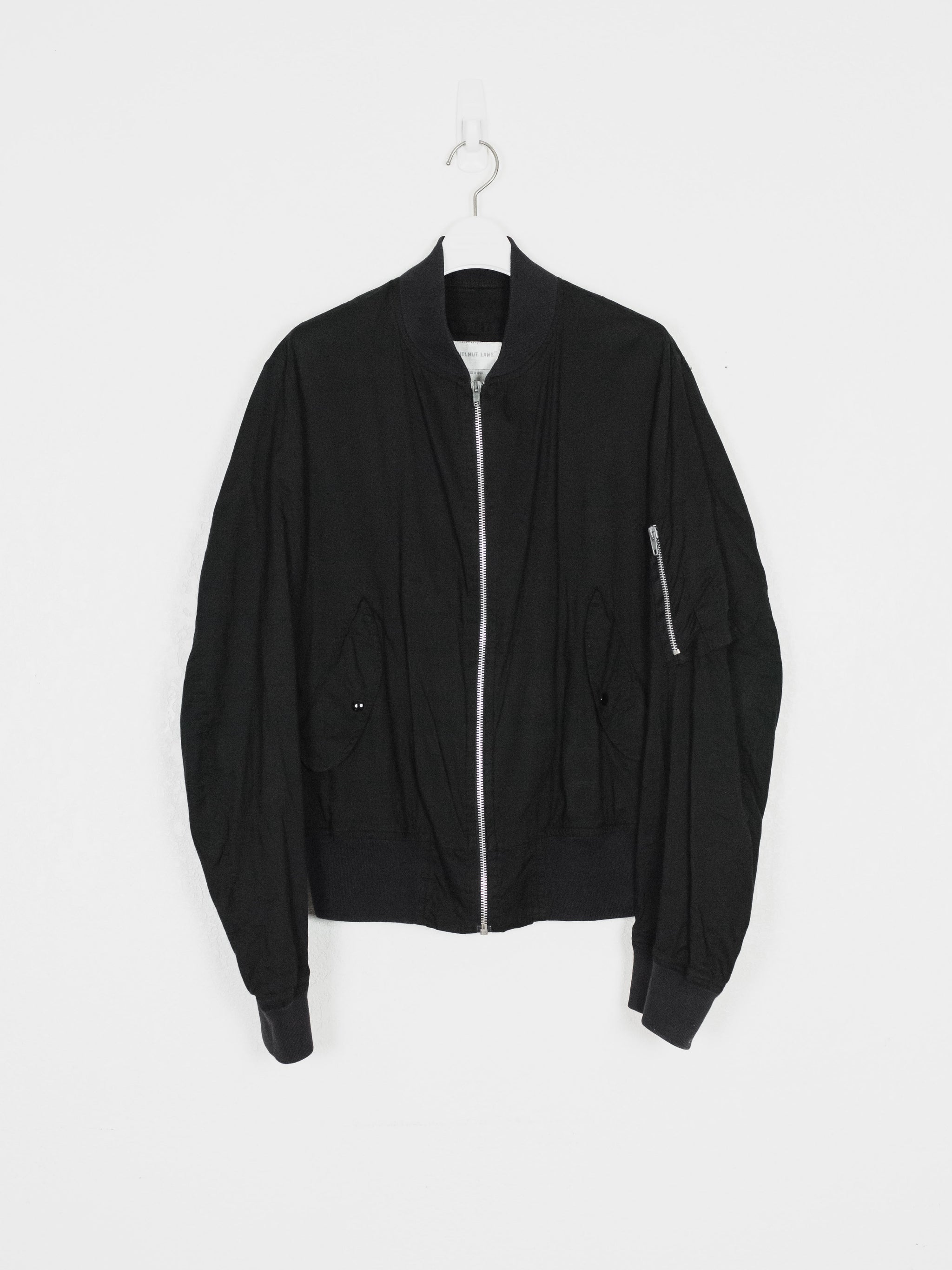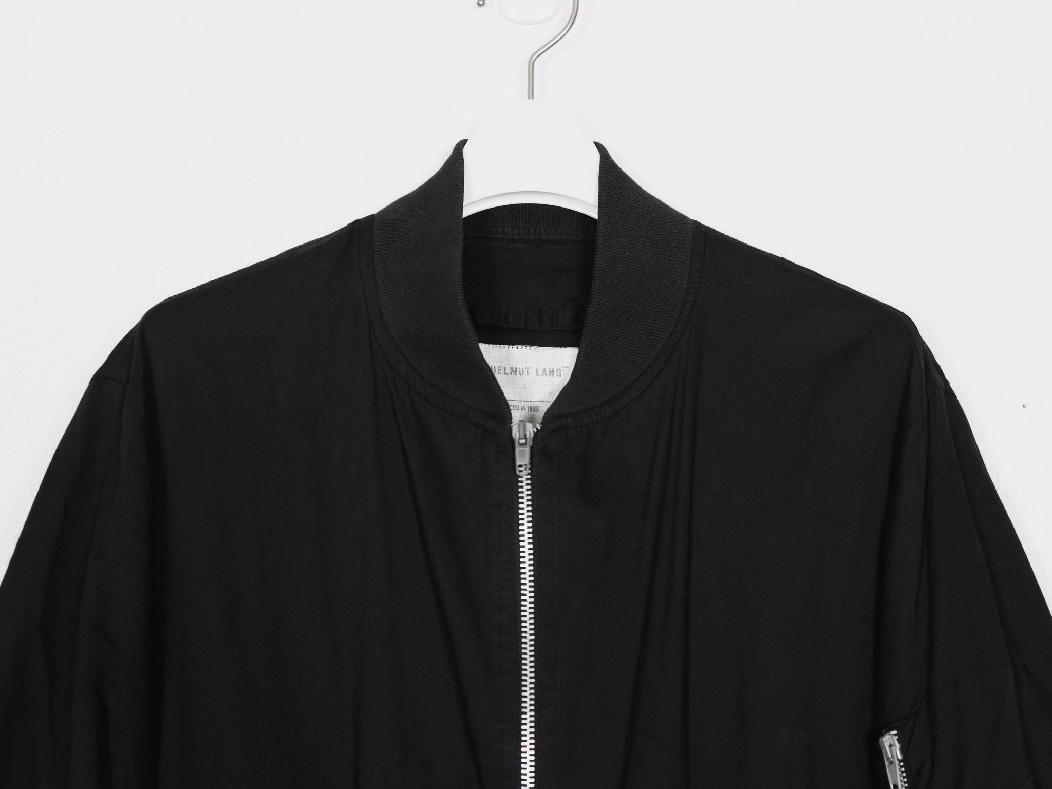 The ultimate classic MA-1 bomber, the standard of what every other should be modeled after. The jacket is a perfect oversized fit composed of a comfortably light cotton, containing every necessary detail; no more no less. The perfectly shaped windflap, pocket flaps, tight-knit ribbing, and spacious interior pockets show off the mastery of Helmut Lang's tailoring and ethos in his minimalistic military adaptations.