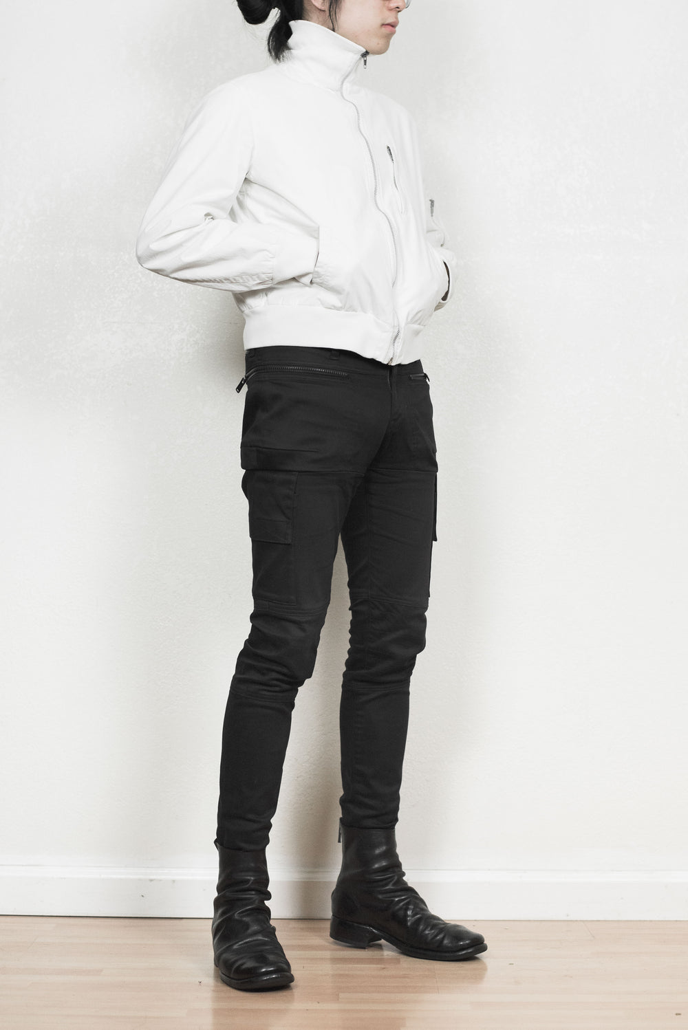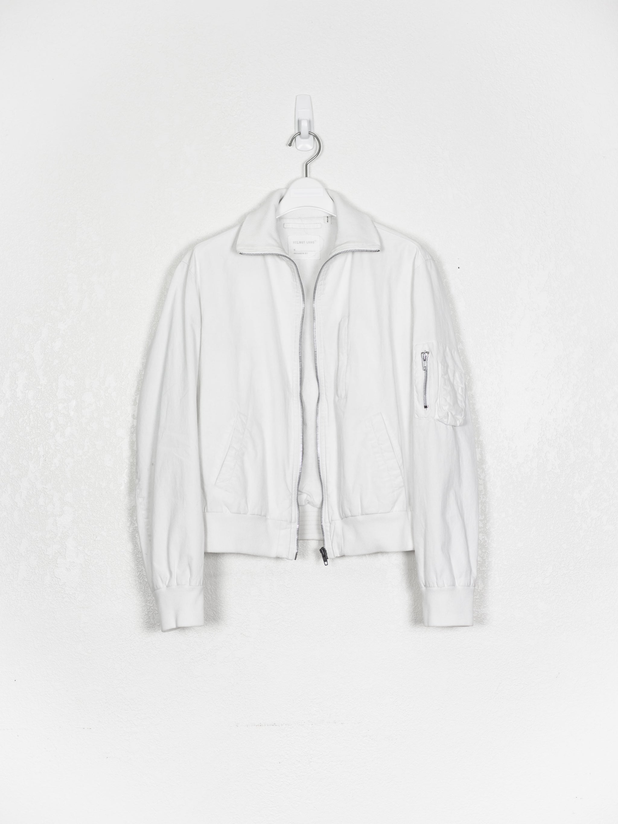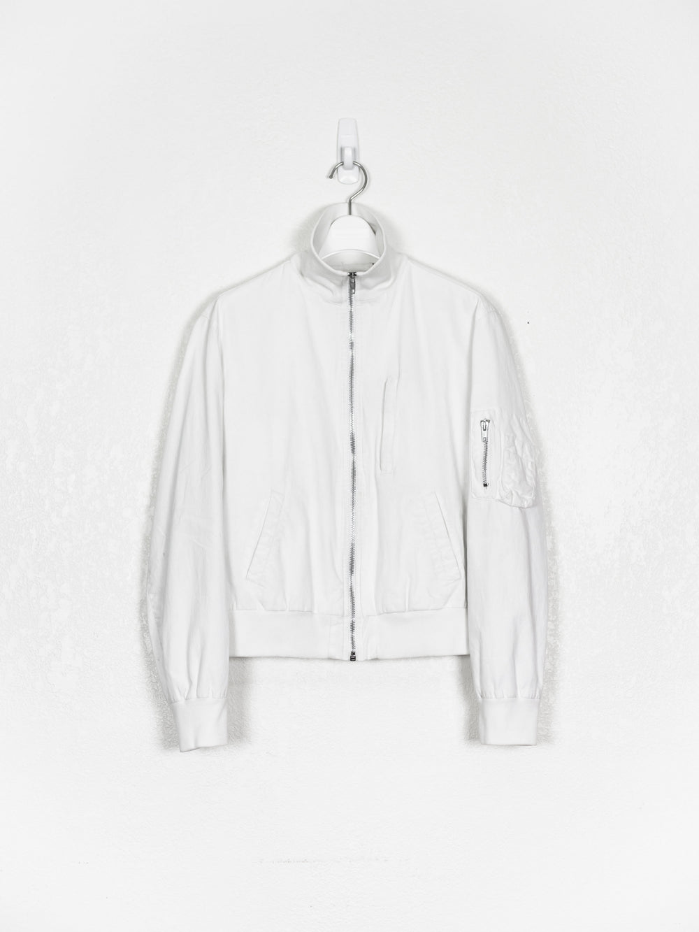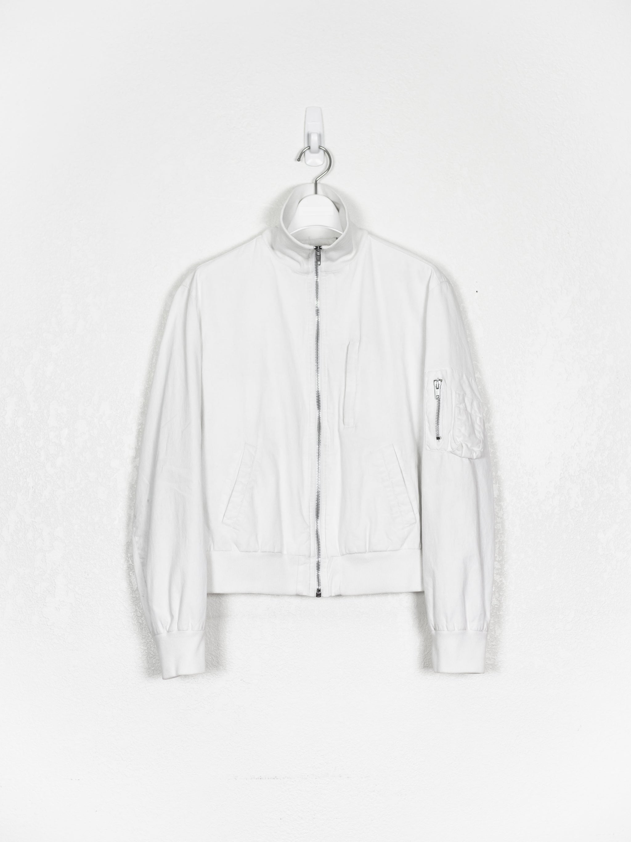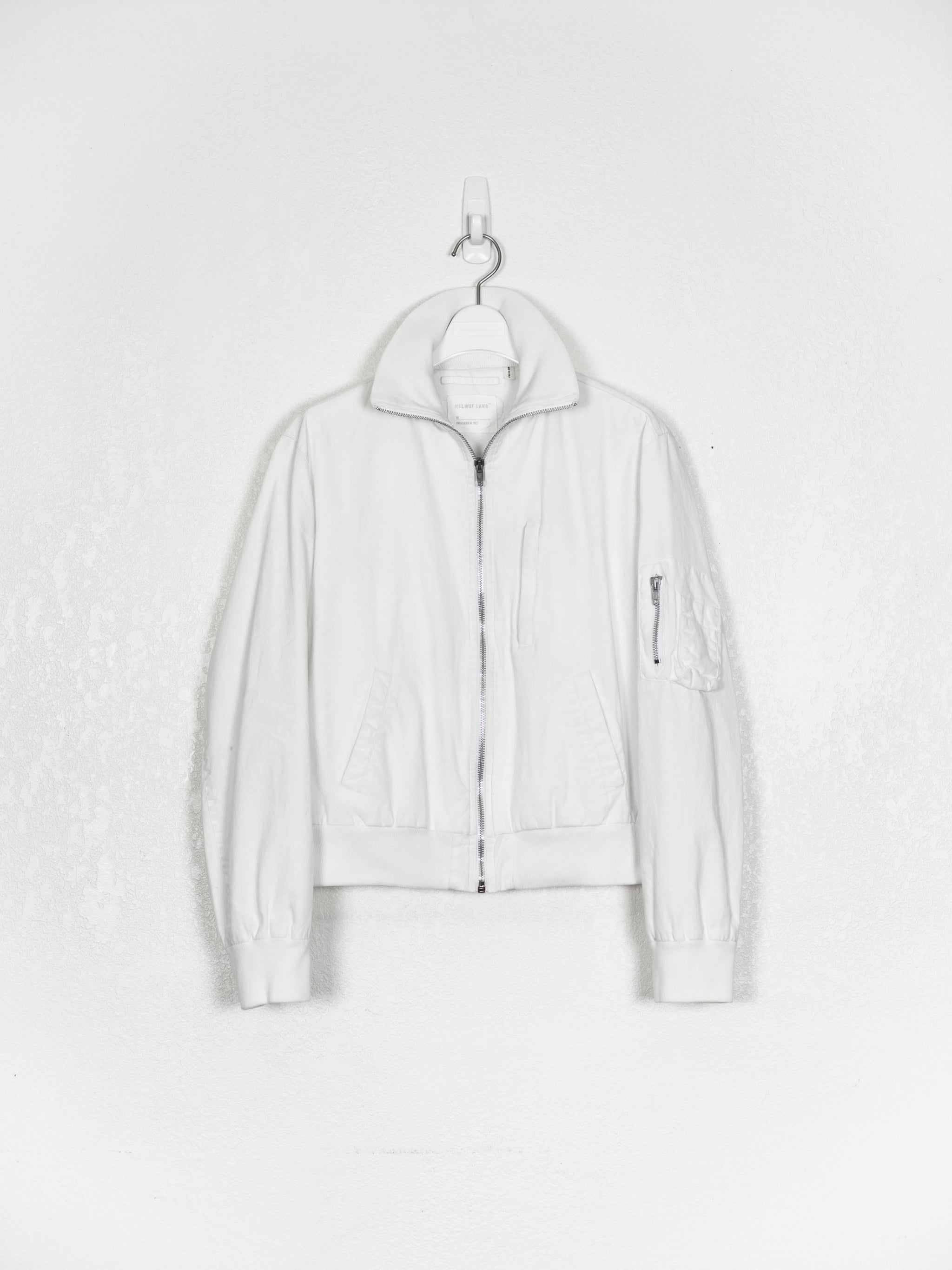 Bomber jackets have acquired 'grail' status among Lang cognoscenti, including collectors such as The Metropolitan Museum of Art's Costume Institute. This beautiful all-white version has a streamlined design inspired by German Air Force (Luftwaffe) bomber jackets. The front has a zipper closure that leads up to an aggressive funnel neck. The neckline, waistband and cuffs are finished with crisp ribbed cotton knit. A vertical zipped pocket on the left side of the torso (one of the original military design's most distinctive features) adds simple detail. Likewise, the left sleeve is finished with a classic MA-1-style patch pocket. The cut is defined by trim shoulders and a slightly tapered body that finishes at the waist.