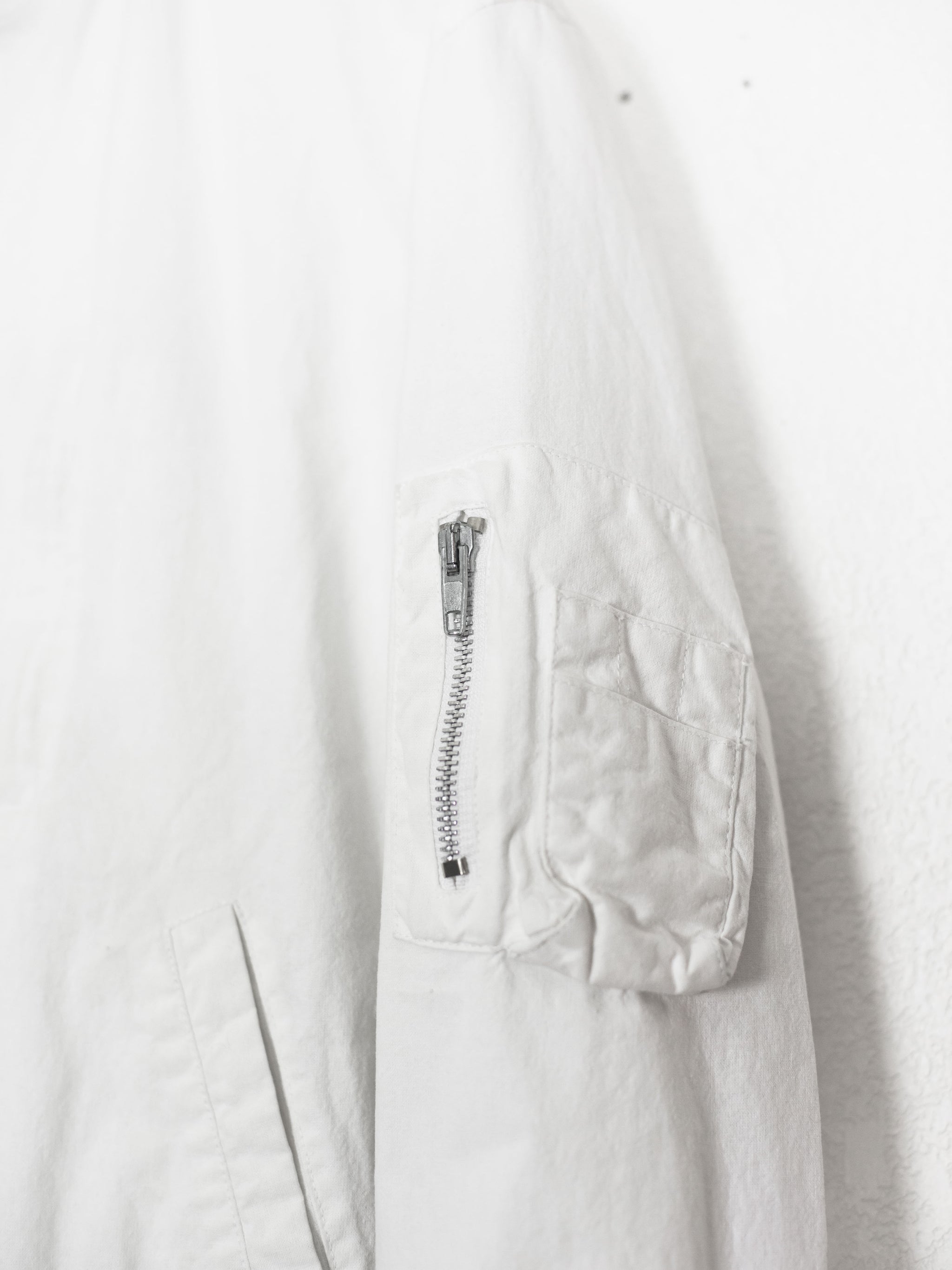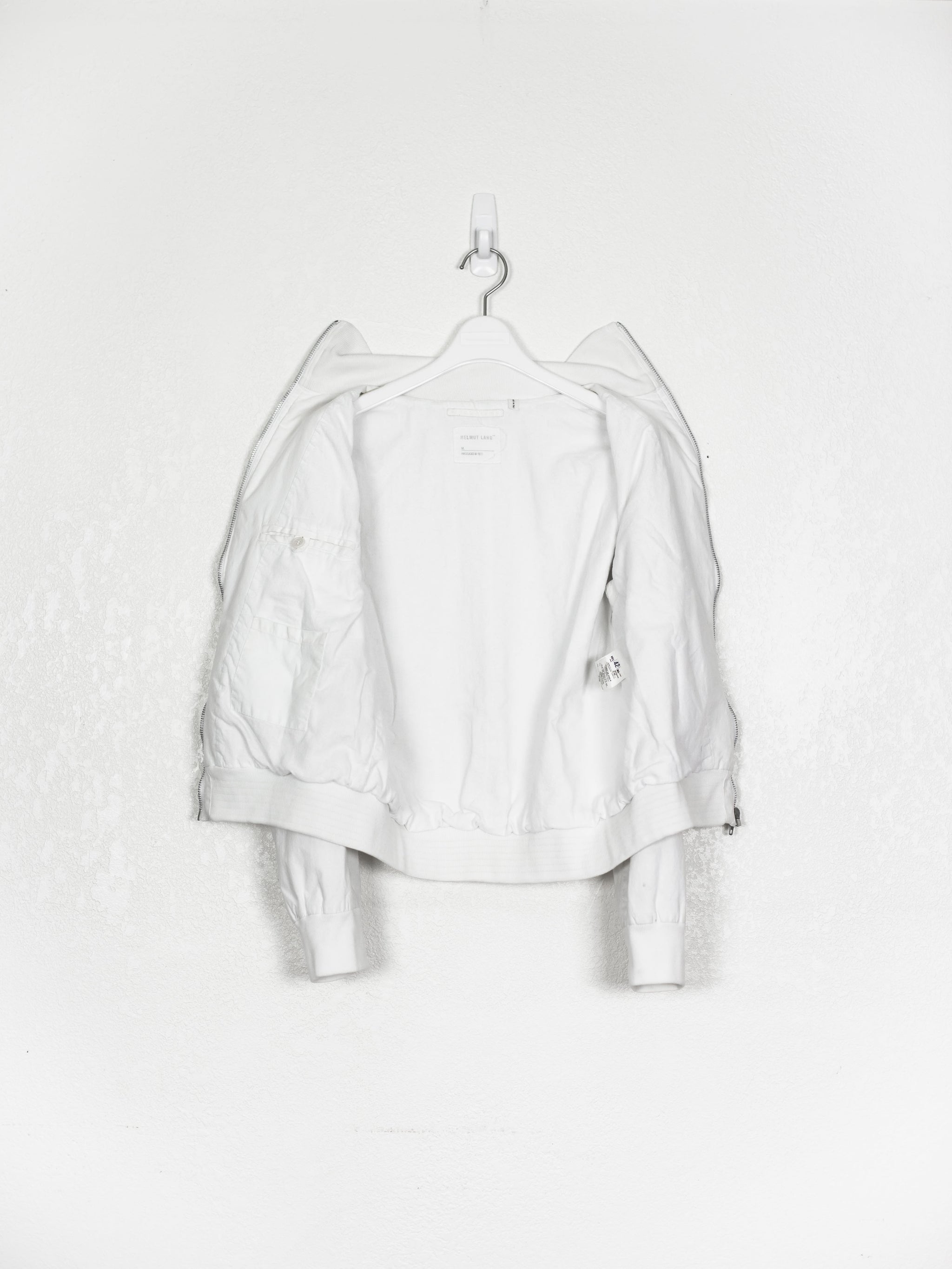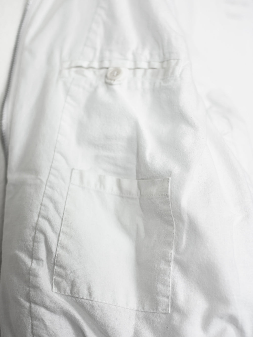 The piece is crafted from cotton canvas that has been overdyed, washed and resin-coated. These processes give a vintage texture to the medium-weight fabric, while maintaining a brilliant white colour. The detailing of this piece demonstrates Lang's thoughtful attention to detail: theunderarms feature curvilinear panels with ventilation slits. The knit trims on the cuffs and waist have reinforced horizontal stitches on their interior side for increased durability. The interior is fully lined with brushed cotton on the body, soft viscose/acetate sateen on the sleeves and is finished with a buttoned pocket and a military-style square patch pocket.