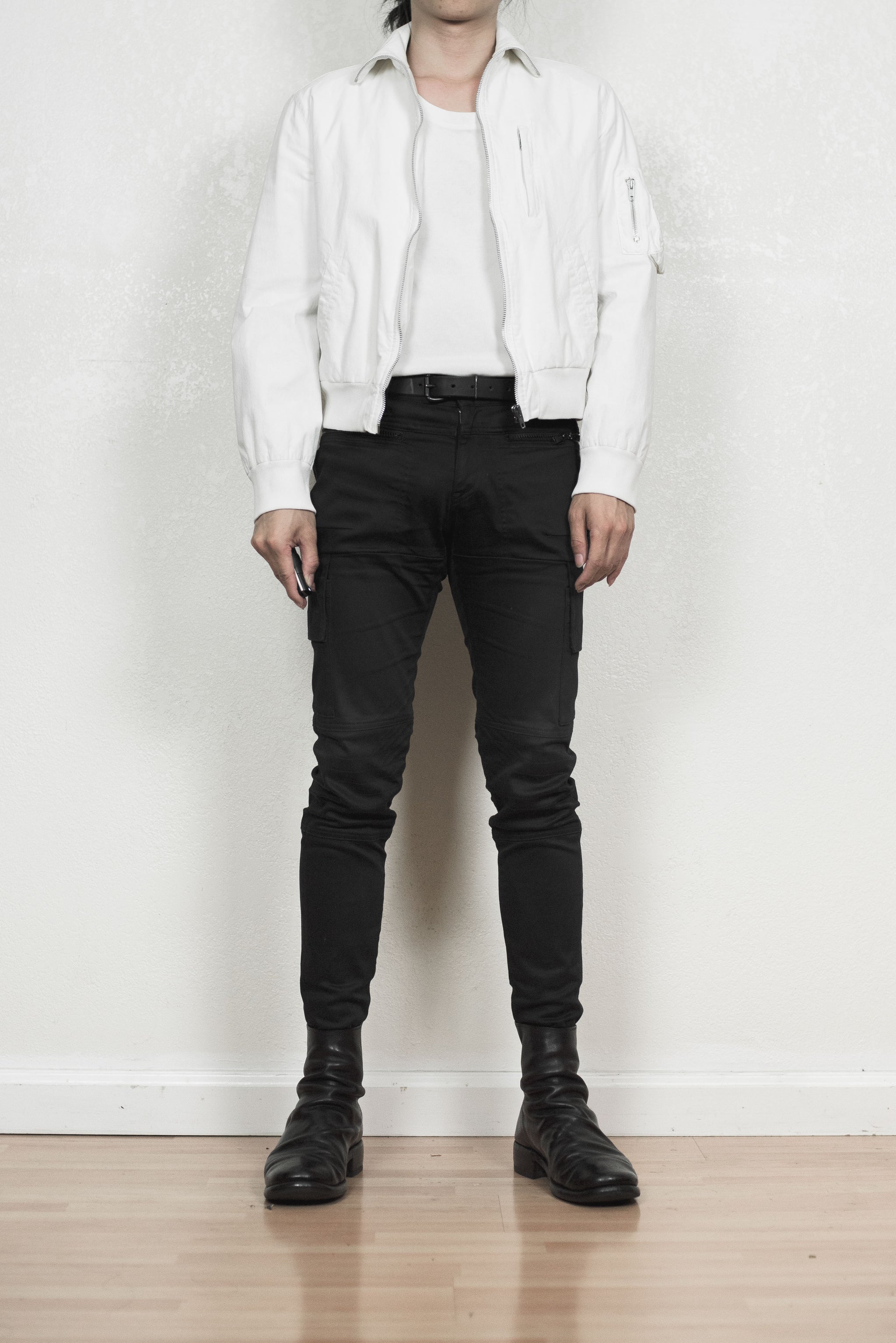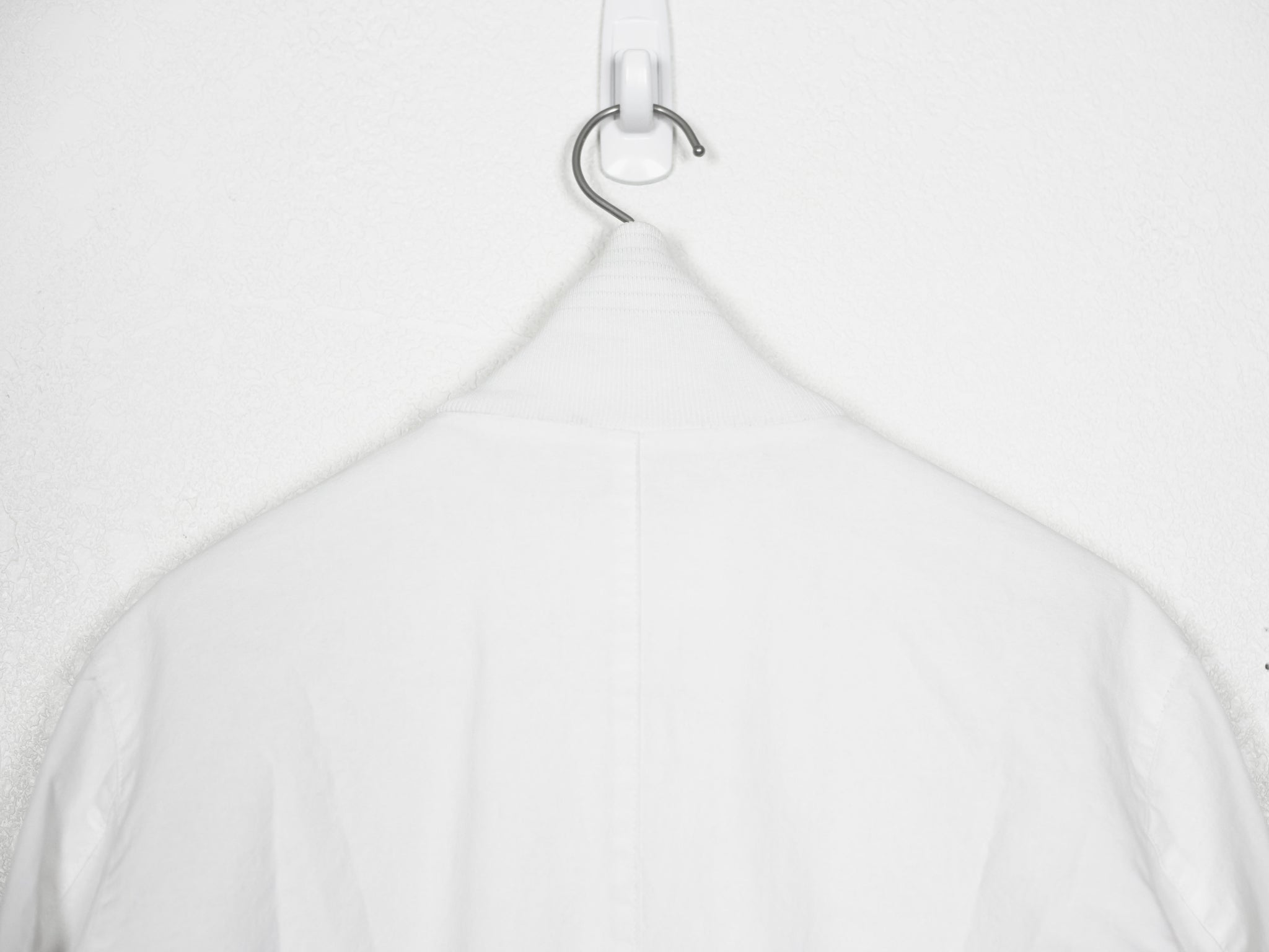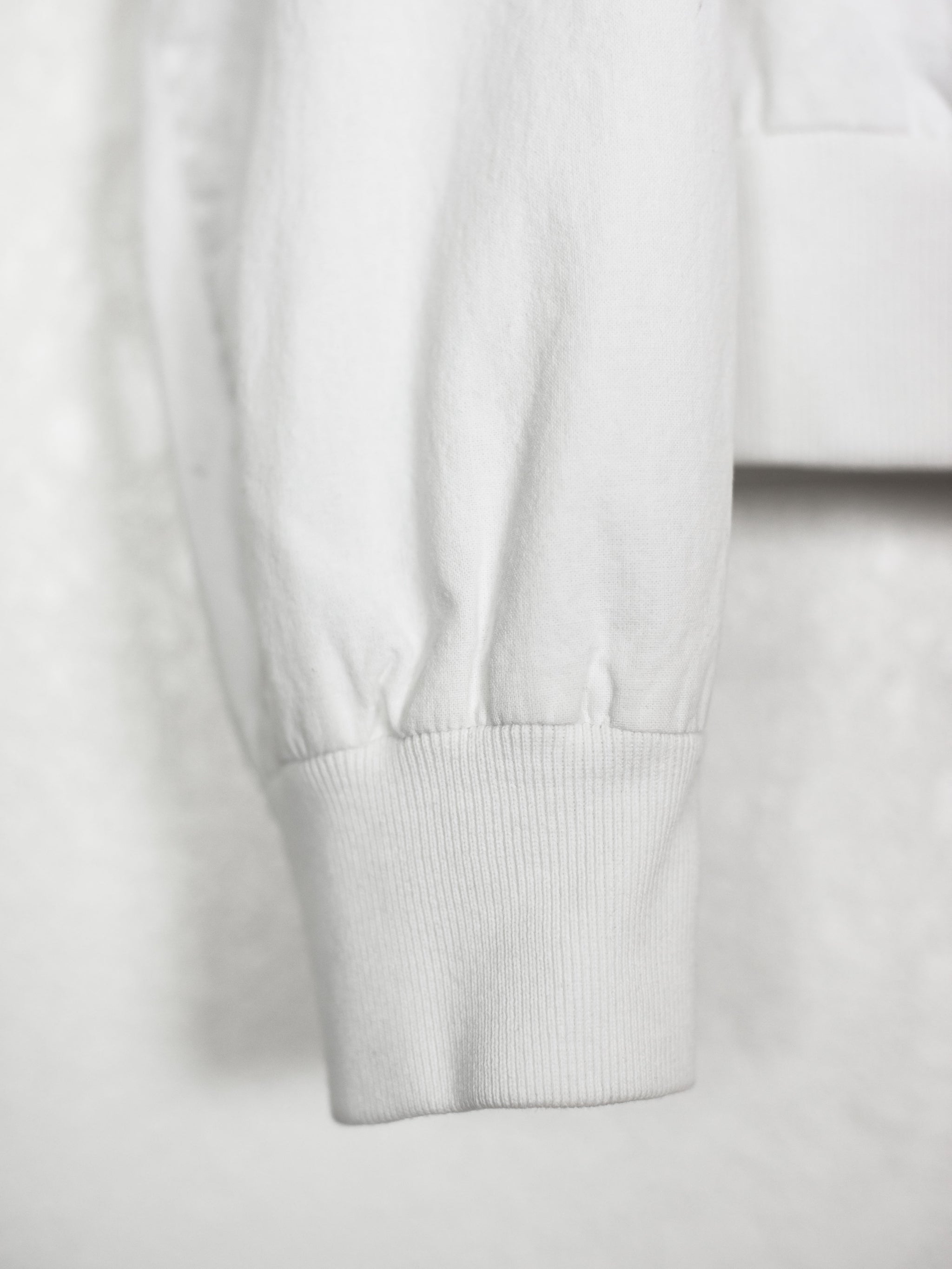 The piece is crafted from cotton canvas that has been overdyed, washed and resin-coated. These processes give a vintage texture to the medium-weight fabric, while maintaining a brilliant white colour. The detailing of this piece demonstrates Lang's thoughtful attention to detail: theunderarms feature curvilinear panels with ventilation slits. The knit trims on the cuffs and waist have reinforced horizontal stitches on their interior side for increased durability. The interior is fully lined with brushed cotton on the body, soft viscose/acetate sateen on the sleeves and is finished with a buttoned pocket and a military-style square patch pocket.
