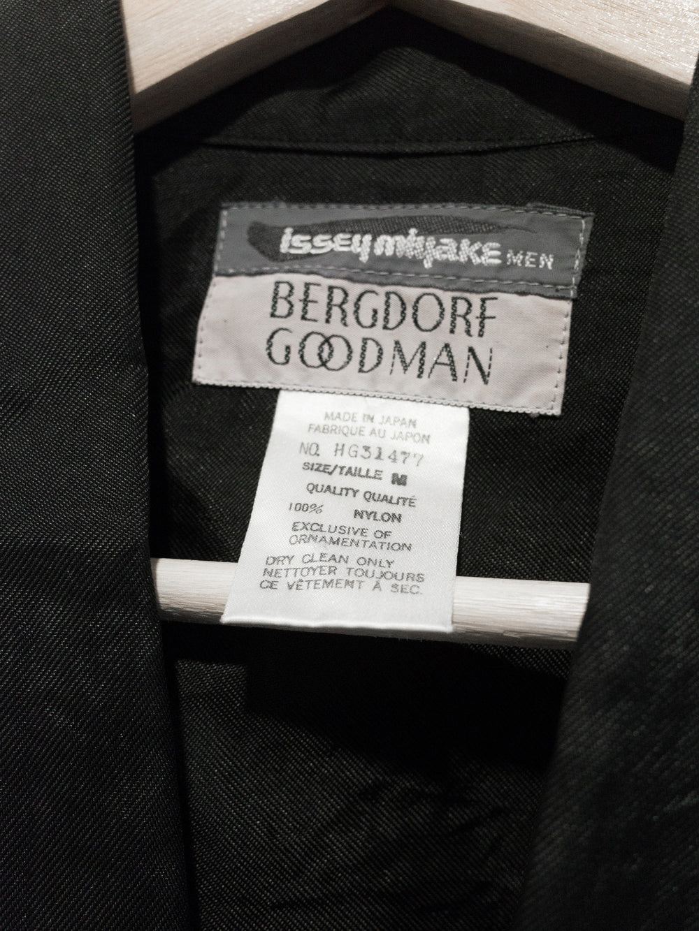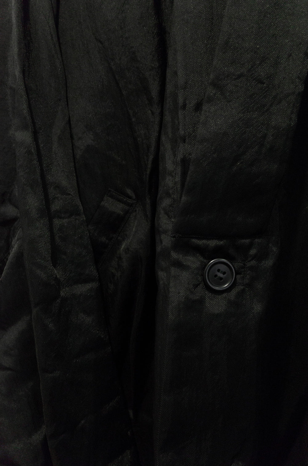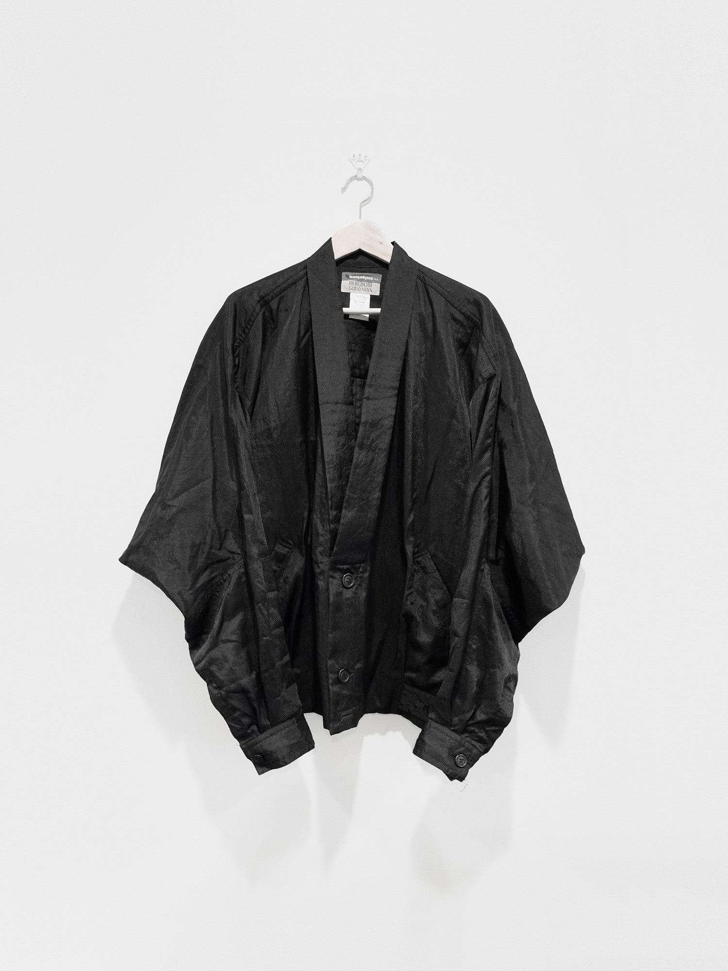 Made as a Bergdorf Goodman exclusive item, this vintage Kimono Blazer by Issey Miyake is a reinterpretation of the traditional kimono form. It utilizes the Kimono’s casual banded shawl collar, relaxed body, and wide sleeves but places the button stance lower on the waist, utilizes a smooth 100% nylon with a beautiful sheen and sculpts the sleeves using an elaborate pattern of darting and articulation so that they have a 3-dimensional winged form. Both while standing and in motion, the piece retains a structured and voluminous shape that seems to envelop the body in its presence. The articulation also lends to complete freedom of movement of the arms. It’s amazing how little you feel the fabric around you.