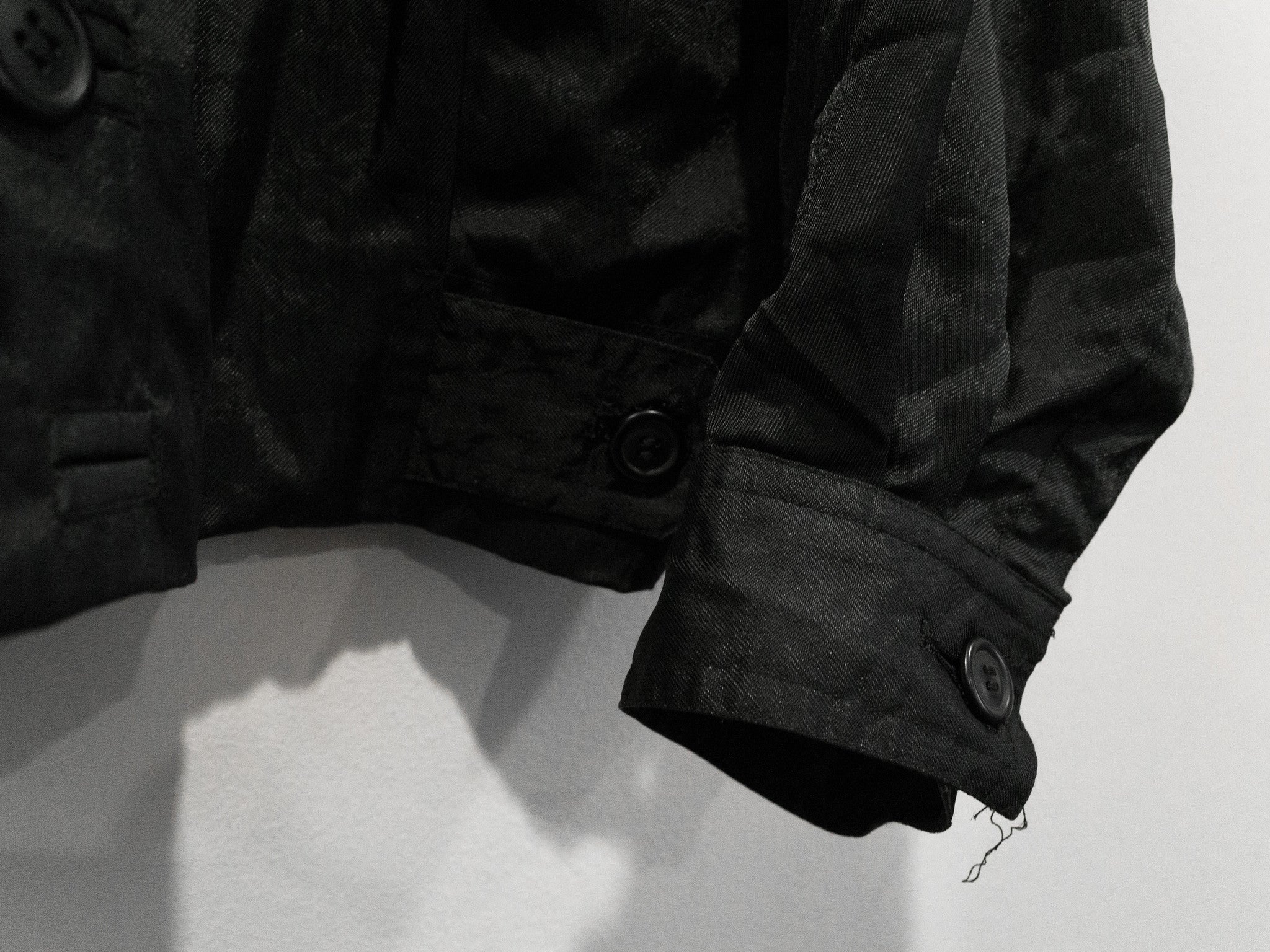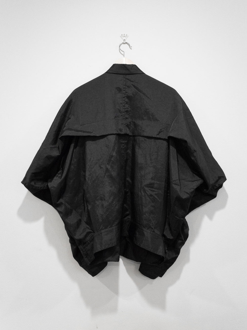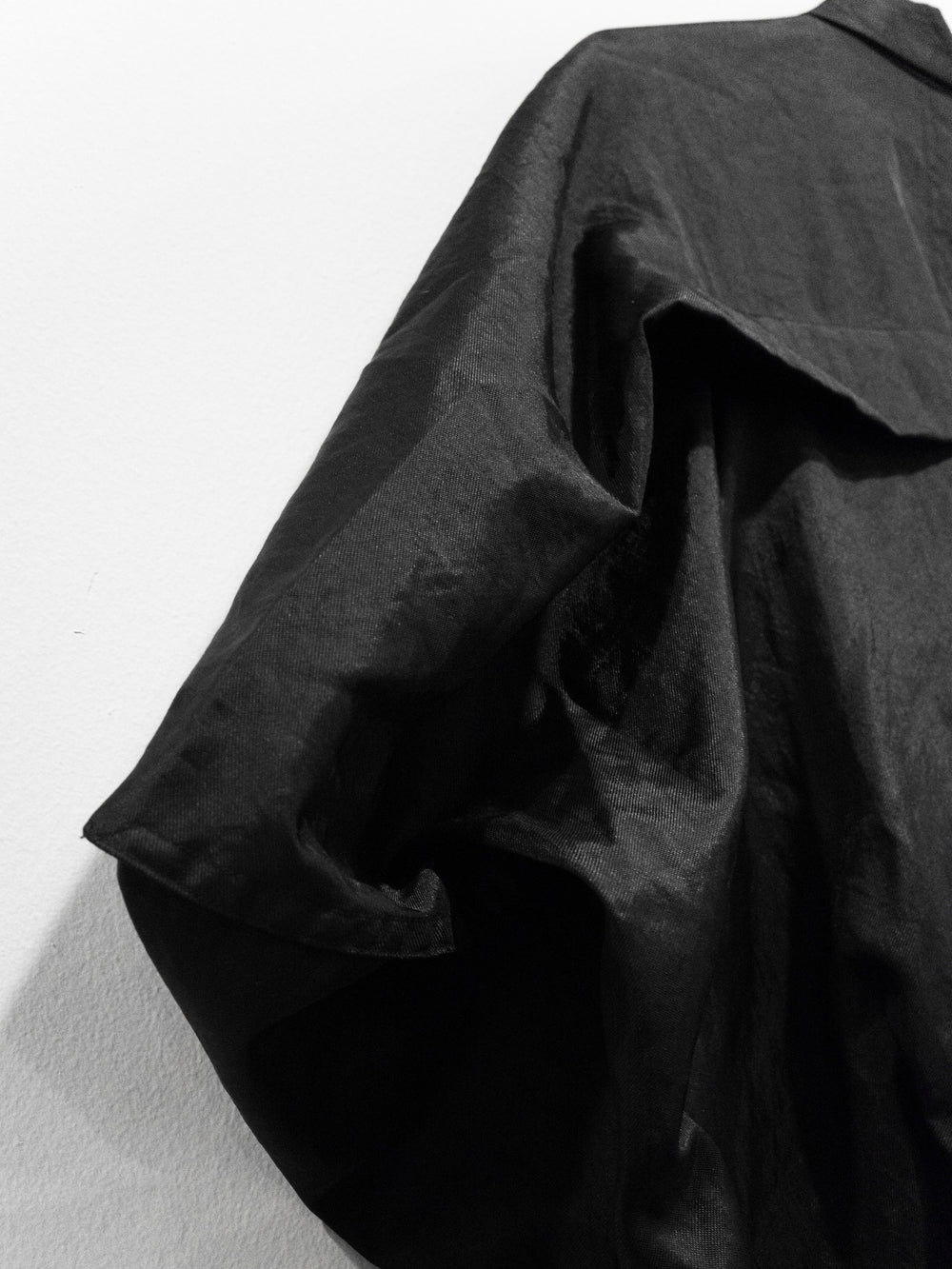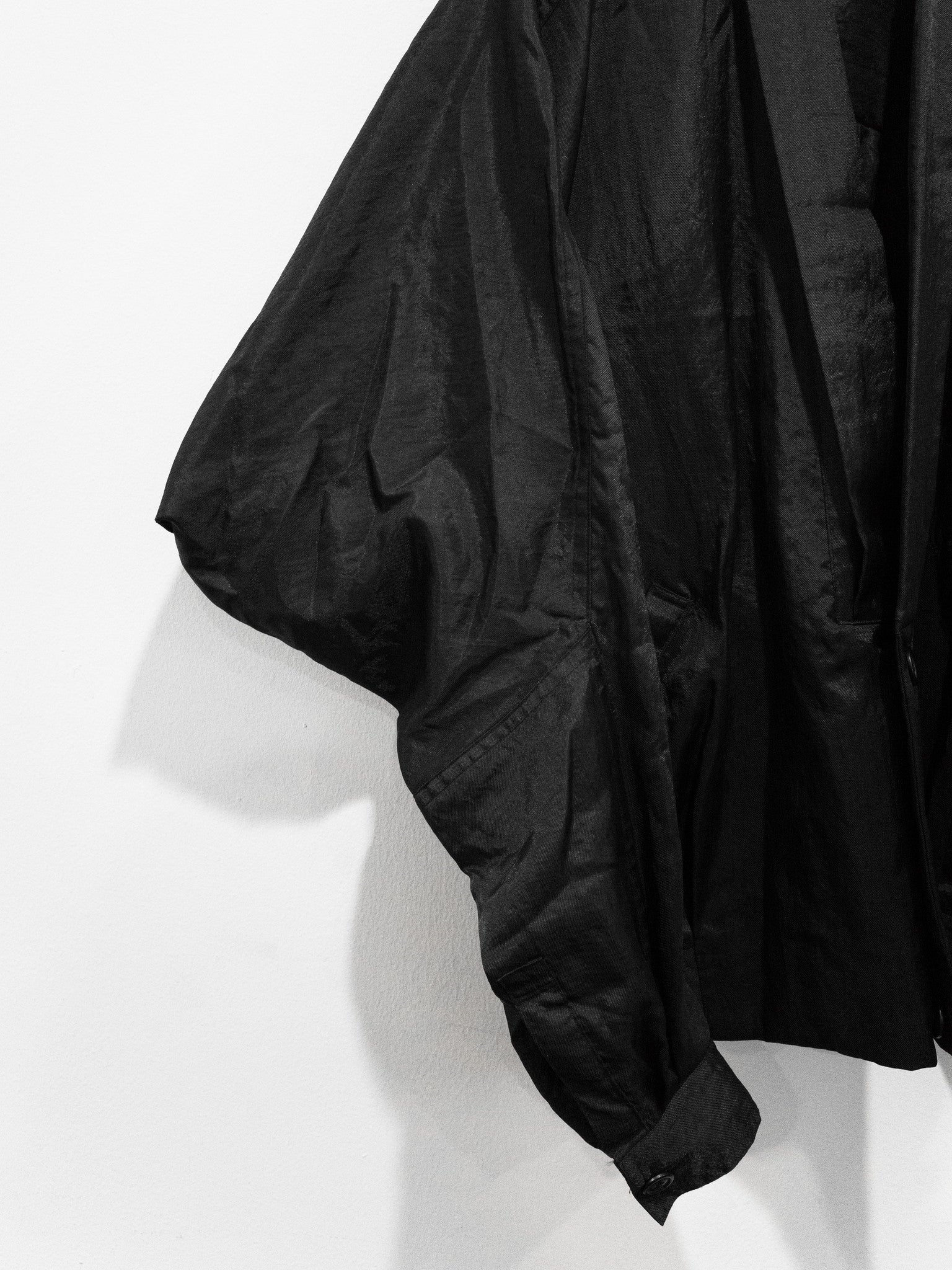 Made as a Bergdorf Goodman exclusive item, this vintage Kimono Blazer by Issey Miyake is a reinterpretation of the traditional kimono form. It utilizes the Kimono’s casual banded shawl collar, relaxed body, and wide sleeves but places the button stance lower on the waist, utilizes a smooth 100% nylon with a beautiful sheen and sculpts the sleeves using an elaborate pattern of darting and articulation so that they have a 3-dimensional winged form. Both while standing and in motion, the piece retains a structured and voluminous shape that seems to envelop the body in its presence. The articulation also lends to complete freedom of movement of the arms. It’s amazing how little you feel the fabric around you.