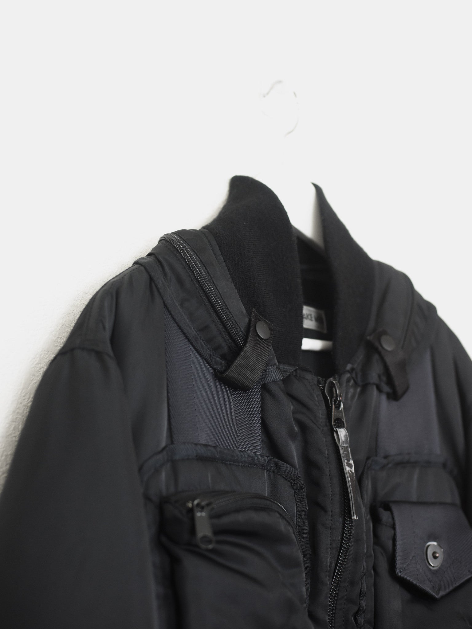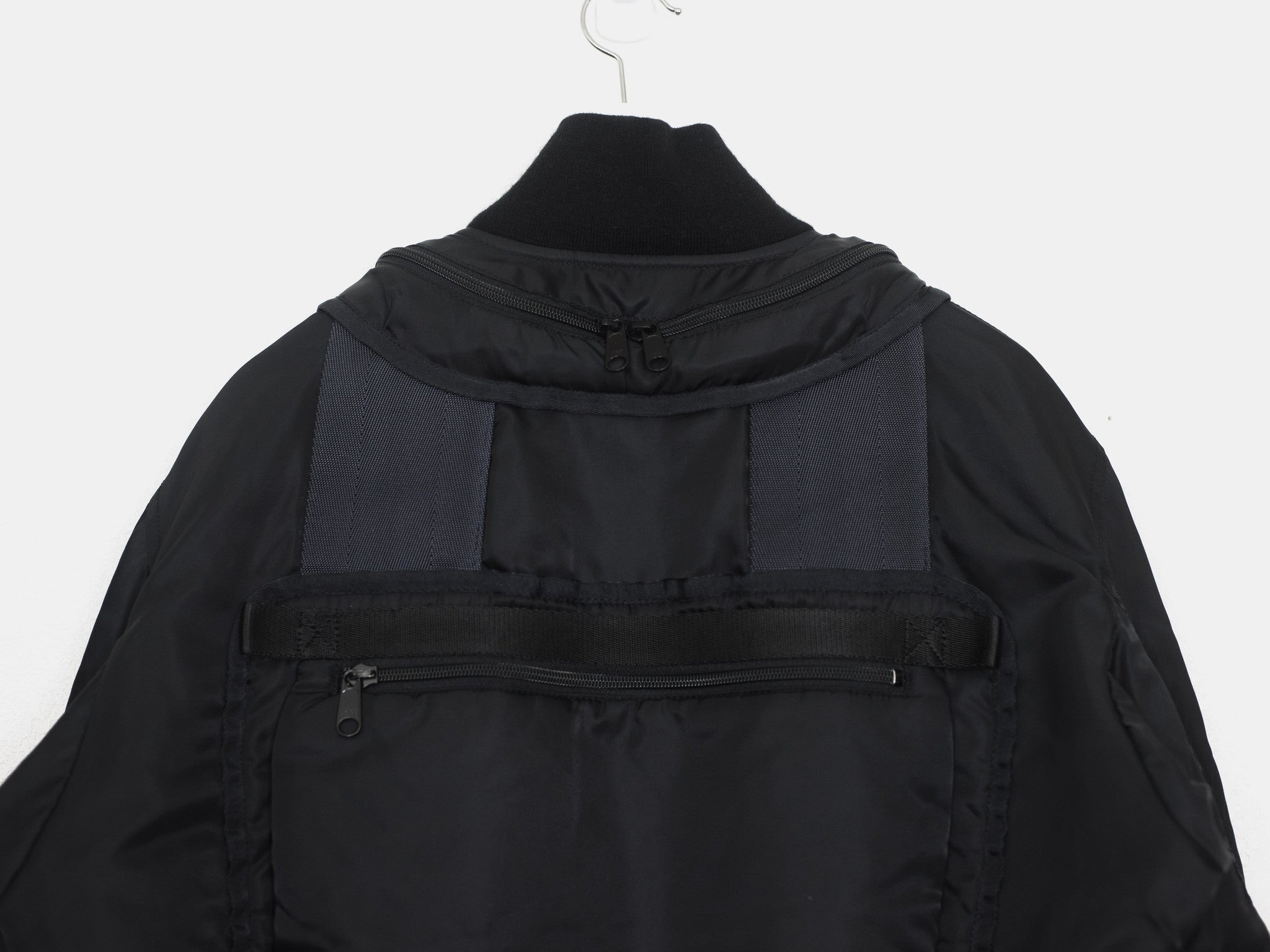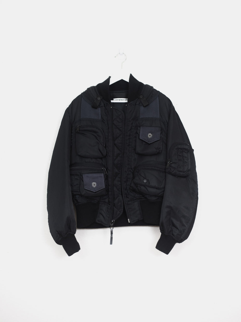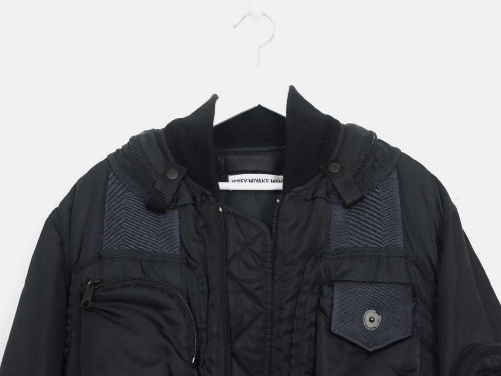 Incredible piece from Issey Miyake Men AW1996 kept in near new condition with heavy military influences and many utilitarian features. Constructed with a flattering oversized silhouette. Details include numerous cargo pockets and a large back pouch able to fit a notebook, a concealable hood, webbed strap detailing, two internal pockets, padded lining, and all the typical MA-1 details such as the sleeve pocket, windflap, and tightly ribbed cuffs.