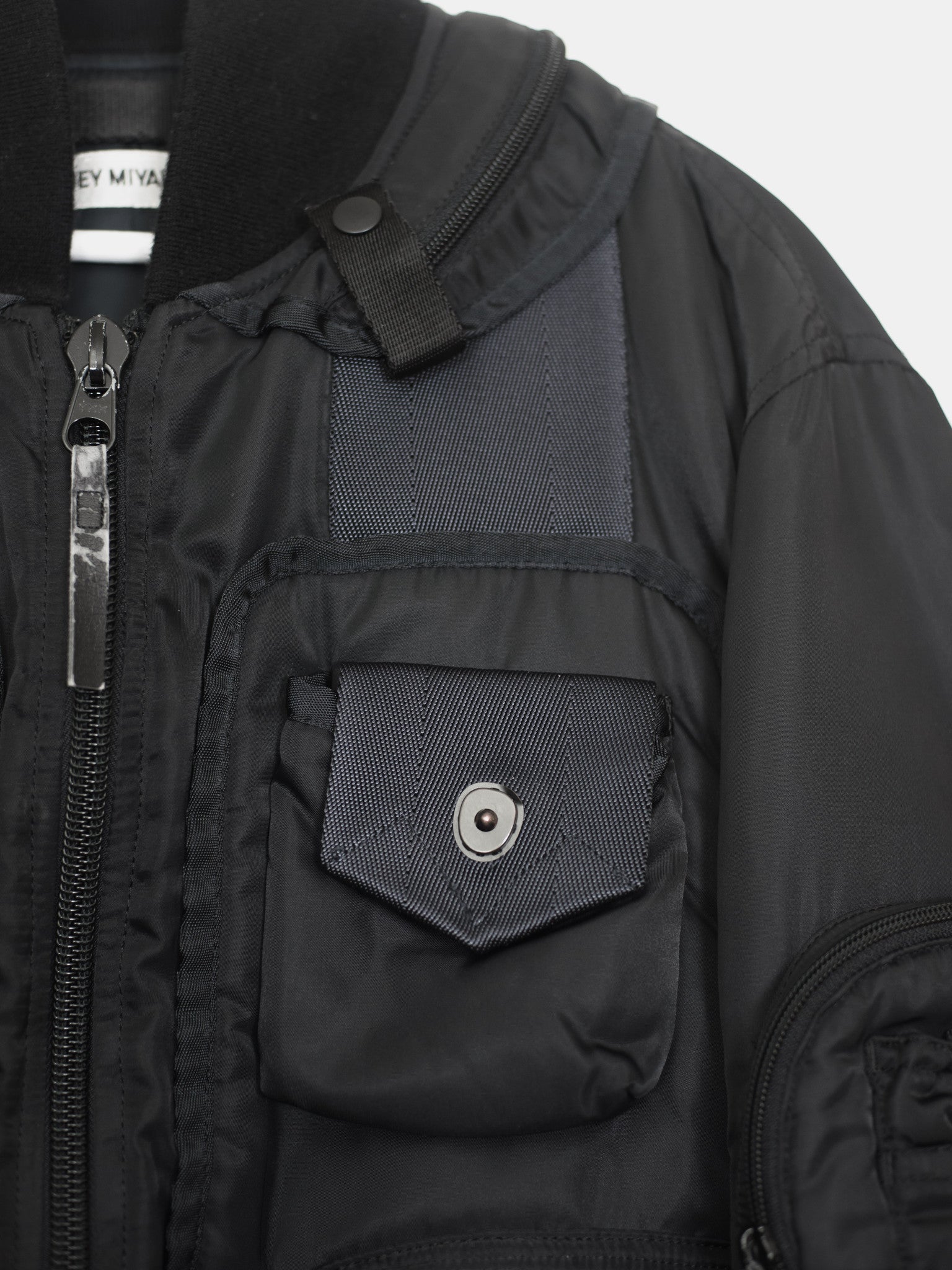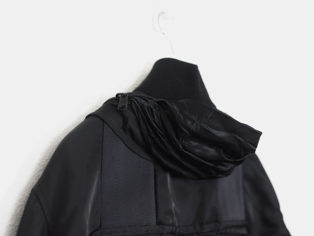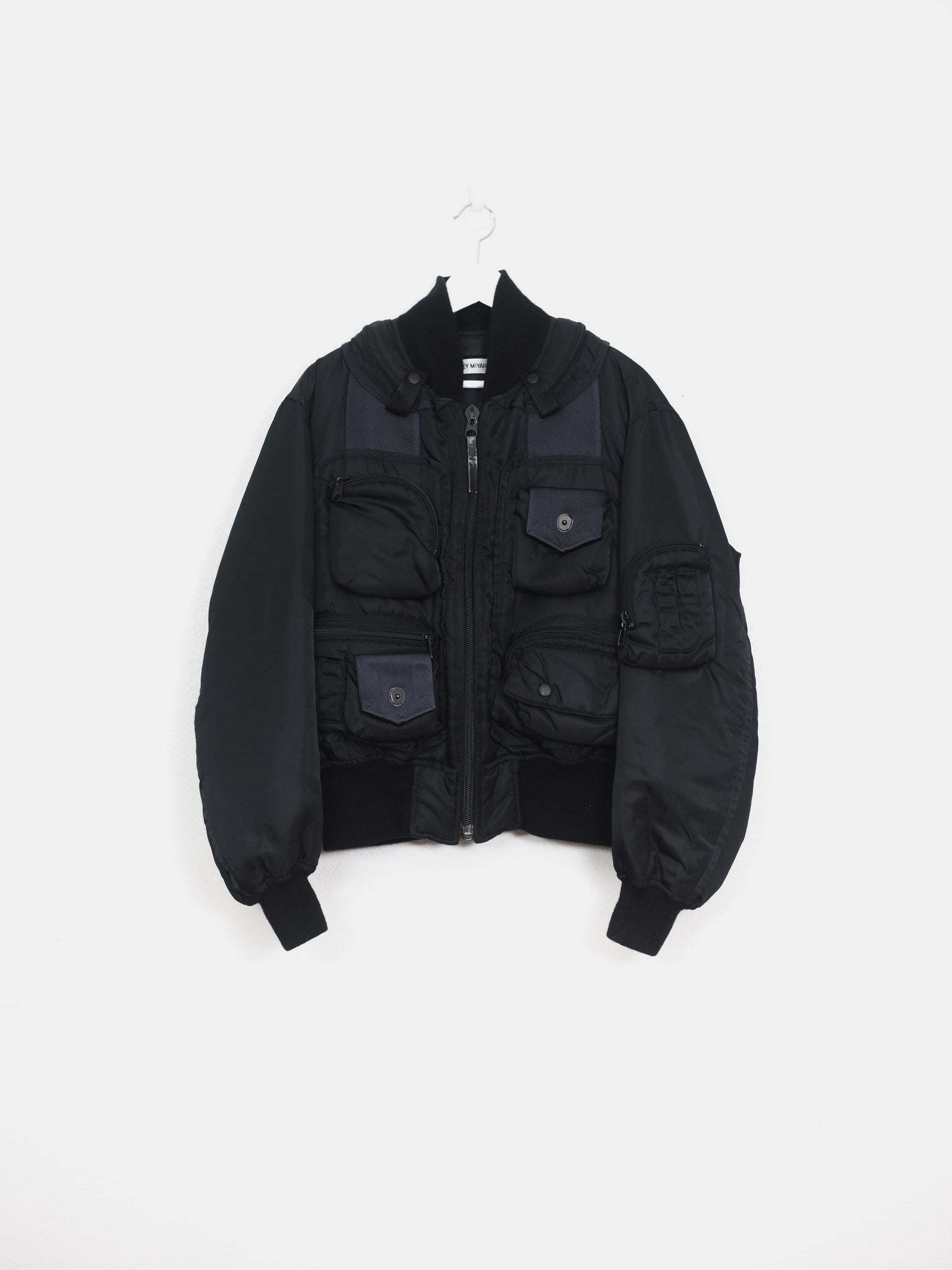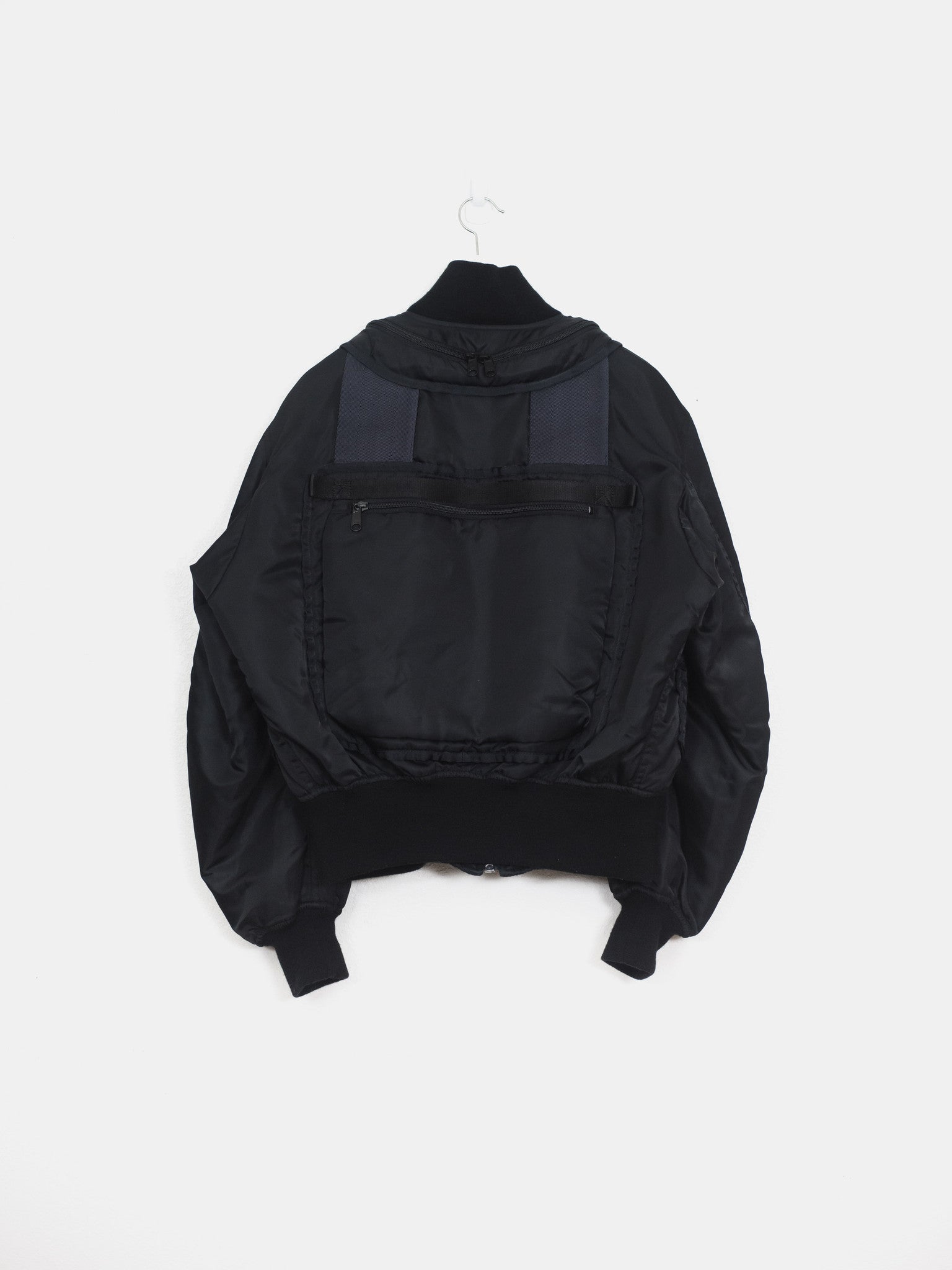 Incredible piece from Issey Miyake Men AW1996 kept in near new condition with heavy military influences and many utilitarian features. Constructed with a flattering oversized silhouette. Details include numerous cargo pockets and a large back pouch able to fit a notebook, a concealable hood, webbed strap detailing, two internal pockets, padded lining, and all the typical MA-1 details such as the sleeve pocket, windflap, and tightly ribbed cuffs.