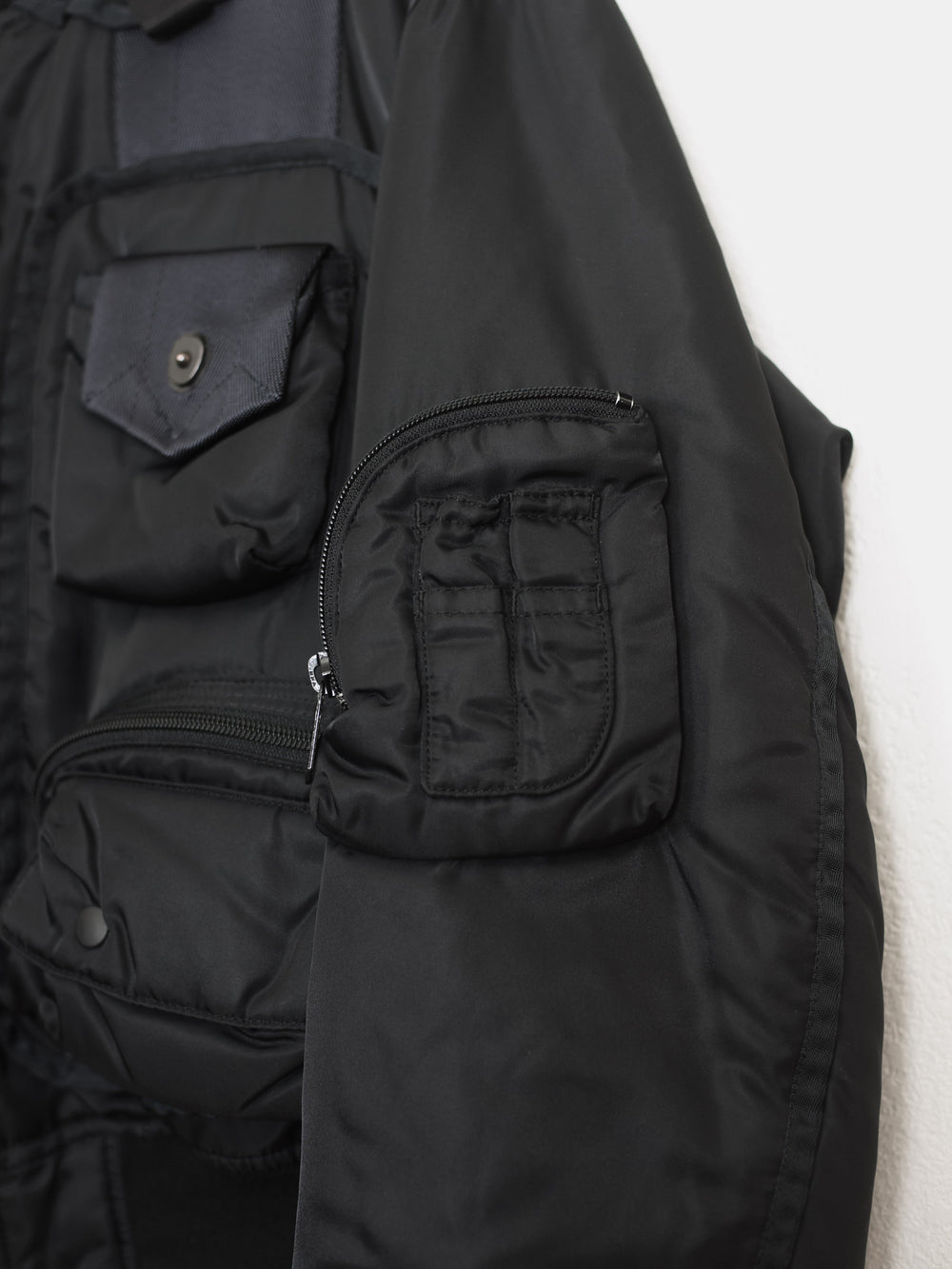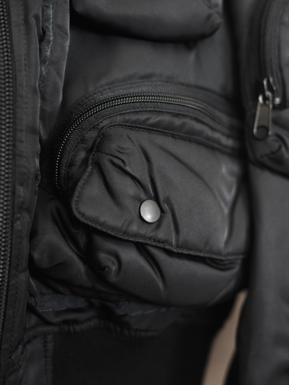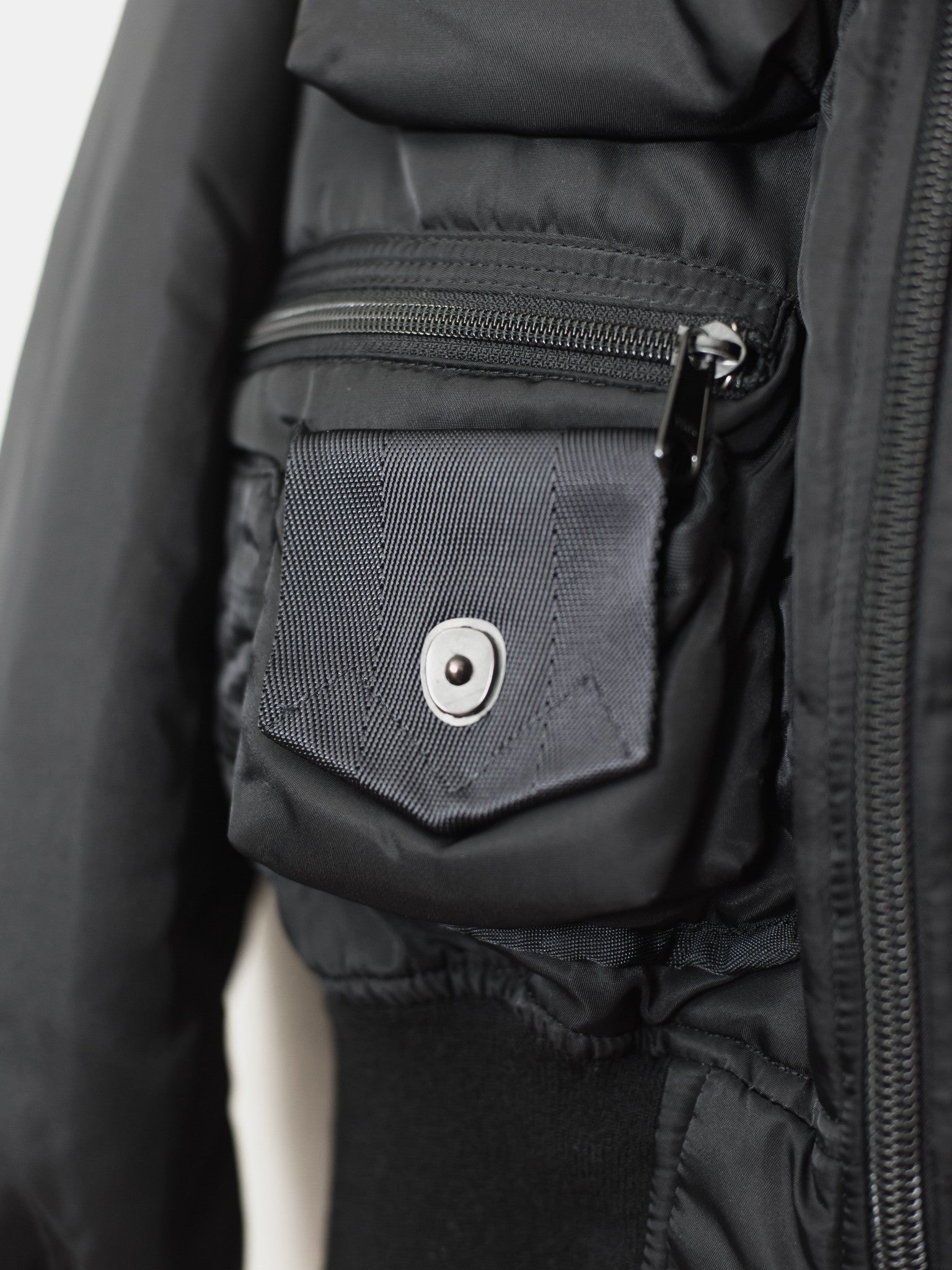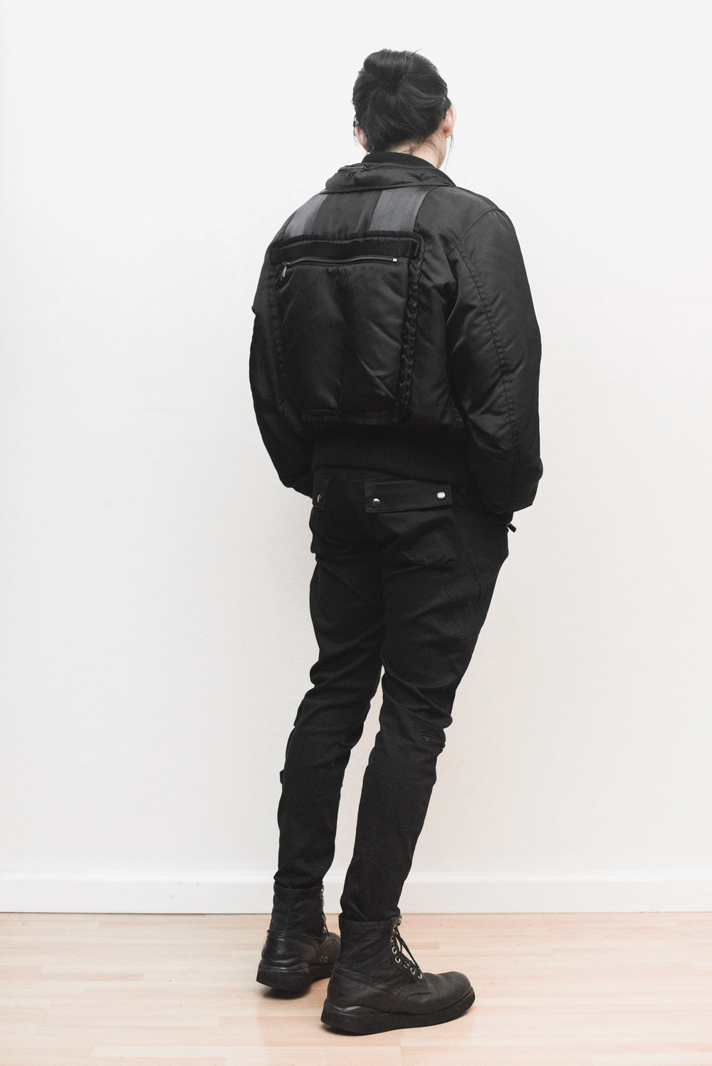 Incredible piece from Issey Miyake Men AW1996 kept in near new condition with heavy military influences and many utilitarian features. Constructed with a flattering oversized silhouette. Details include numerous cargo pockets and a large back pouch able to fit a notebook, a concealable hood, webbed strap detailing, two internal pockets, padded lining, and all the typical MA-1 details such as the sleeve pocket, windflap, and tightly ribbed cuffs.