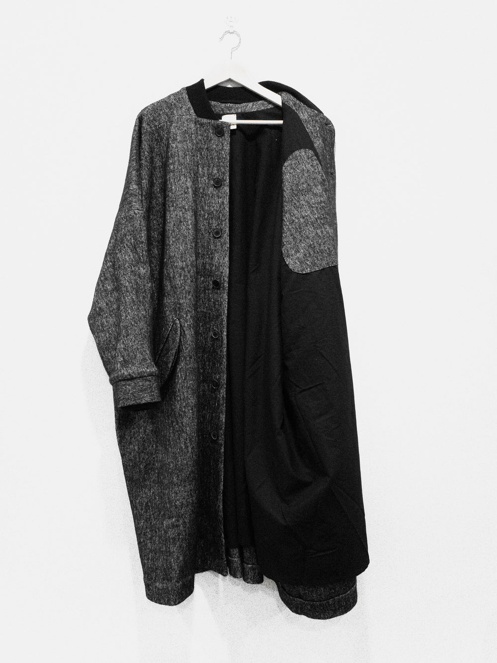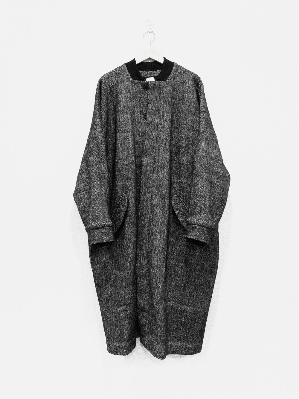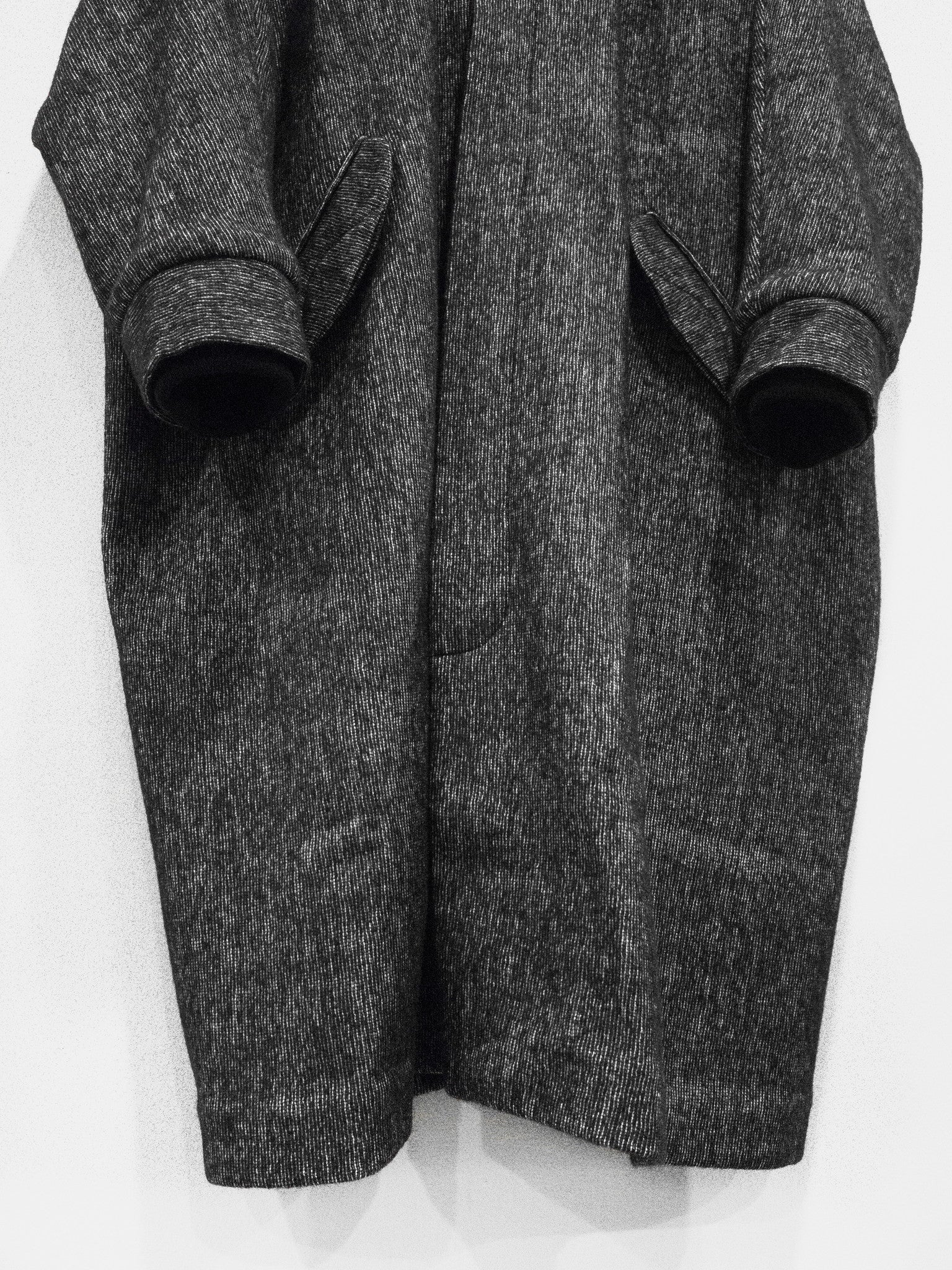 Mix A behemoth of a coat executed in a soft and lofty wool/cotton weave whose contrasting white and black threads give it an amazing visual dynamism. Geometric patterning give the front mantle a definition amidst the sea of striated woven texture. Dolman sleeve construction gives a relaxed dropped shoulder look and an extra wide body. Enjoy being swallowed up in this piece’s warm embrace. Finished with pit vents, inset ribbed cuffs, a ribbed bomber style collar, two round interior pockets, hidden placket, and fine black cotton lining.